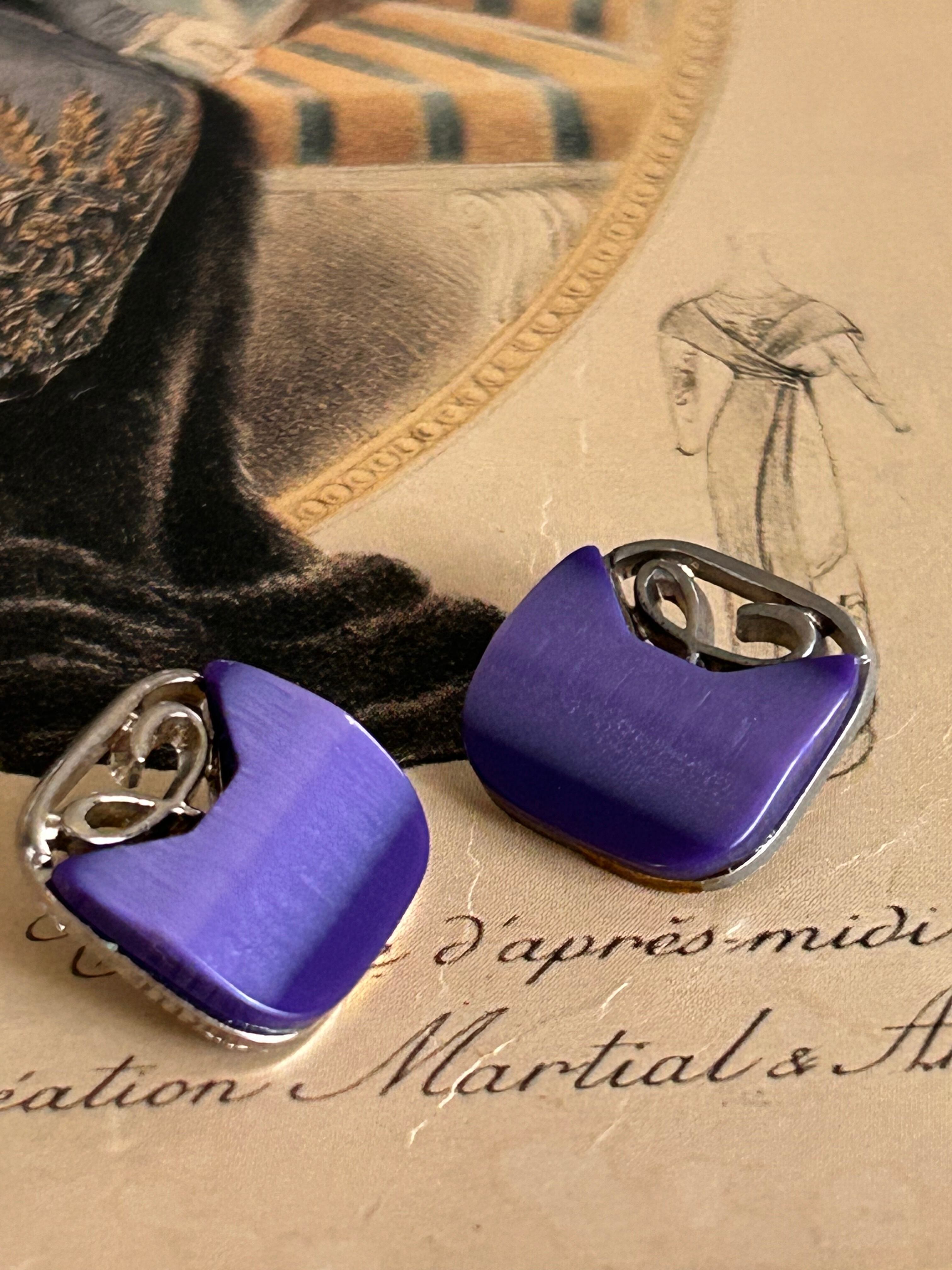 シルバーカラーの台座の中央に艶やかで発色の良いグラデーションのパープルカラーのカボションが設置されています。