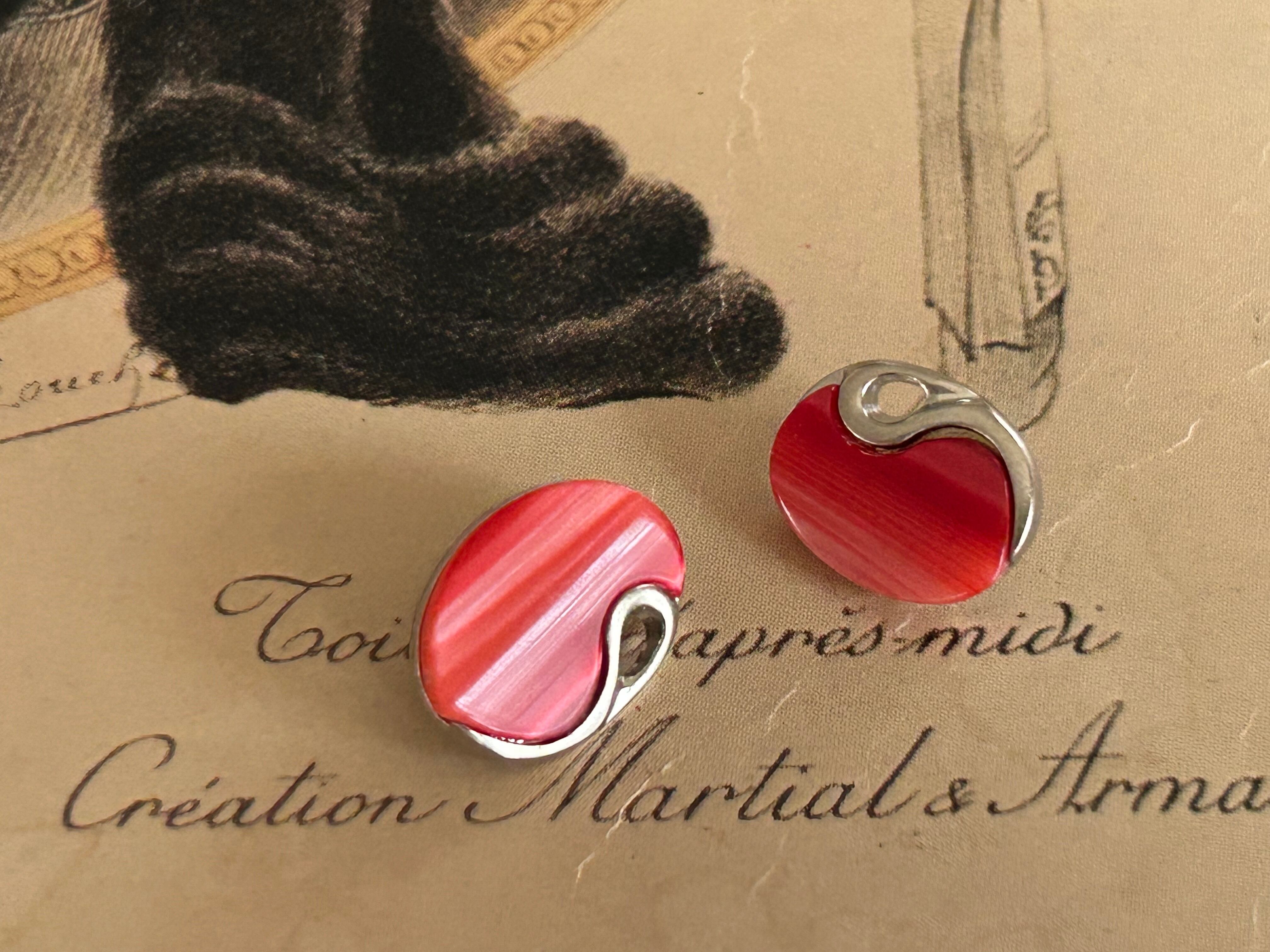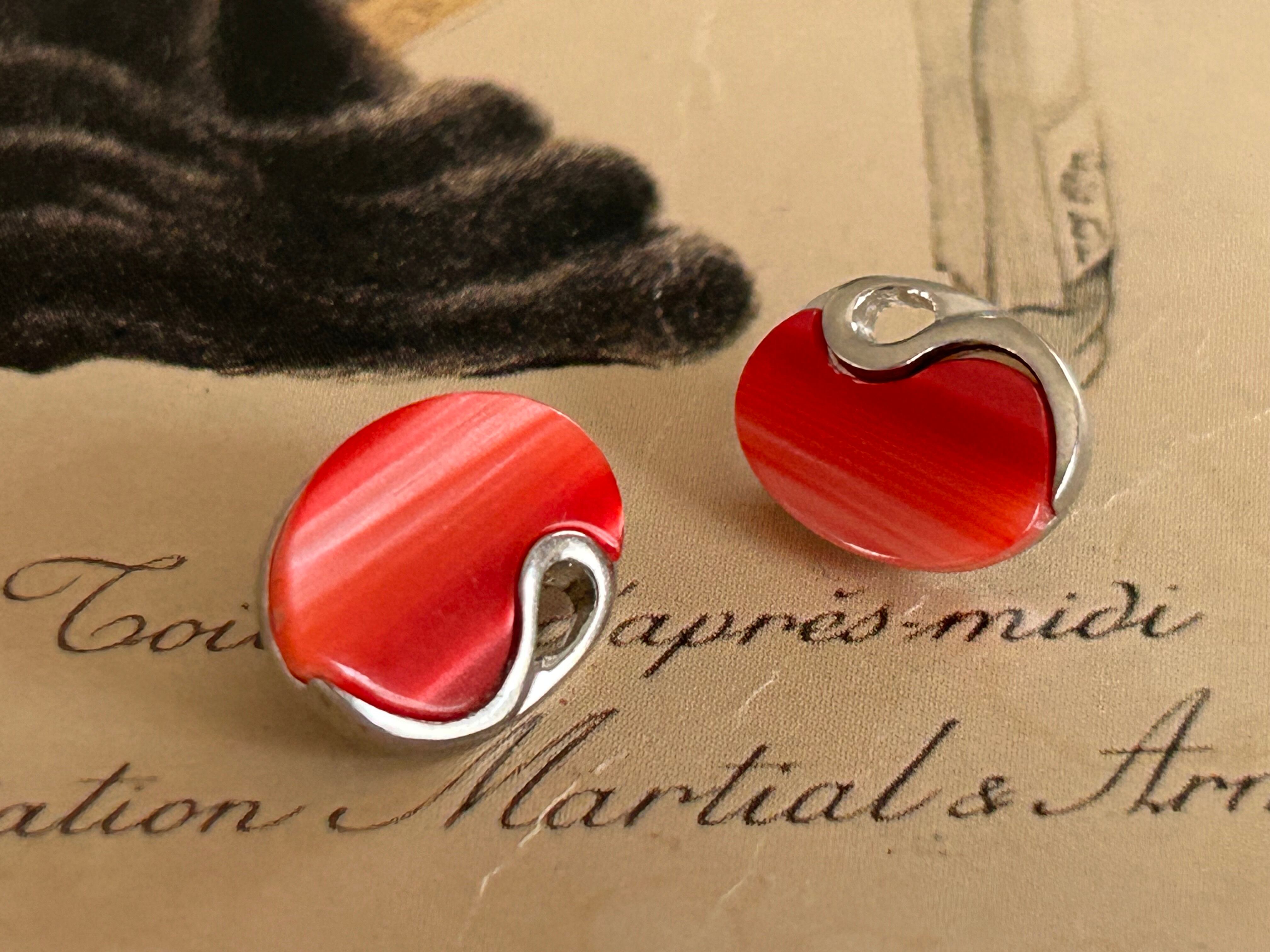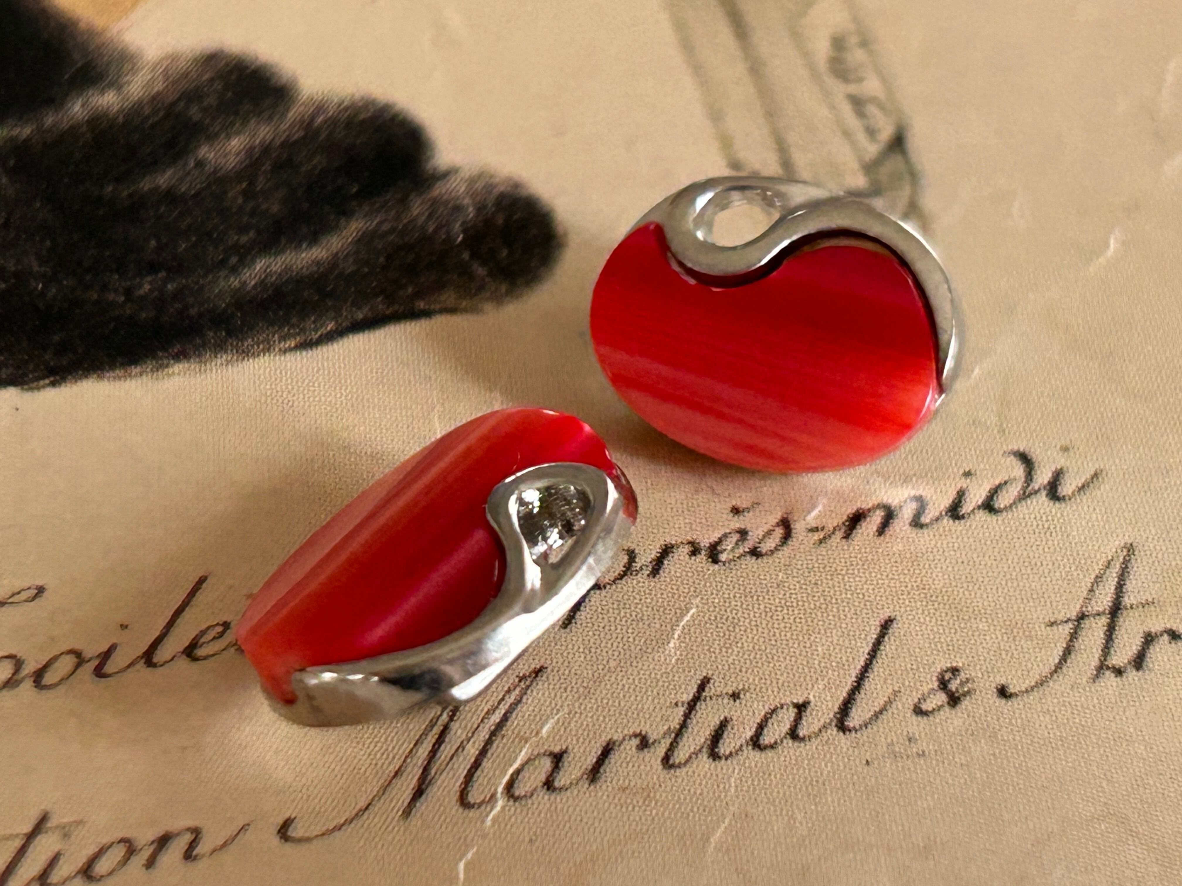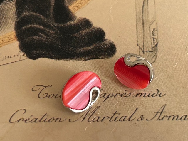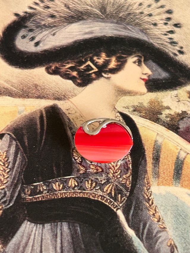 シルバーカラーの台座に艶やかで発色の良いレッドカラーのカボションが設置されています。