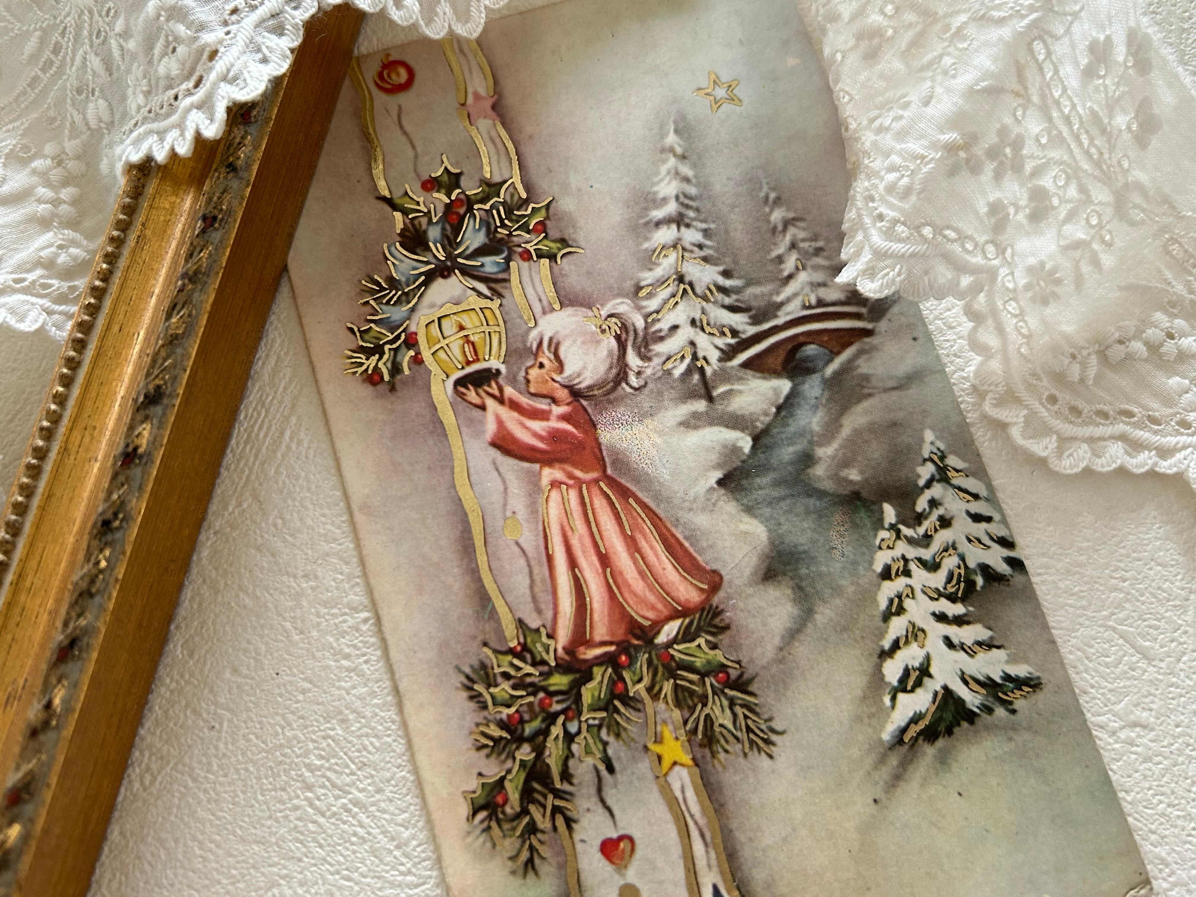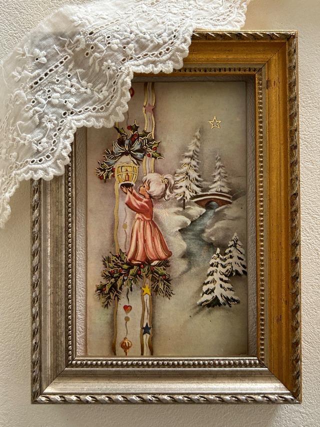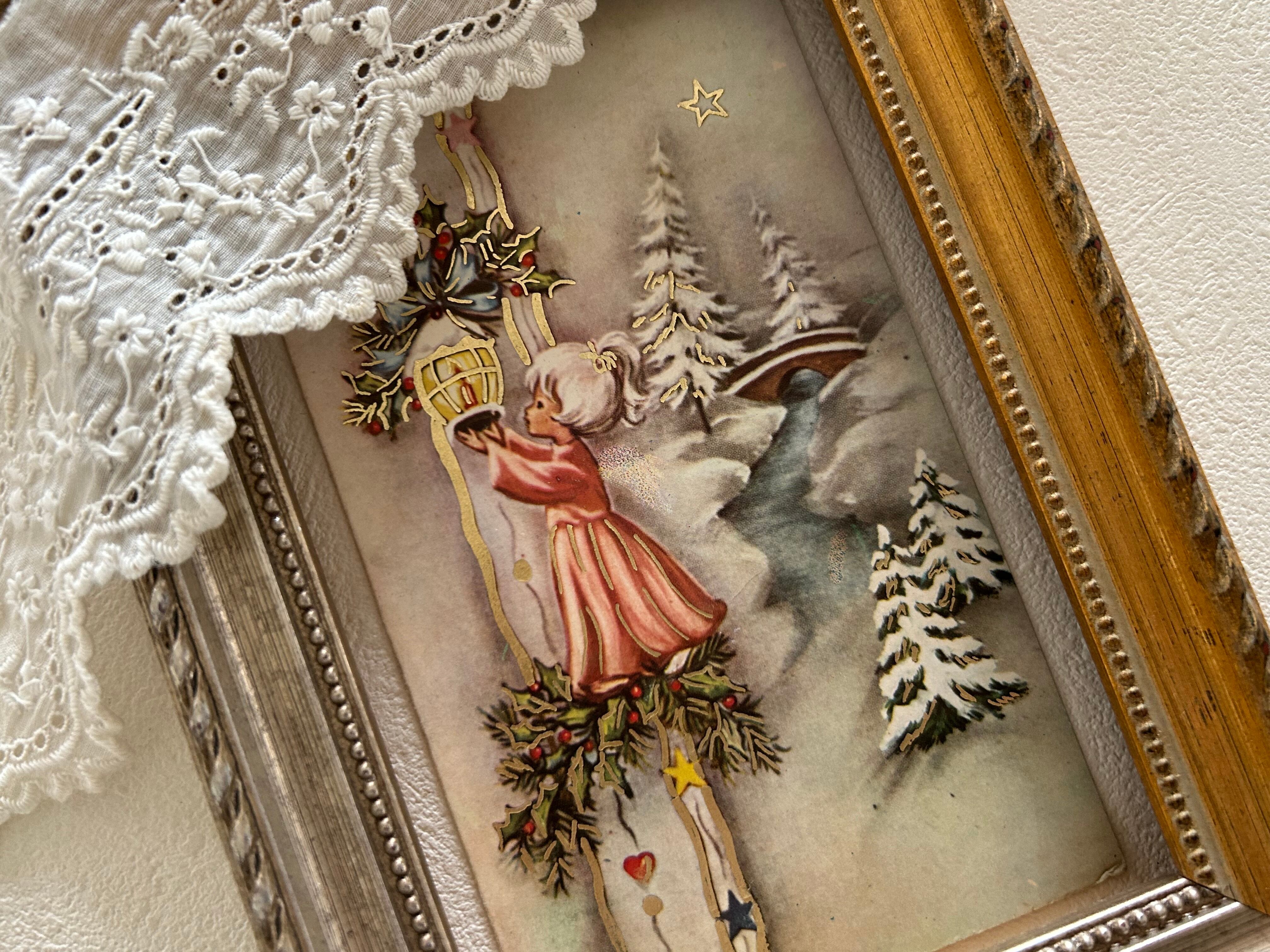 フランスVintage クリスマスのメッセージカード 1977年 見開きタイプ 雪景色 ツリー 柊 ランタン 額装 コラージュ