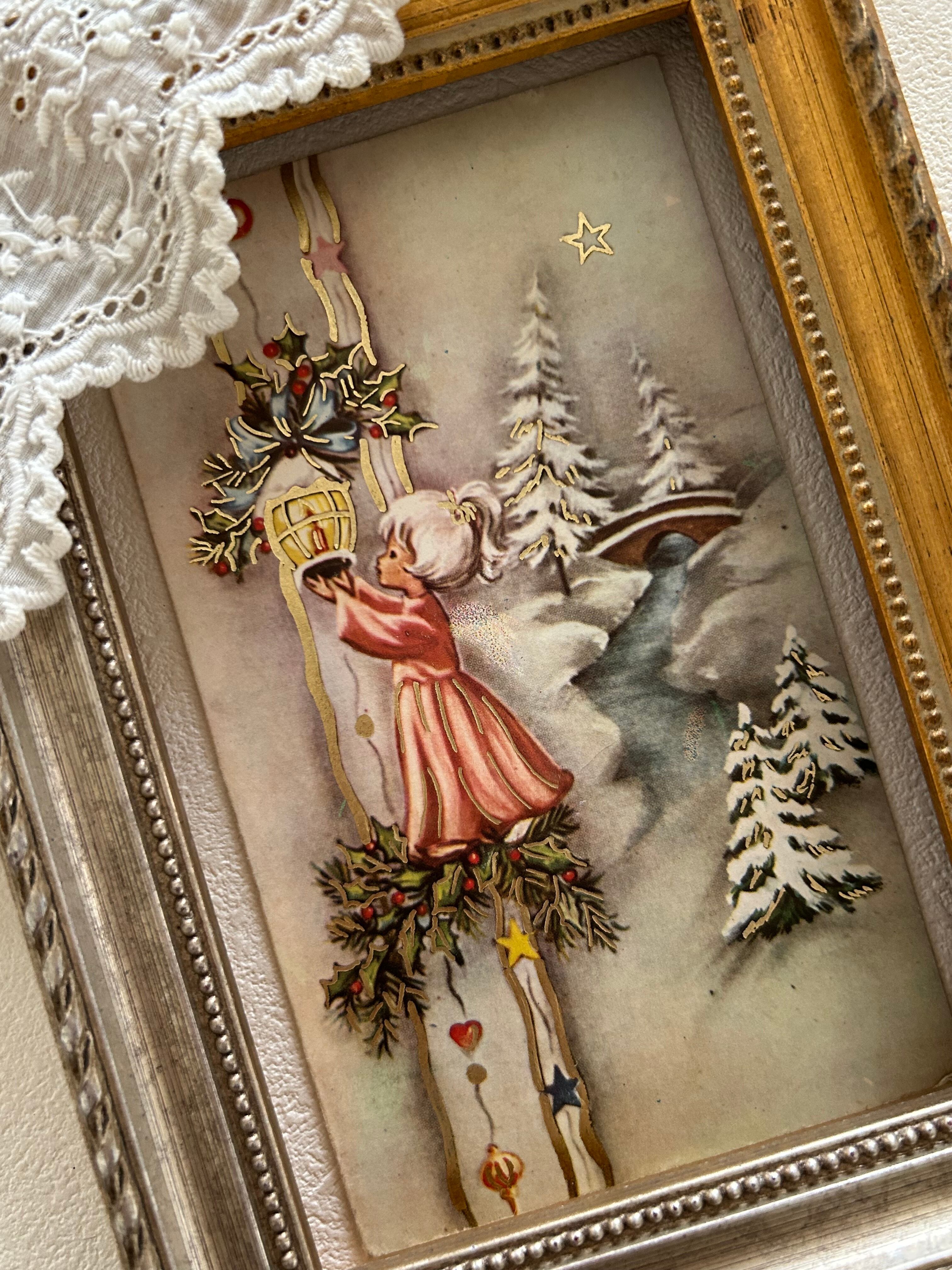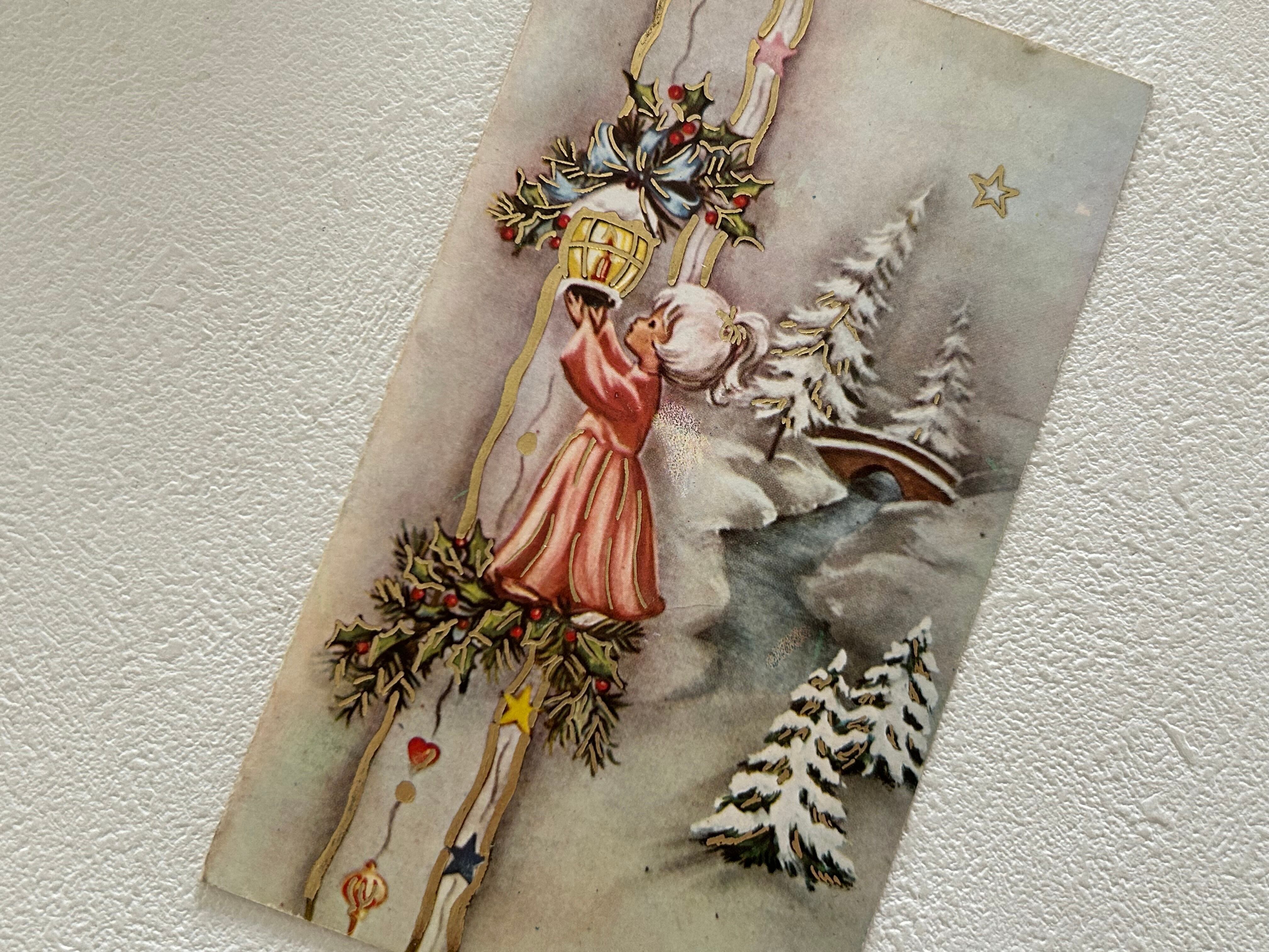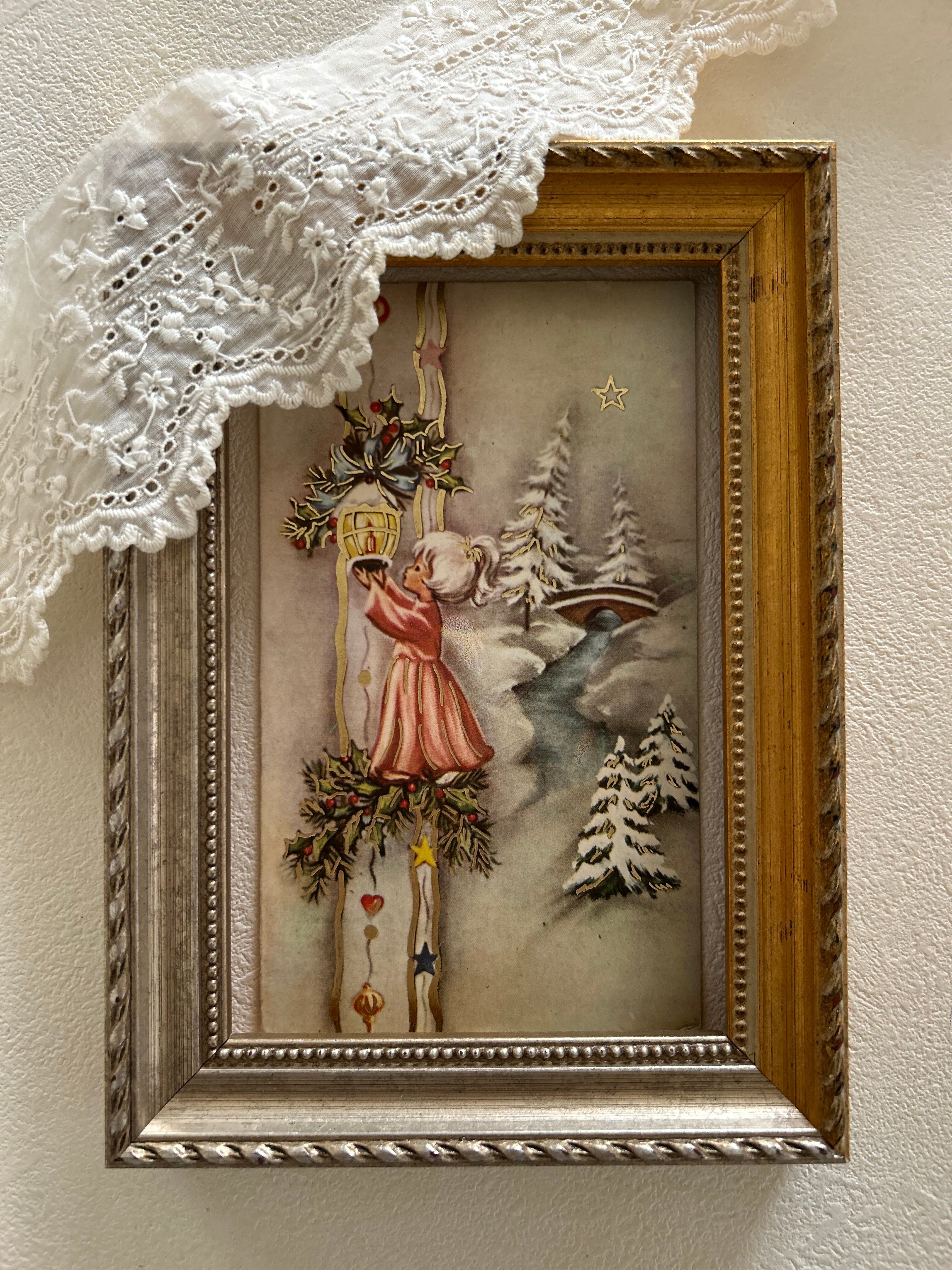 フランスVintage クリスマスのメッセージカード 1977年 見開きタイプ 雪景色 ツリー 柊 ランタン 額装 コラージュ
