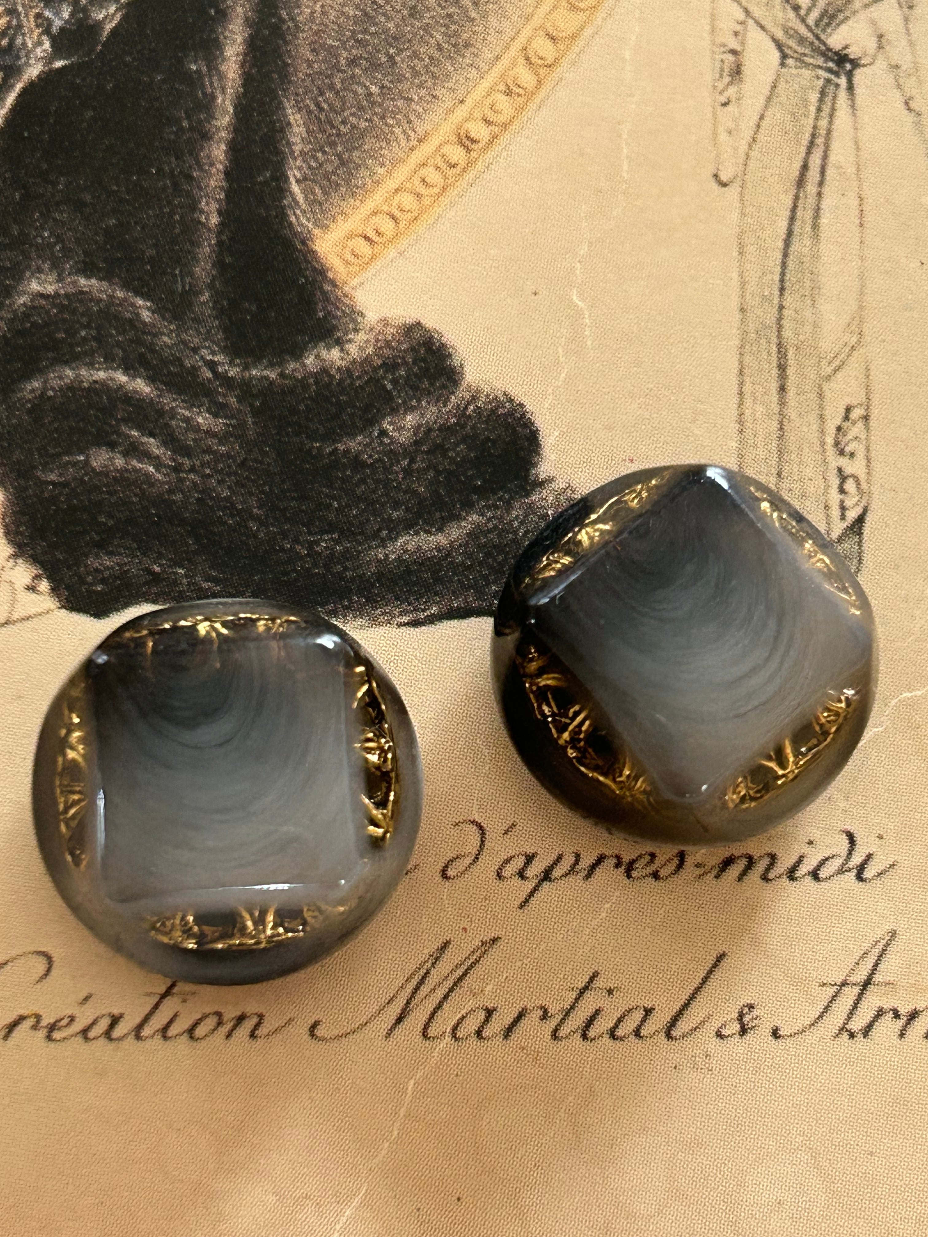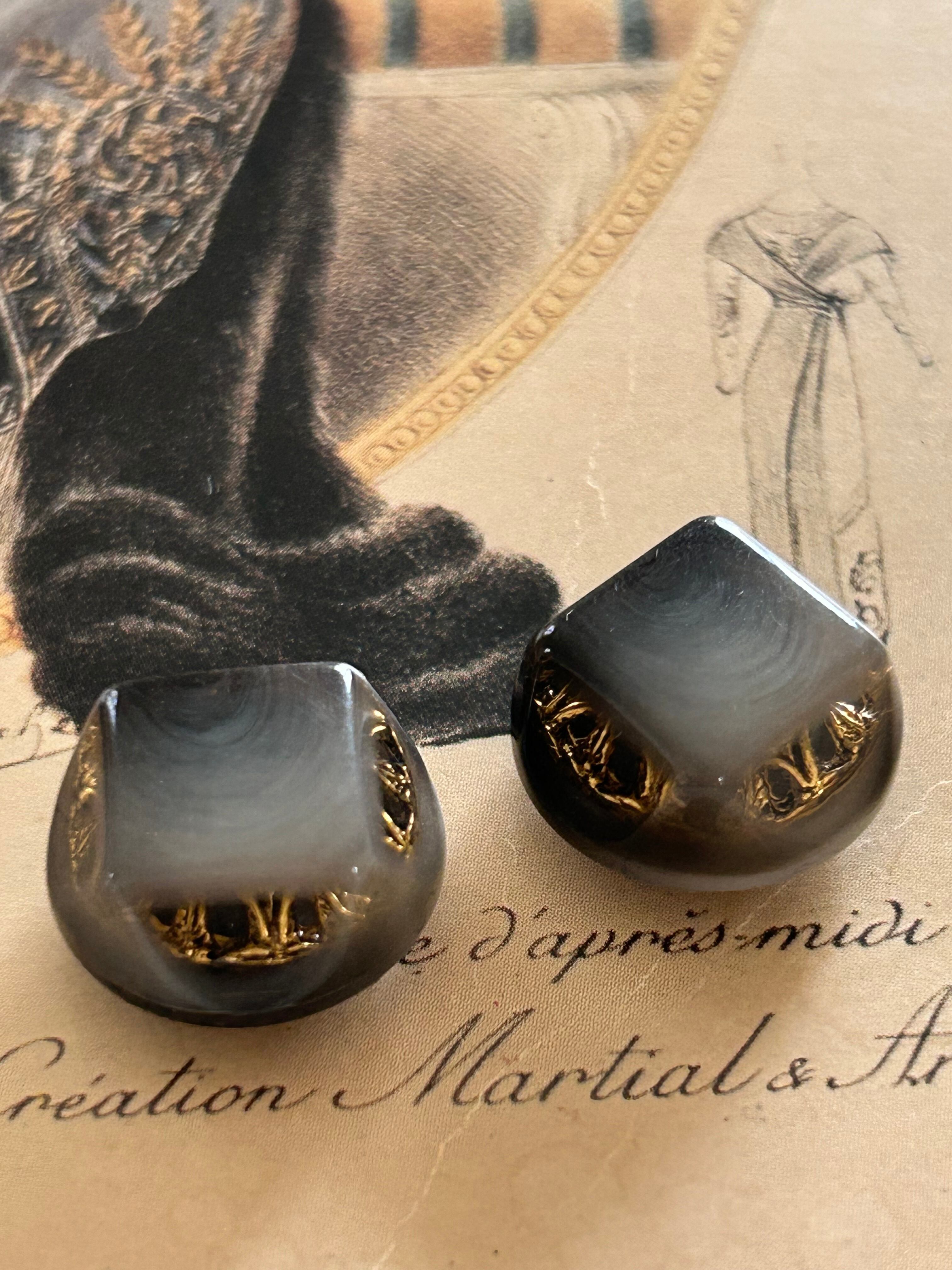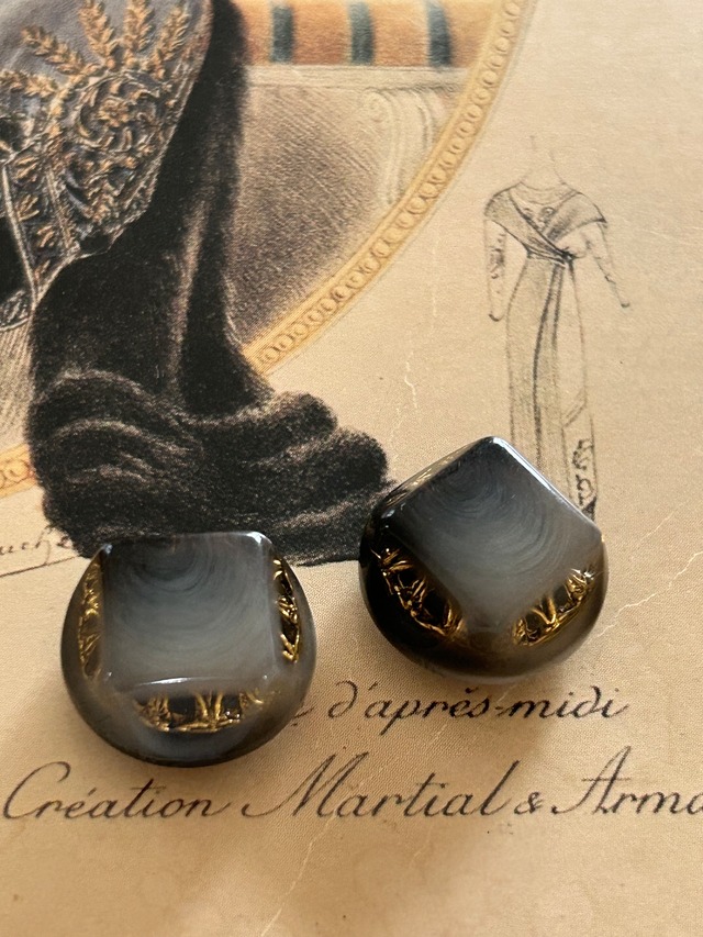 内側にクラシカルなゴールドのデコレーション材が閉じ込められたエレガントで美しいデザインのボタンになります。