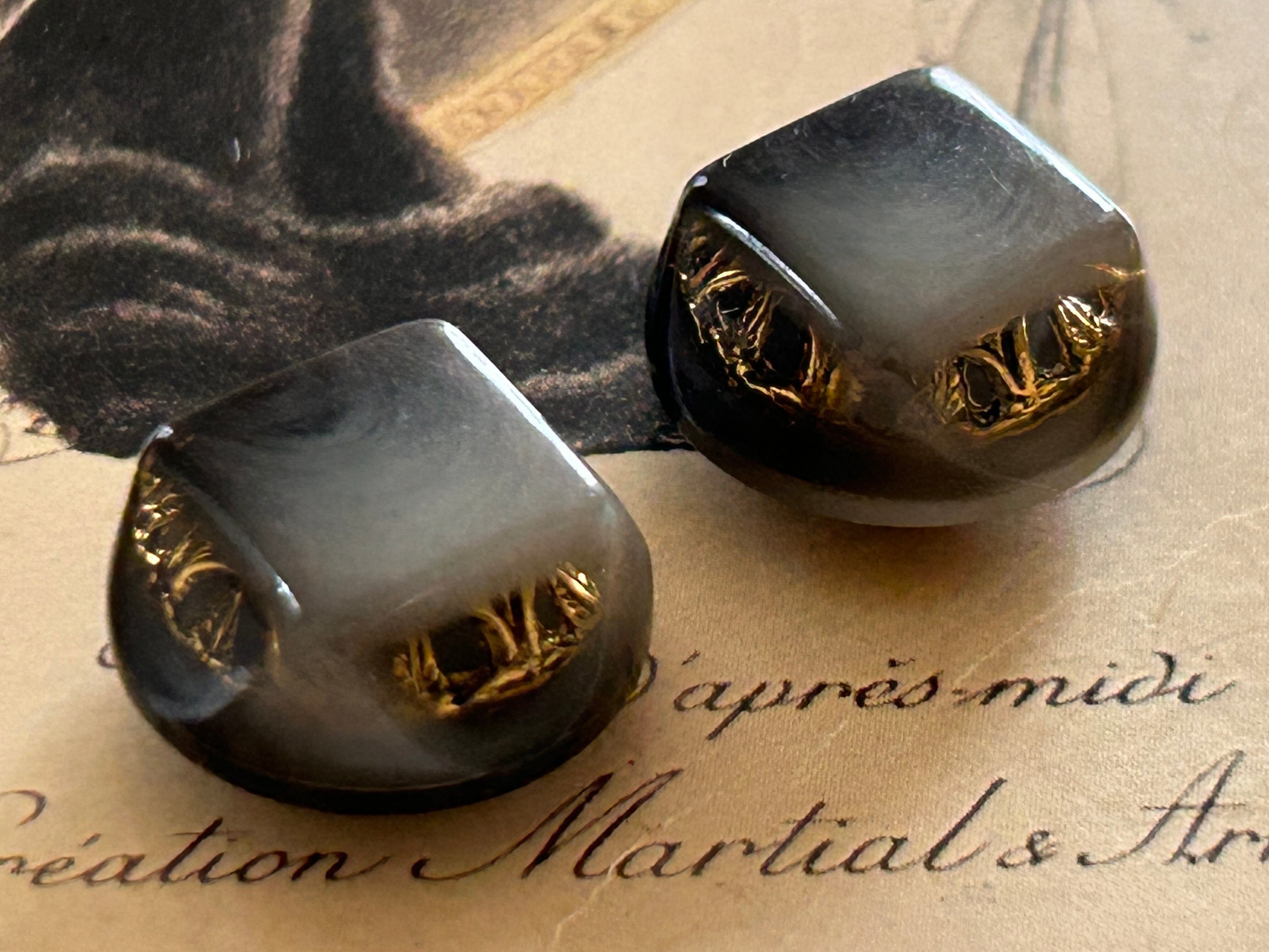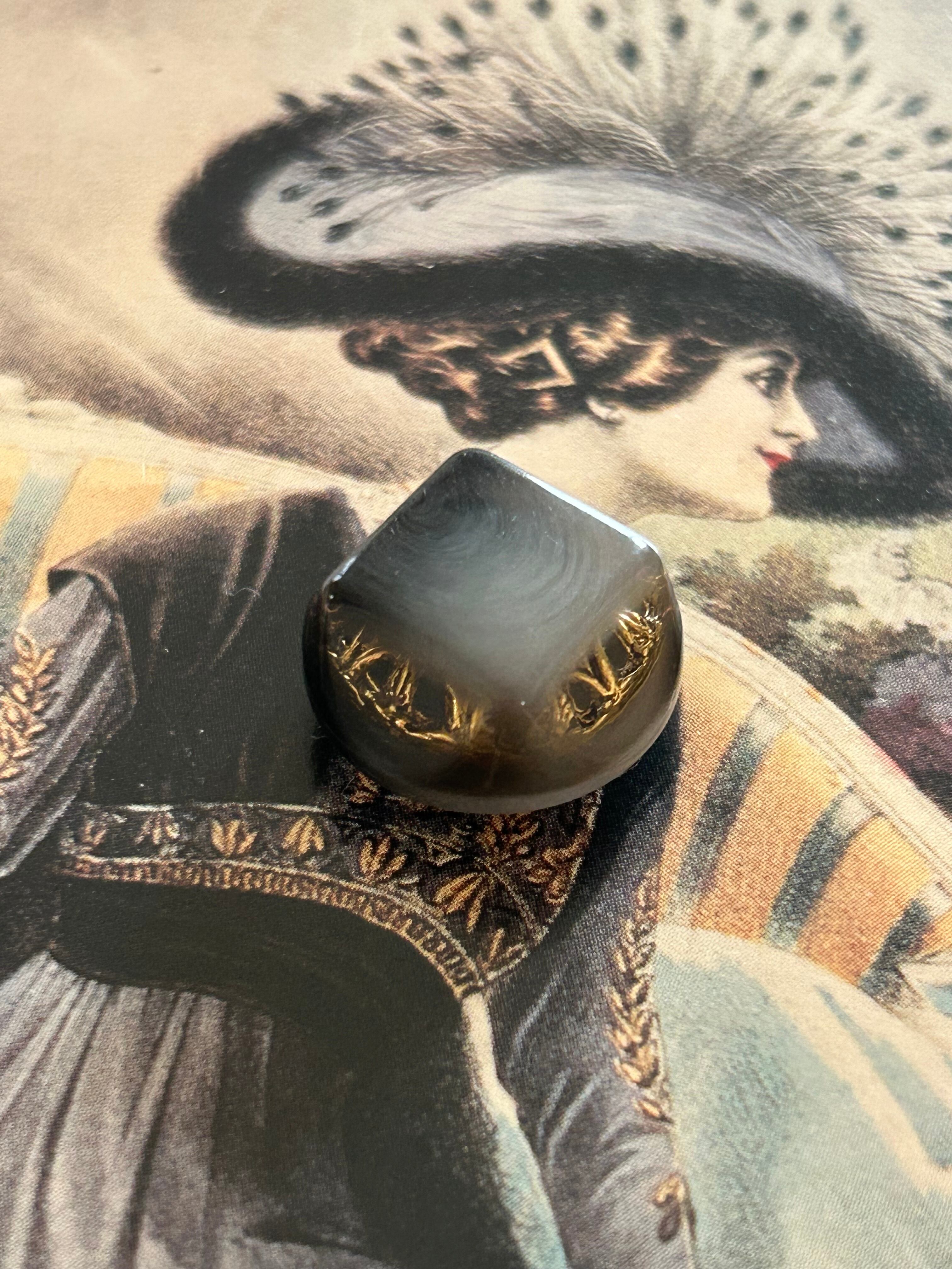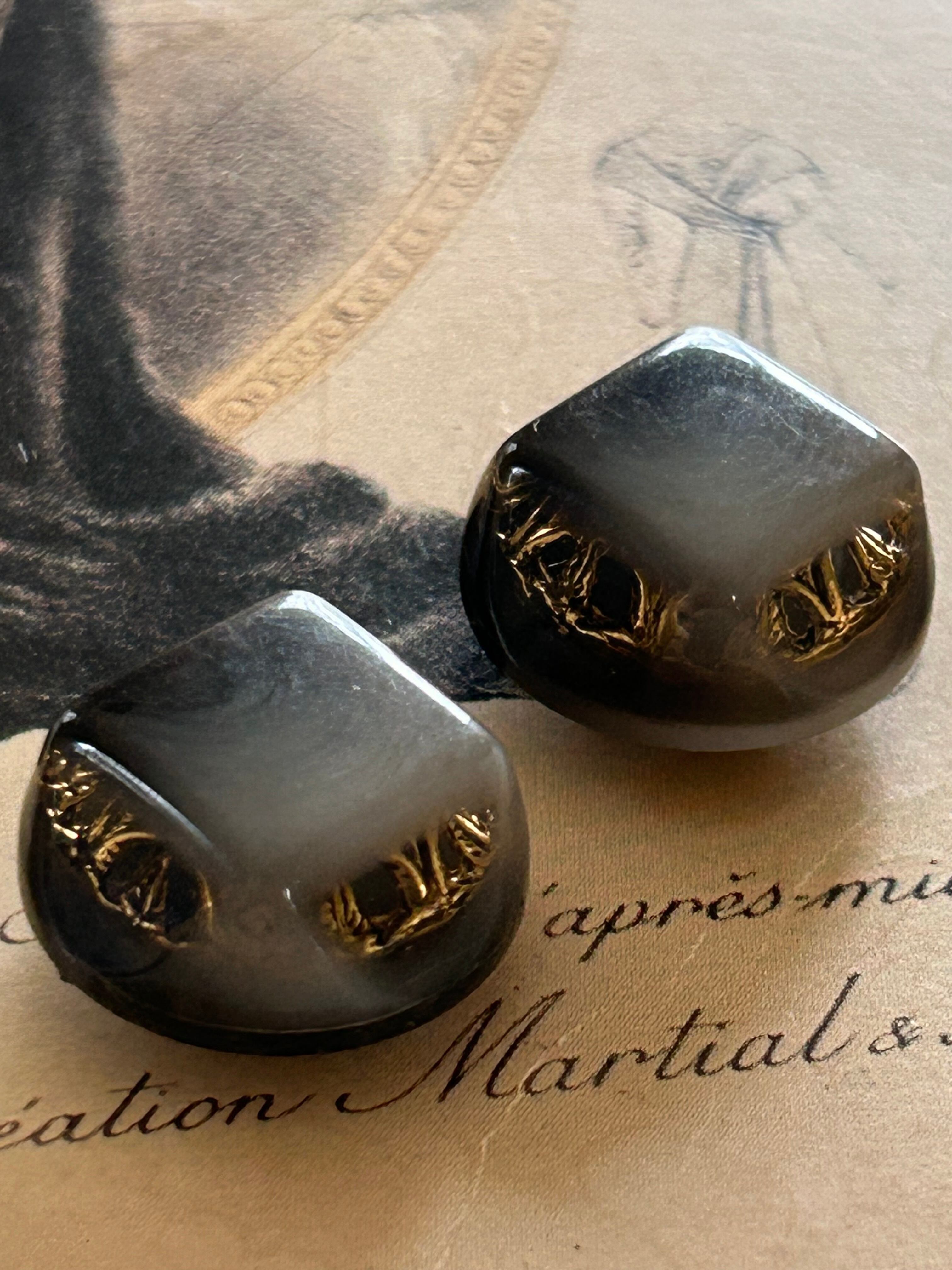 内側にクラシカルなゴールドのデコレーション材が閉じ込められたエレガントで美しいデザインのボタンになります。