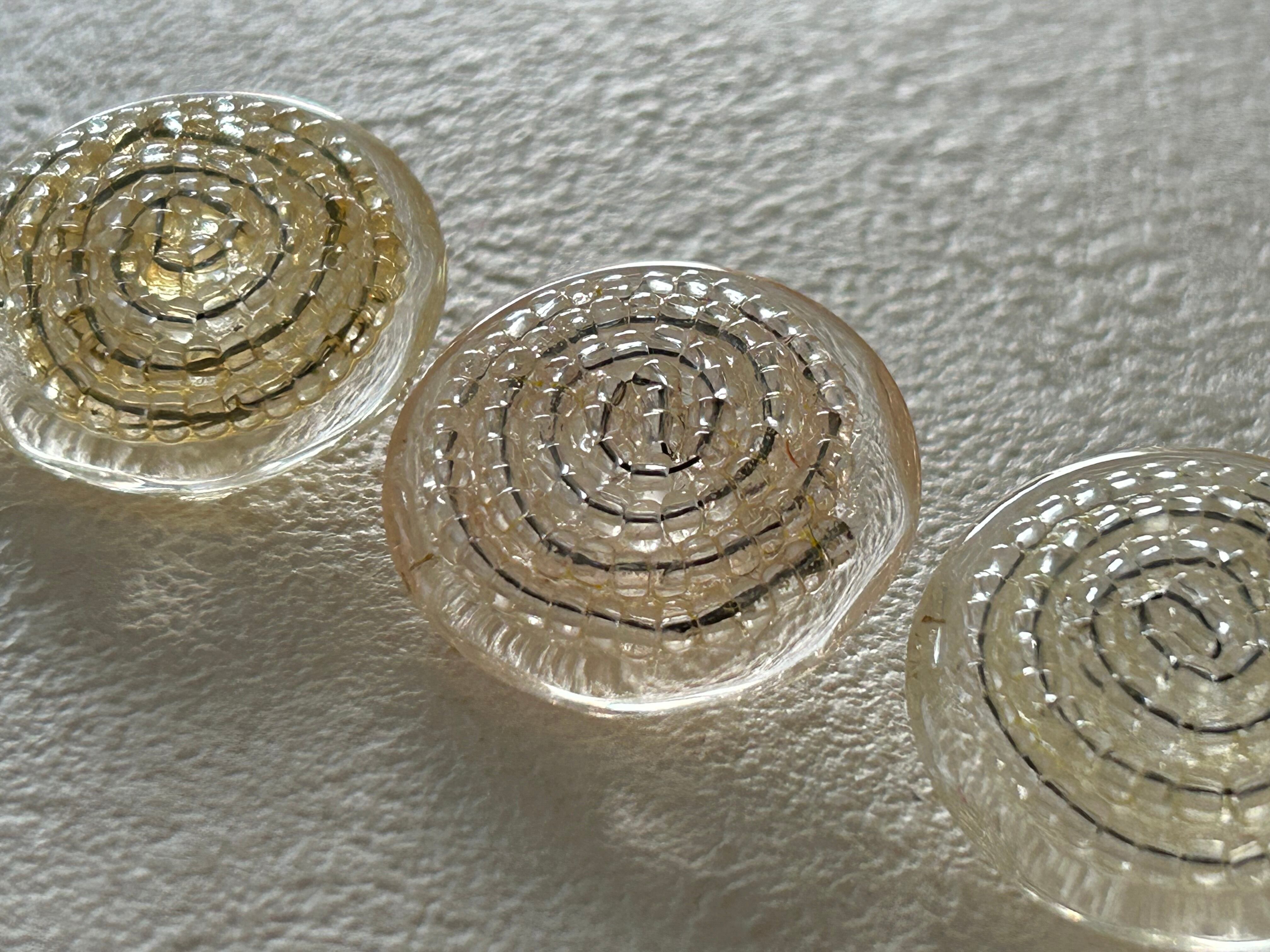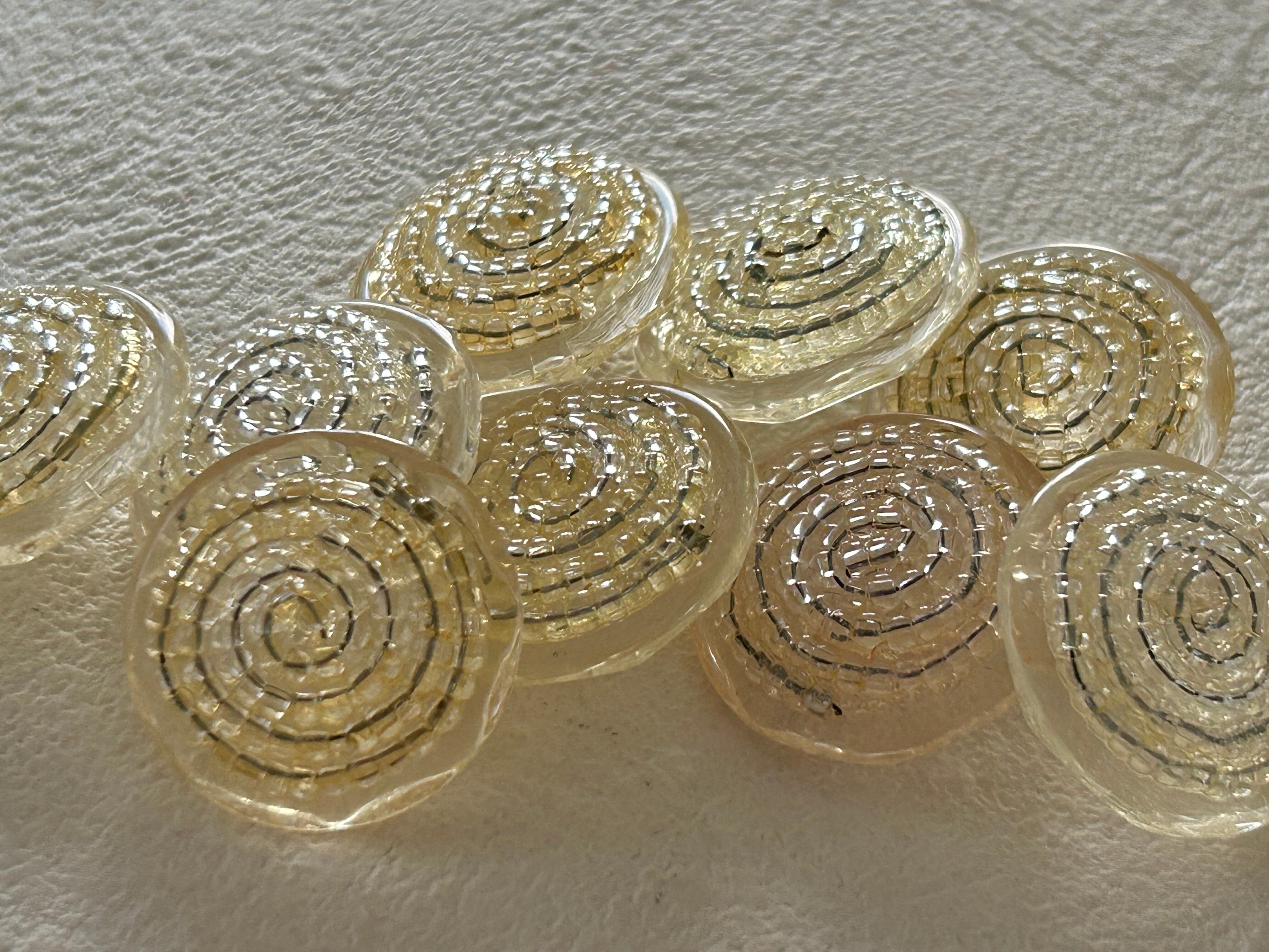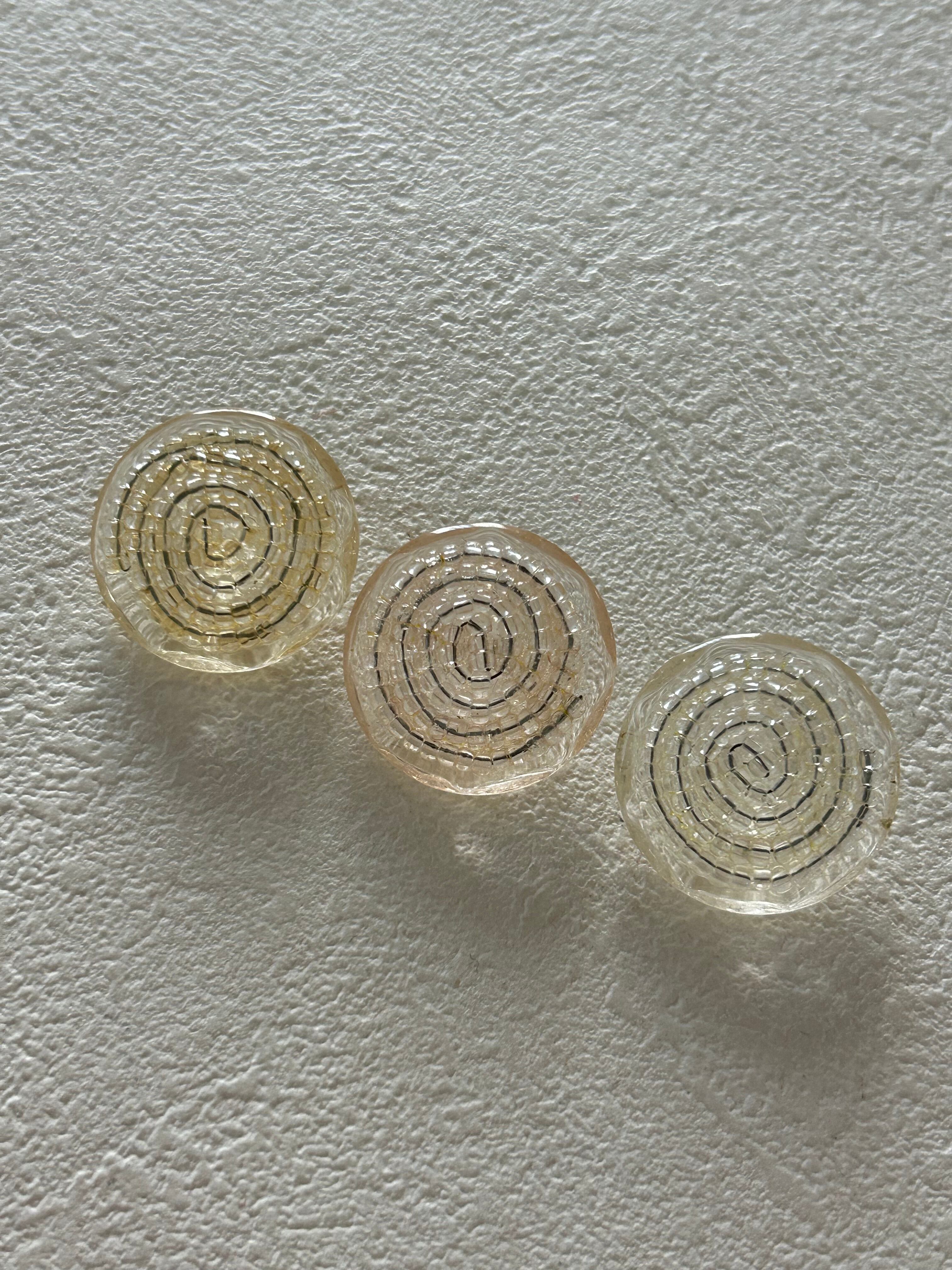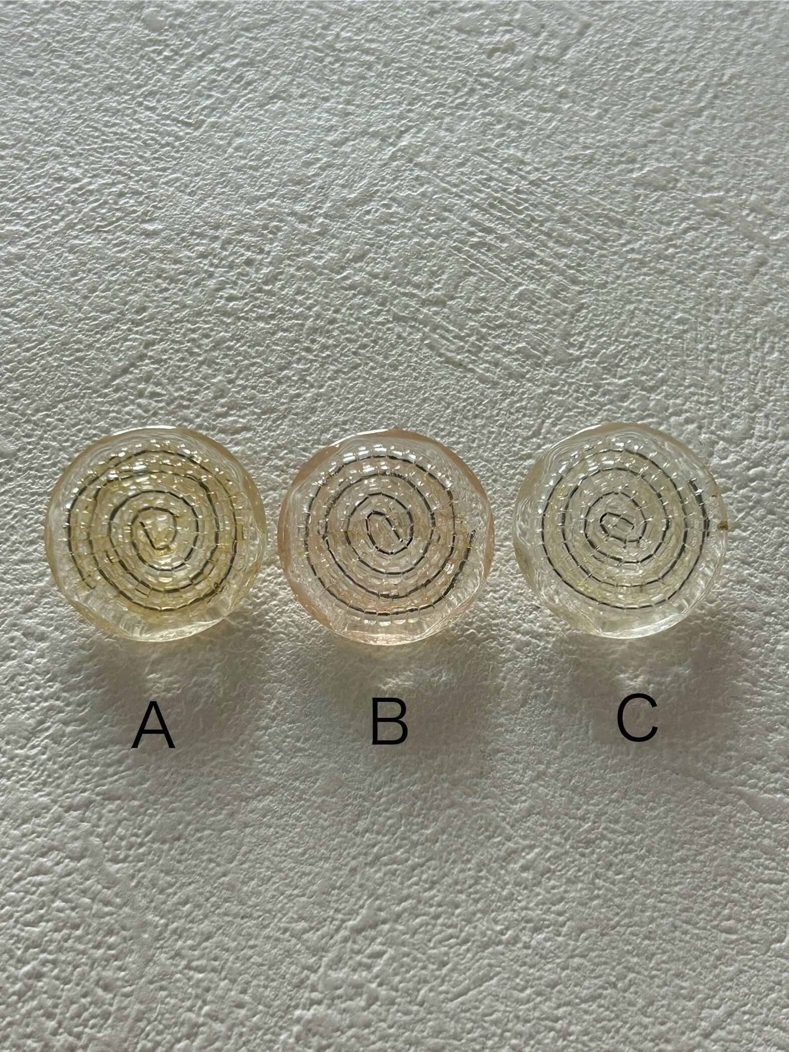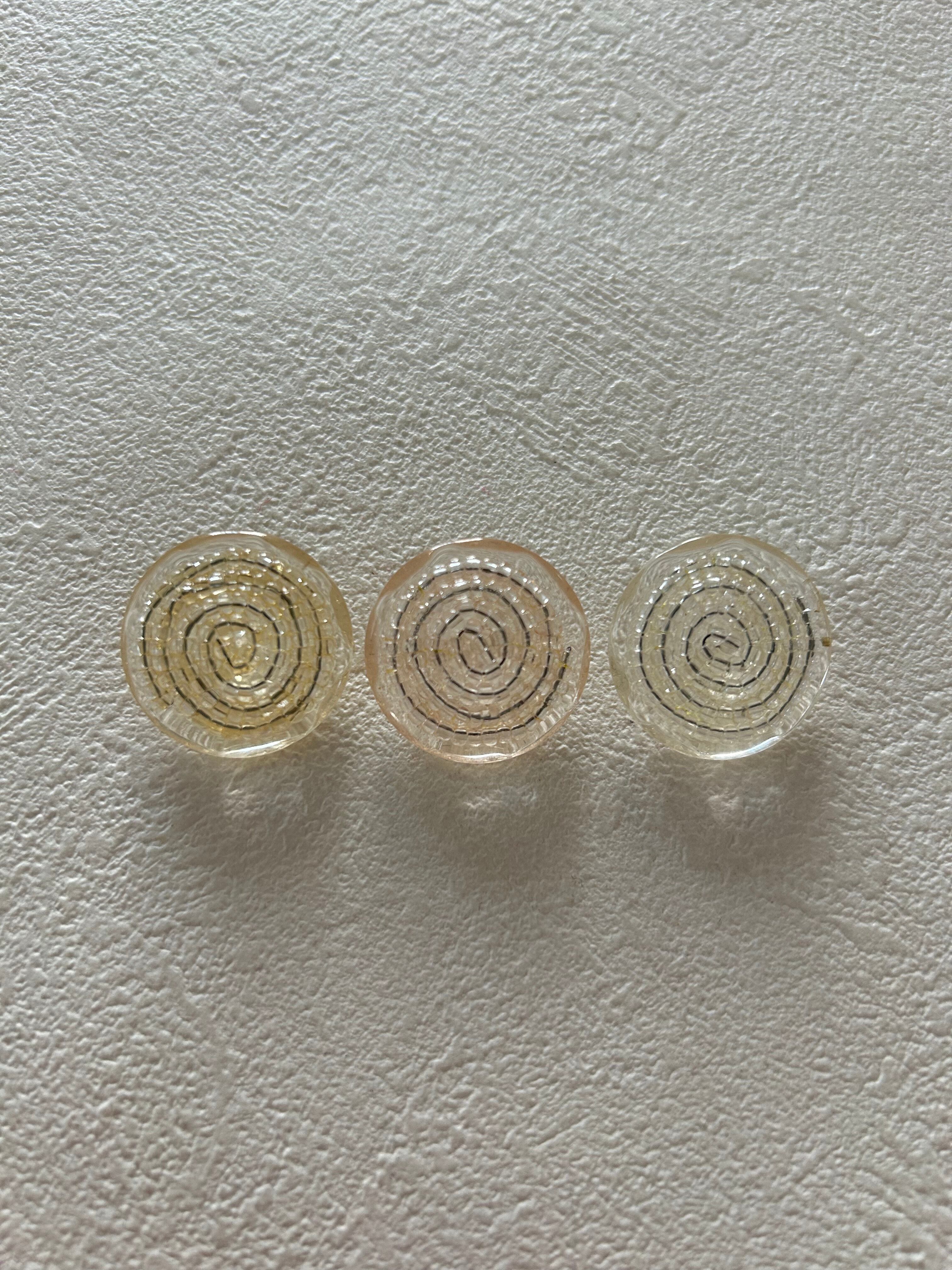 プラスチックボタンの表面に渦状にガラスビーズのデコレーションが施されています。