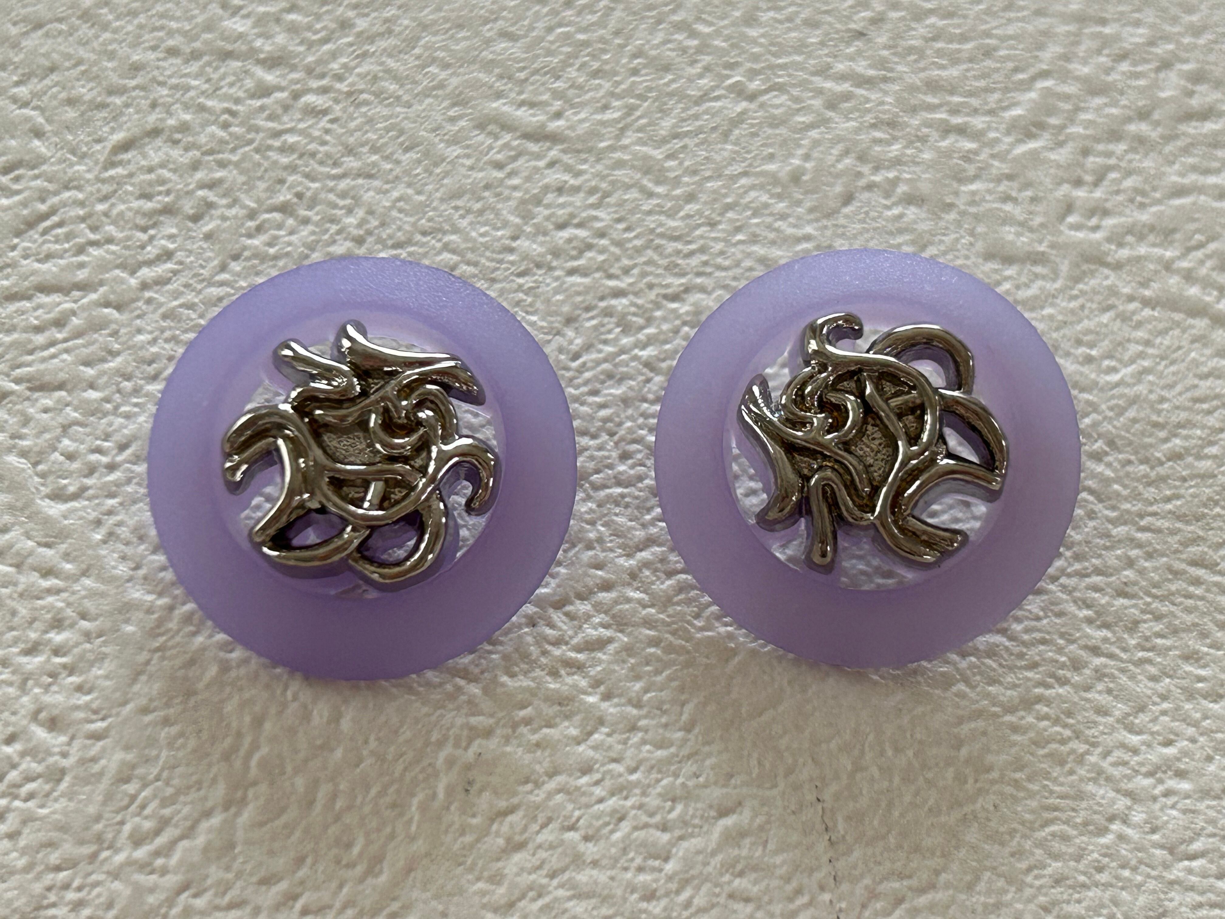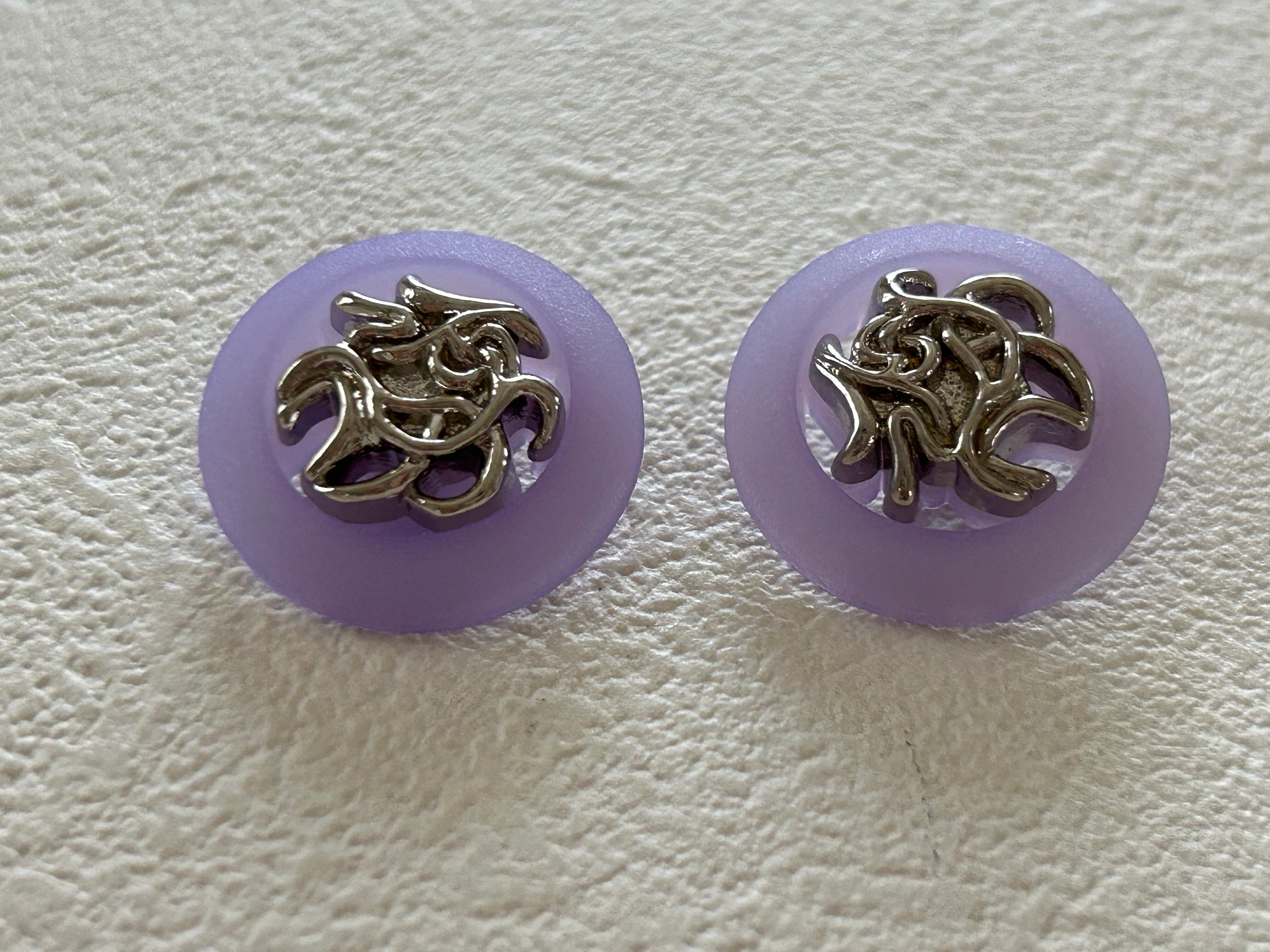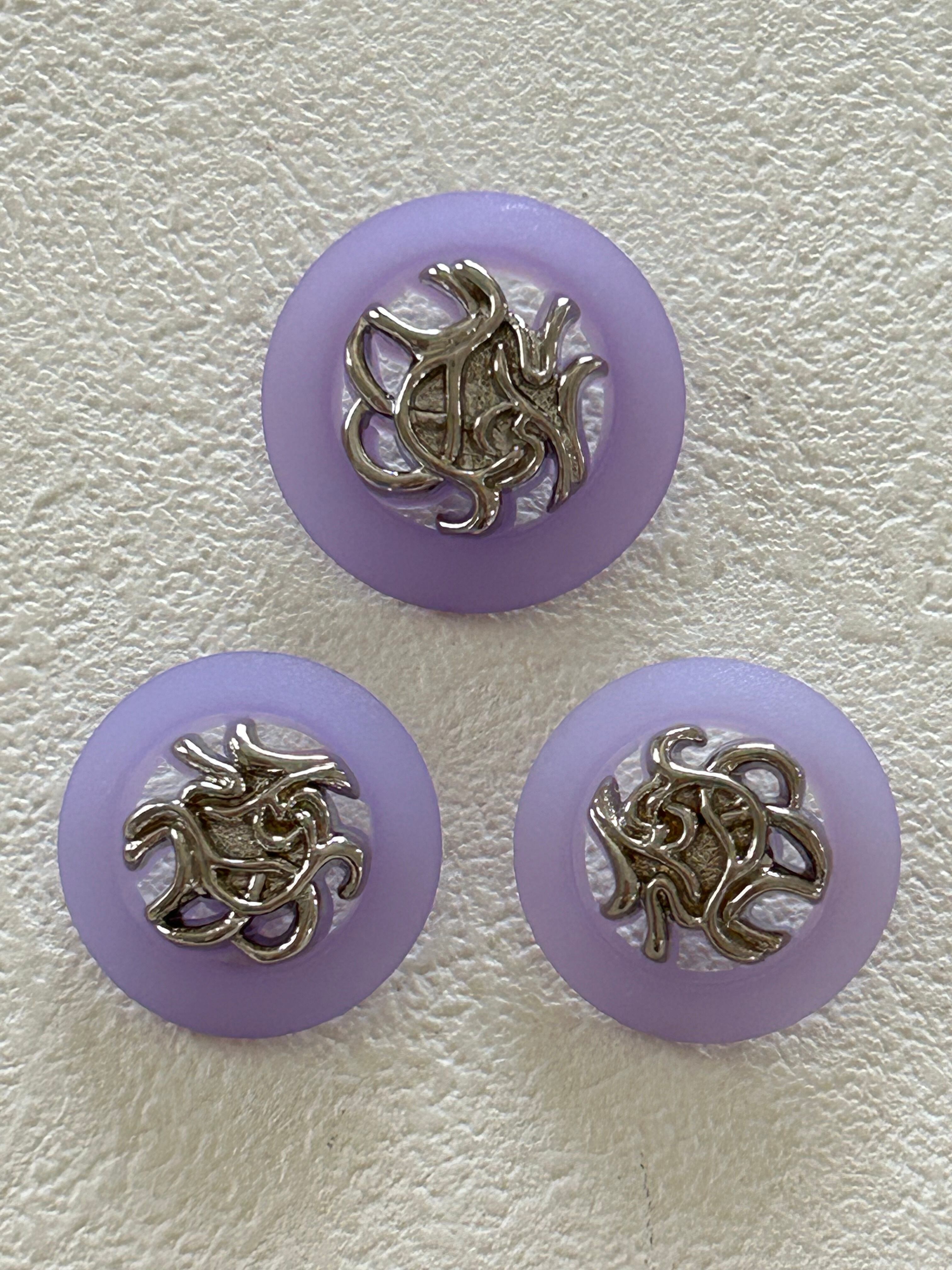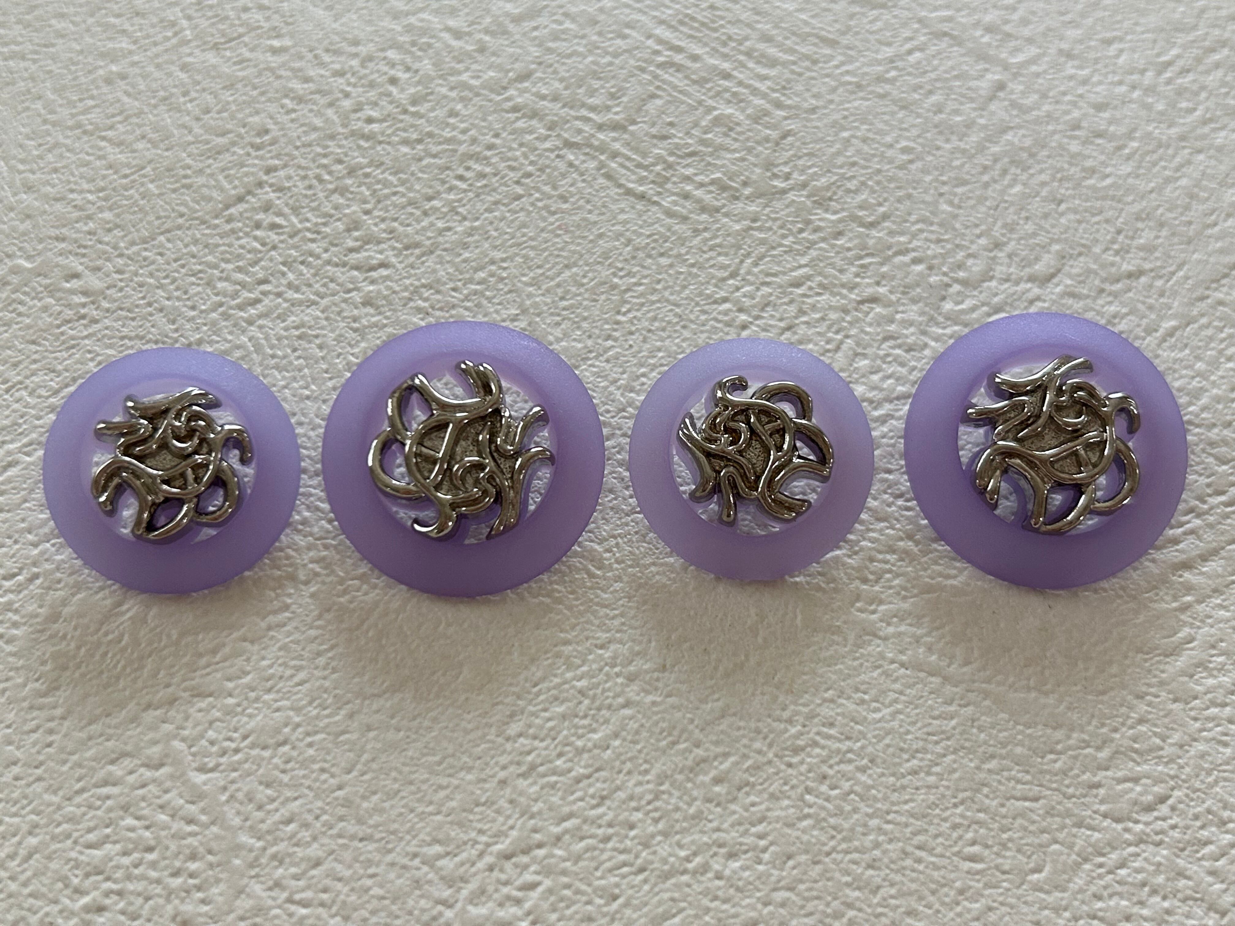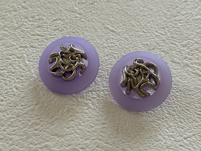 優しい藤色のようなパープルに画像のようなシルバーのデコラティブなデコレーションパーツ。ボタンの一部が画像のように透かしになっています。