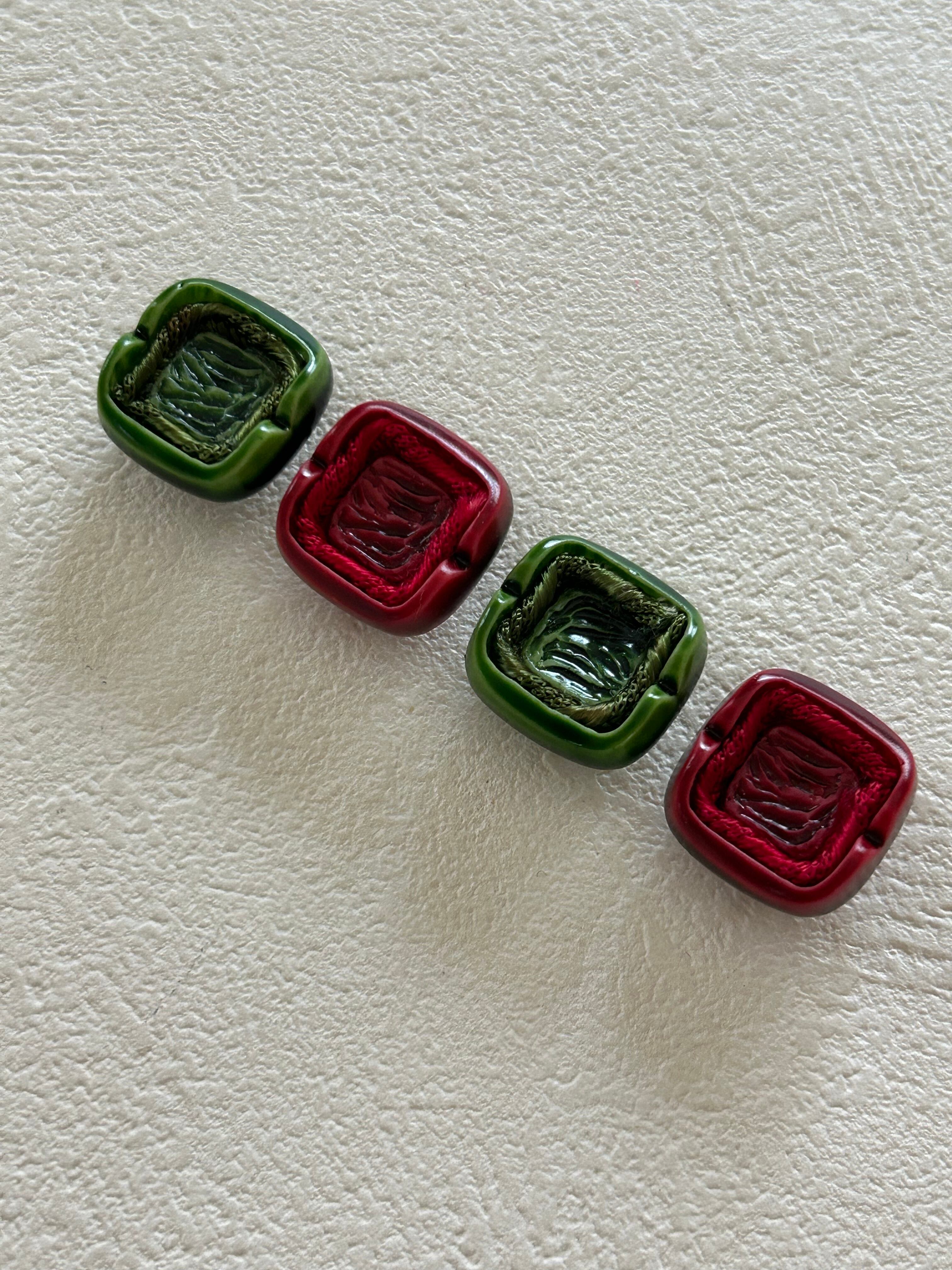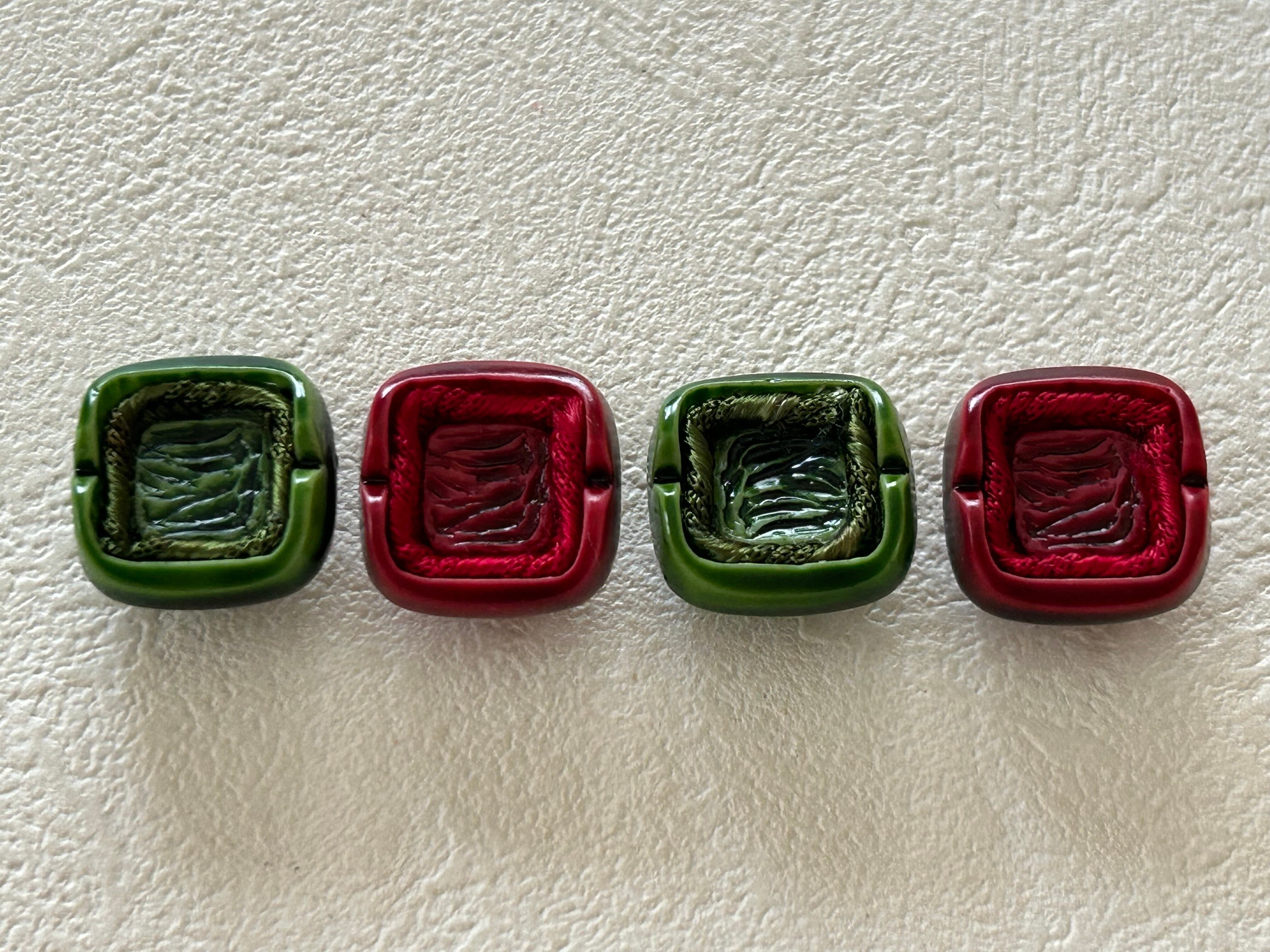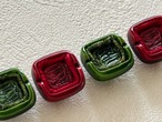 内側が窪んだスクウェア型。ぽってりとしたグリーン、レッドカラーに色付けされています。