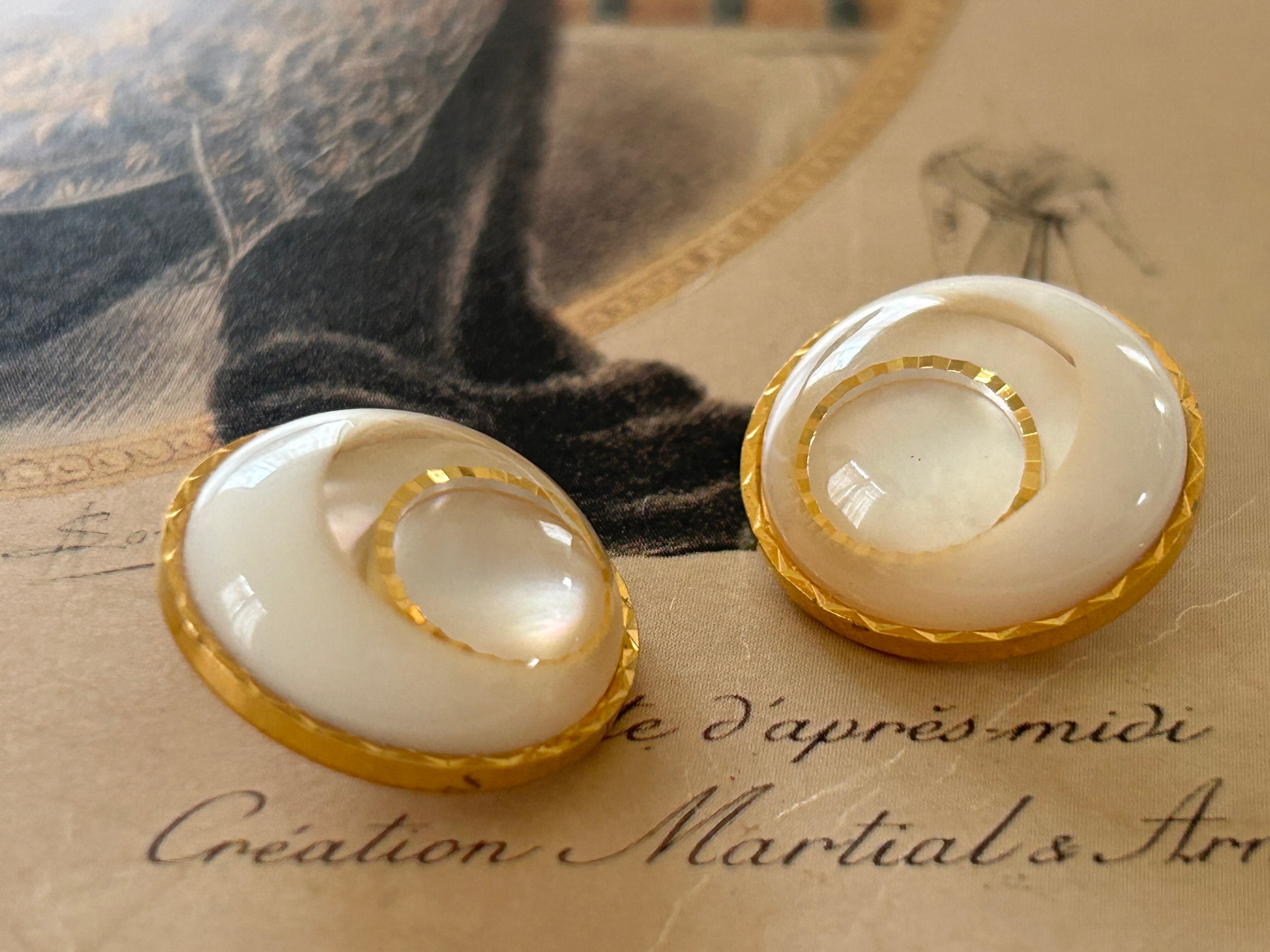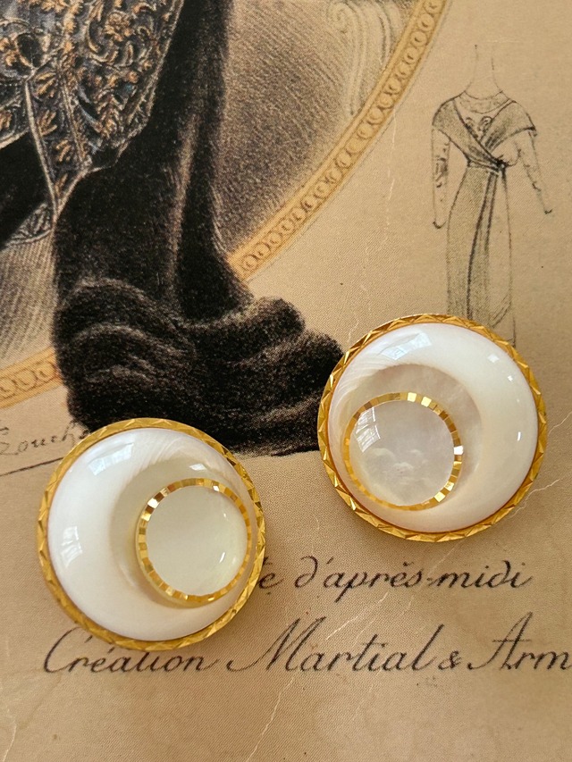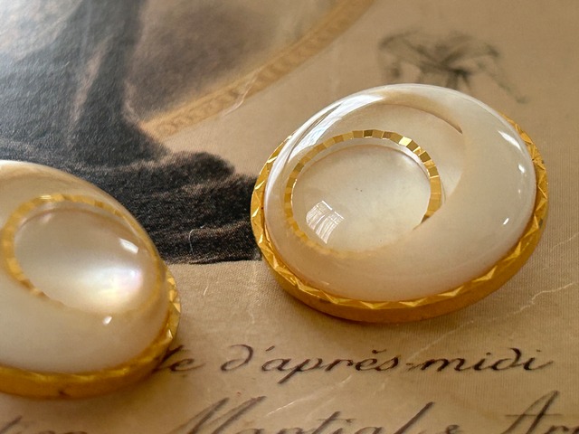ゴールドのメタル製の台座にシェル・マーブル調のカボションが設置されています。