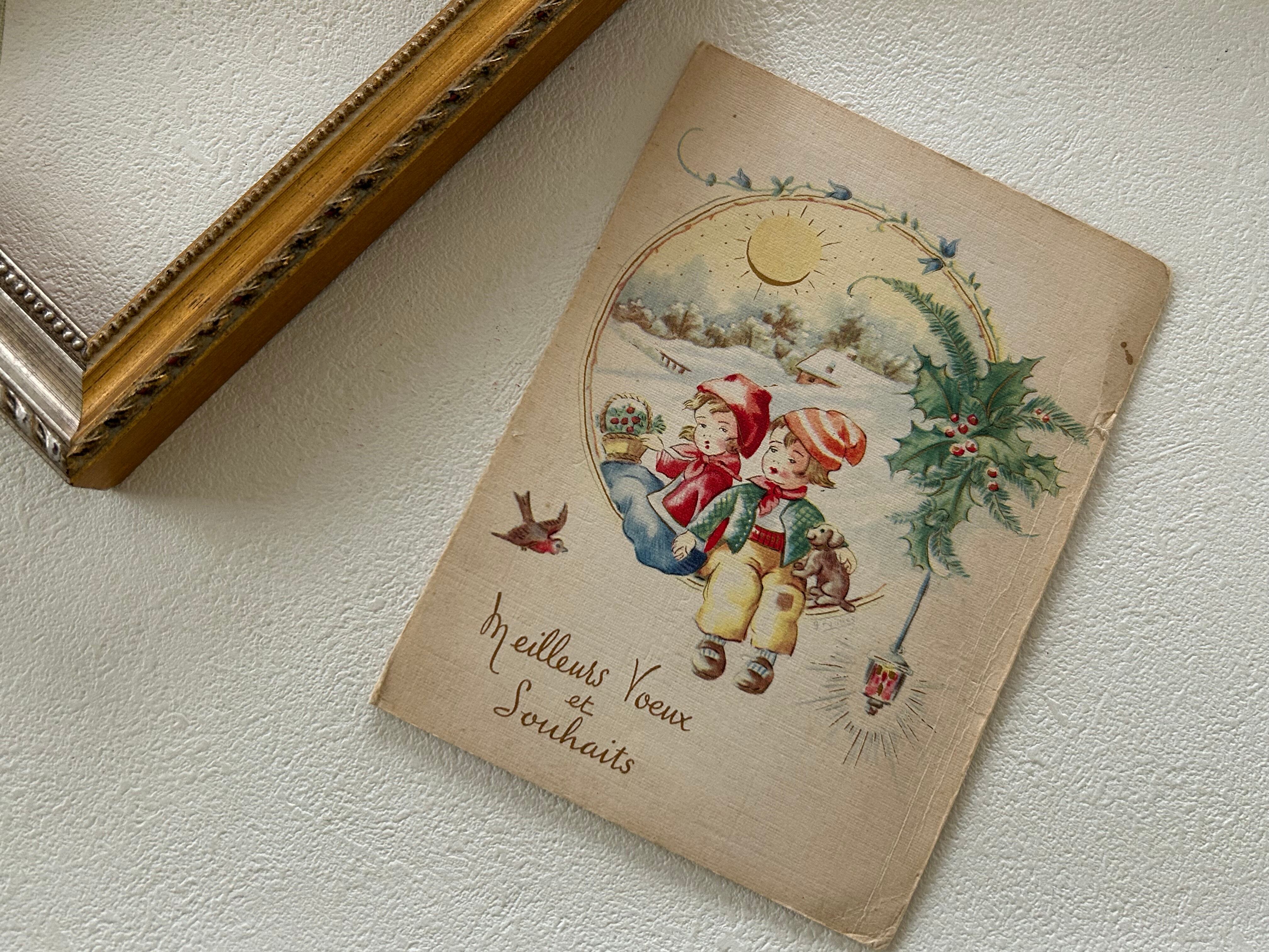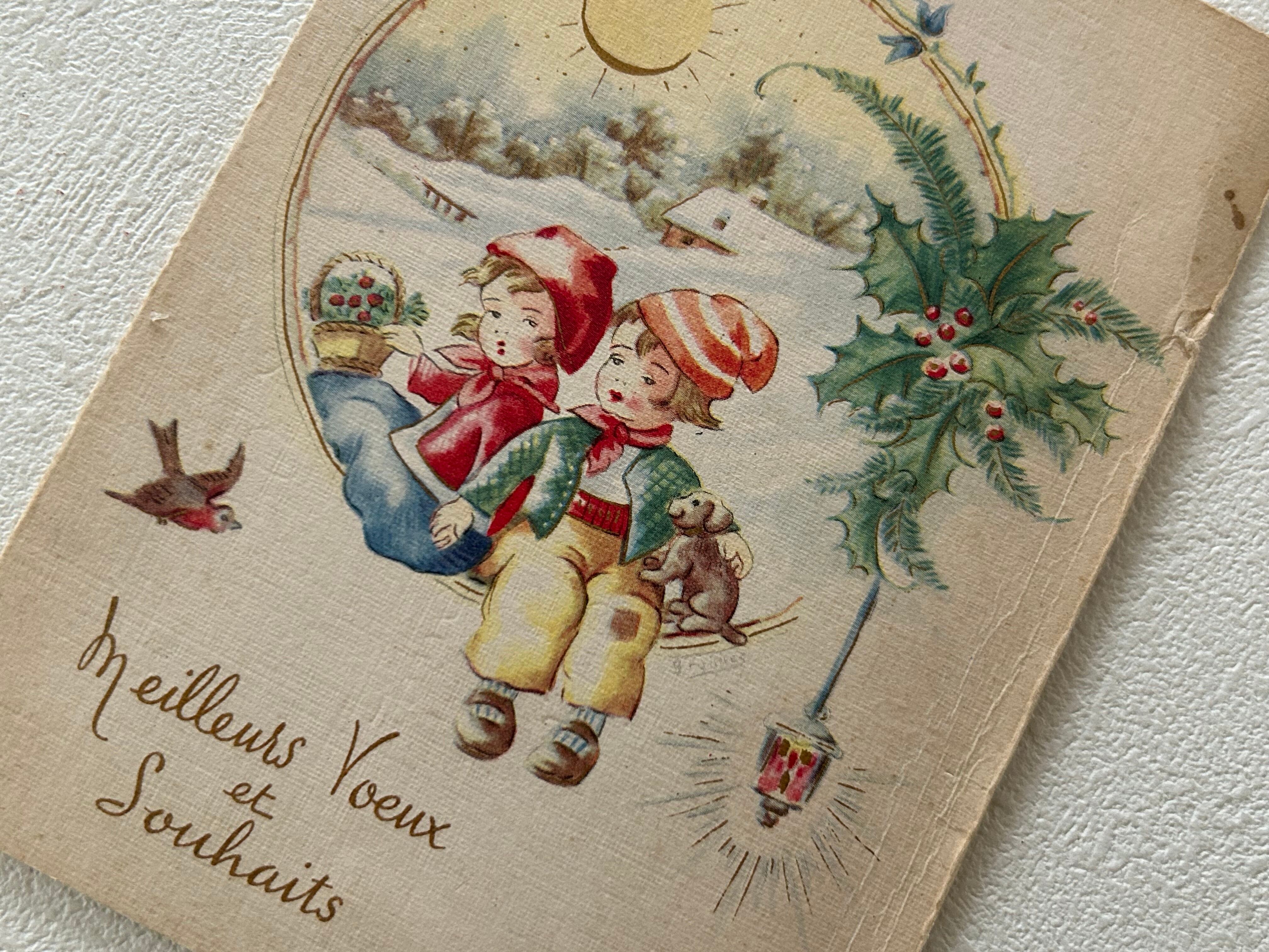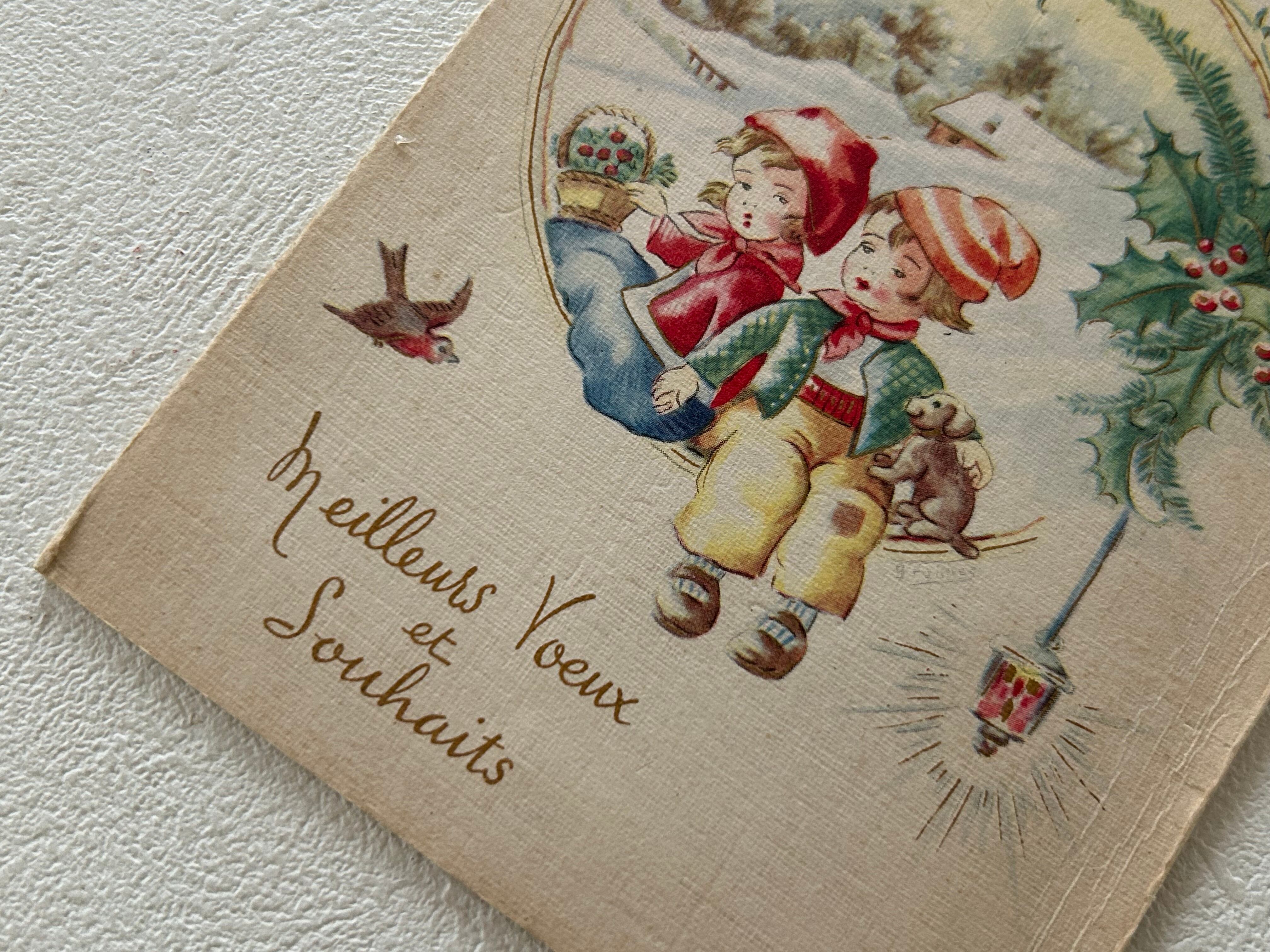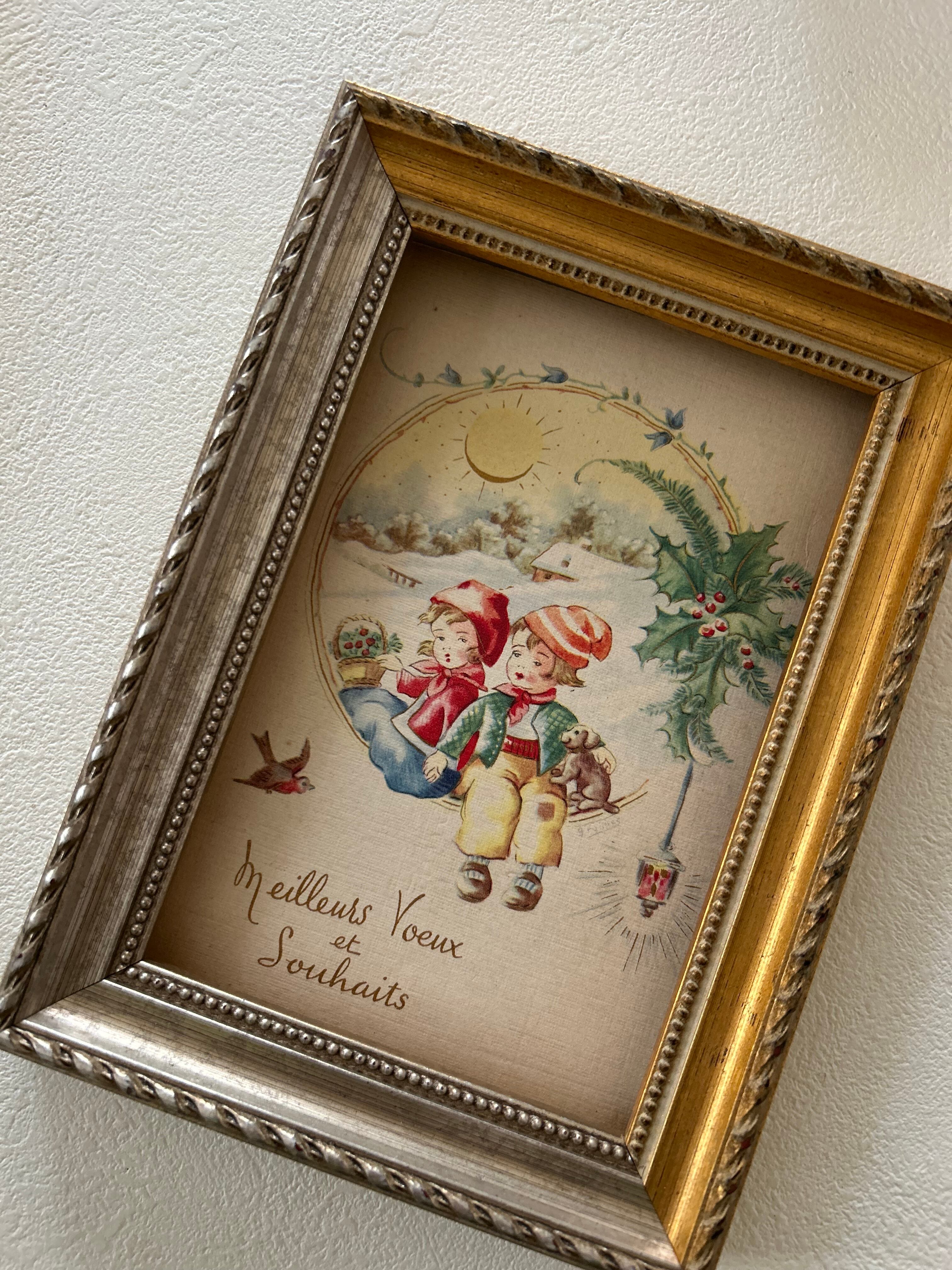 フランスVintage クリスマスのメッセージカード 見開きタイプ 雪景色 柊 ランタン 額装 コラージュ