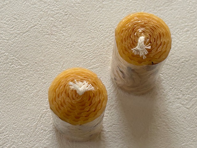 蜂の巣柄に型押しされたシートを芯に巻き付けキャンドルに。