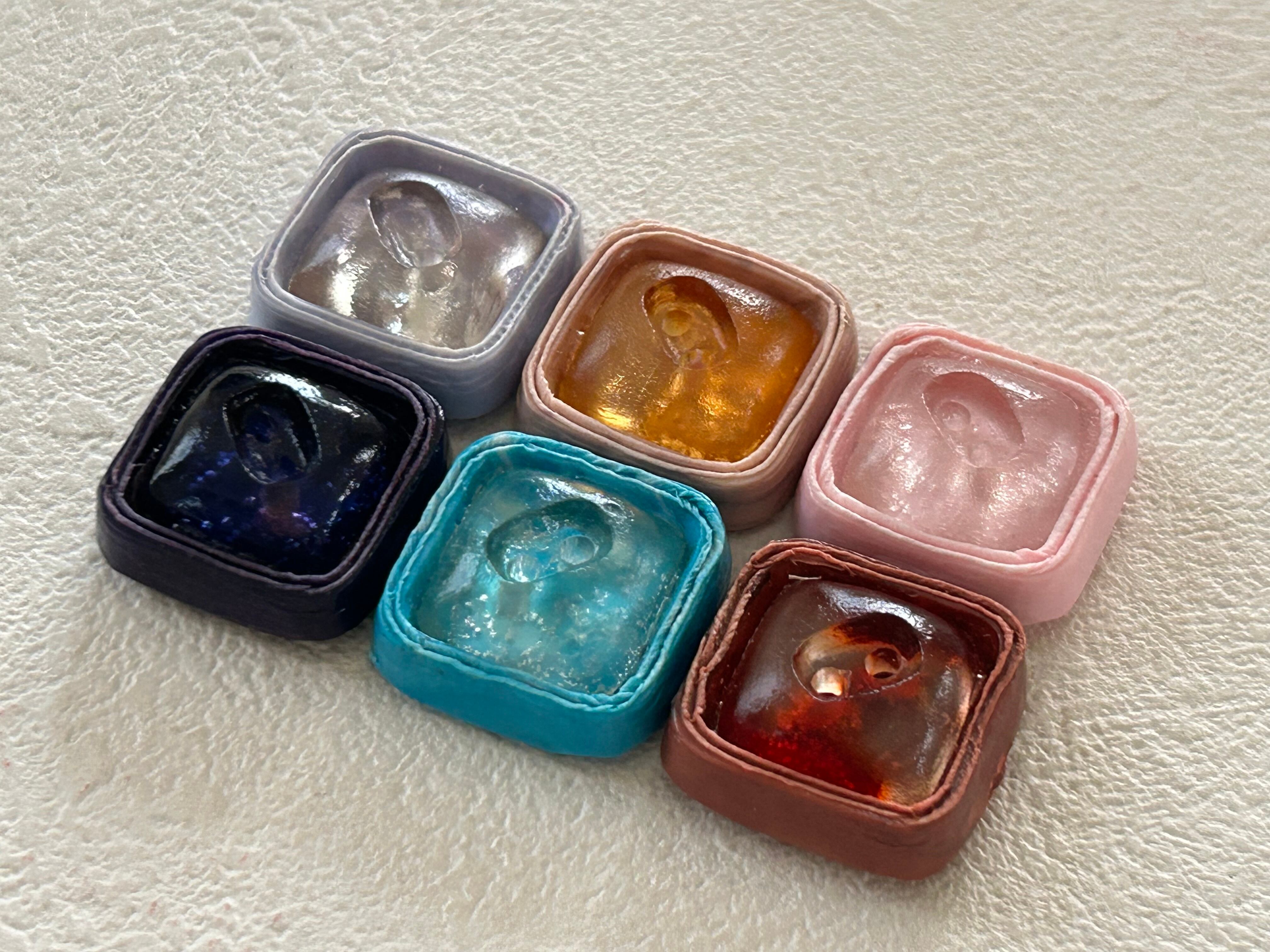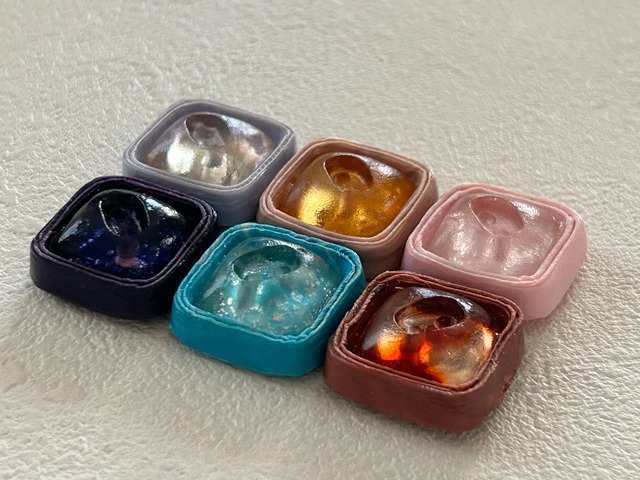 レトロでマットな質感の台座にぽってりとしたクリアな同系色の樹脂がドーム状になったデザイン。