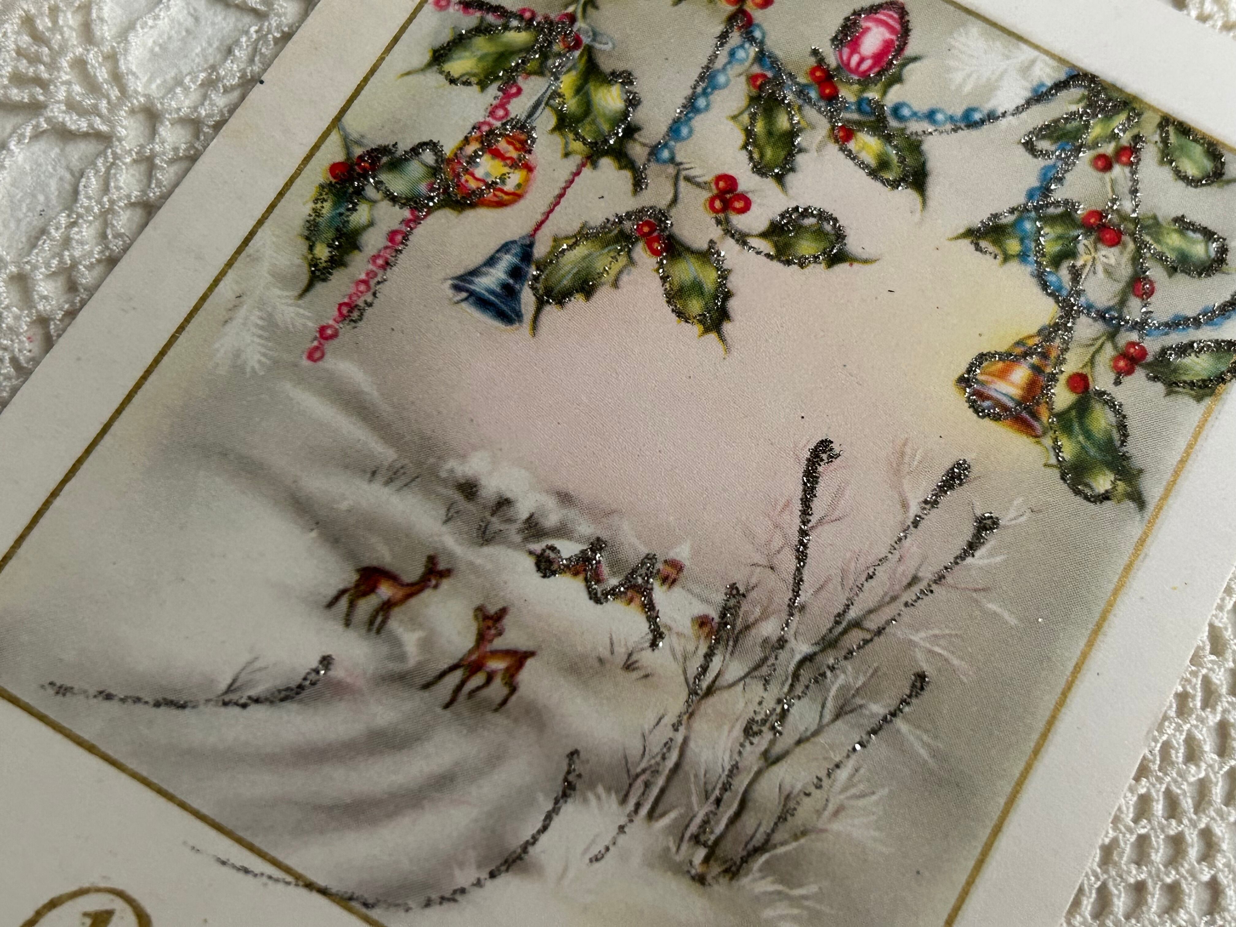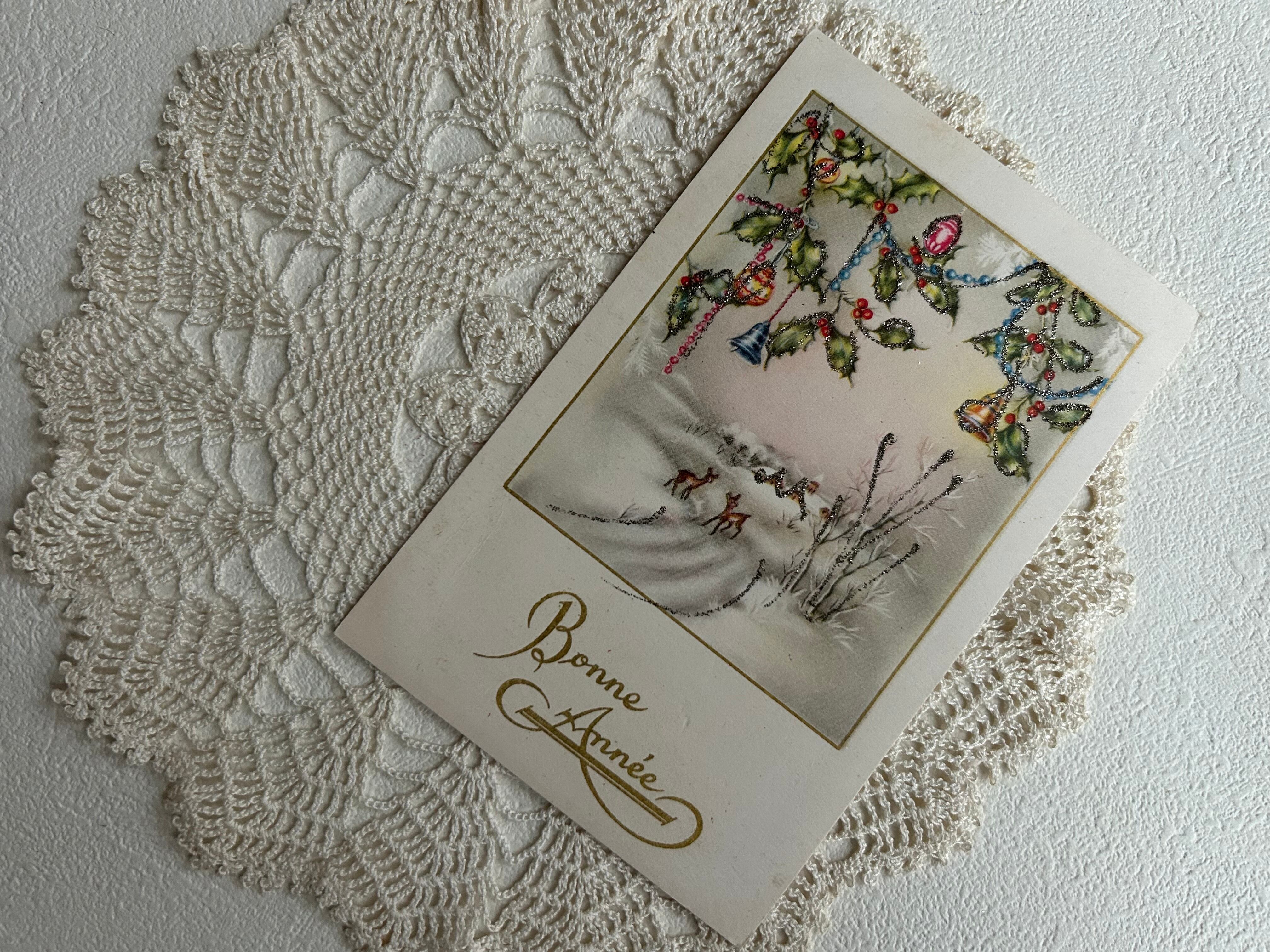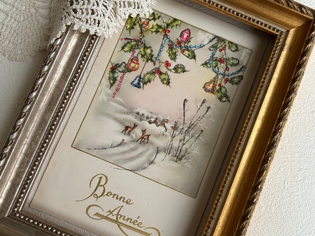アンティークポストカード Bonne Anee 雪景色 クリスマスベル 鹿 柊 オーナメント フランス 額装 インテリア