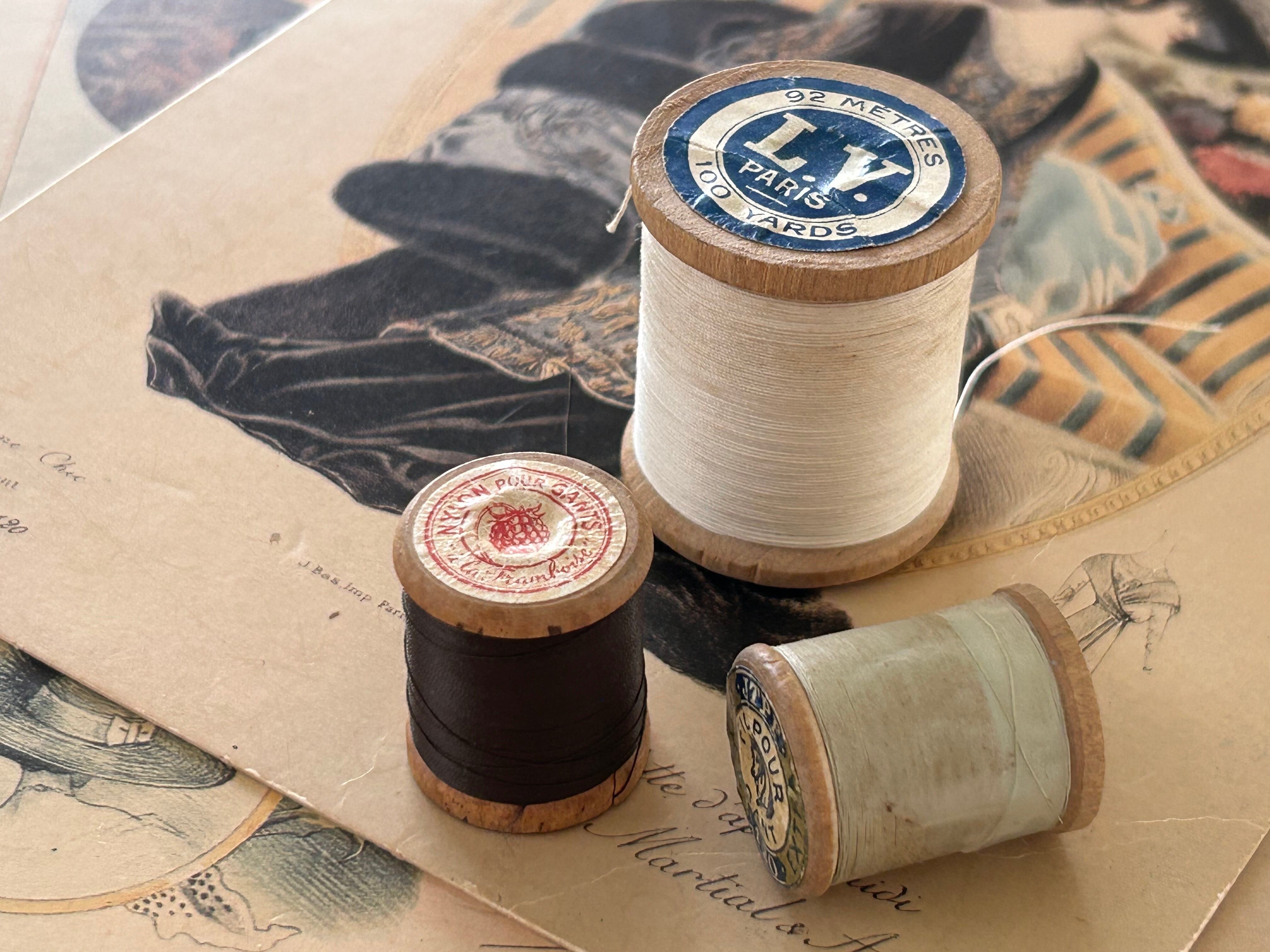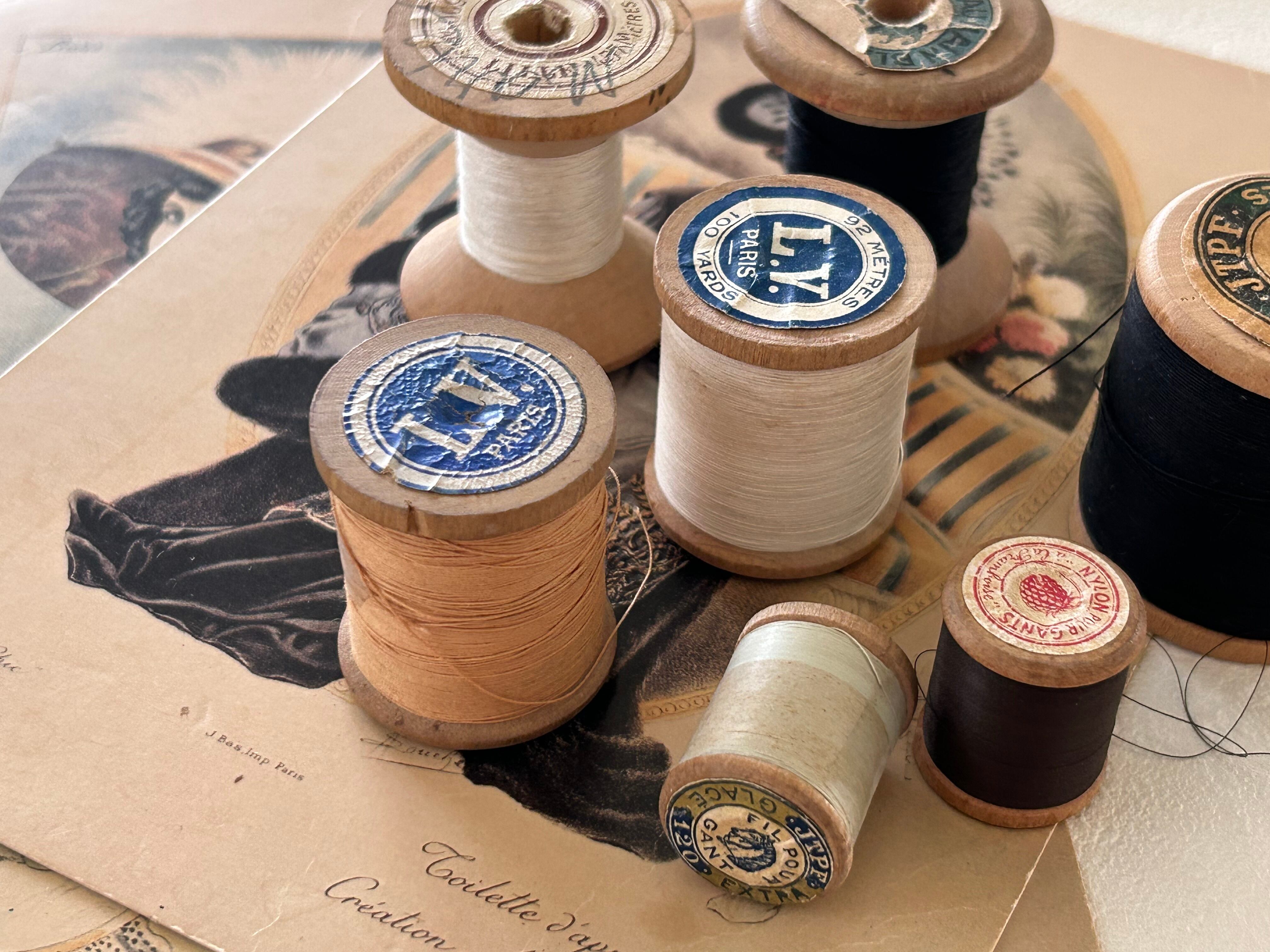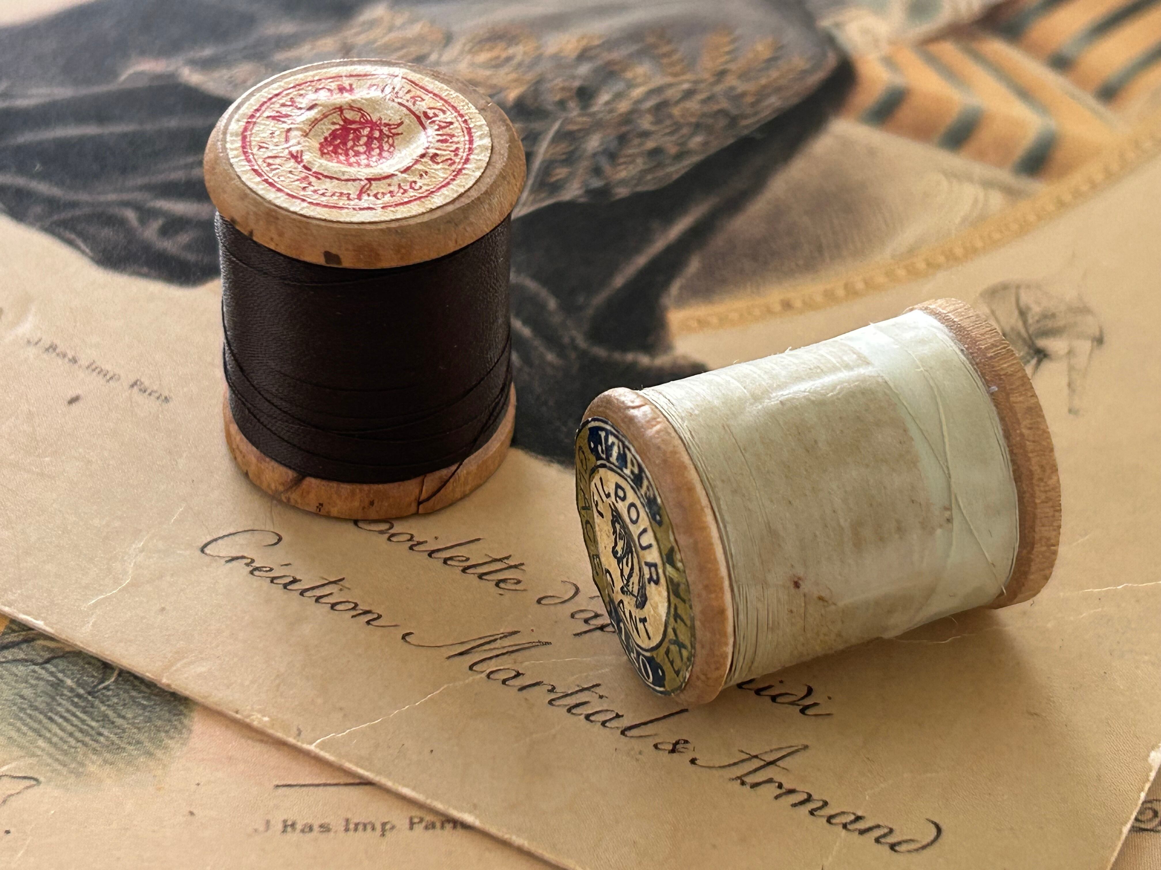 フランスアンティーク 小さな木製糸巻き 2個セット ライトブルー系/ブラウン JTPF社 インテリア小物 オブジェ 撮影小物
