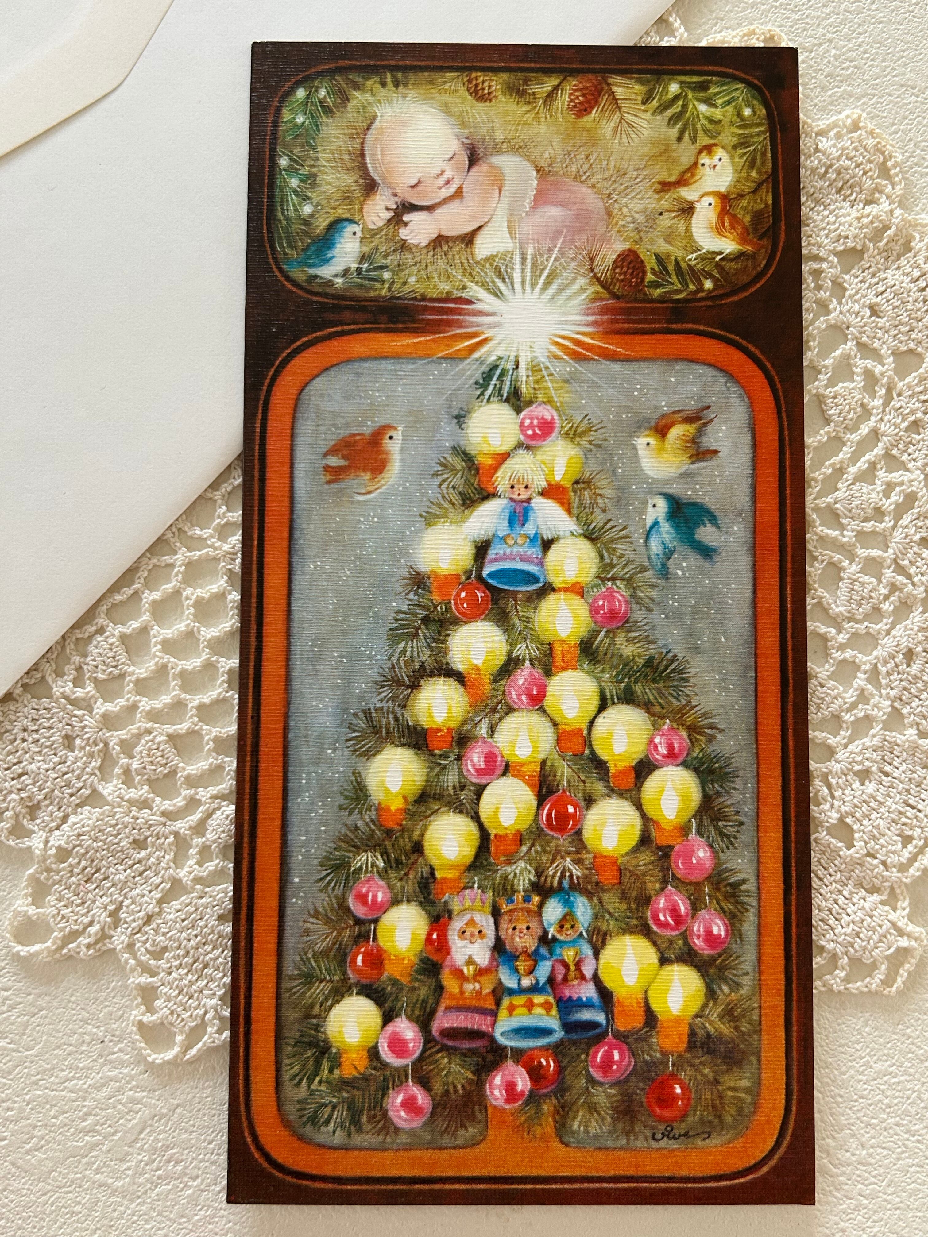 フランスVintage Joyeux Noël. メッセージカード 見開きタイプクリスマスツリー ベツレヘムの星 イエスキリスト 額装 コラージュ
