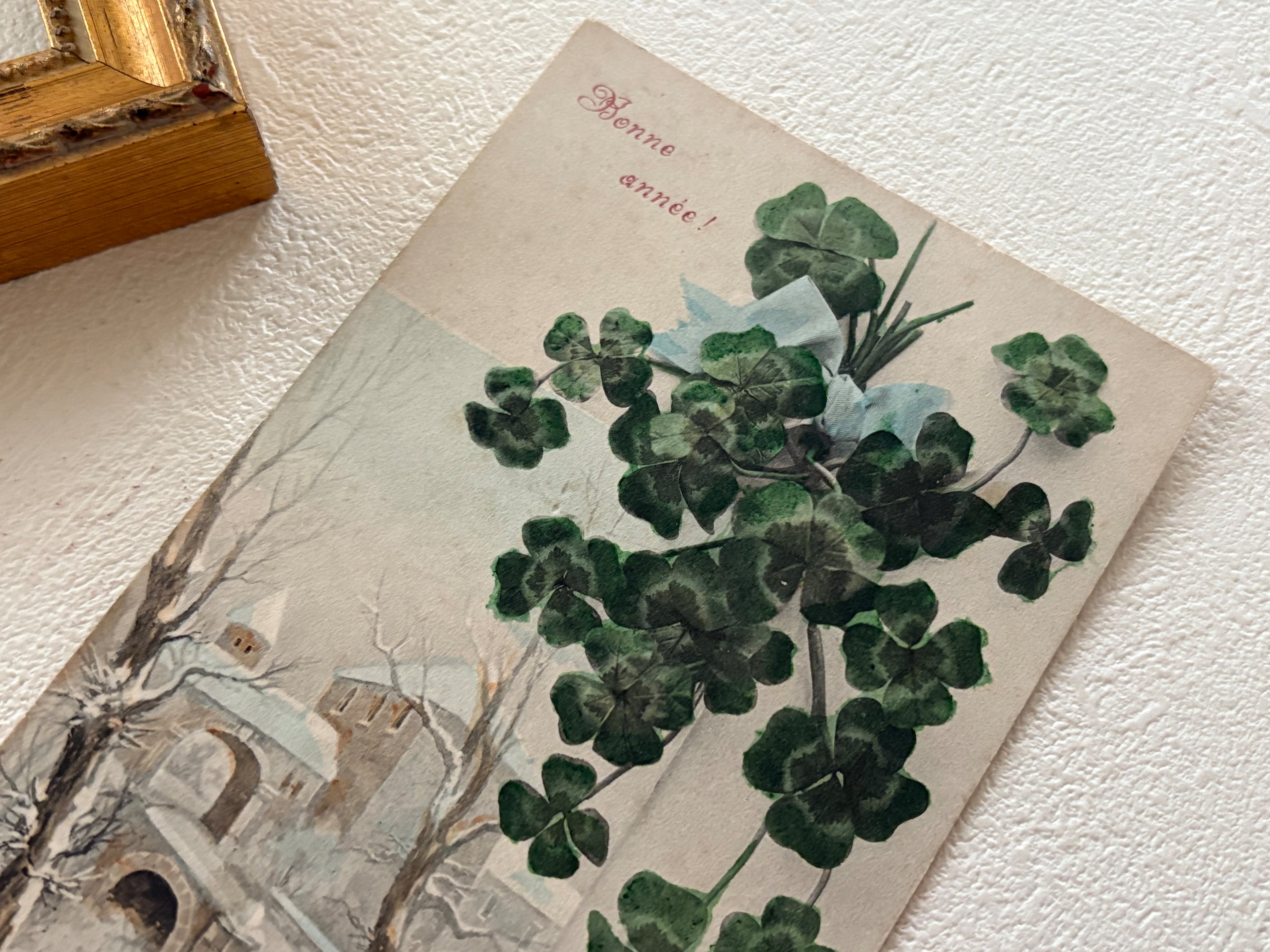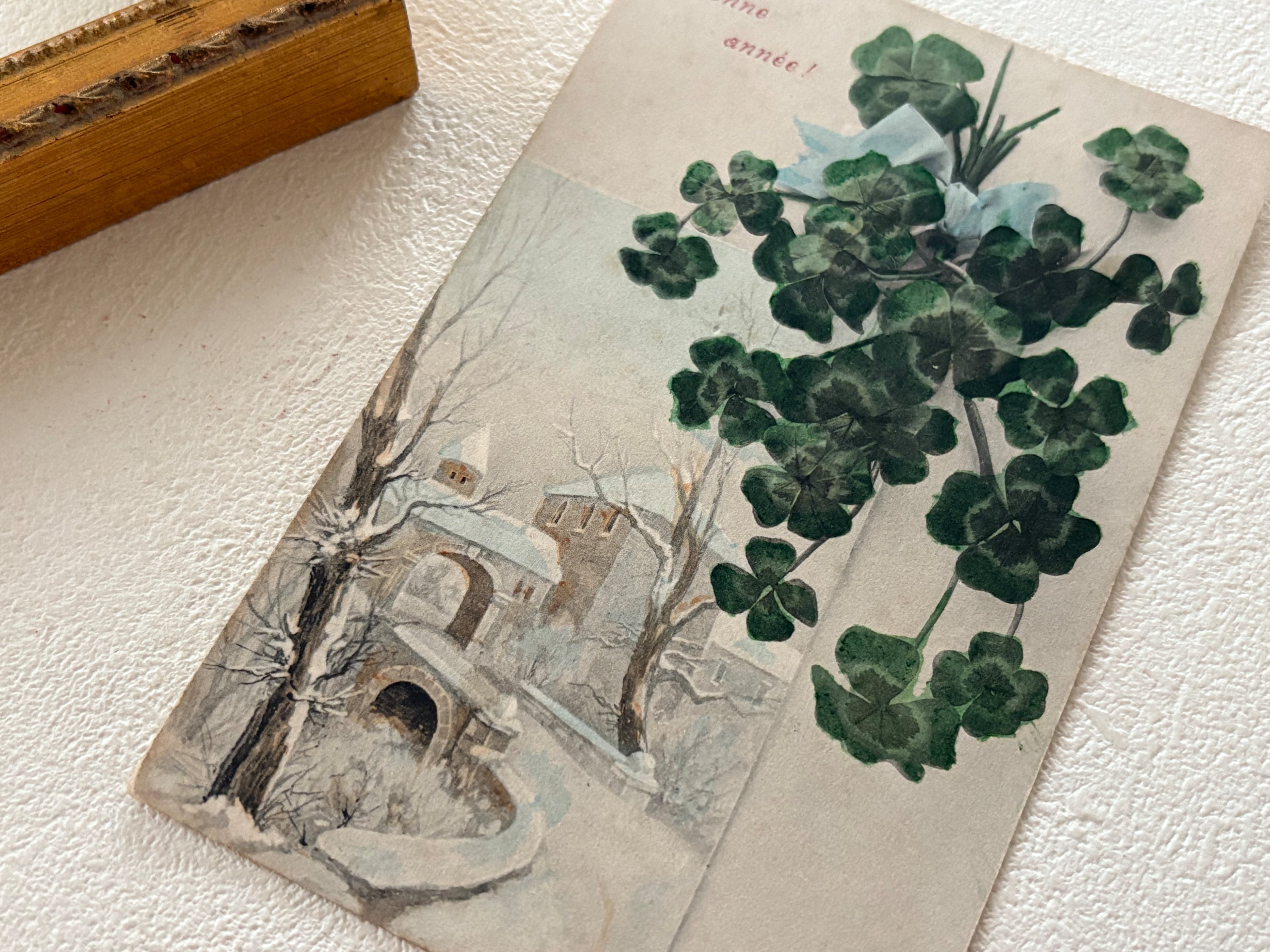 アンティークポストカード Bonne Anee 雪景色 橋のかかる街 四葉 Ruban リボン フランス 額装 インテリア
