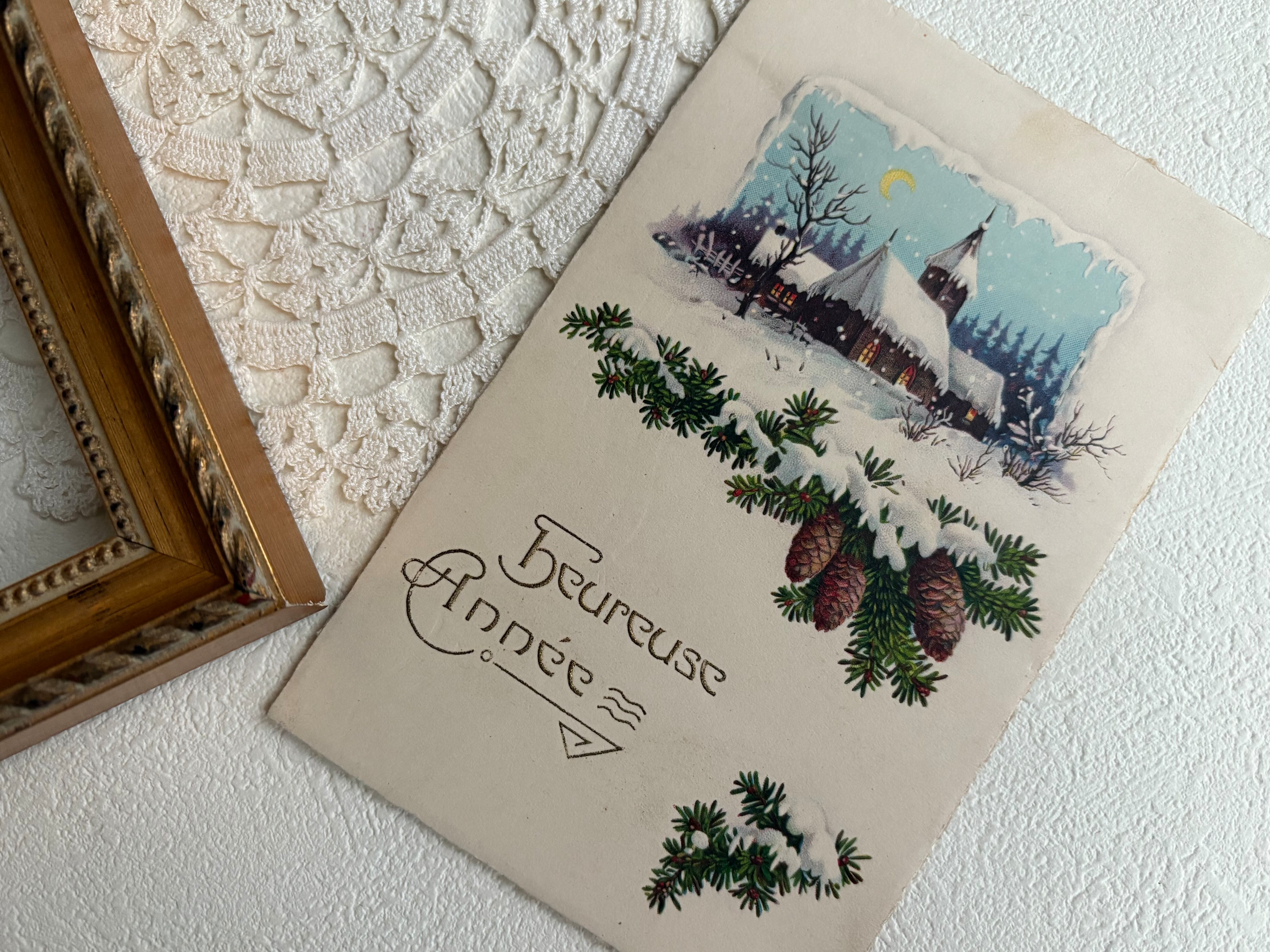 アンティークポストカード heureuse annee 1936年 月夜の雪景色 松ぼっくり クリスマス 額装 インテリア コレクション