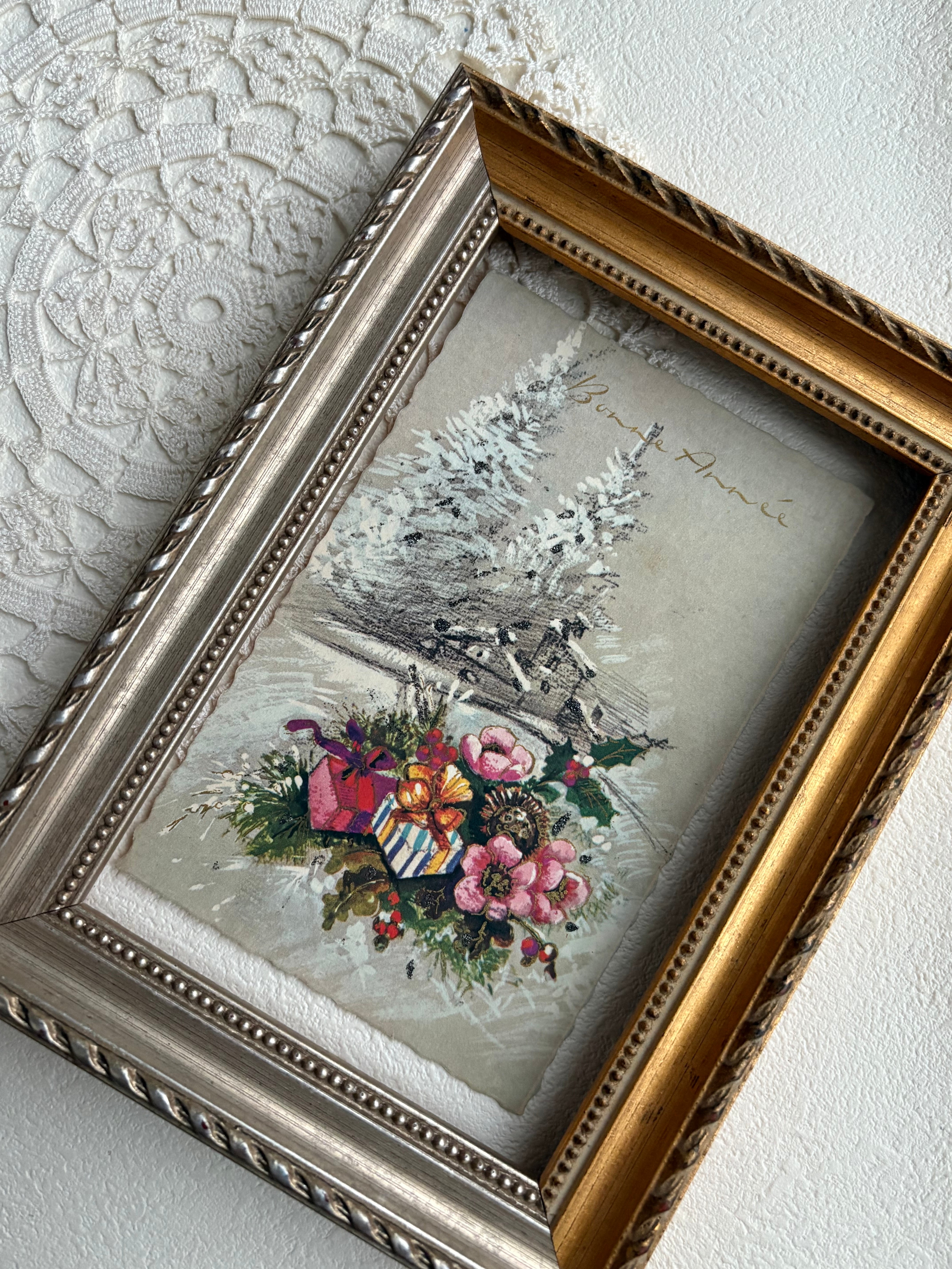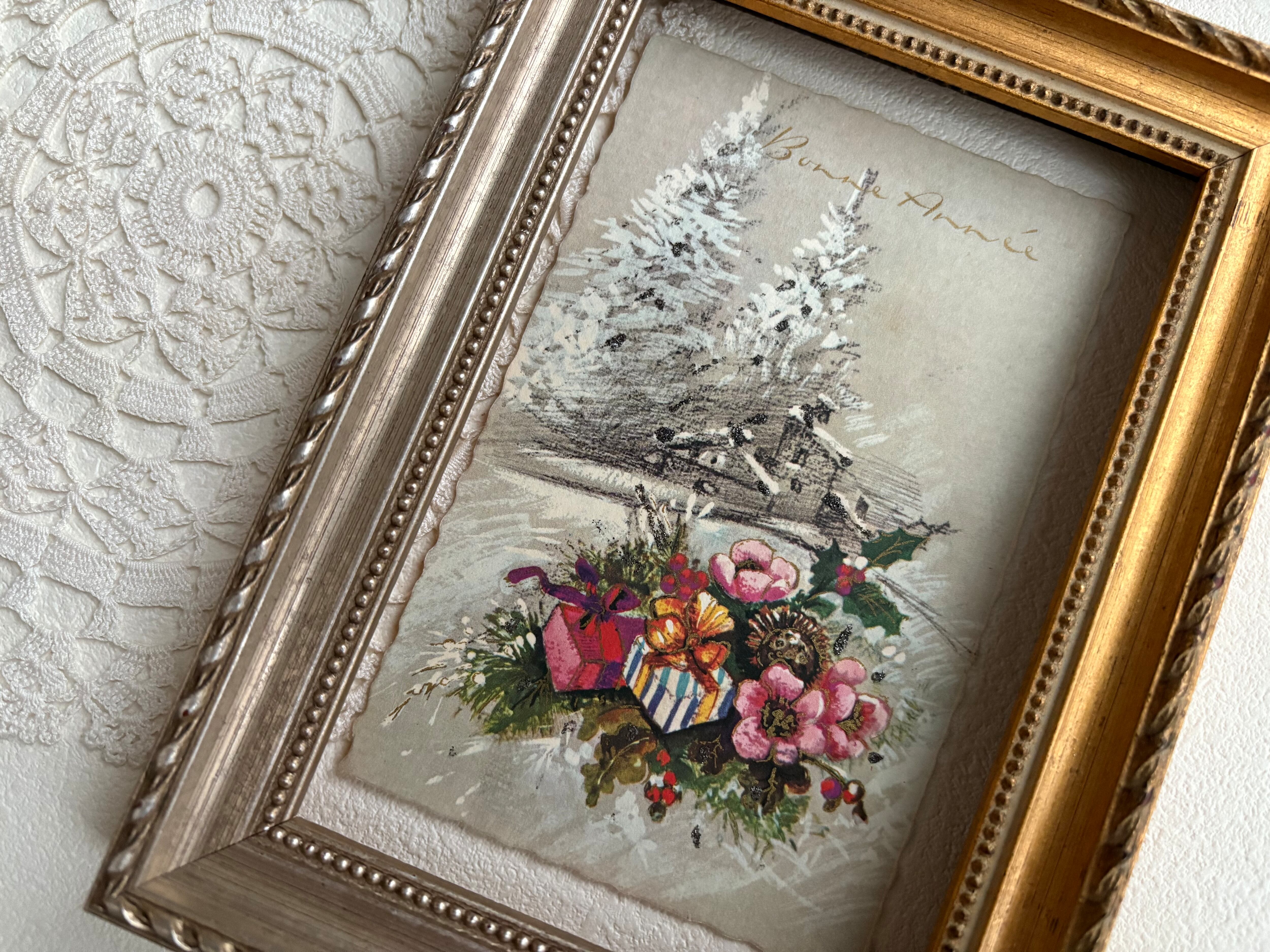 アンティークポストカード Bonne Anee 雪景色 柊 プレゼント 1975年 フランス 額装 インテリア コレクション