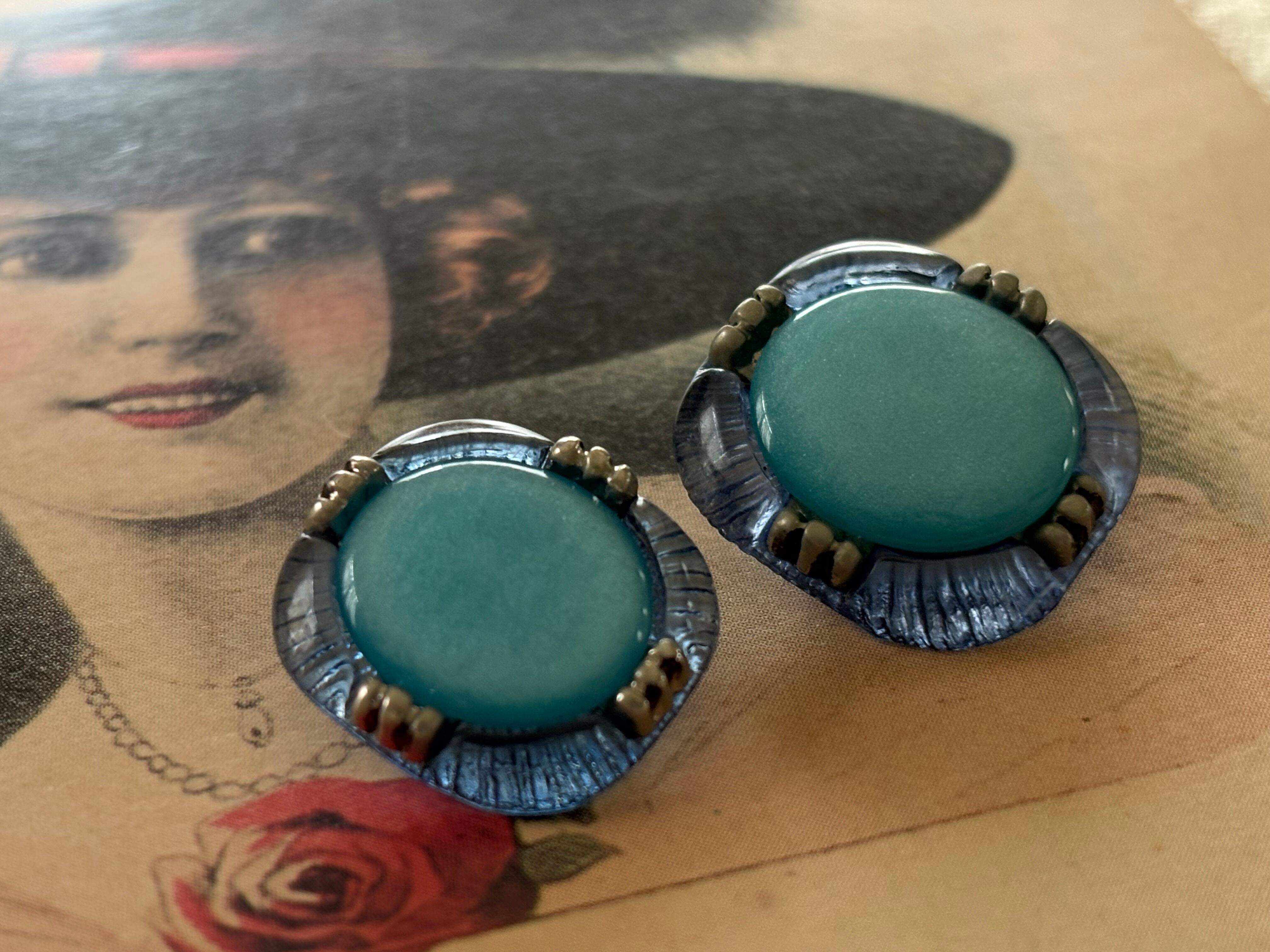 角の丸い長方形の台座に艶やかなオーバル型のライトブルーのカボション。