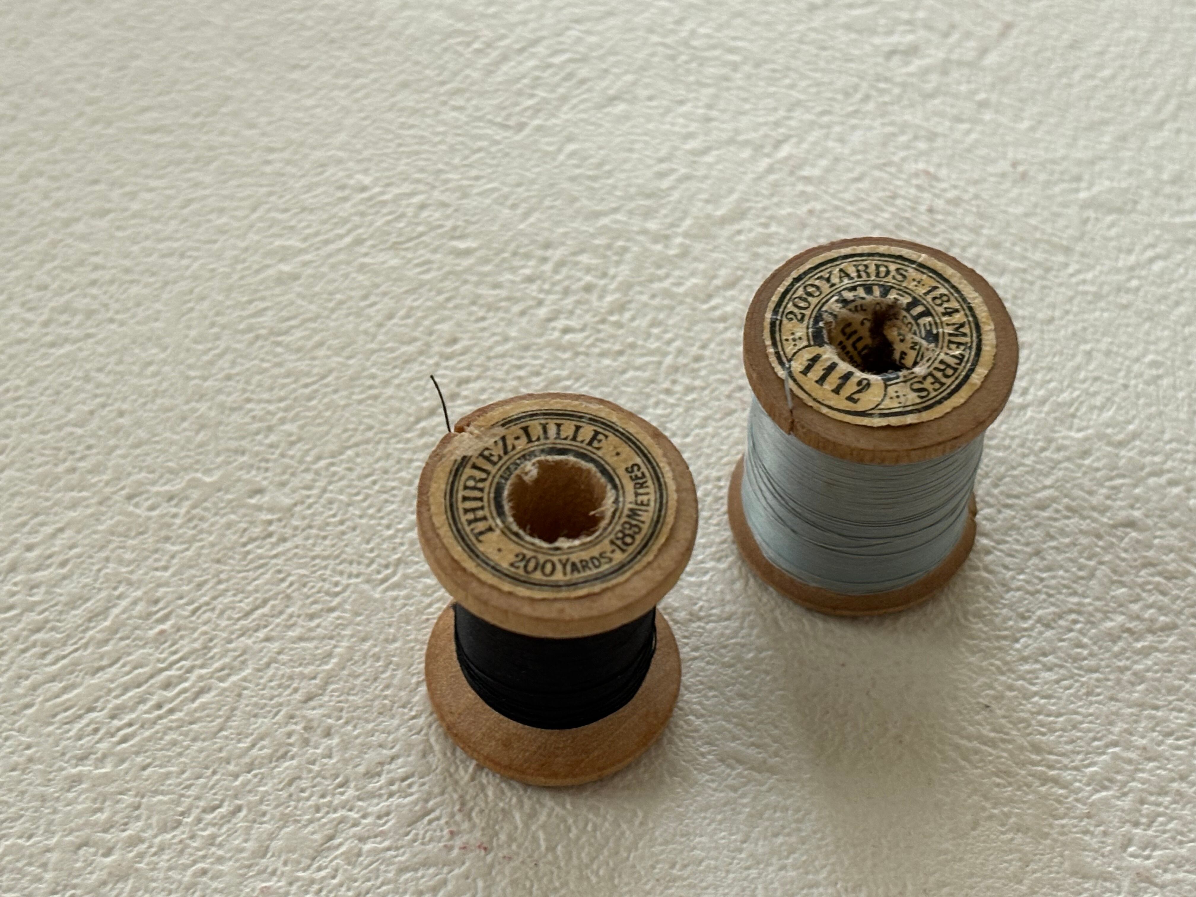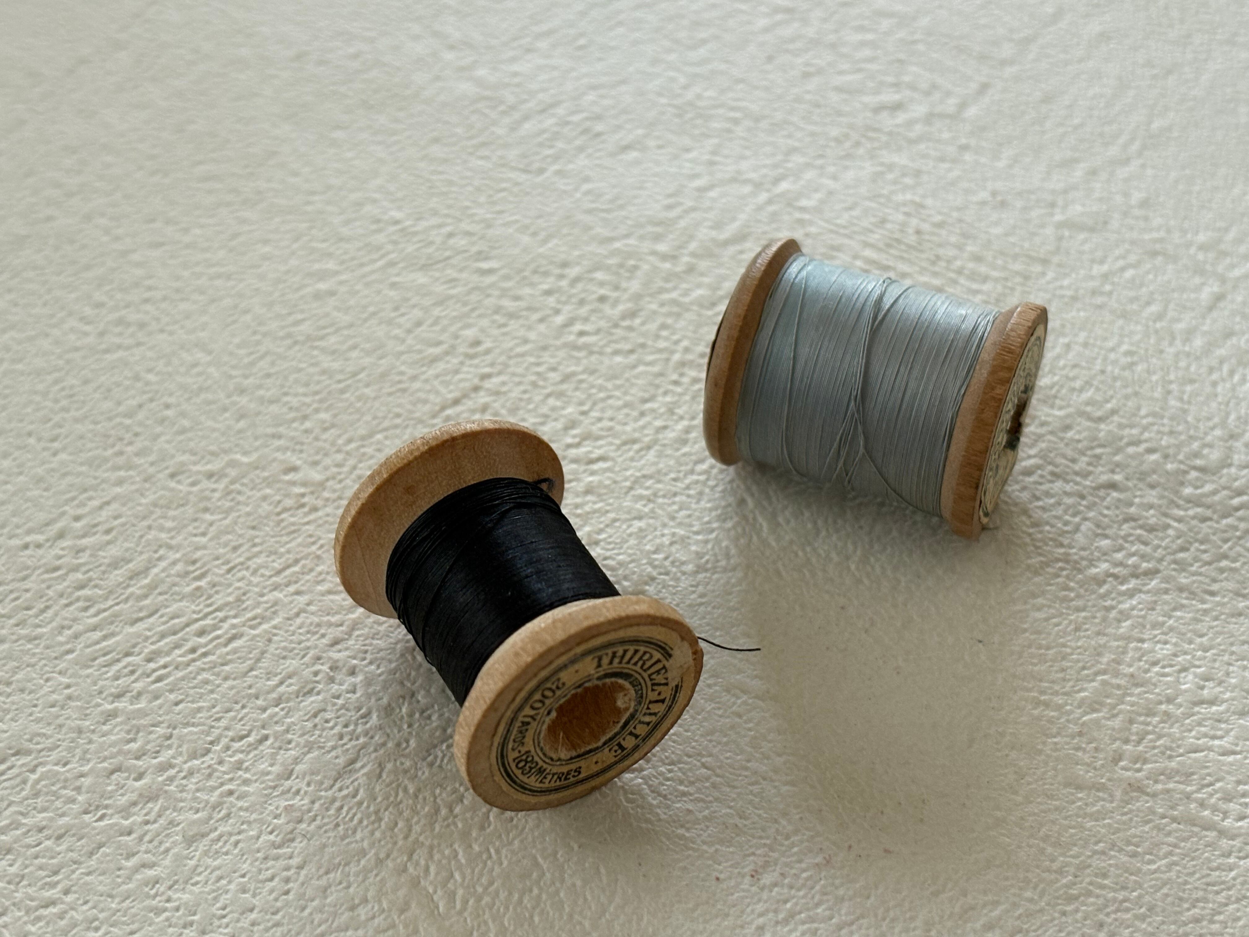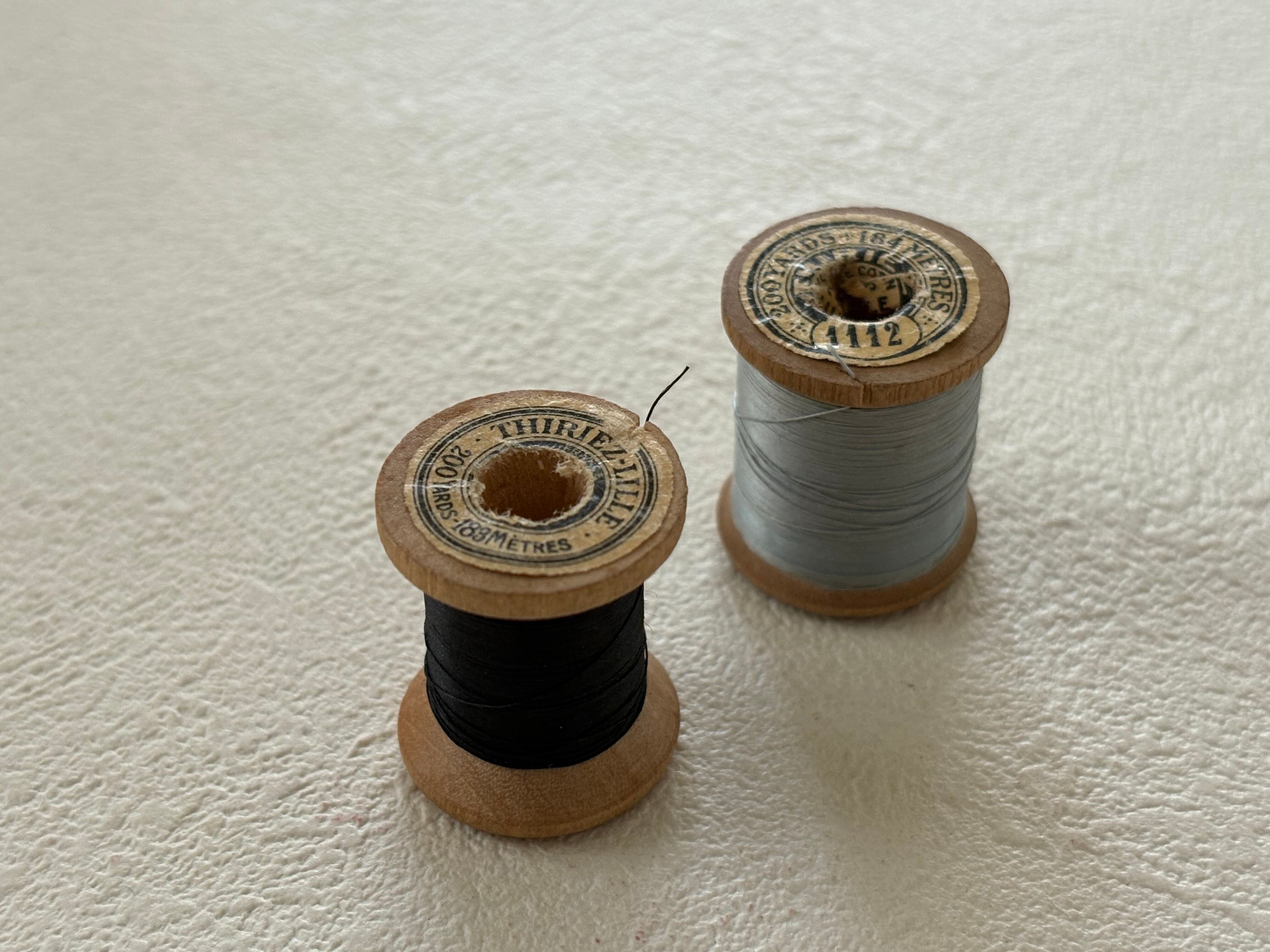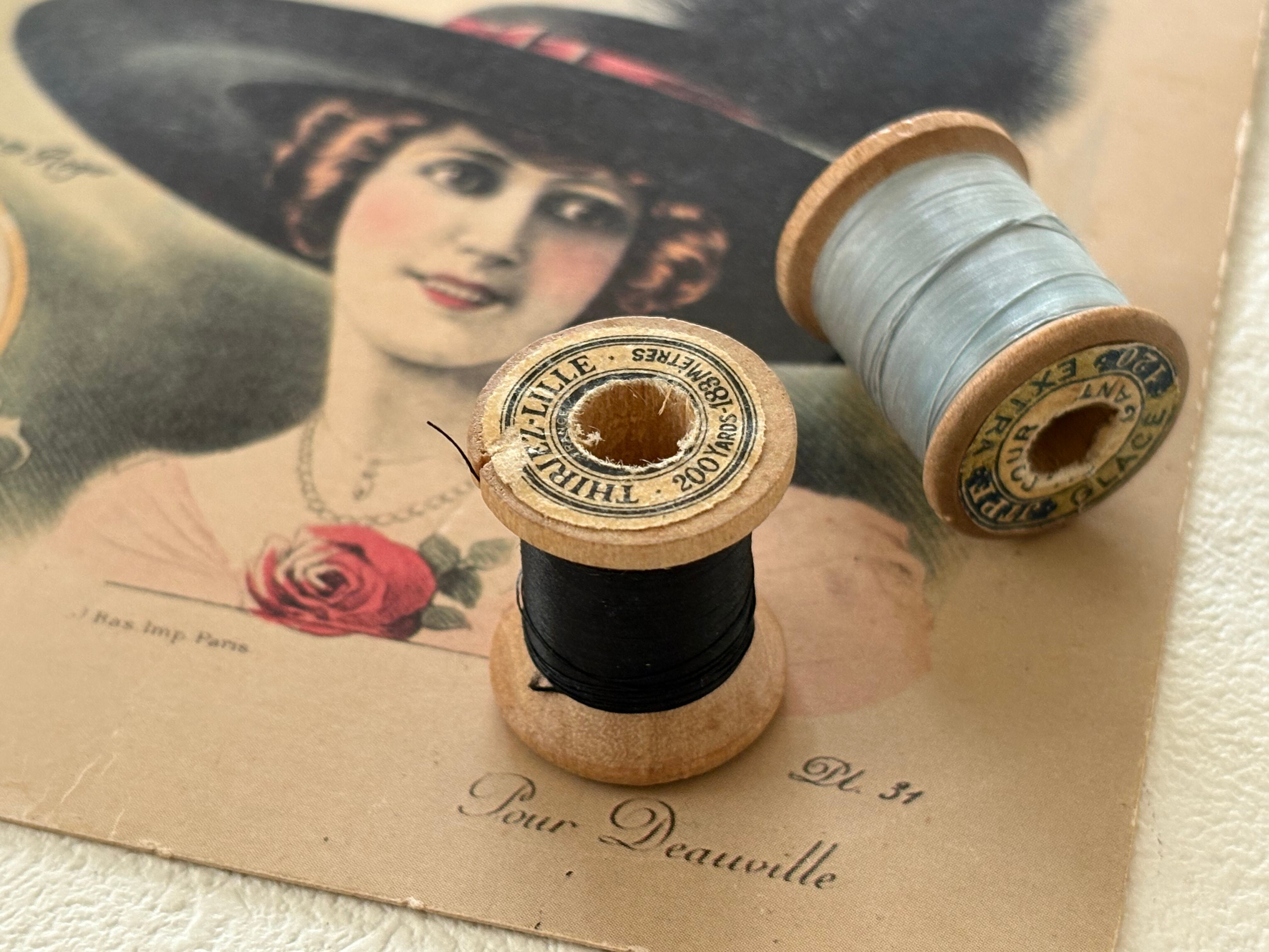 フランスアンティーク 小さな木製糸巻き 2個セット ライトブルー系/ブラック JTPF社 インテリア小物 オブジェ 撮影小物