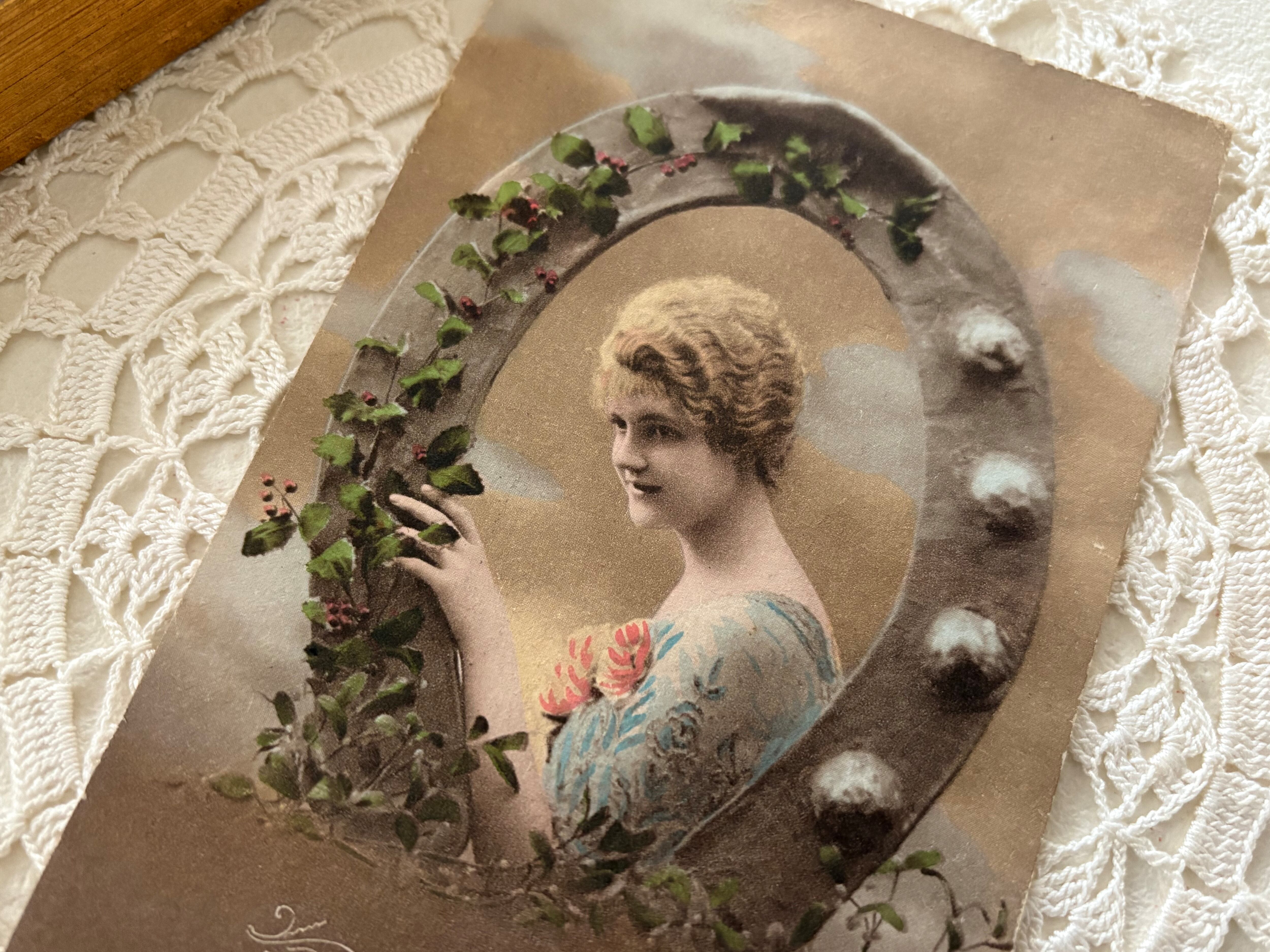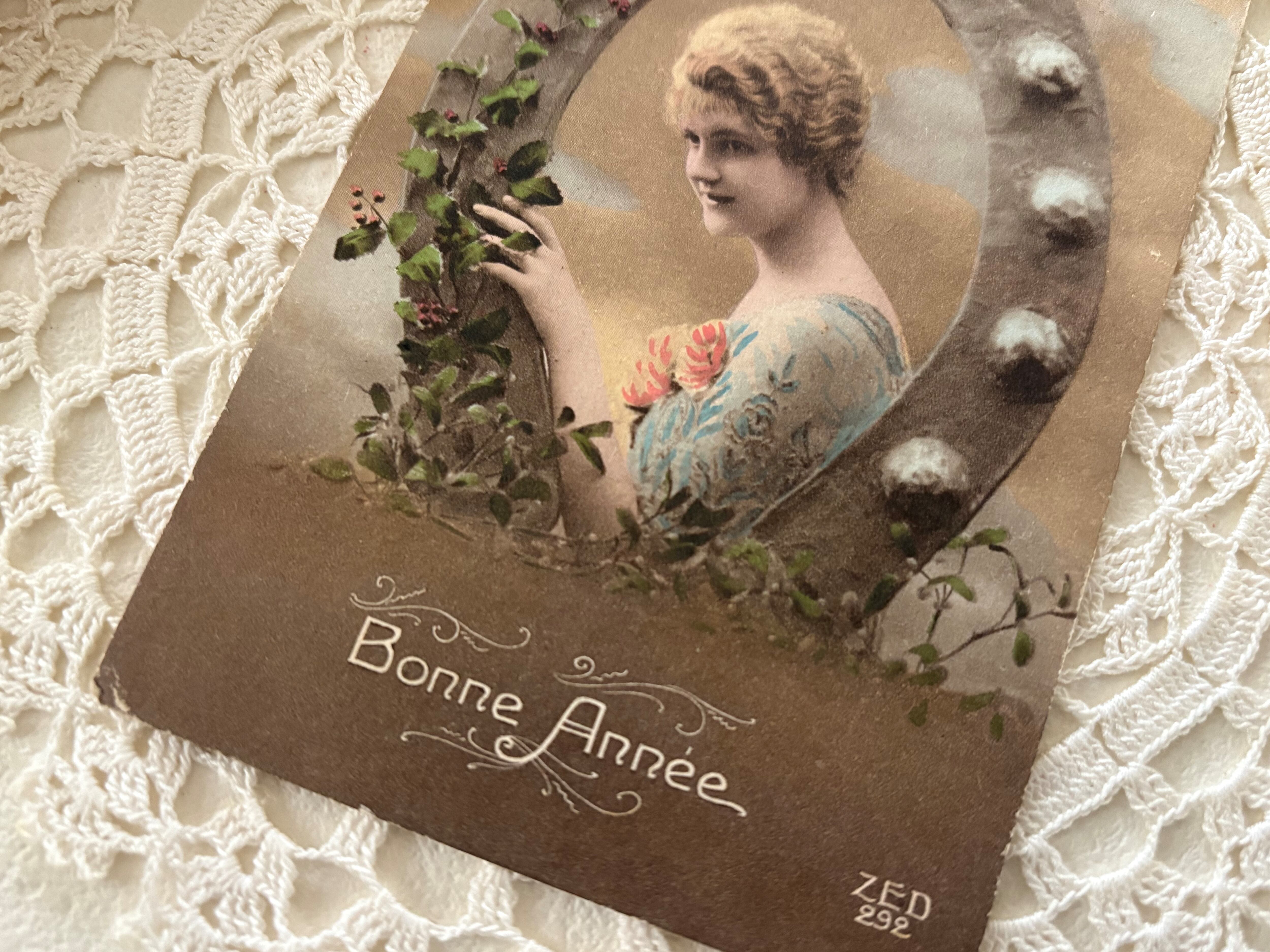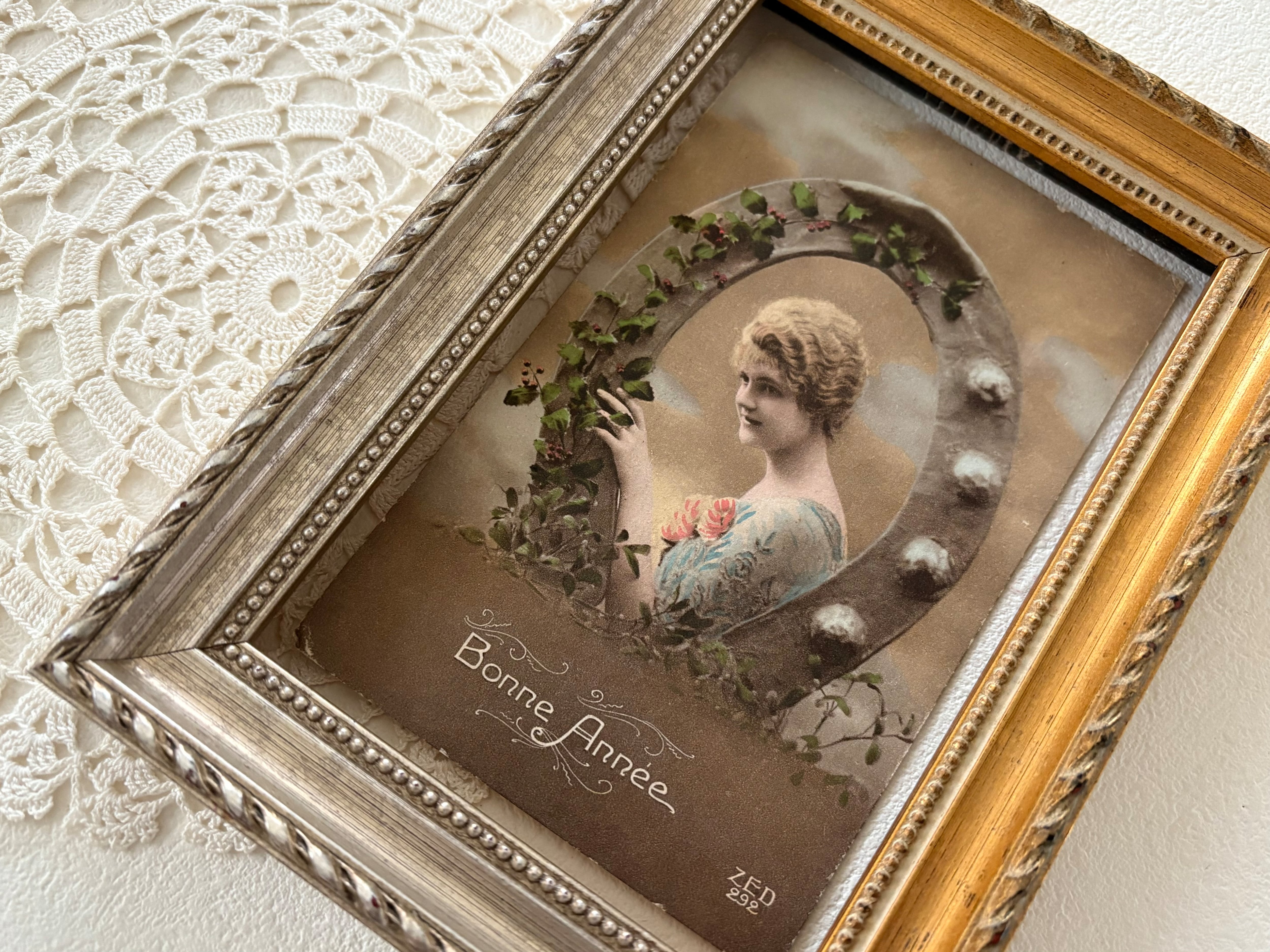 アンティークポストカード Bonne Anee 柊 ヤドリギ 馬蹄 マダム Noel クリスマス フランス 額装 インテリア コレクション