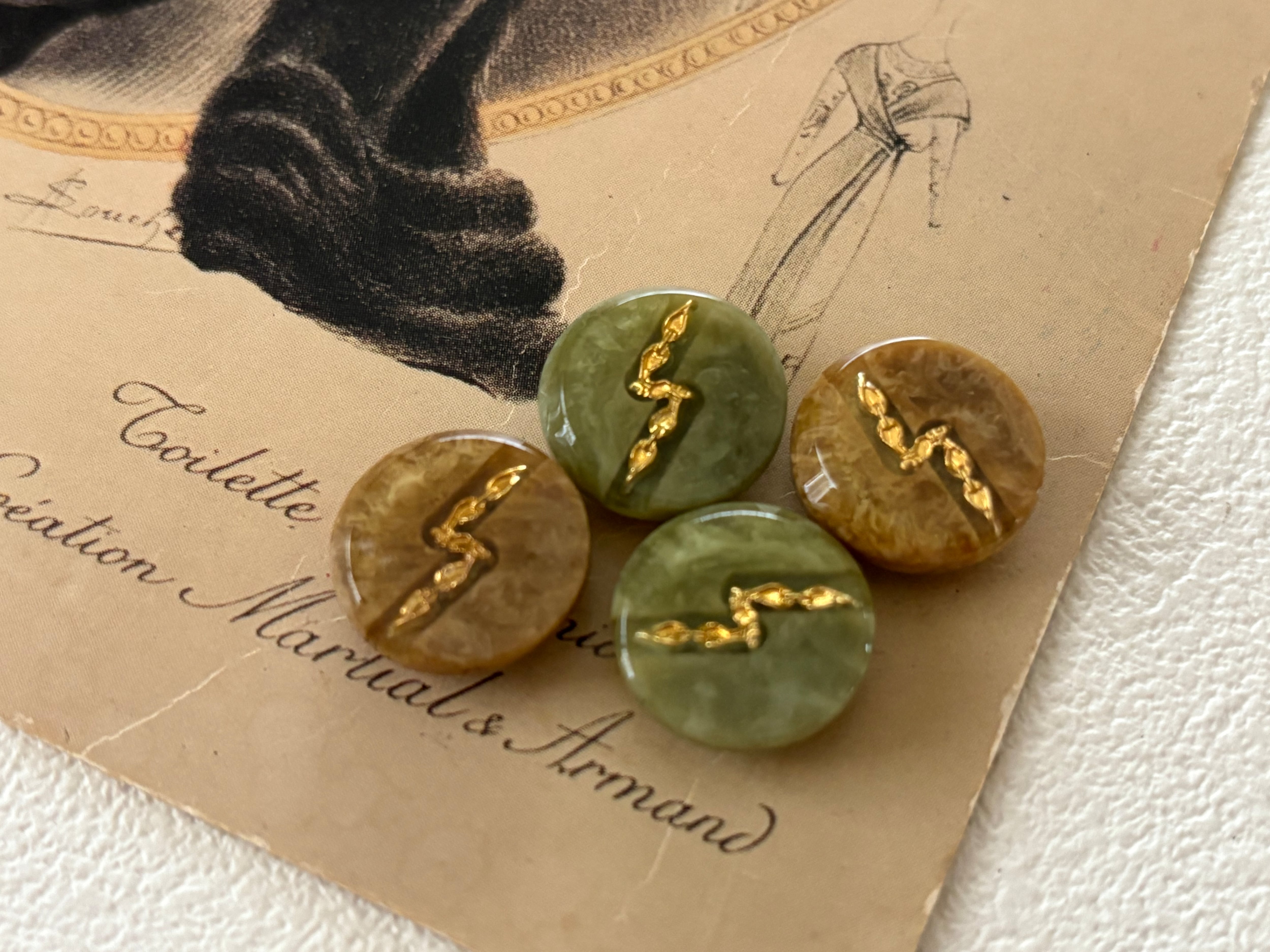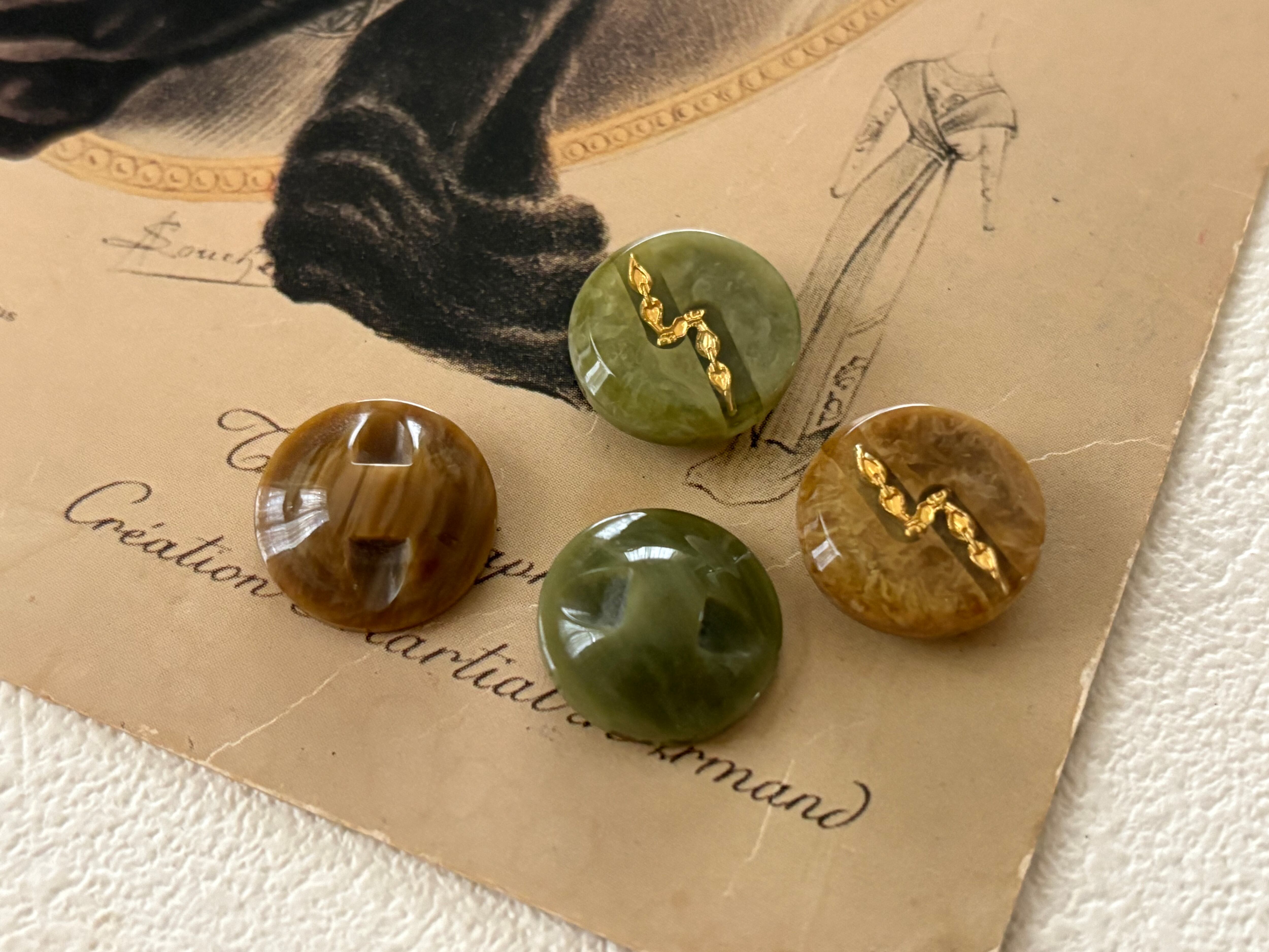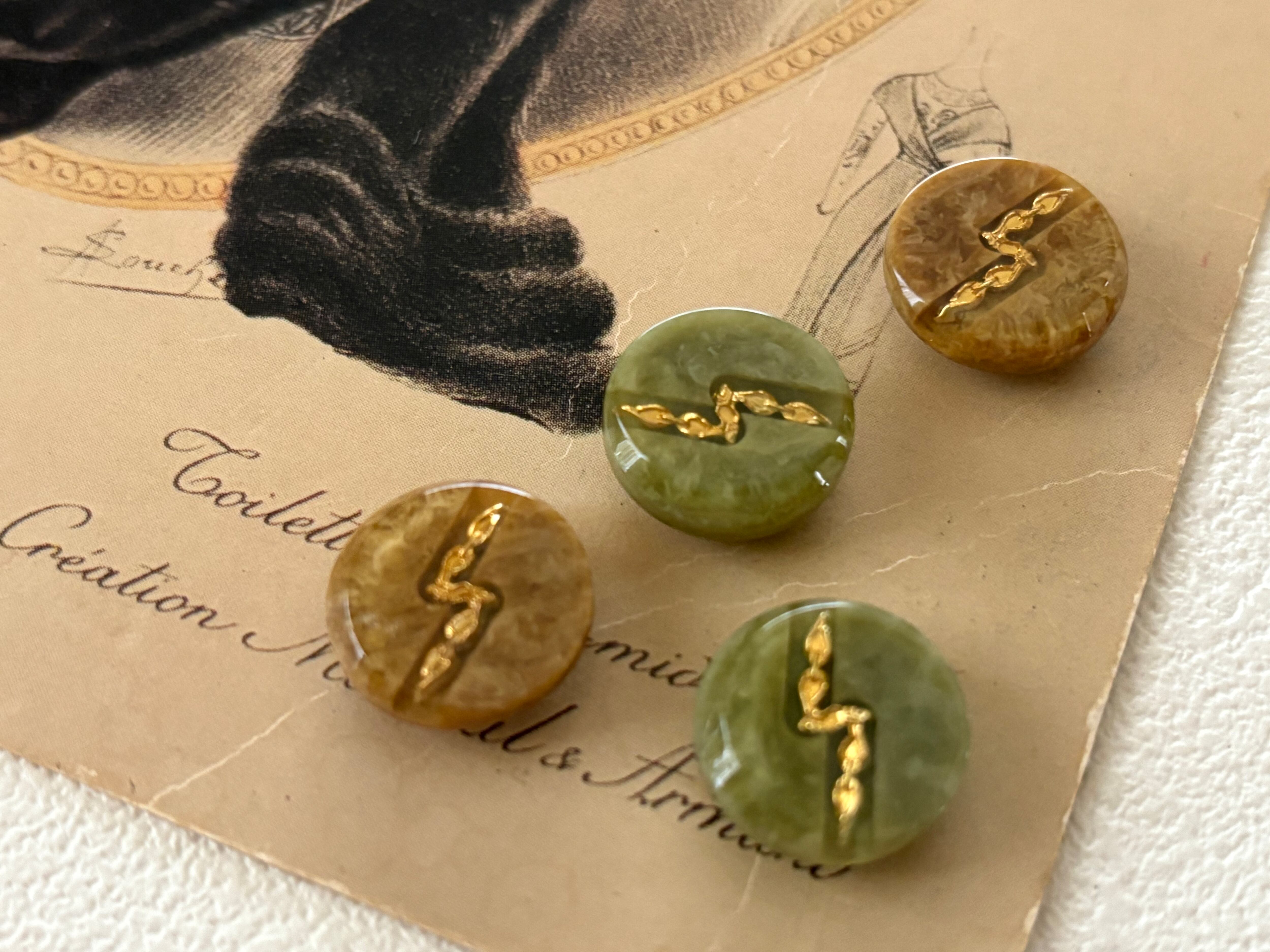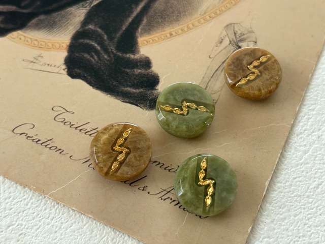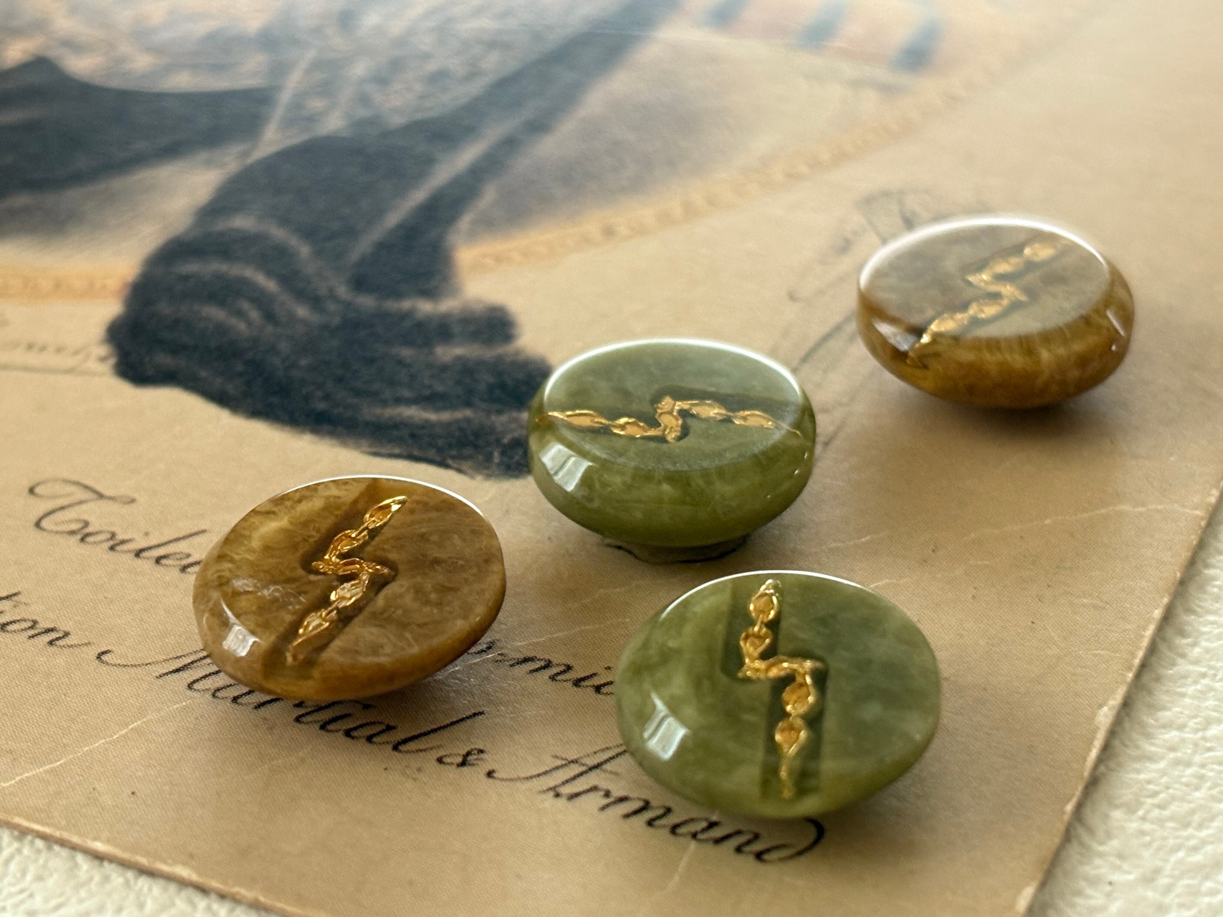Japanese Vintage ボタン グリーン系/ブラウン系 ゴールド 15mm マーブル調 昭和レトロ アクセサリーパーツ 装飾材 カルトナージュ