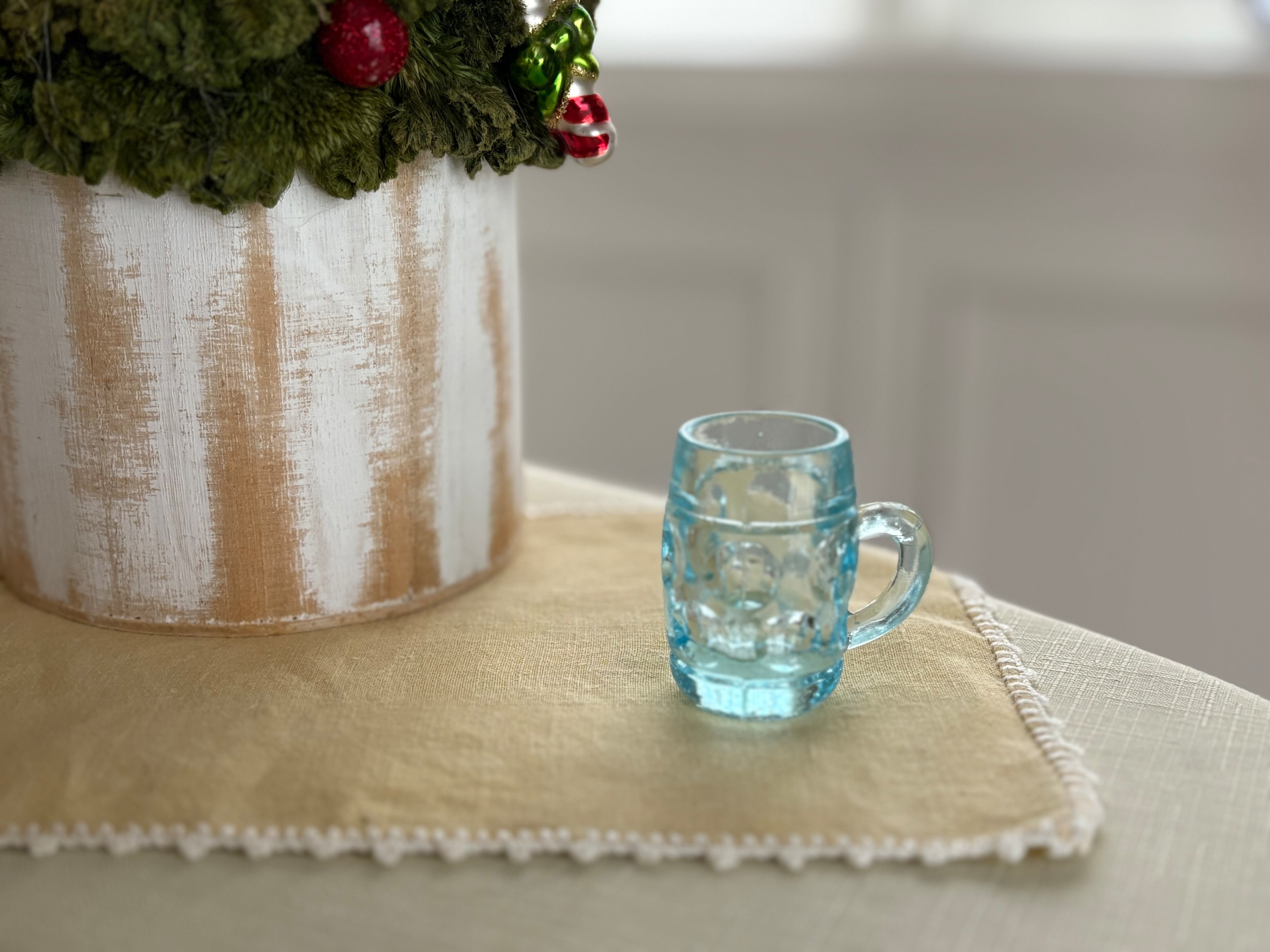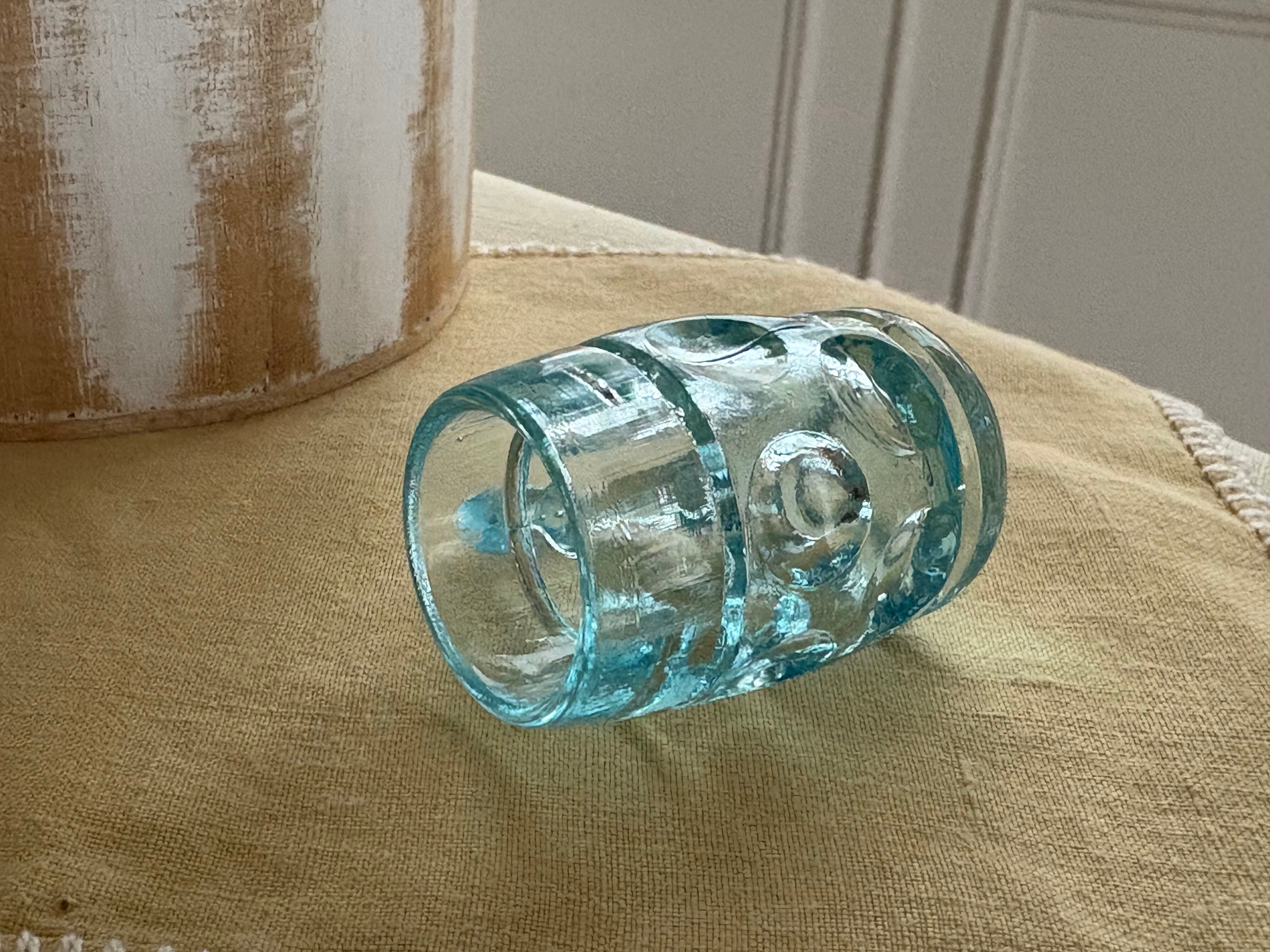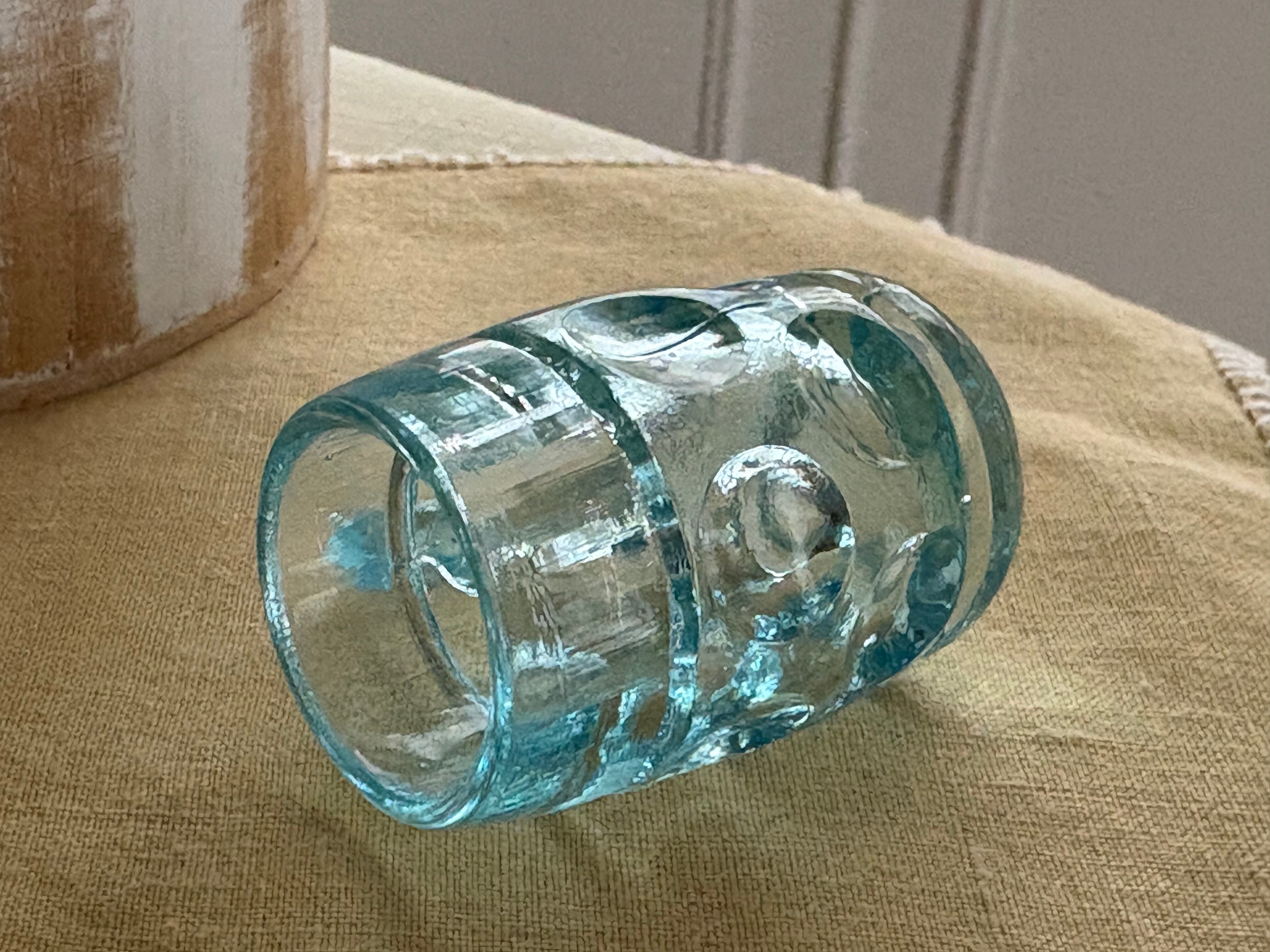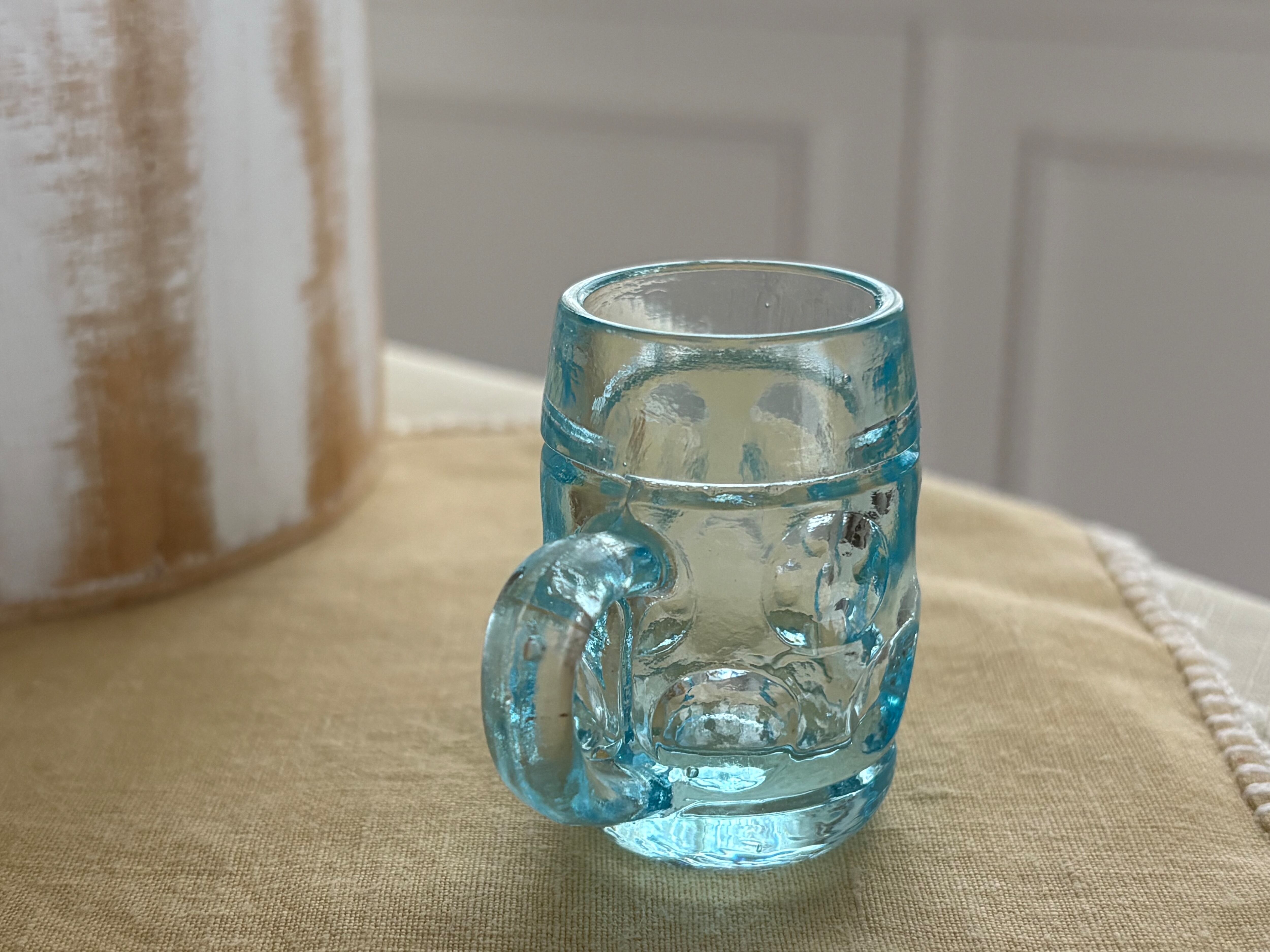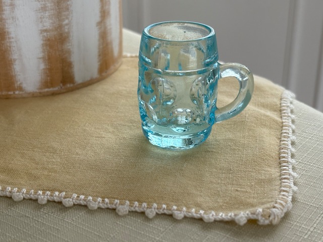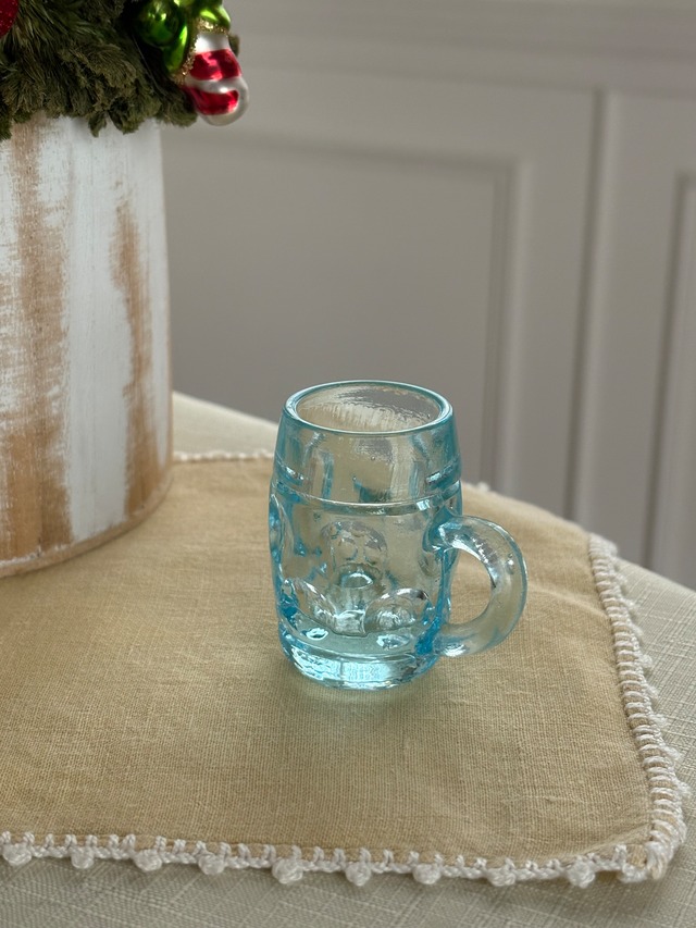 ブルーの古く小さなジョッキ型グラスになります。