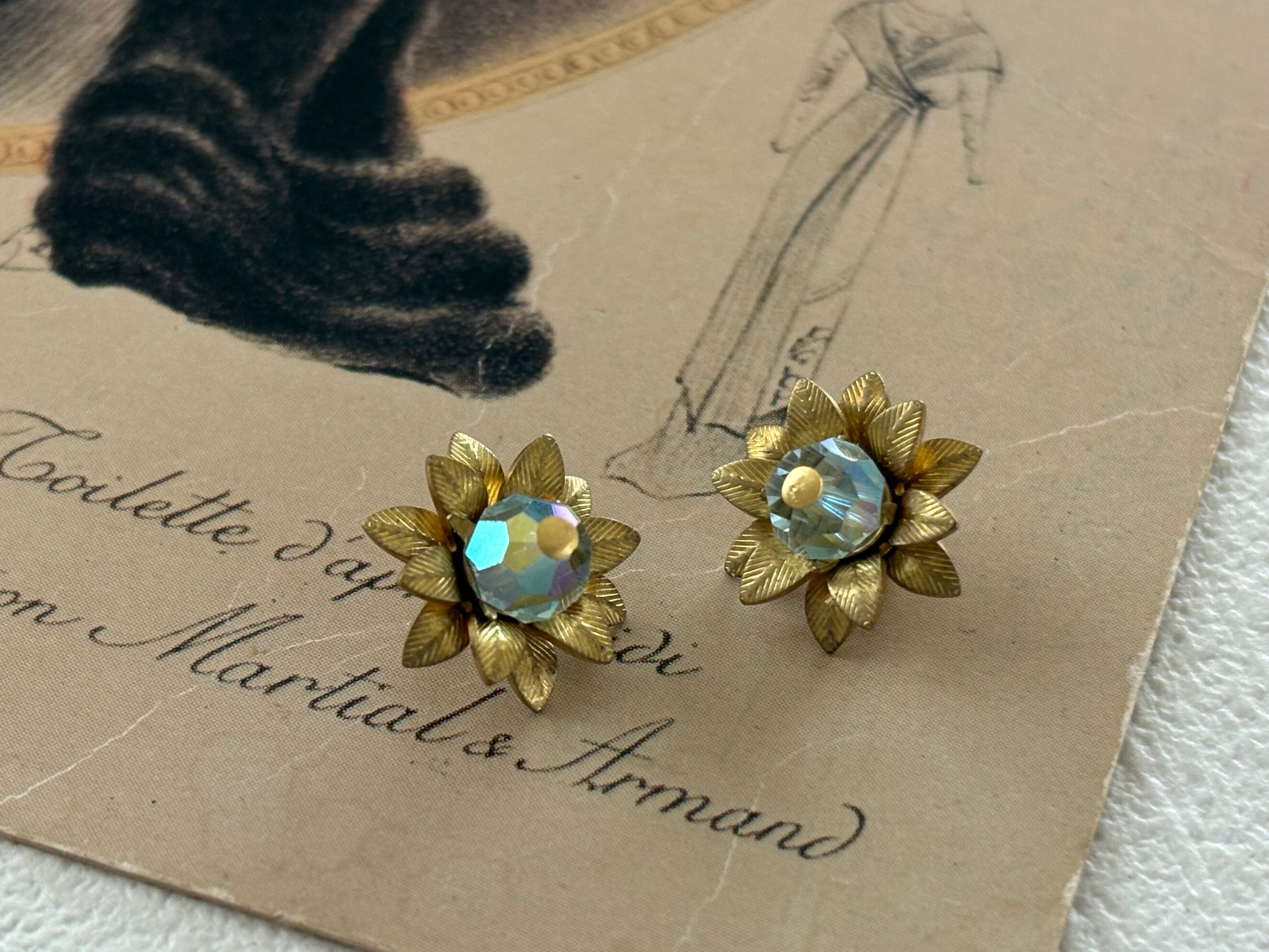 真鍮製の立体花弁パーツの中央に美しく輝くクリスタルビーズの花芯。