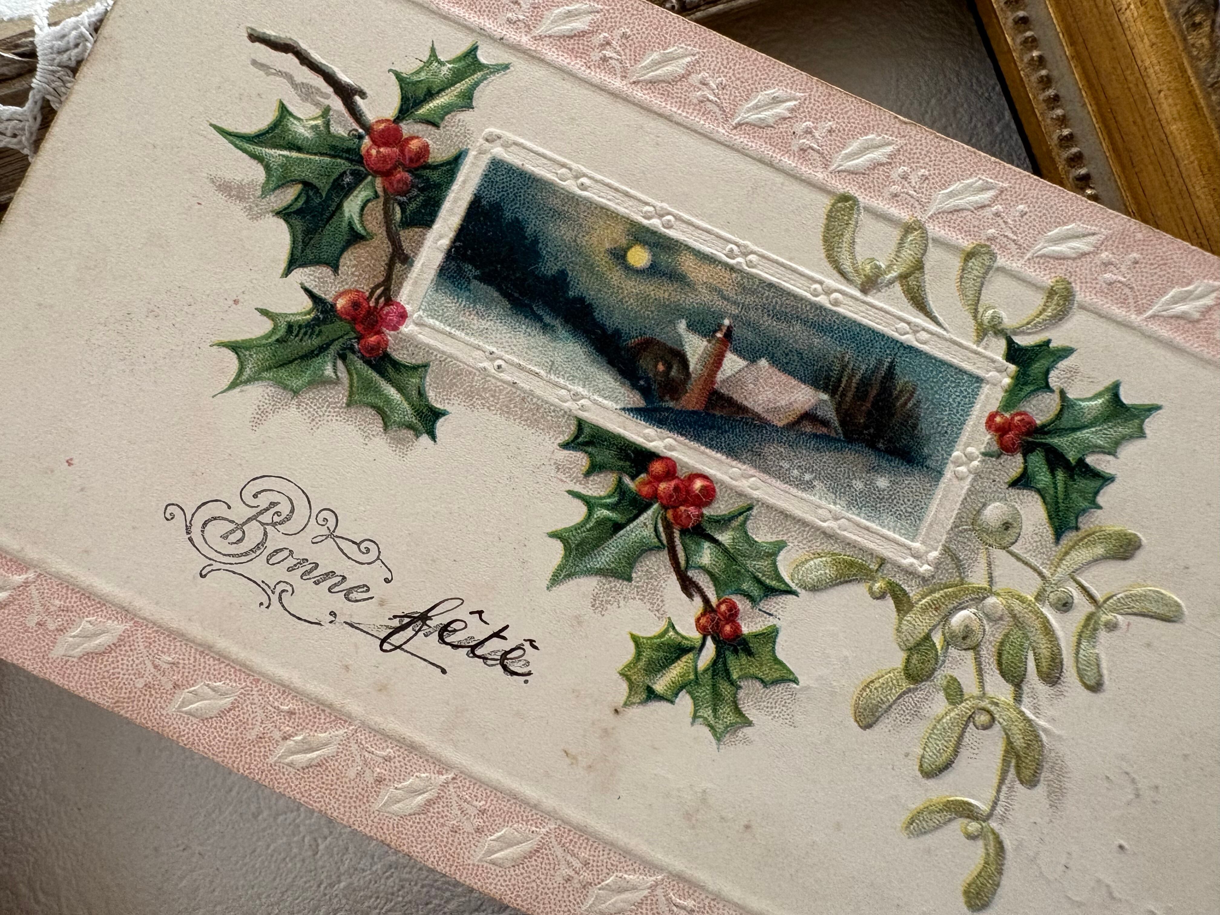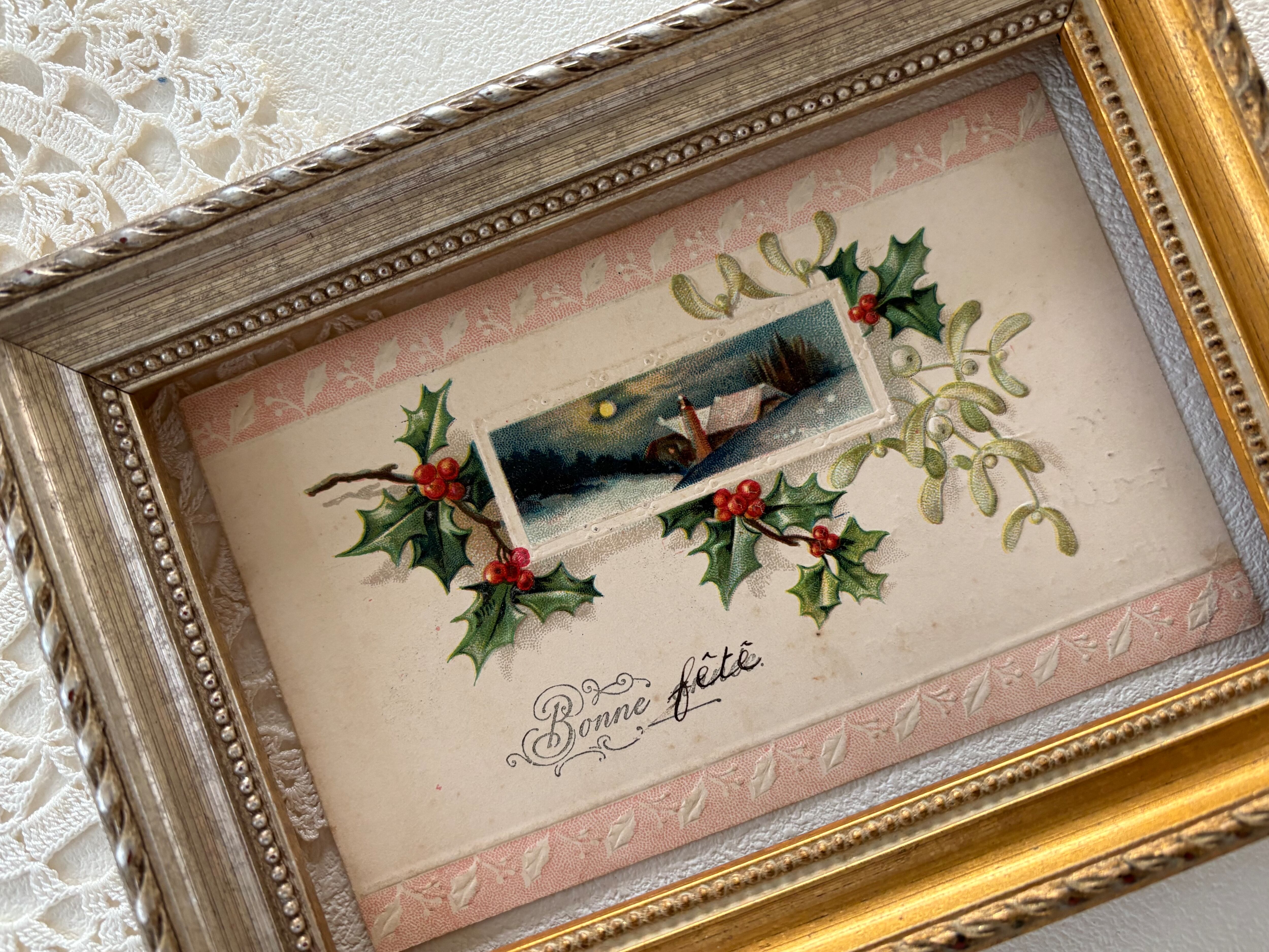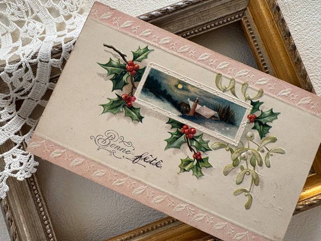 アンティークポストカード Bonne Anee 柊 ヤドリギ 雪景色 Noel エンボス クリスマス フランス 額装 インテリア コレクション