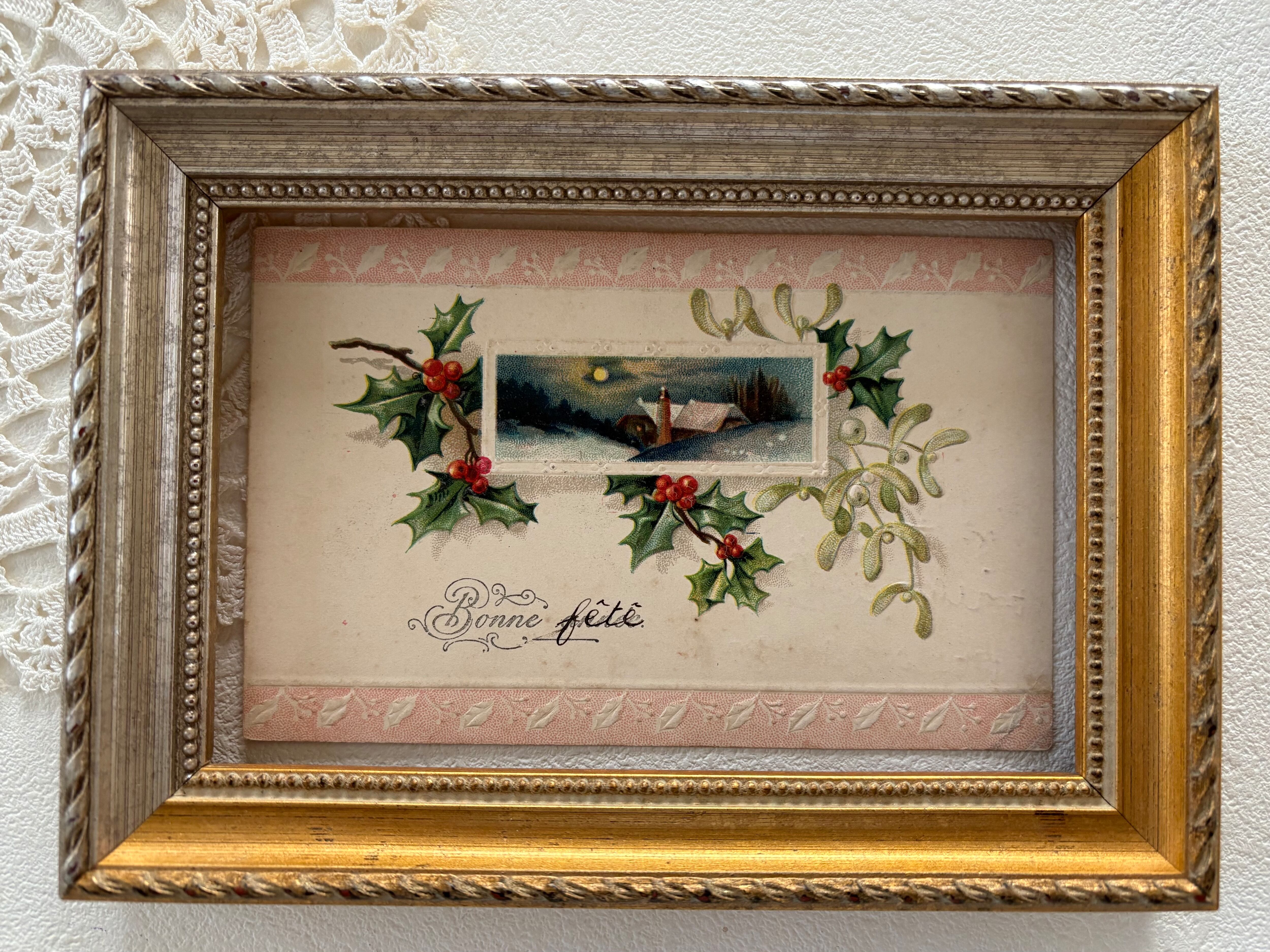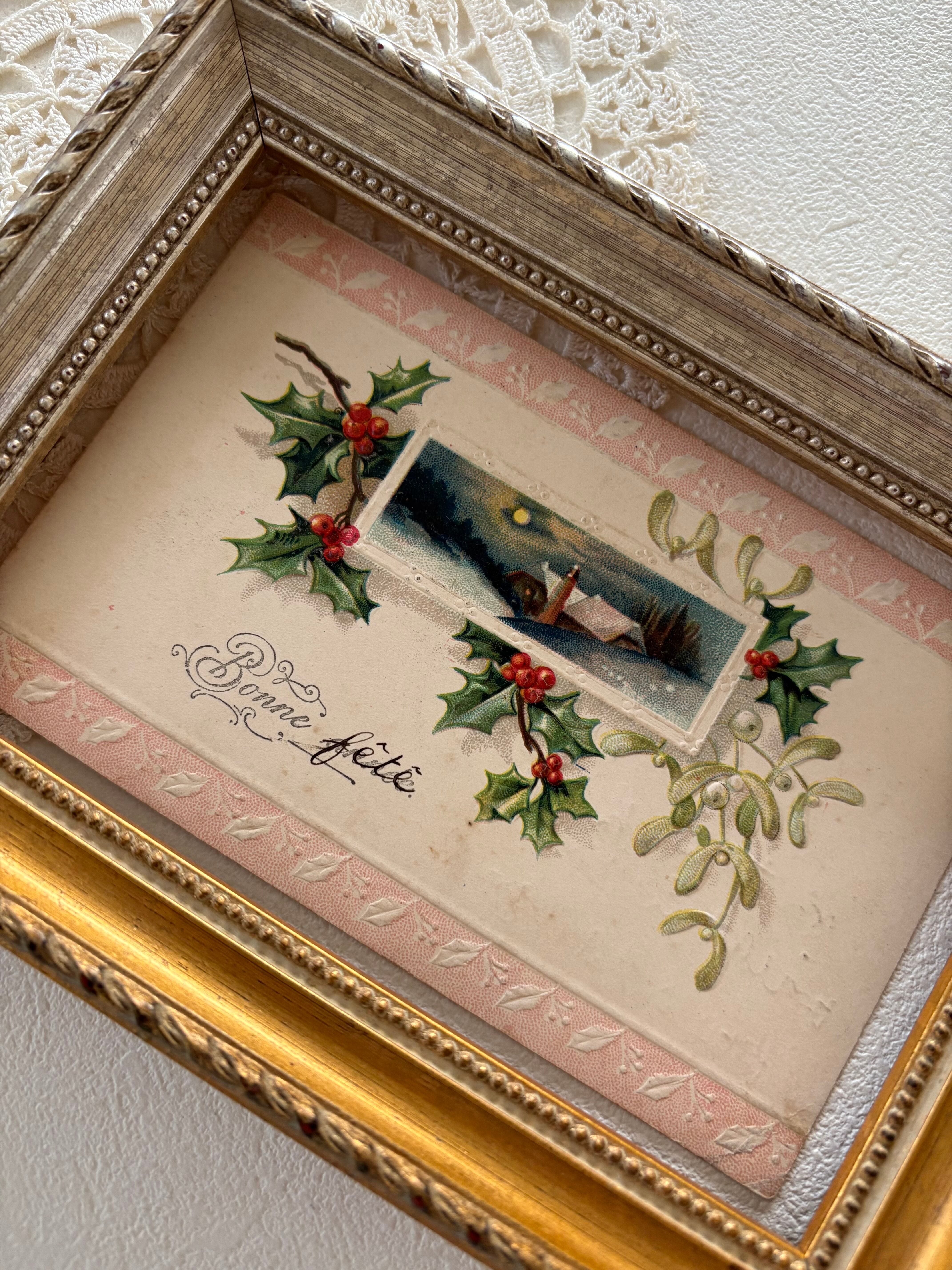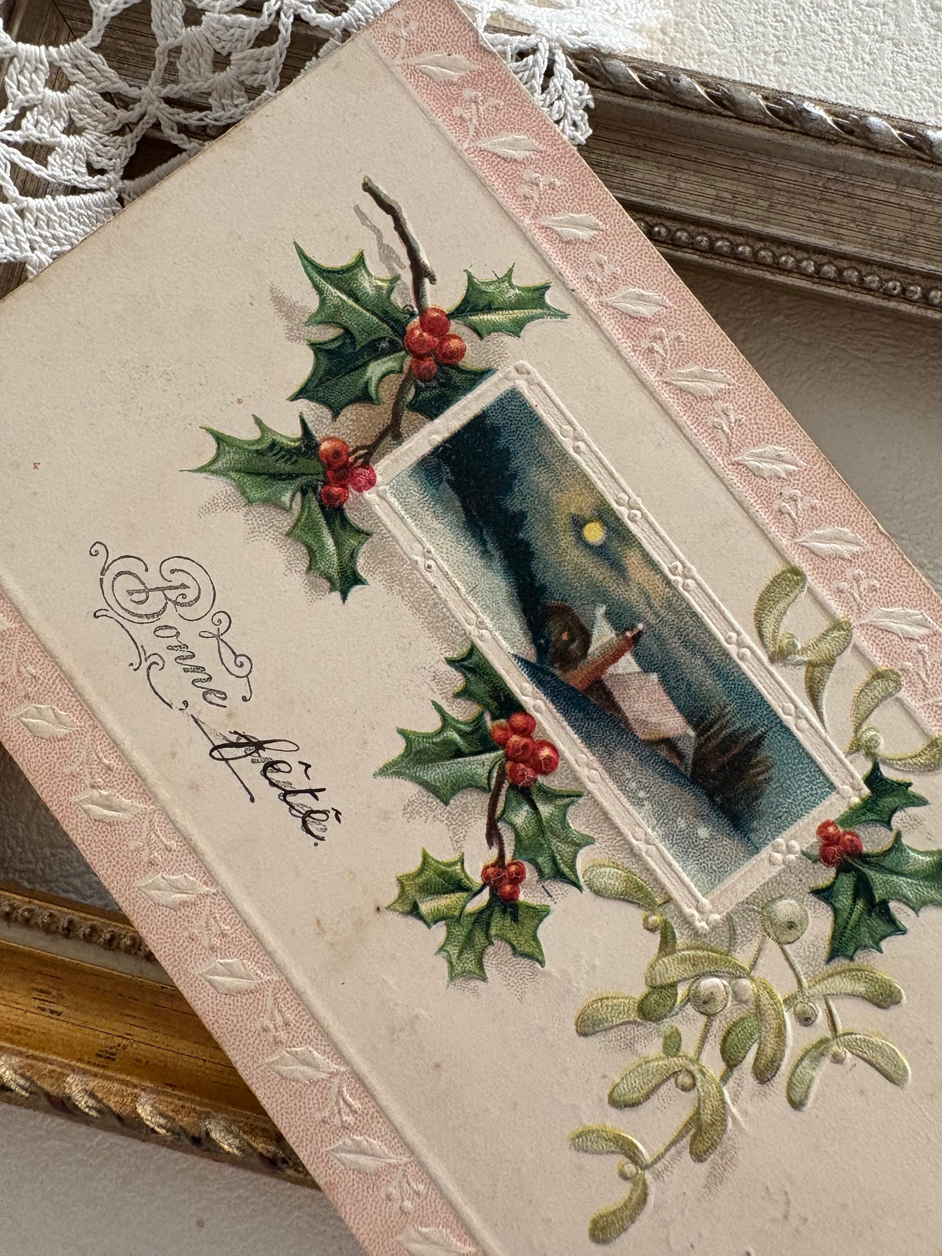 アンティークポストカード Bonne Anee 柊 ヤドリギ 雪景色 Noel エンボス クリスマス フランス 額装 インテリア コレクション