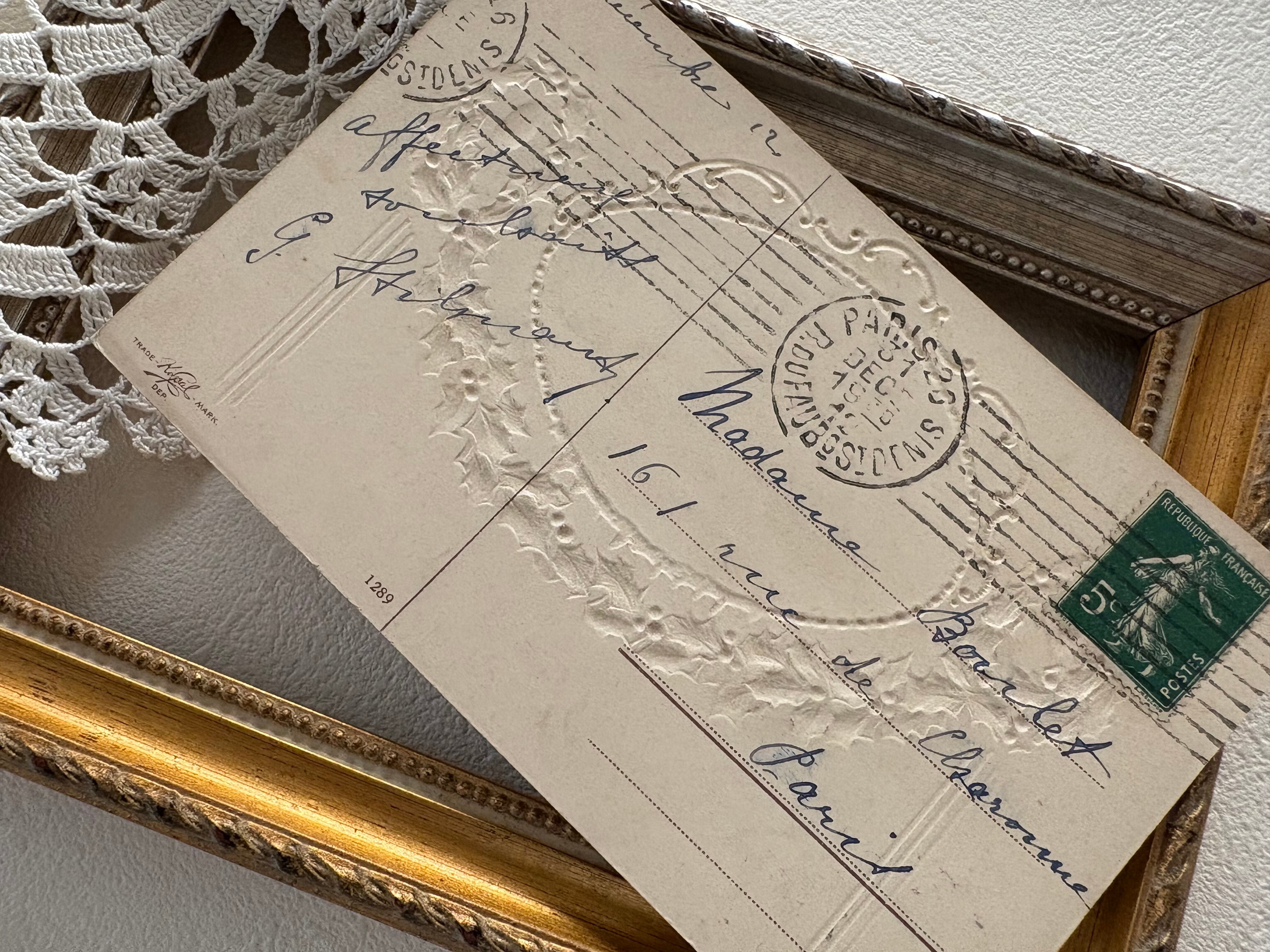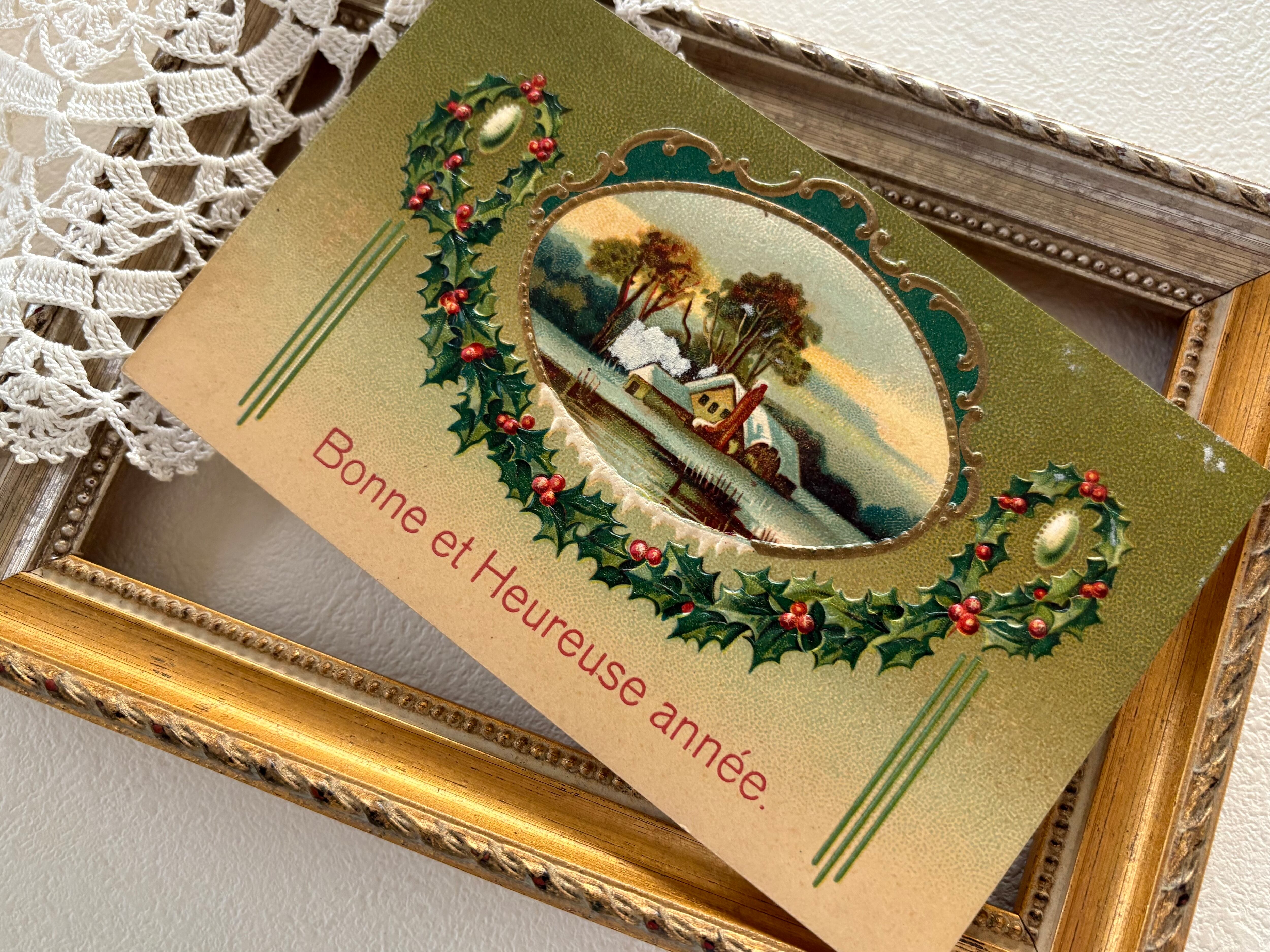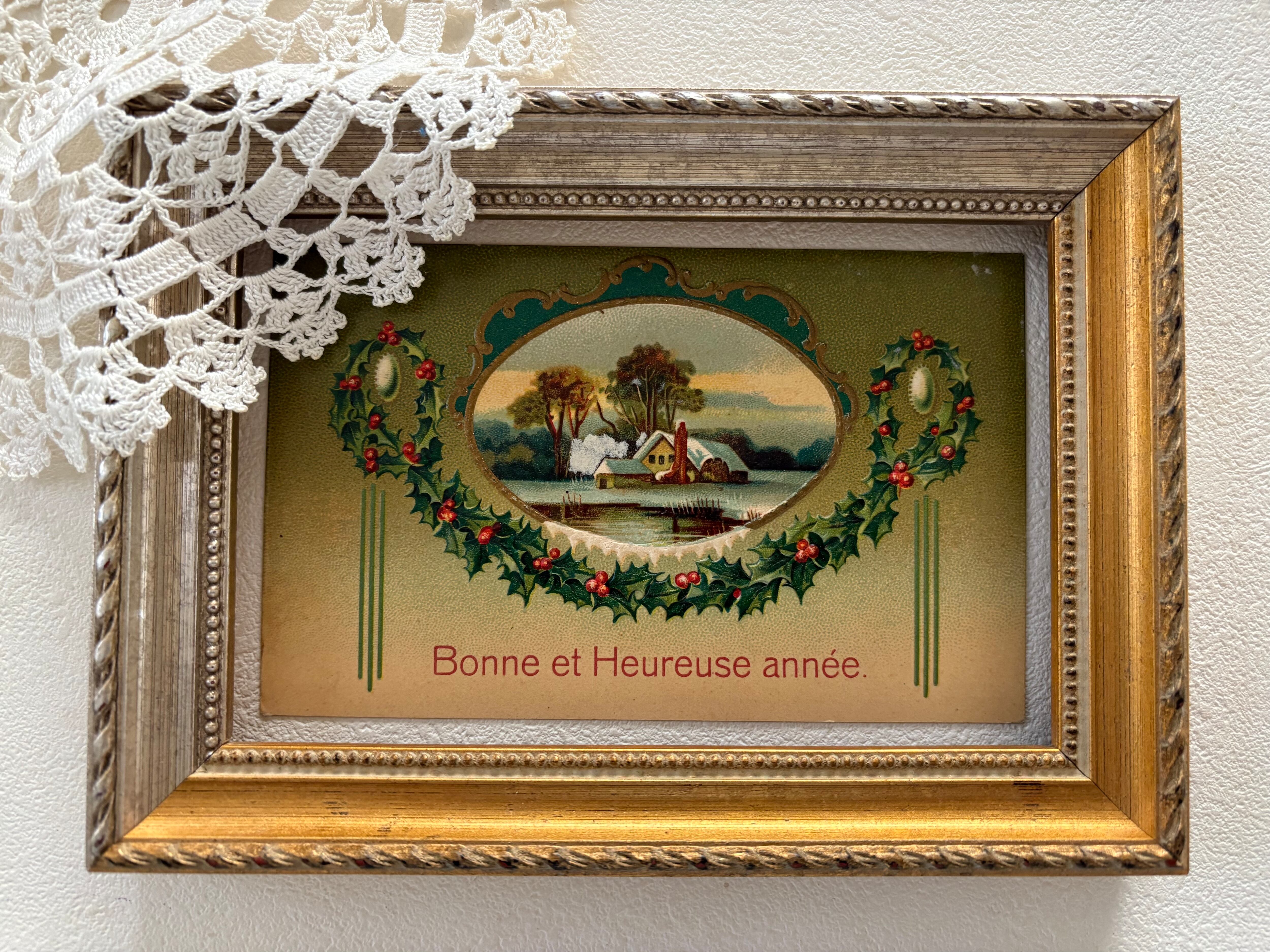 アンティークポストカード Bonne Anee 柊のガーランド 農村の雪景色 Noel 1931年 クリスマス フランス 額装 インテリア コレクション
