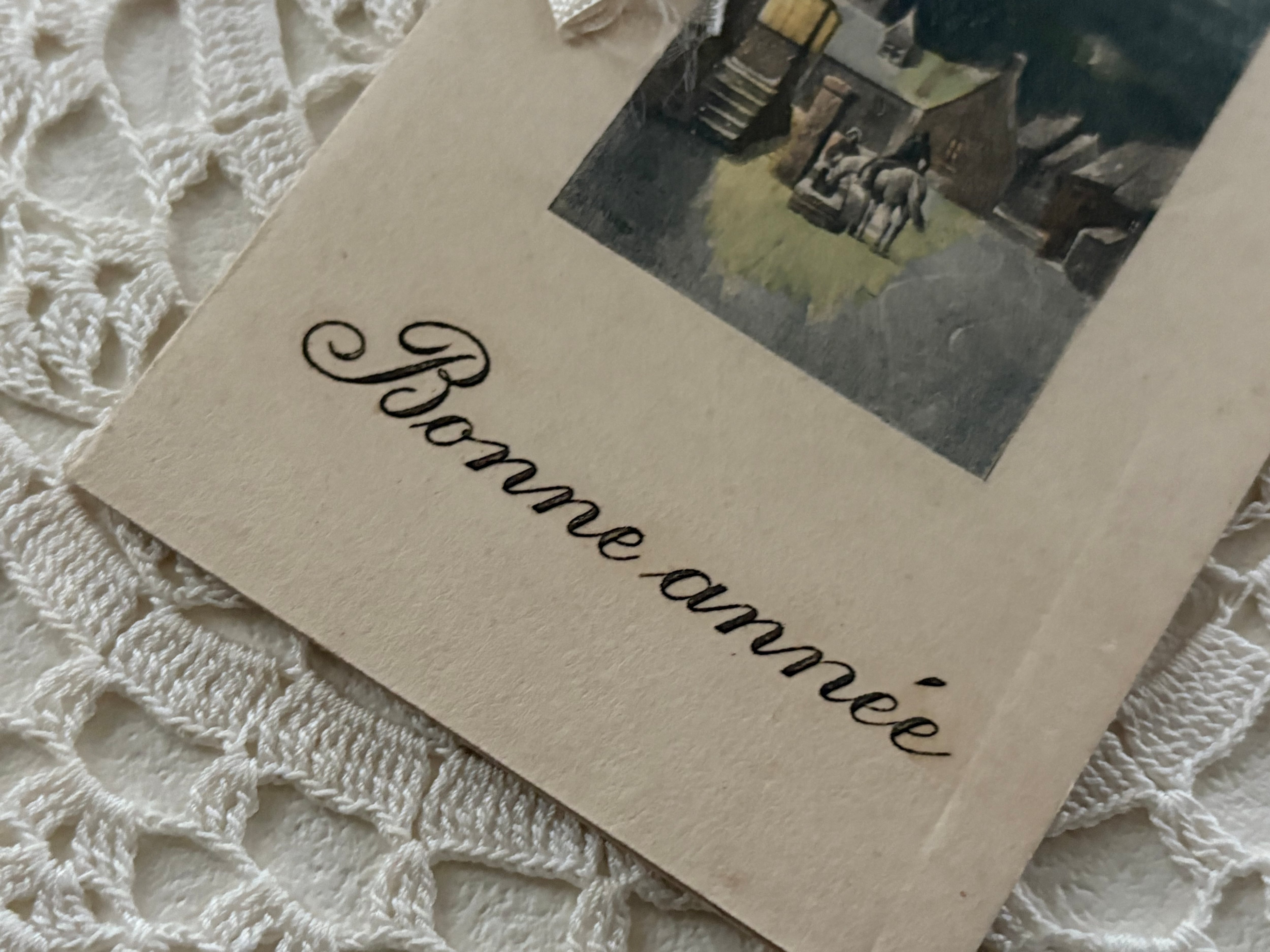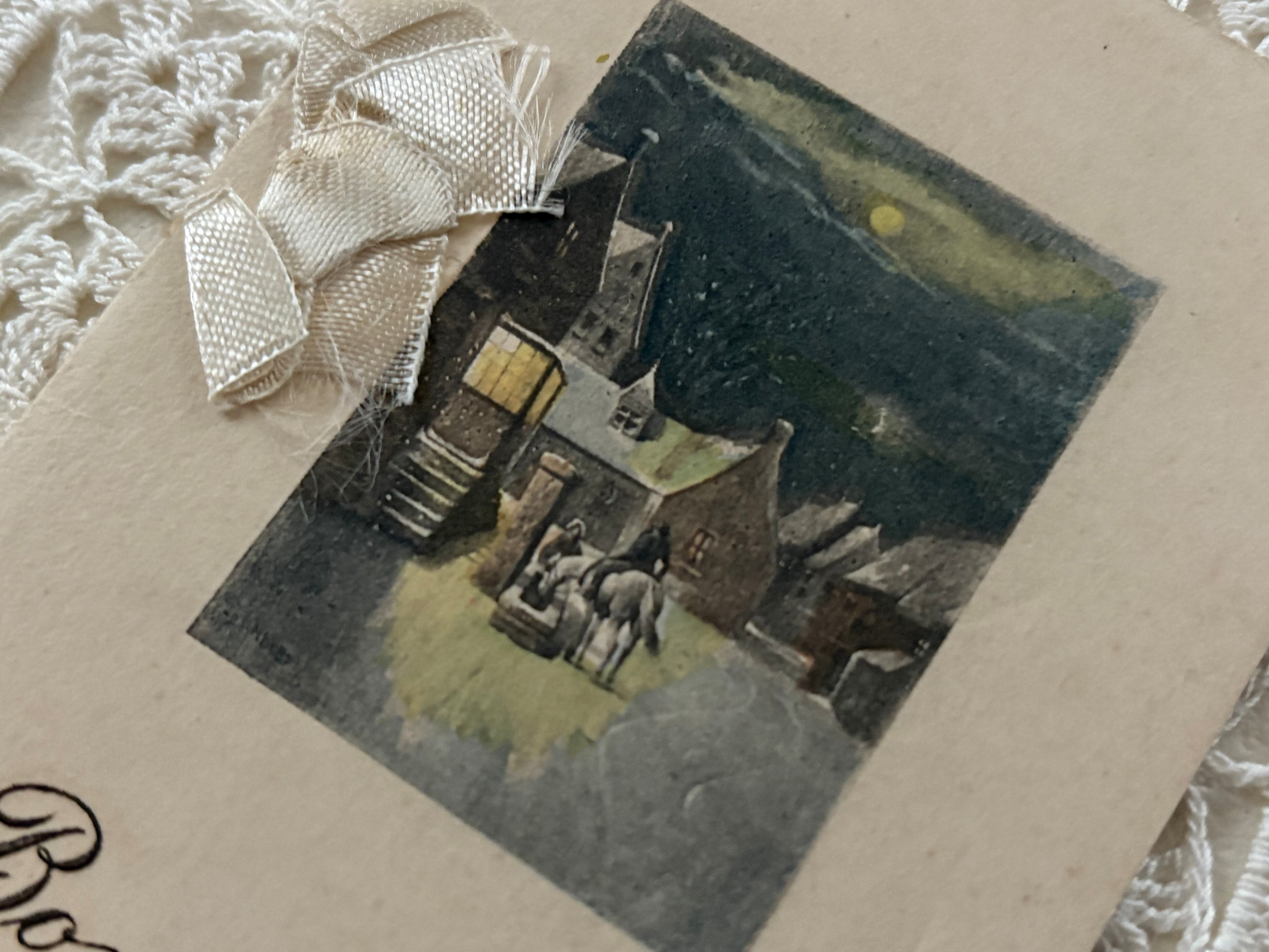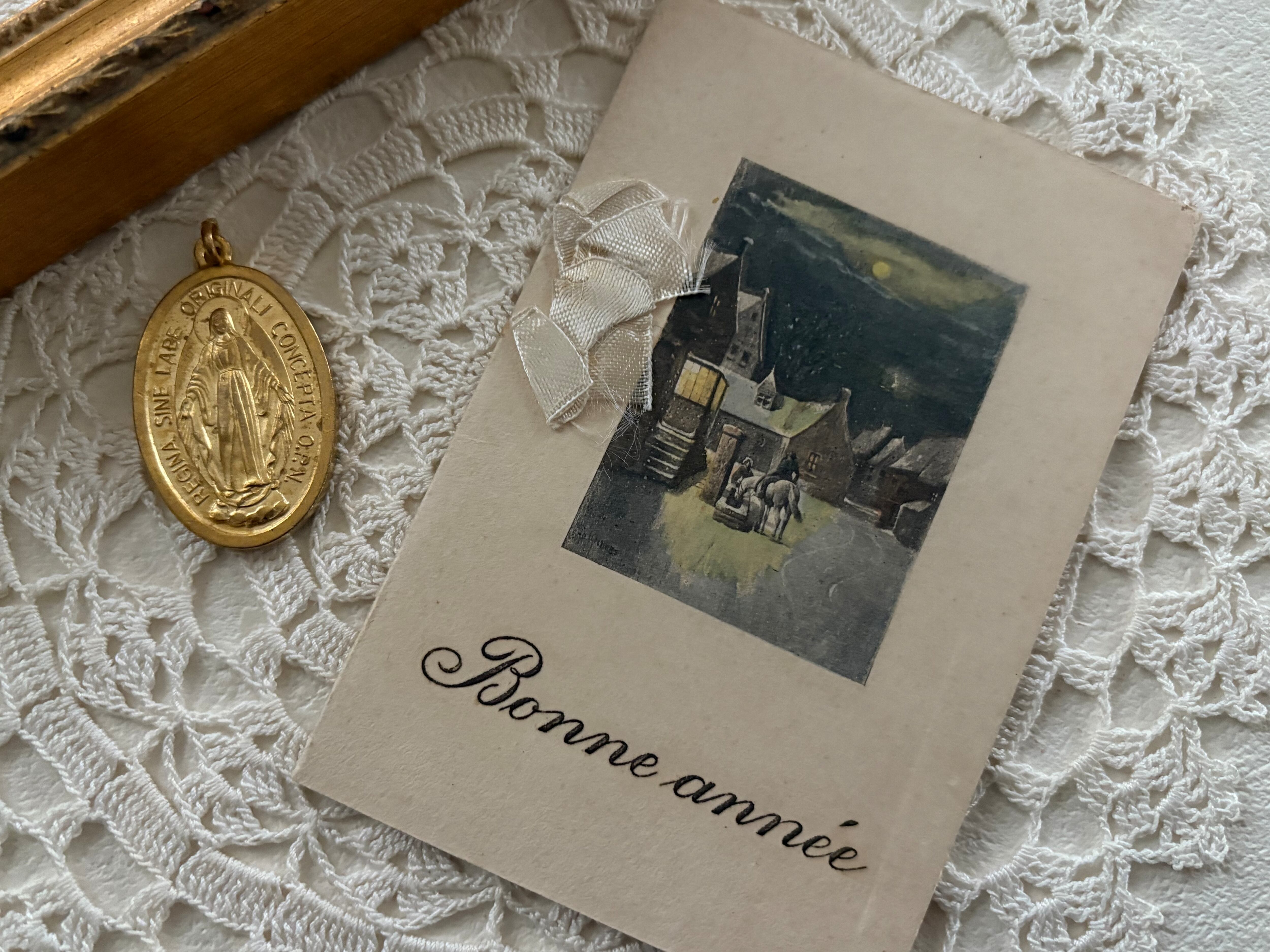 フランス アンティークカード 白馬と雪景色 月 見開きタイプ フランス 額装 インテリア 撮影小物 クリスマス Noel