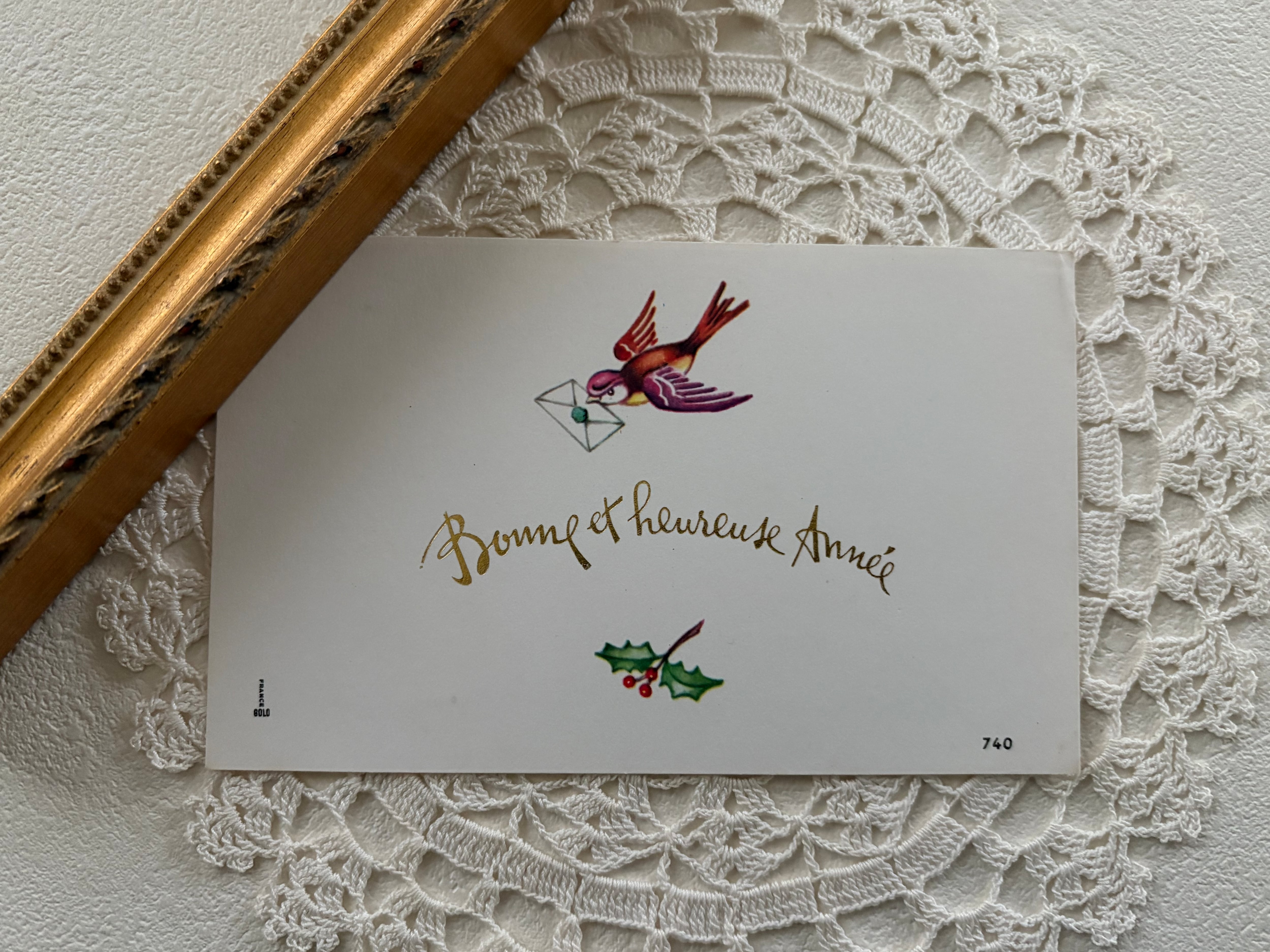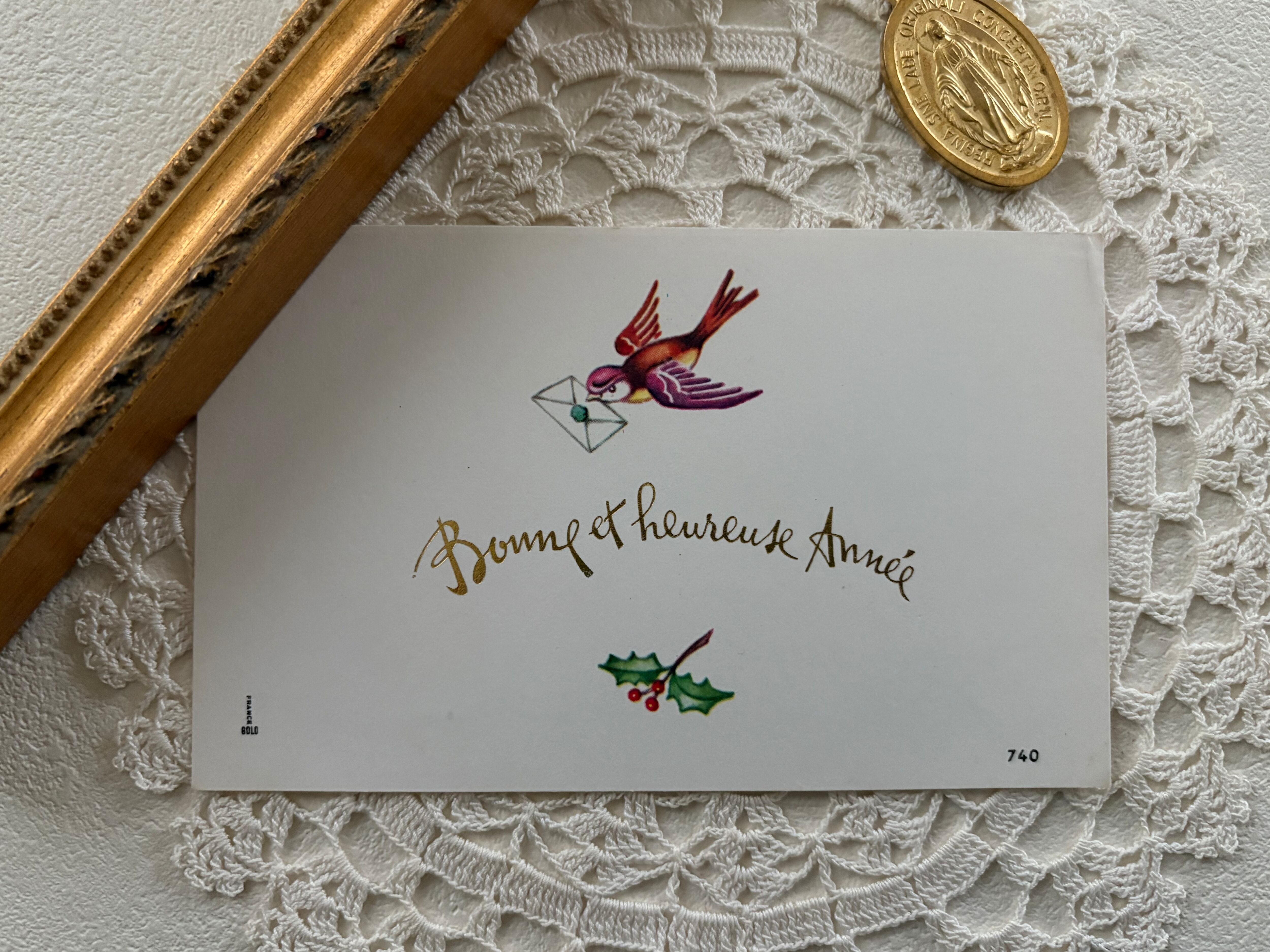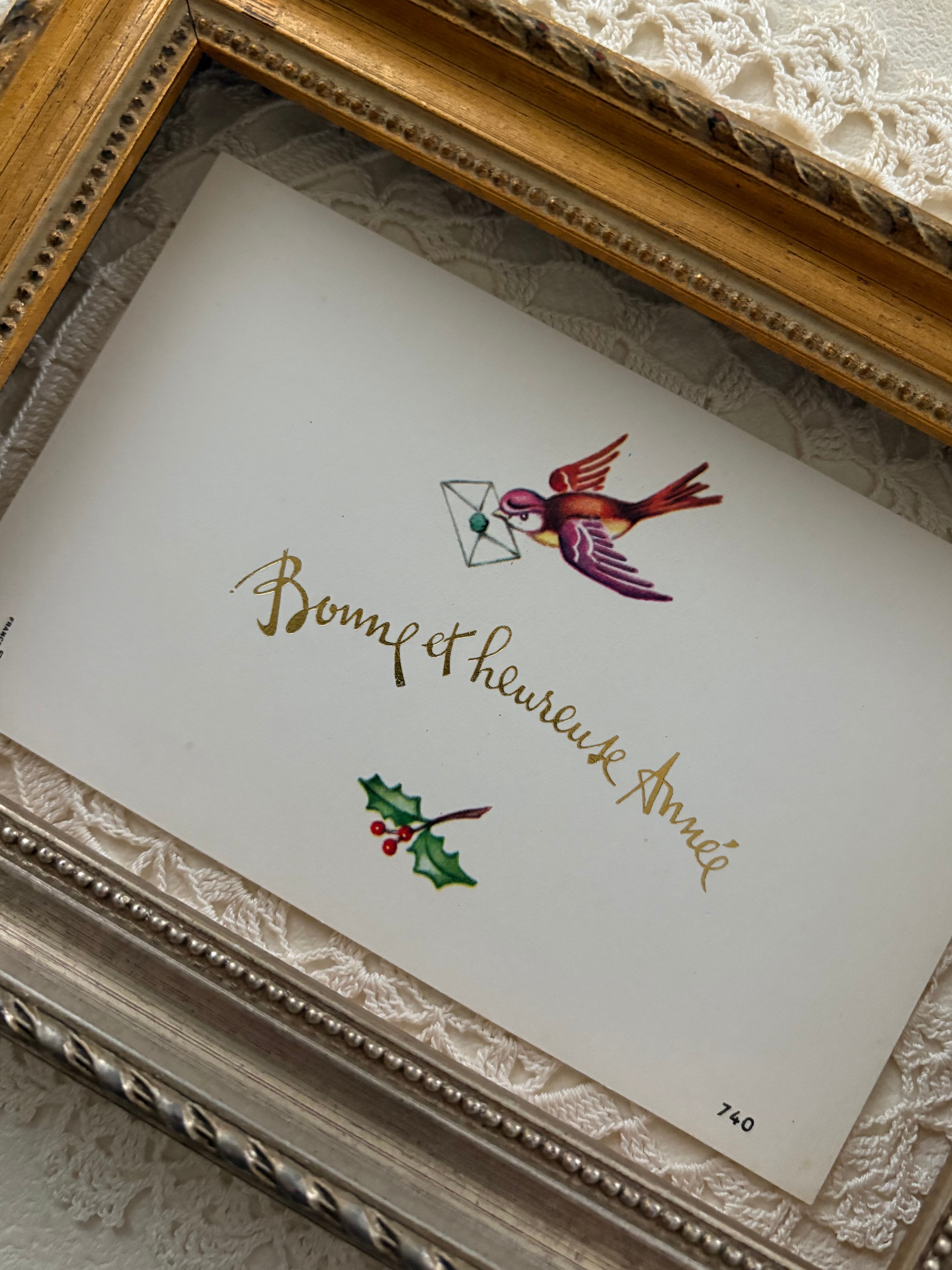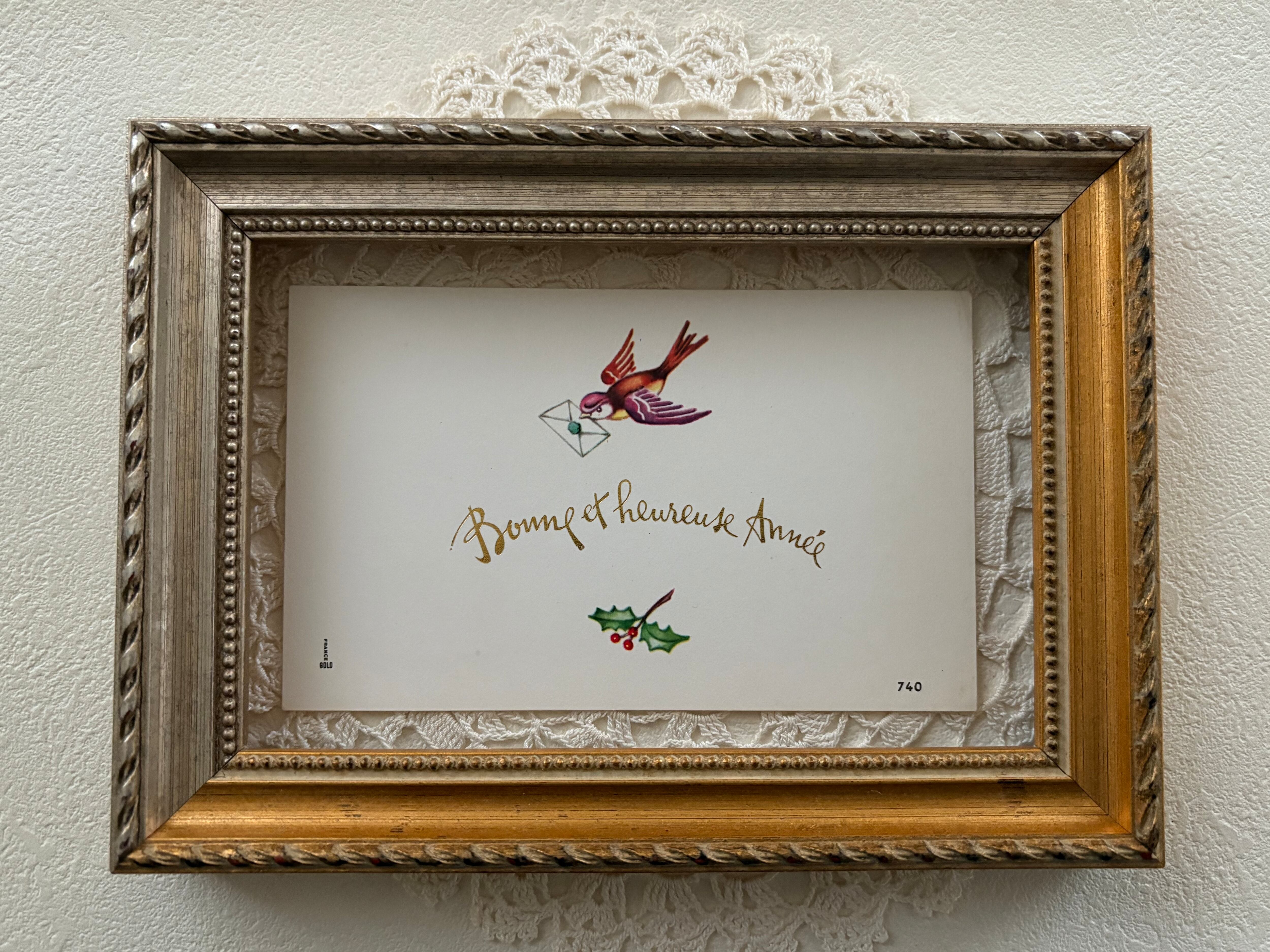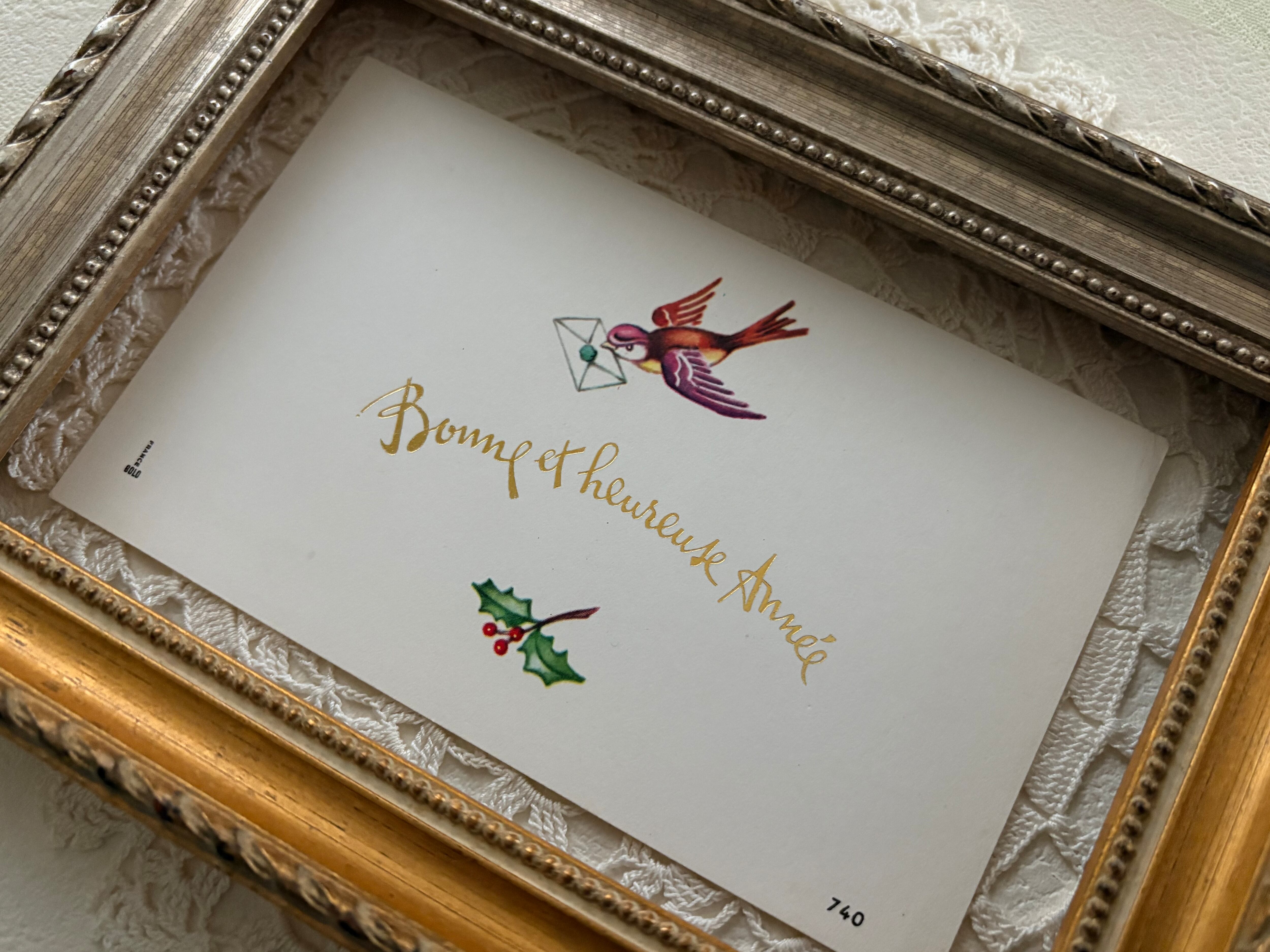 フランス Vintage 小さなメッセージカード bonne et heureuse année つばめ 柊 額装 インテリア小物 クリスマス Noel 未使用