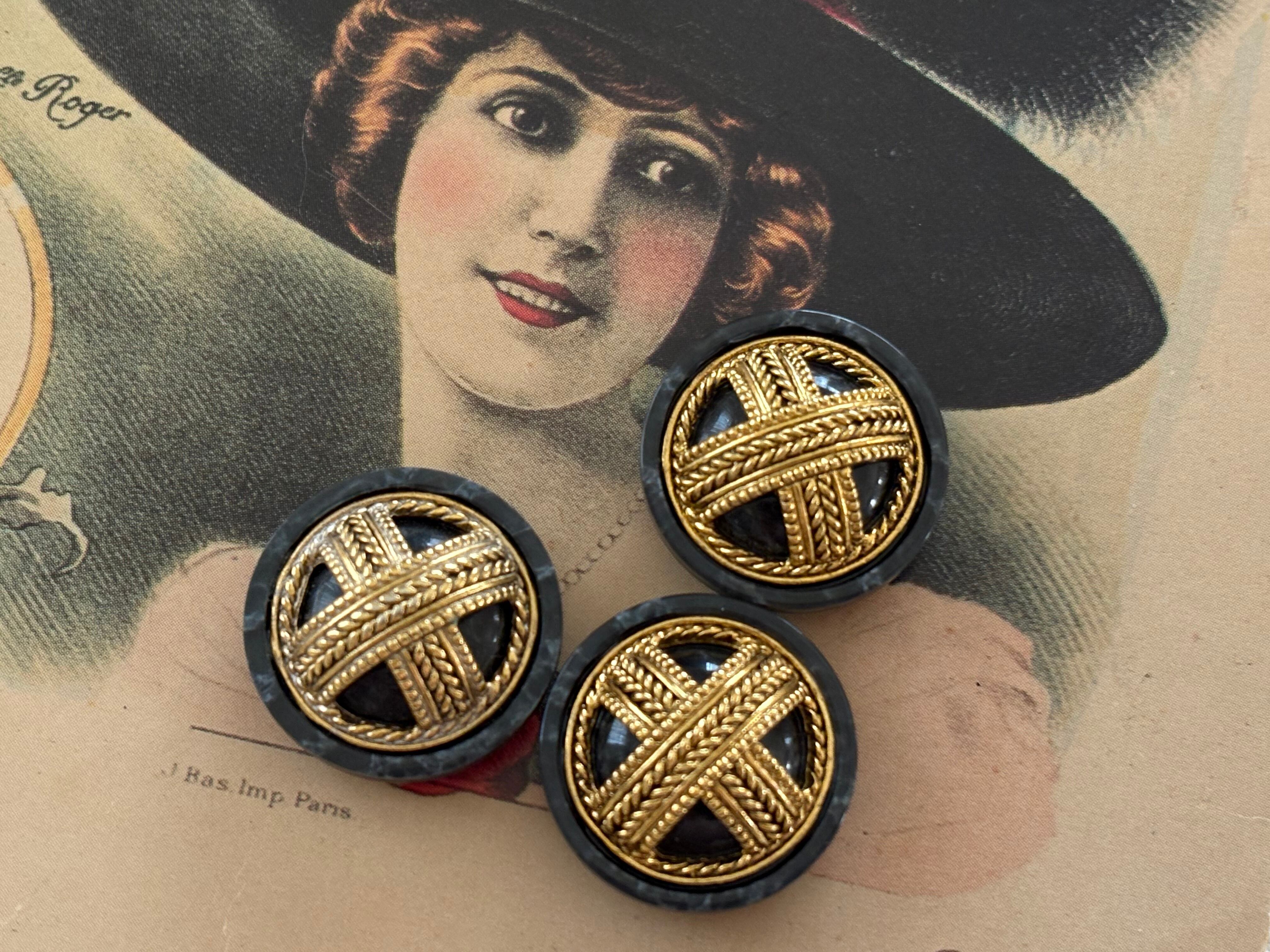 Import Vintageボタン グレー×ゴールド 20mm 樹脂×メタル アクセサリーパーツ デコレーション材