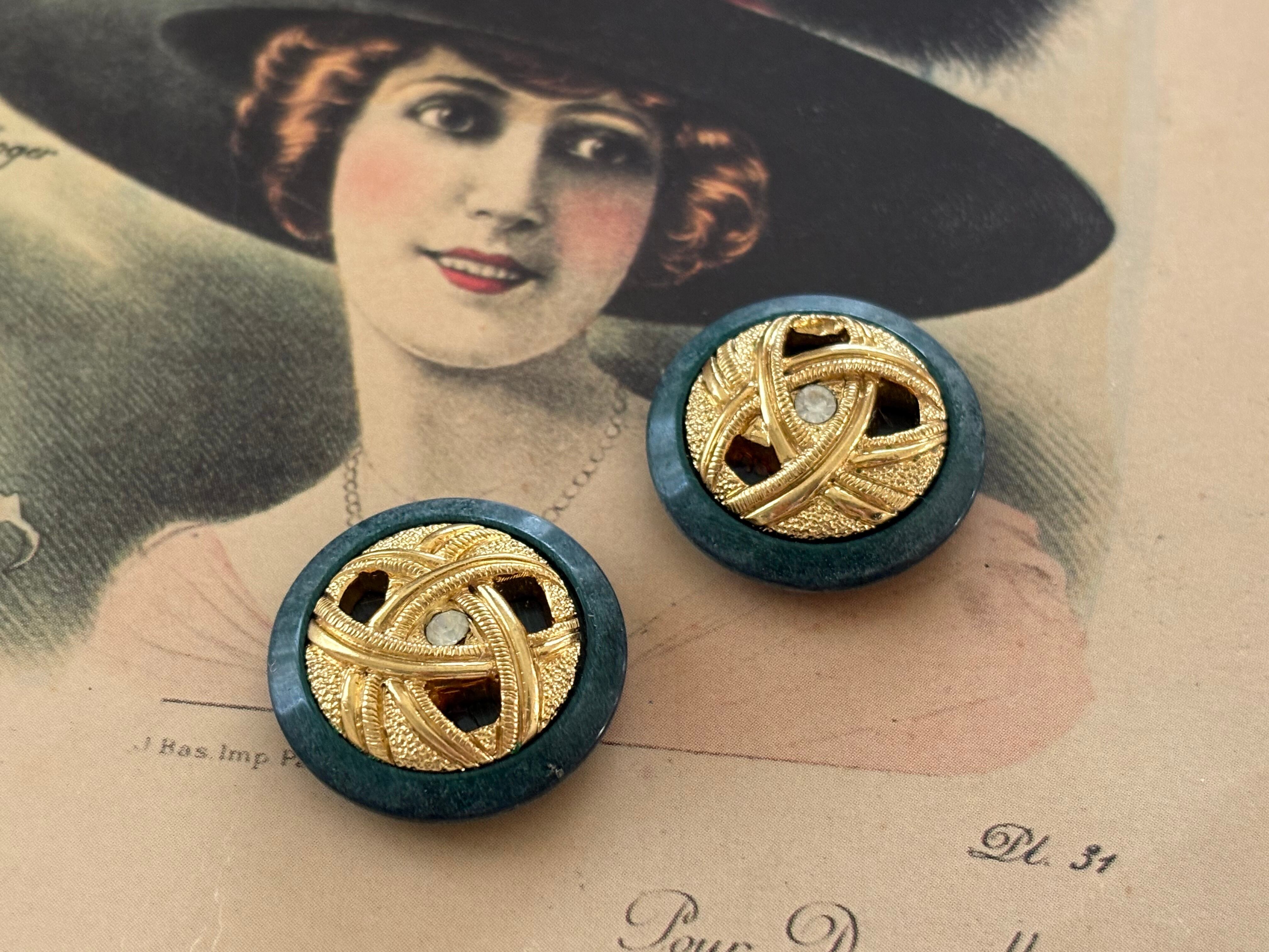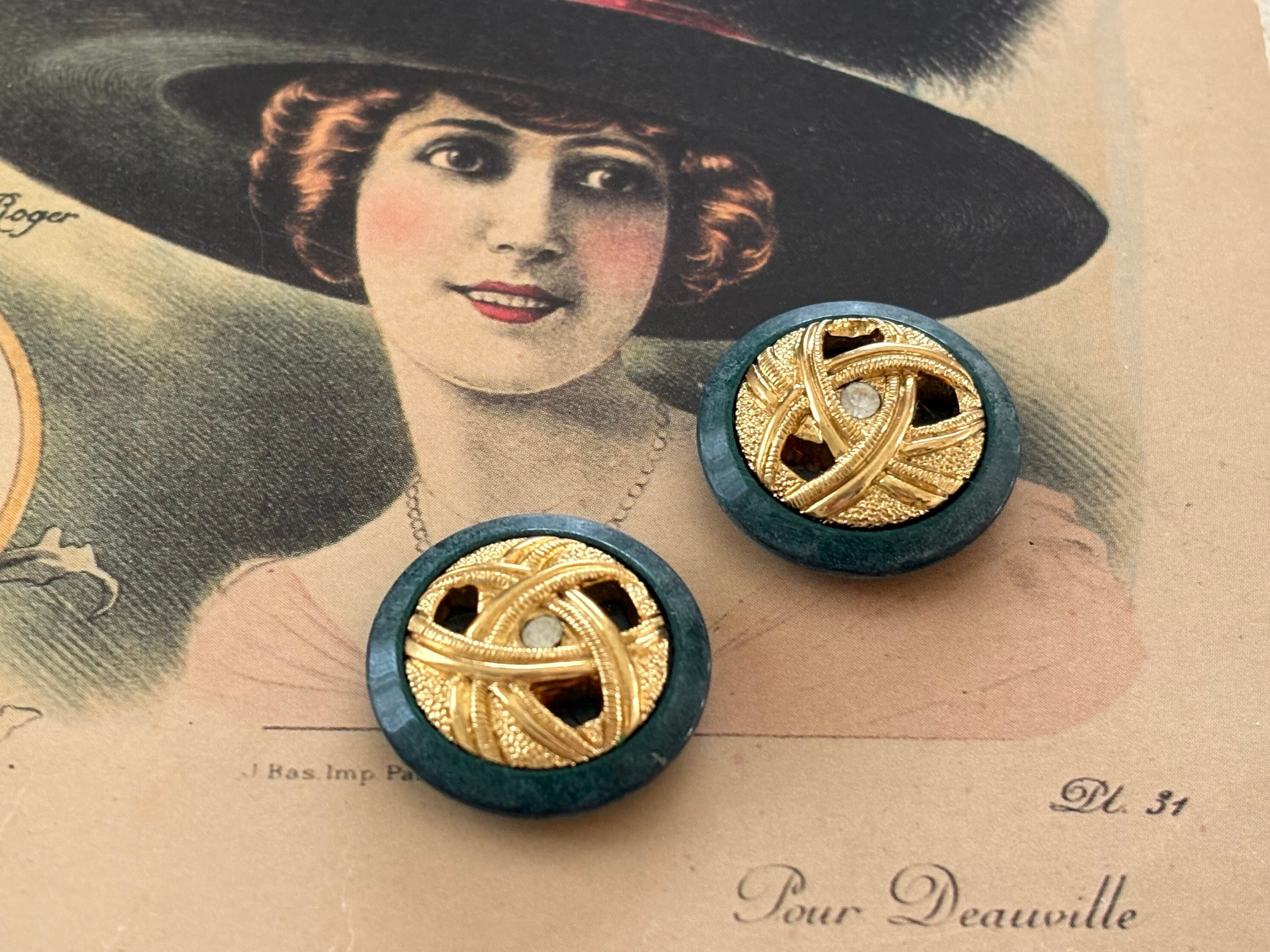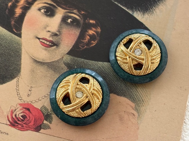 Import Vintageボタン グリーン×ゴールド 22mm ストーン 樹脂×メタル アクセサリーパーツ デコレーション材
