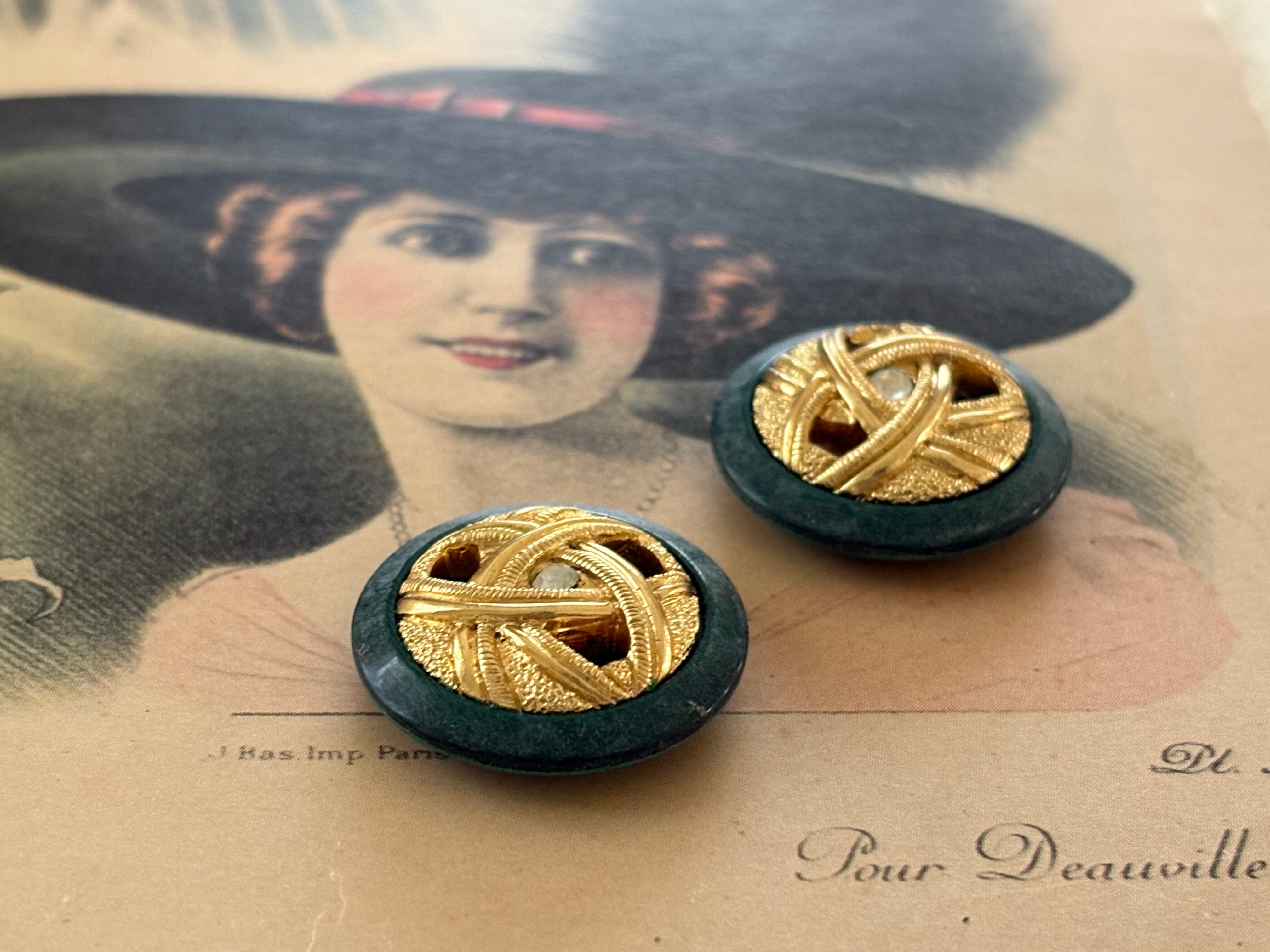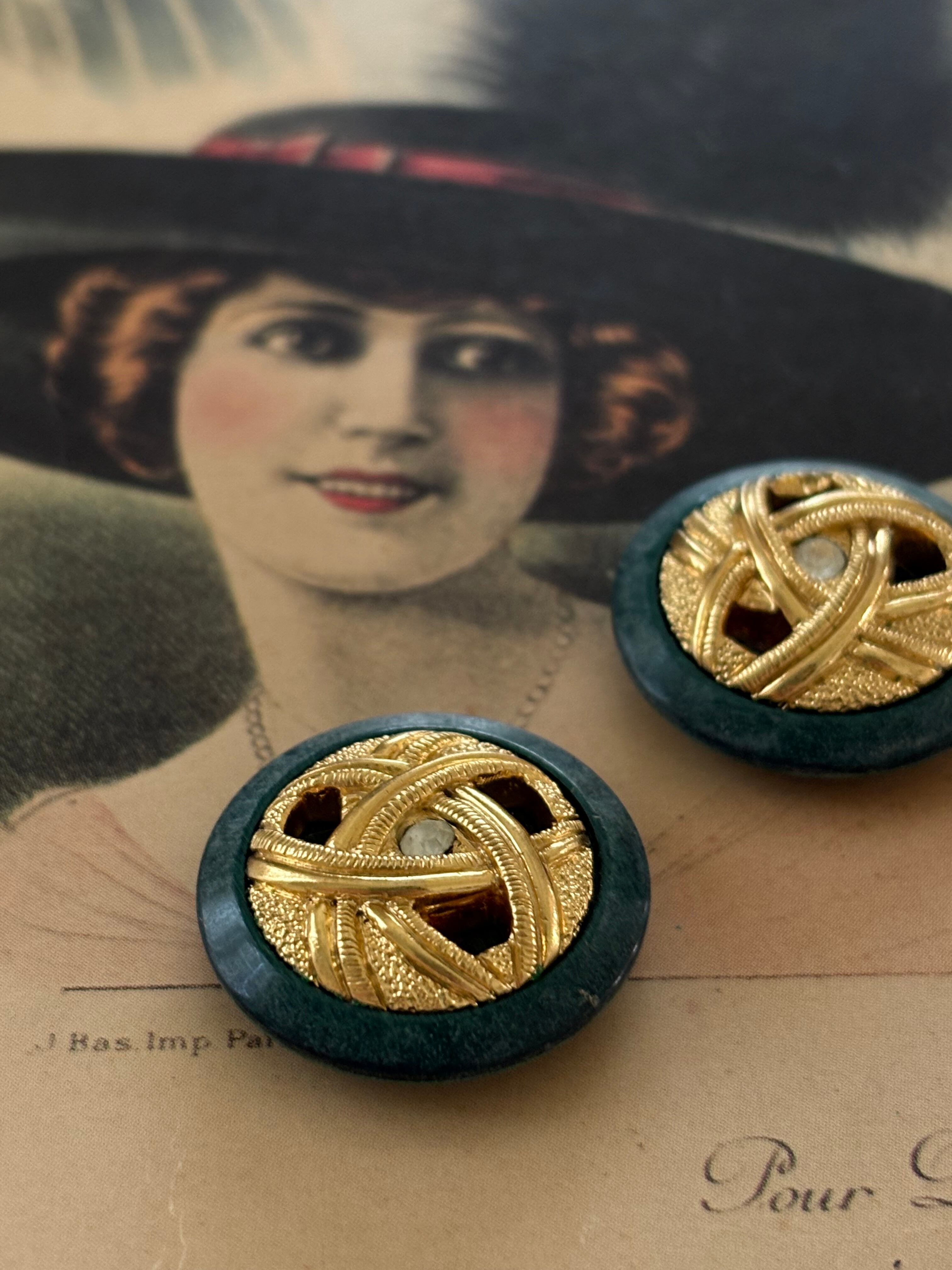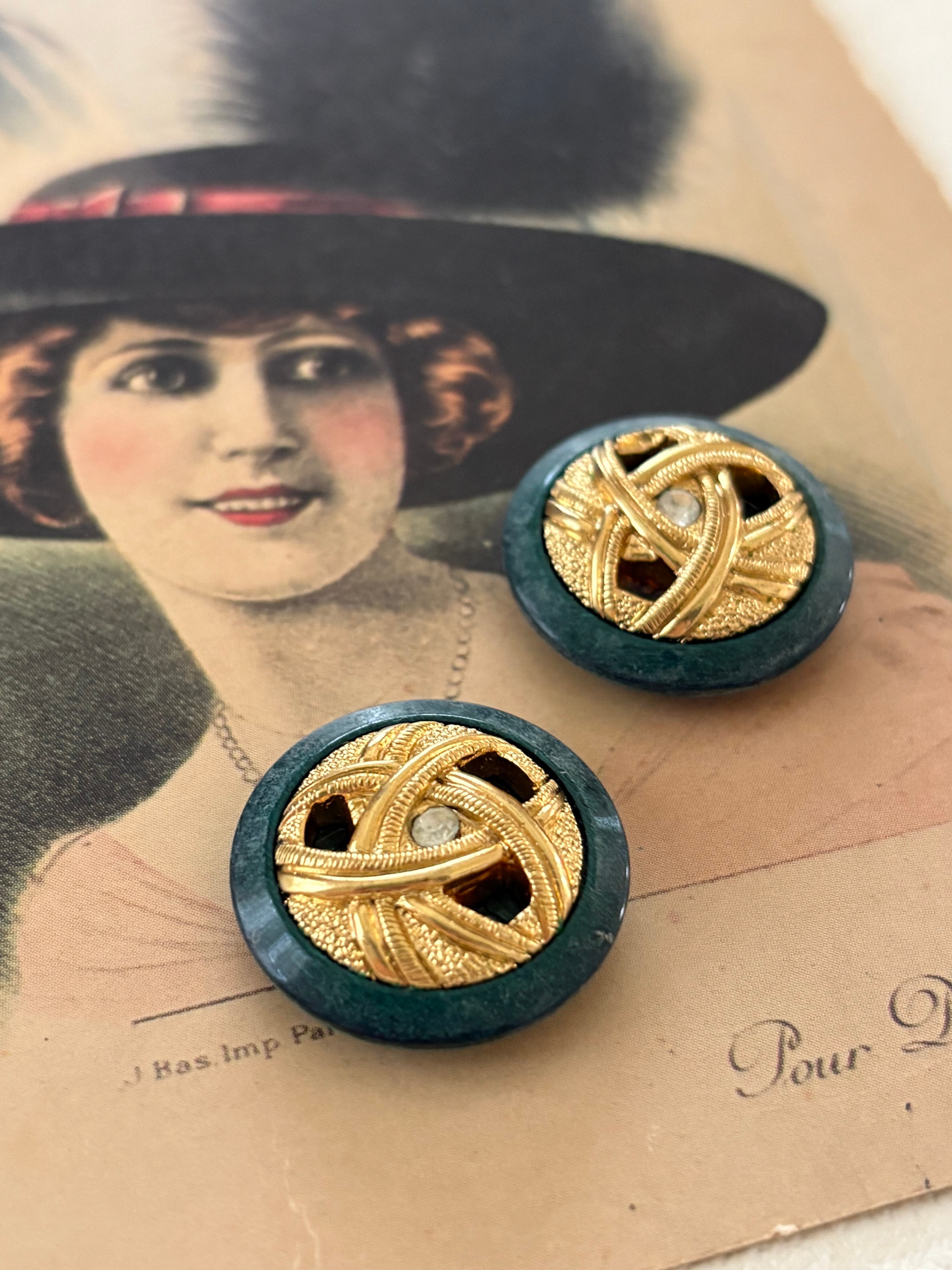 Import Vintageボタン グリーン×ゴールド 22mm ストーン 樹脂×メタル アクセサリーパーツ デコレーション材