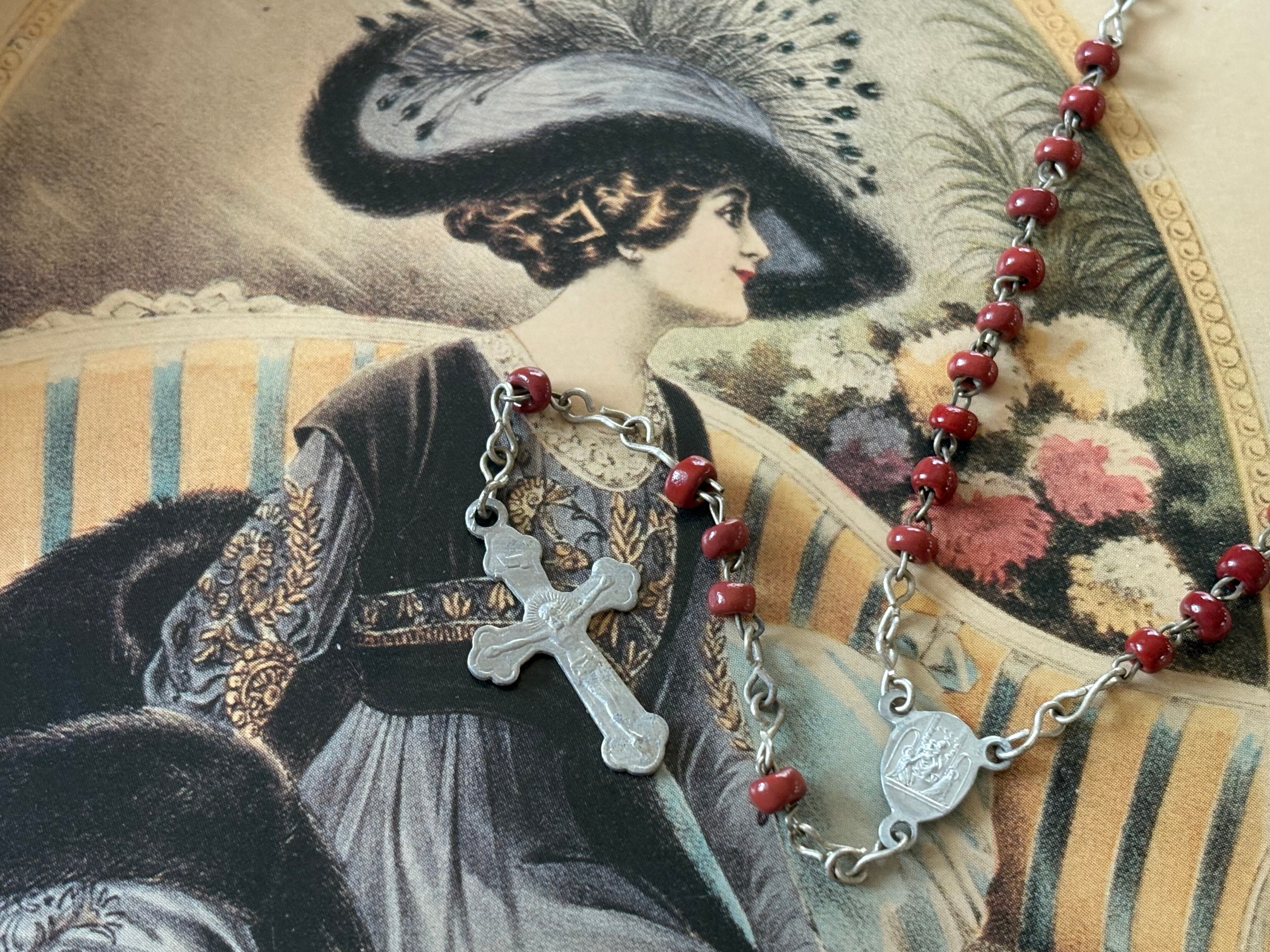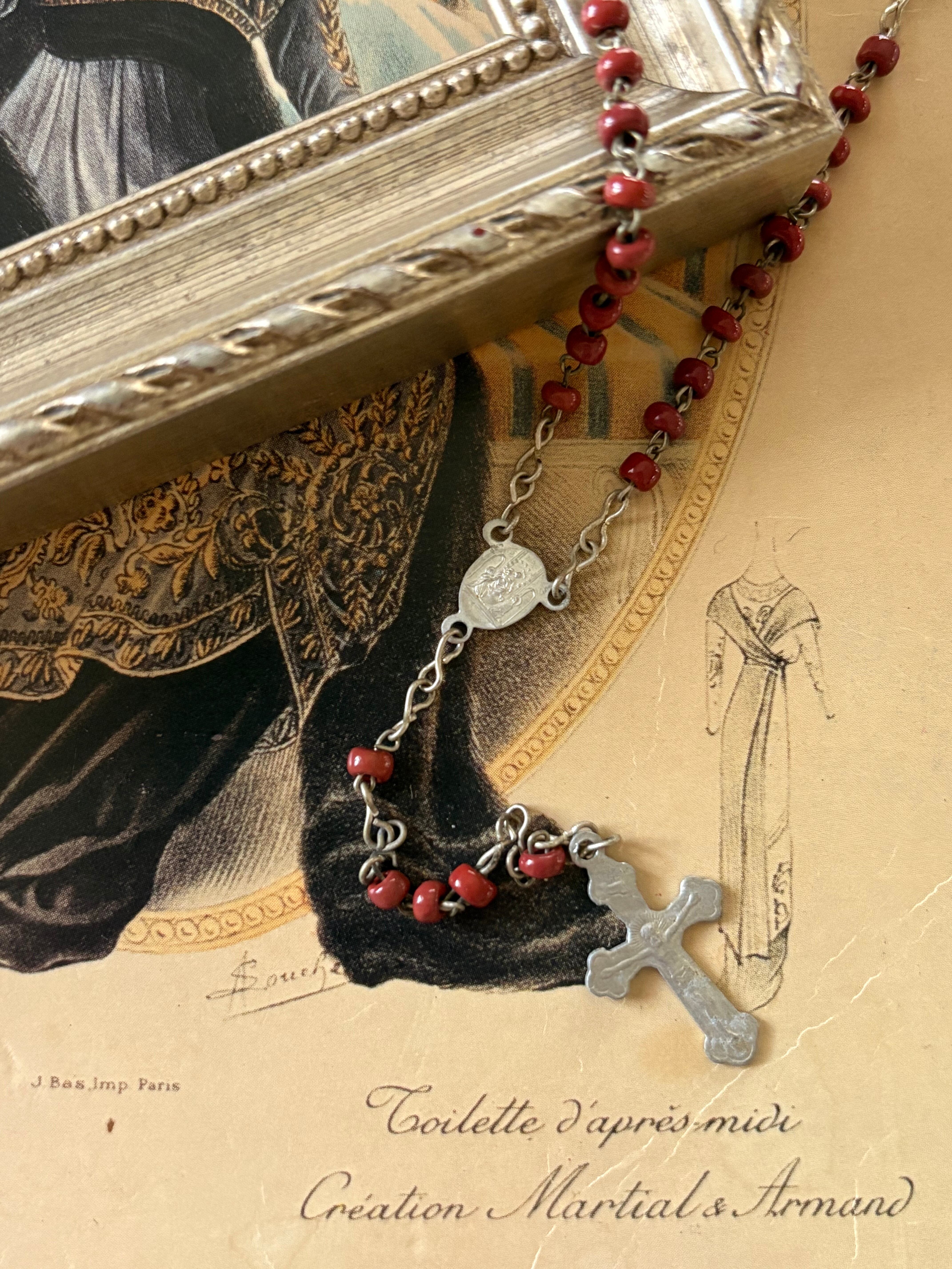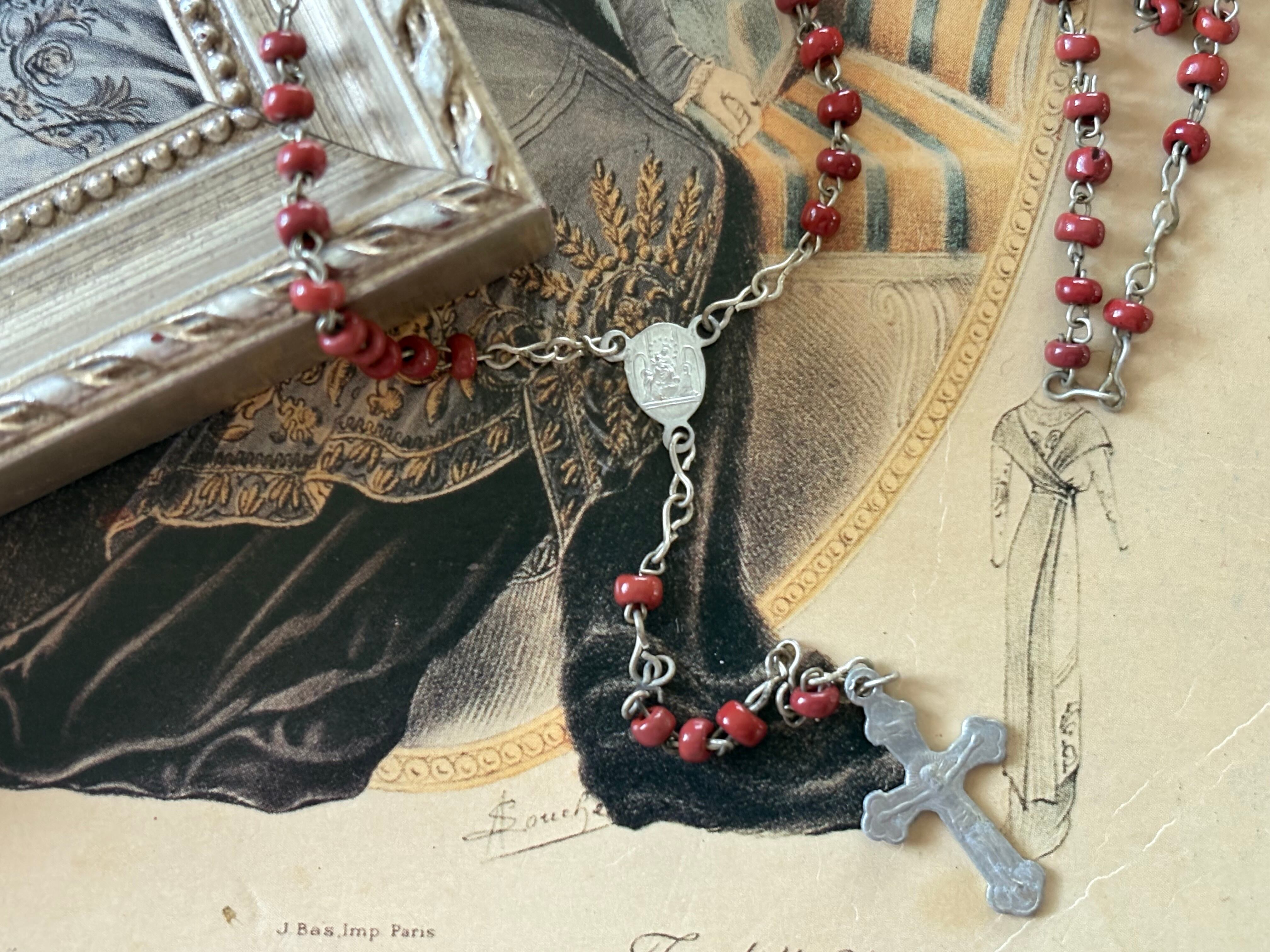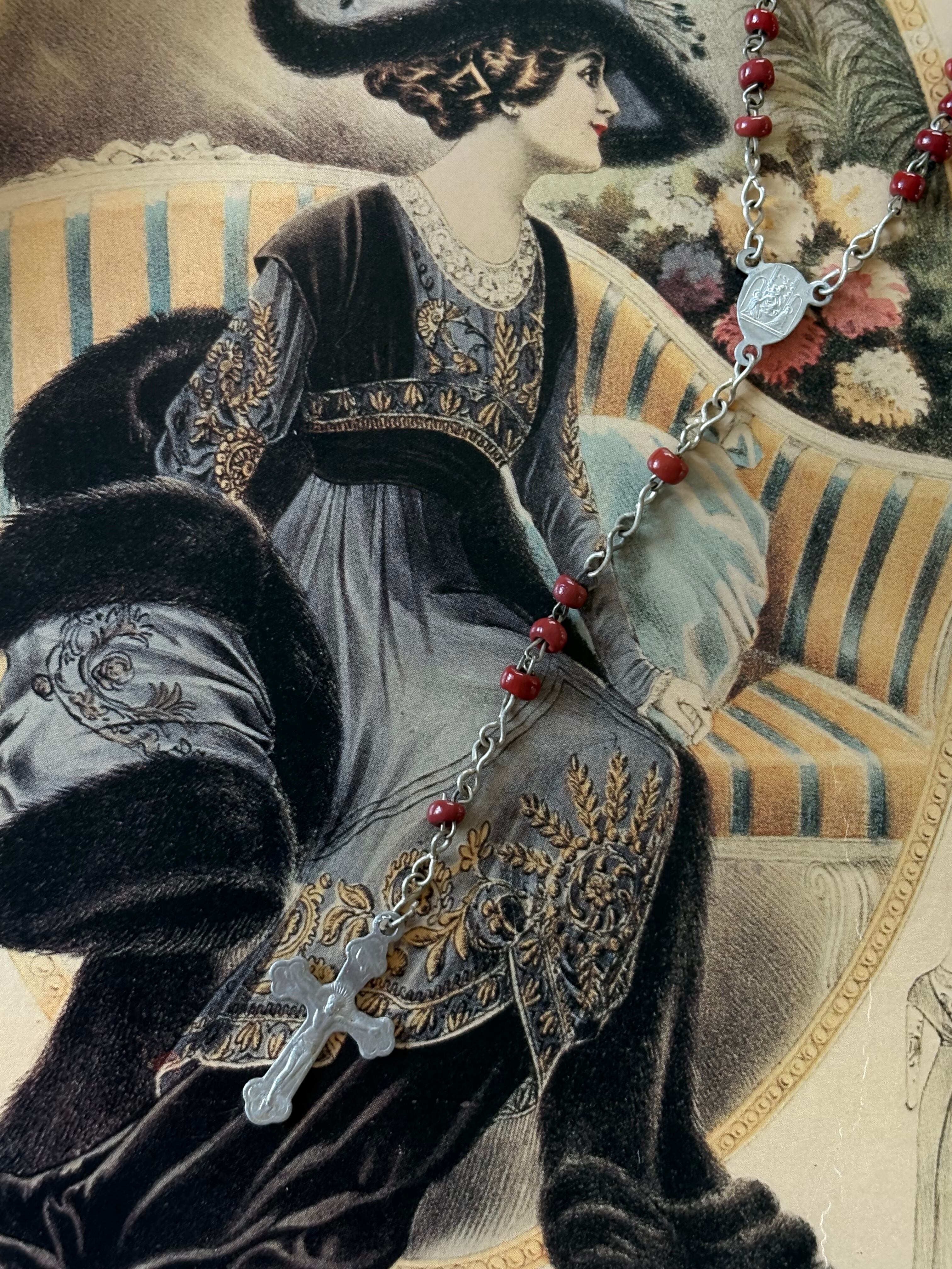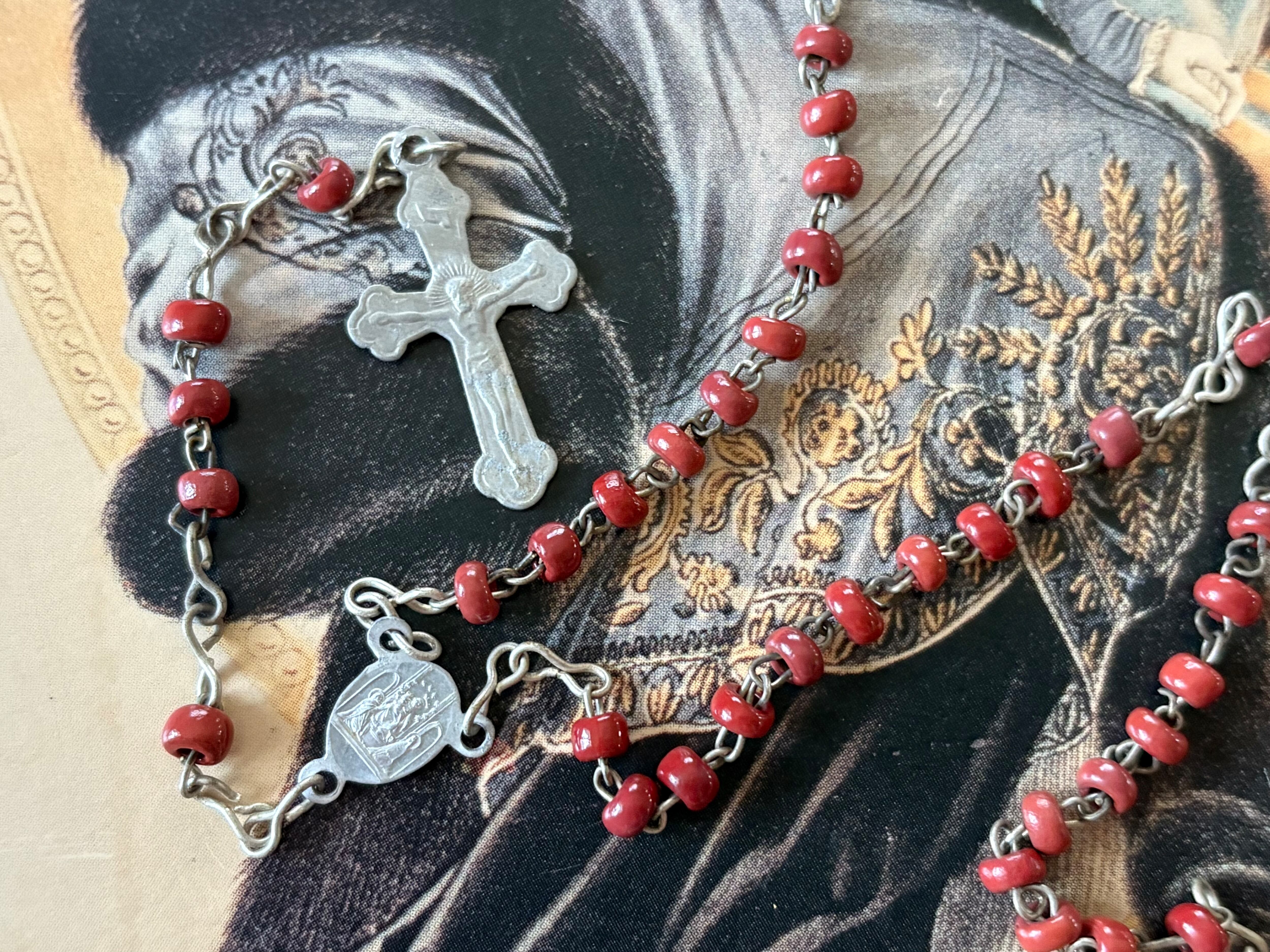 イタリア Vintage レッドシードビーズのロザリオ 聖品 アクセサリーパーツ インテリア小物