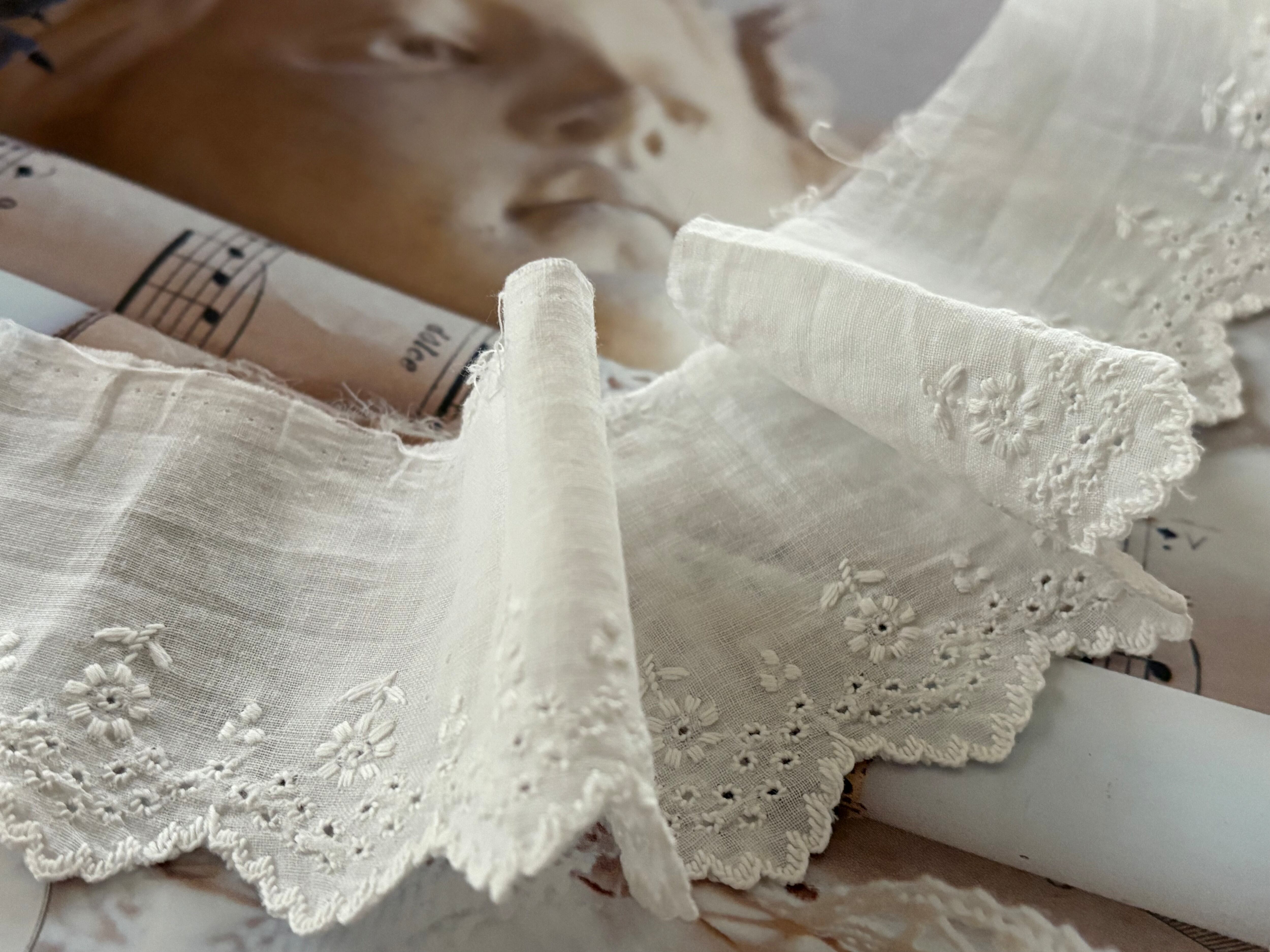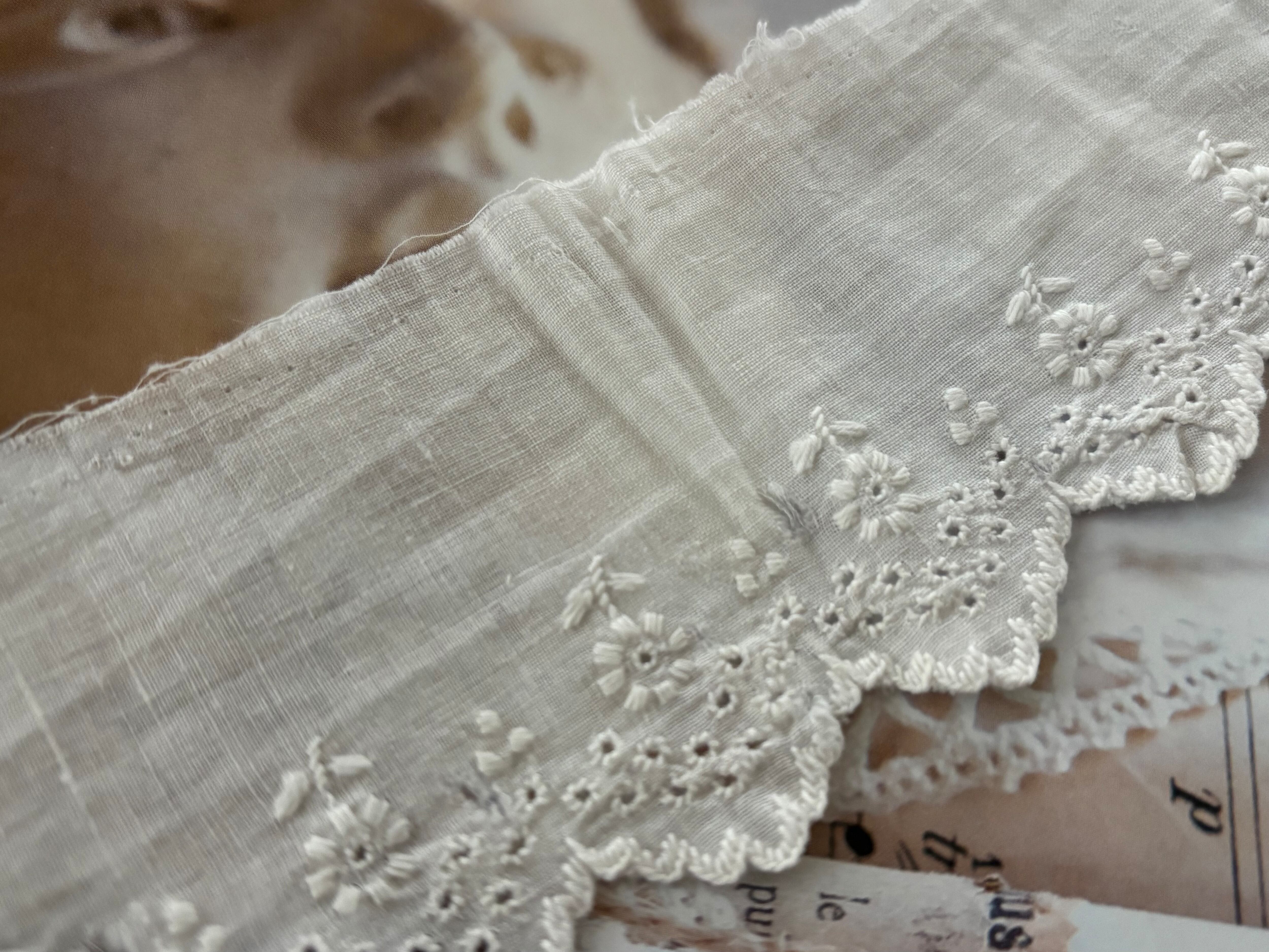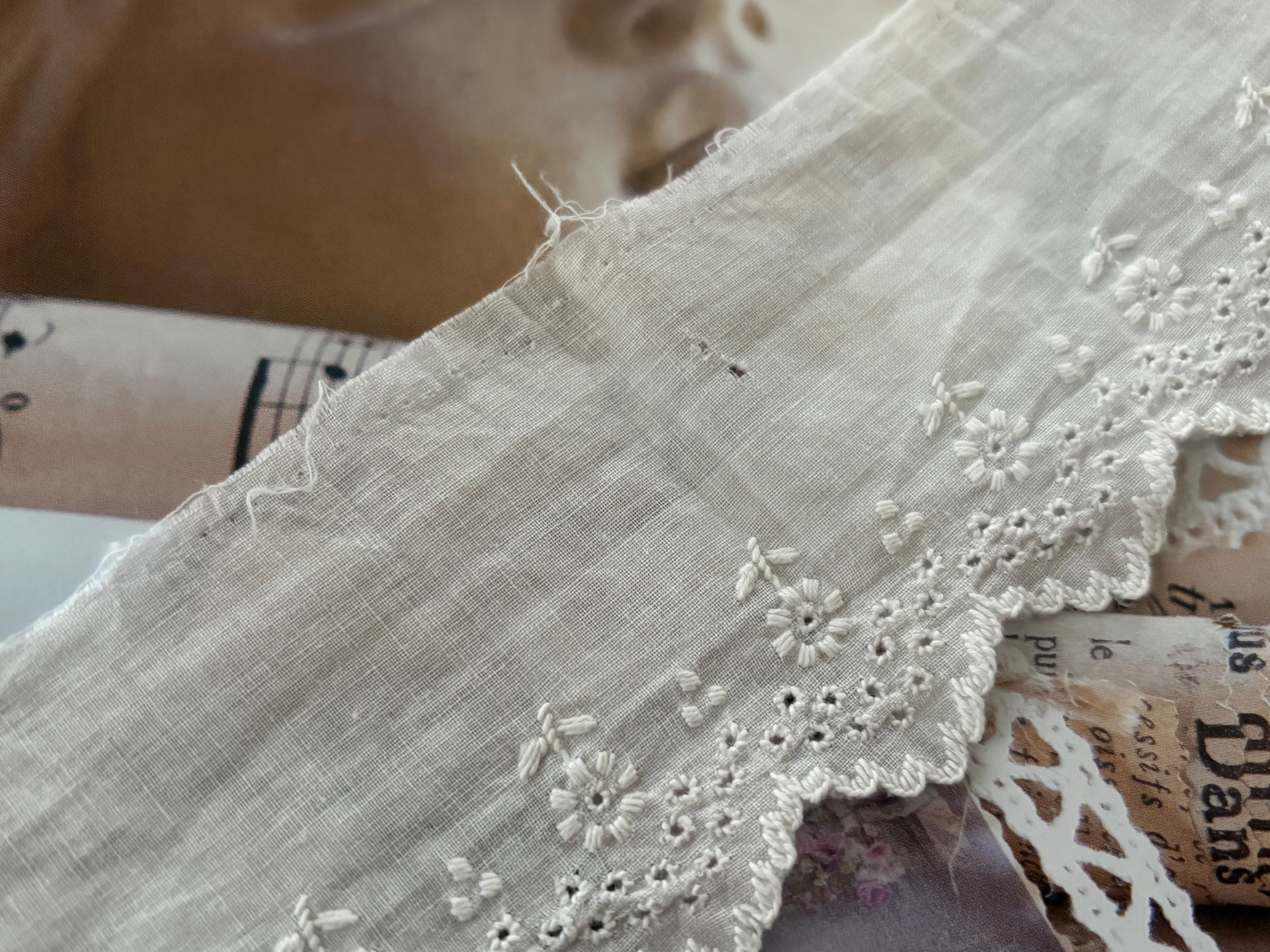 大変薄いコットン生地ですので複数箇所にホール、一部スカラップの部分にほつれ、僅かな破れがございます。
