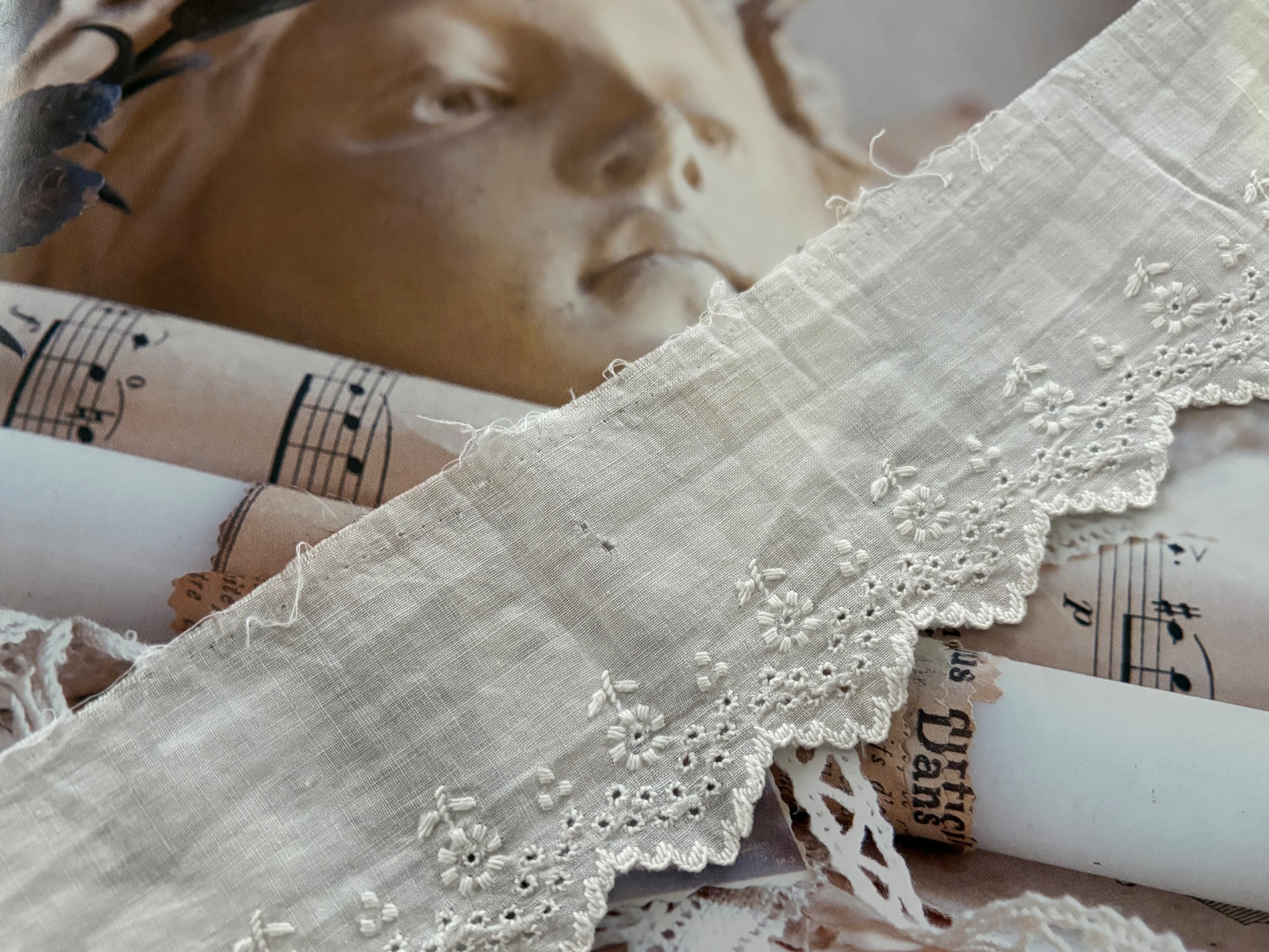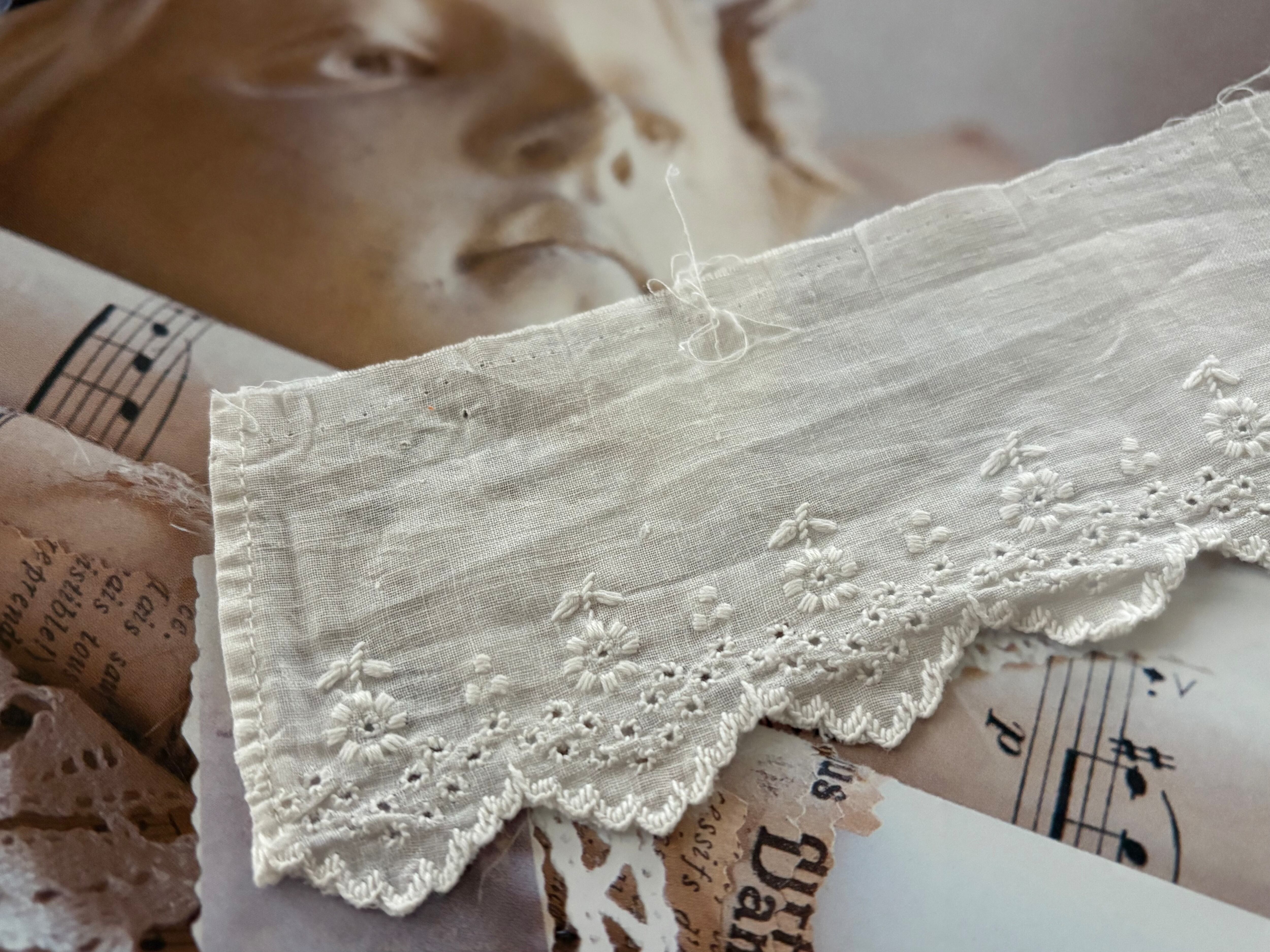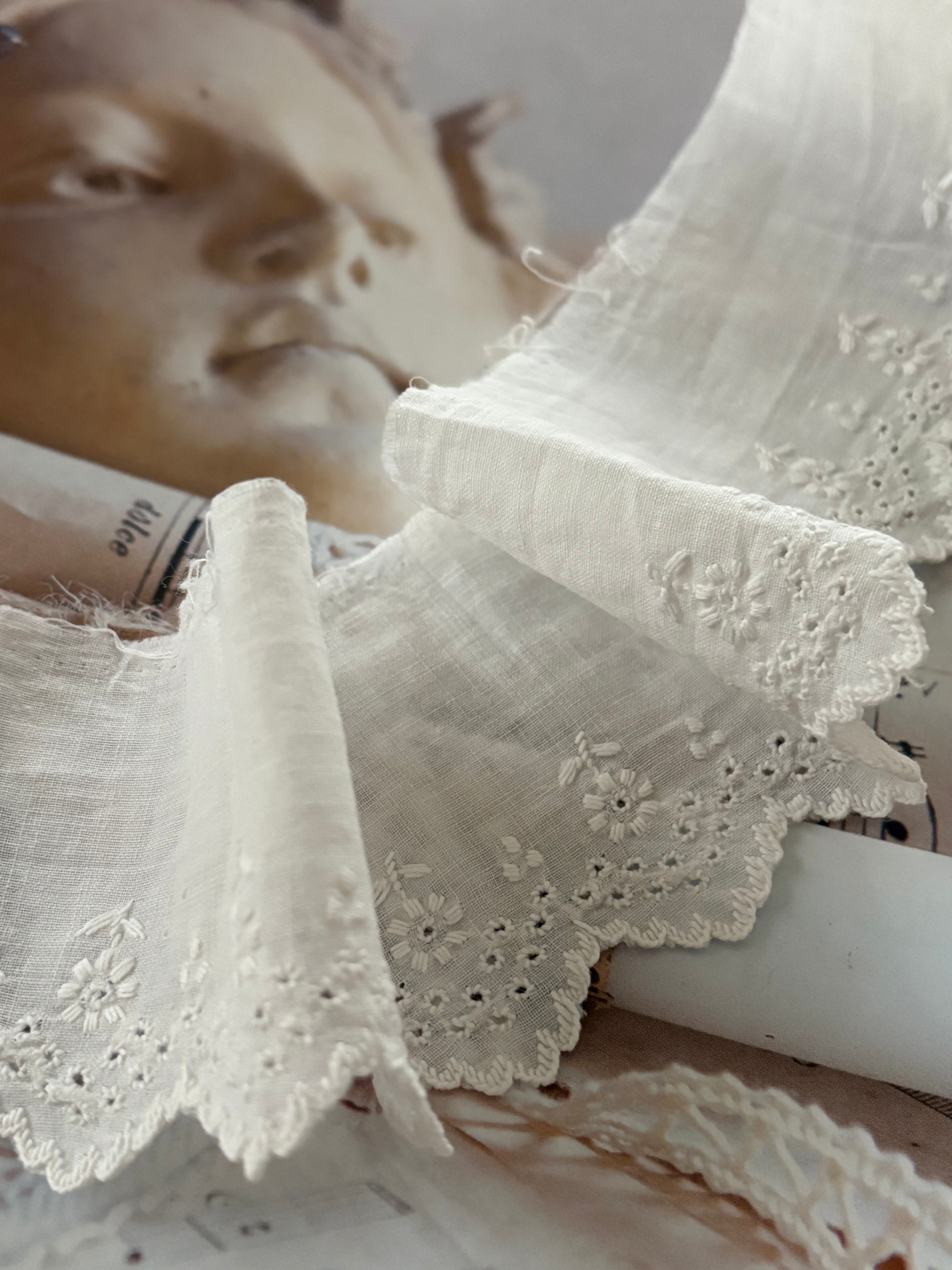 大変薄いコットン生地ですので複数箇所にホール、一部スカラップの部分にほつれ、僅かな破れがございます。