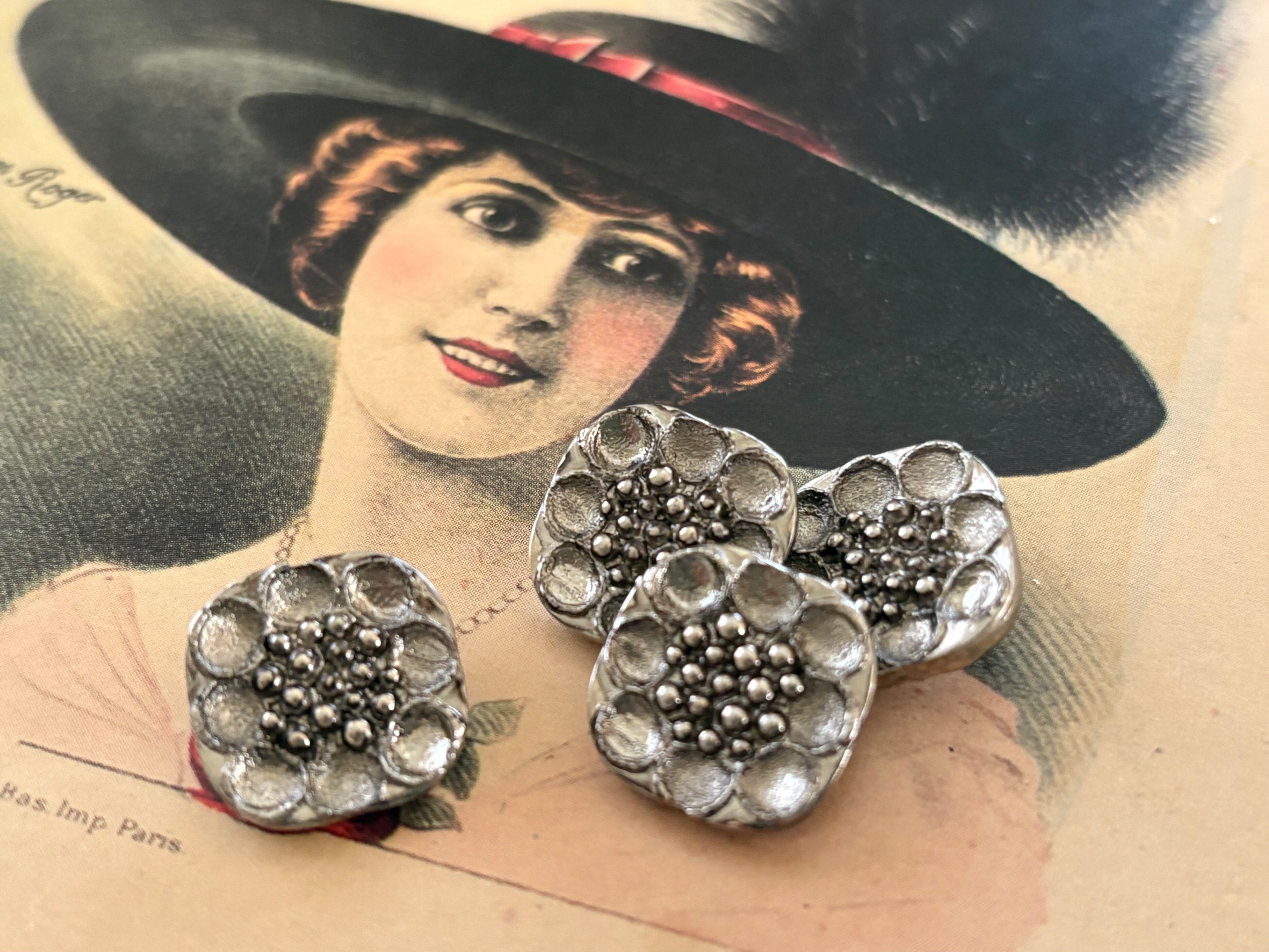シルバーカラーのアンティークな風合いが小さいサイズながらも目をひくボタンです。