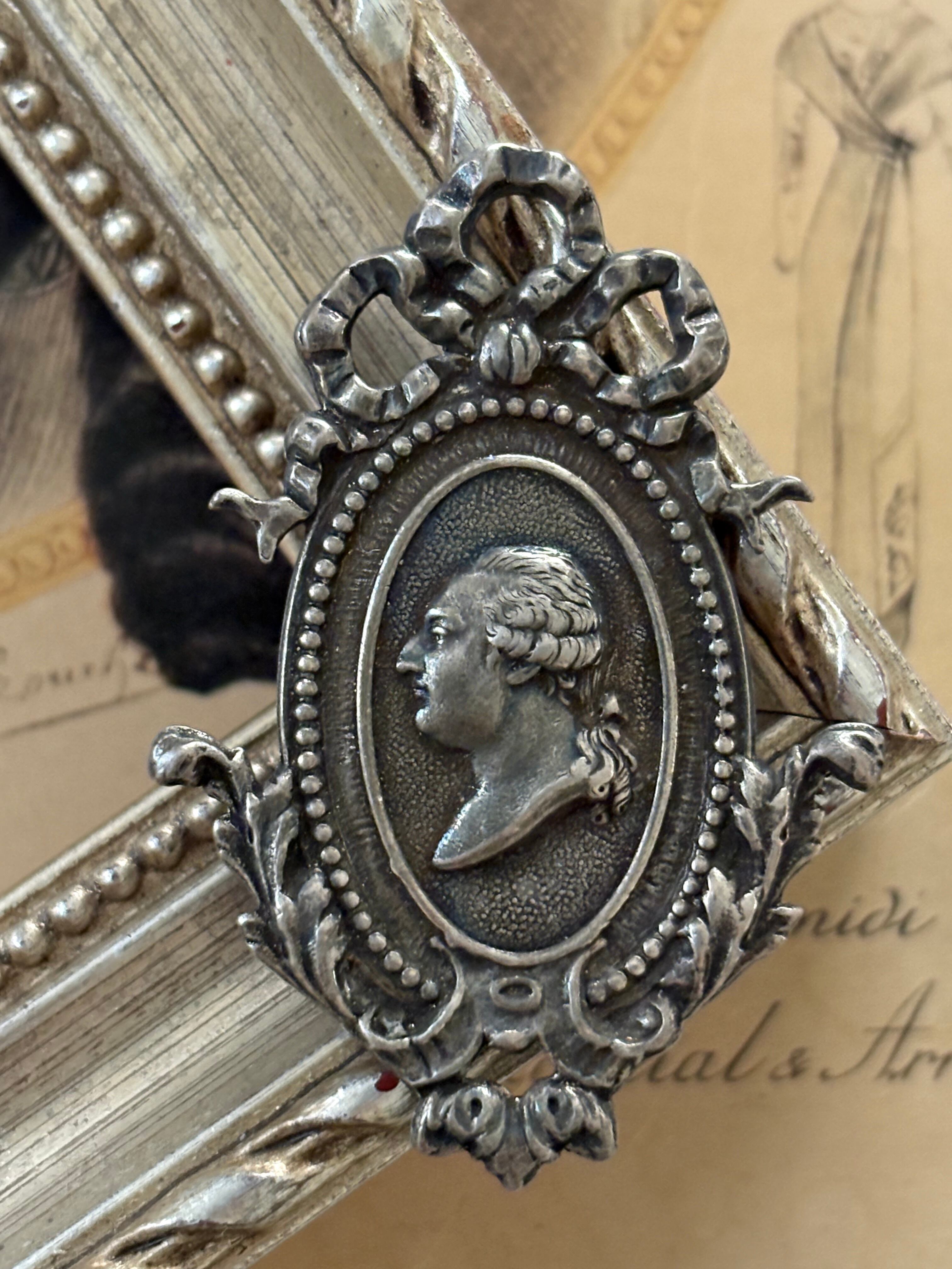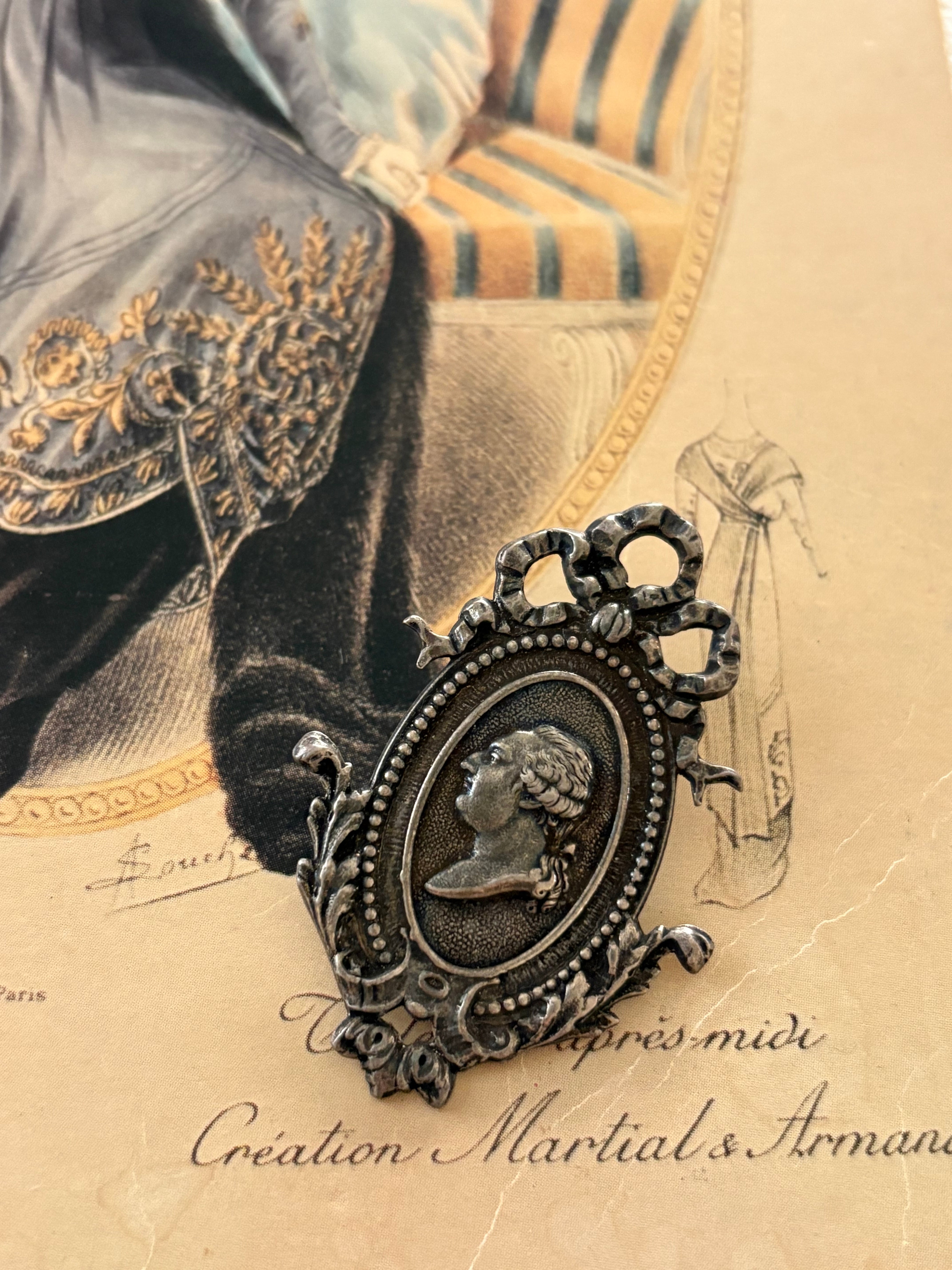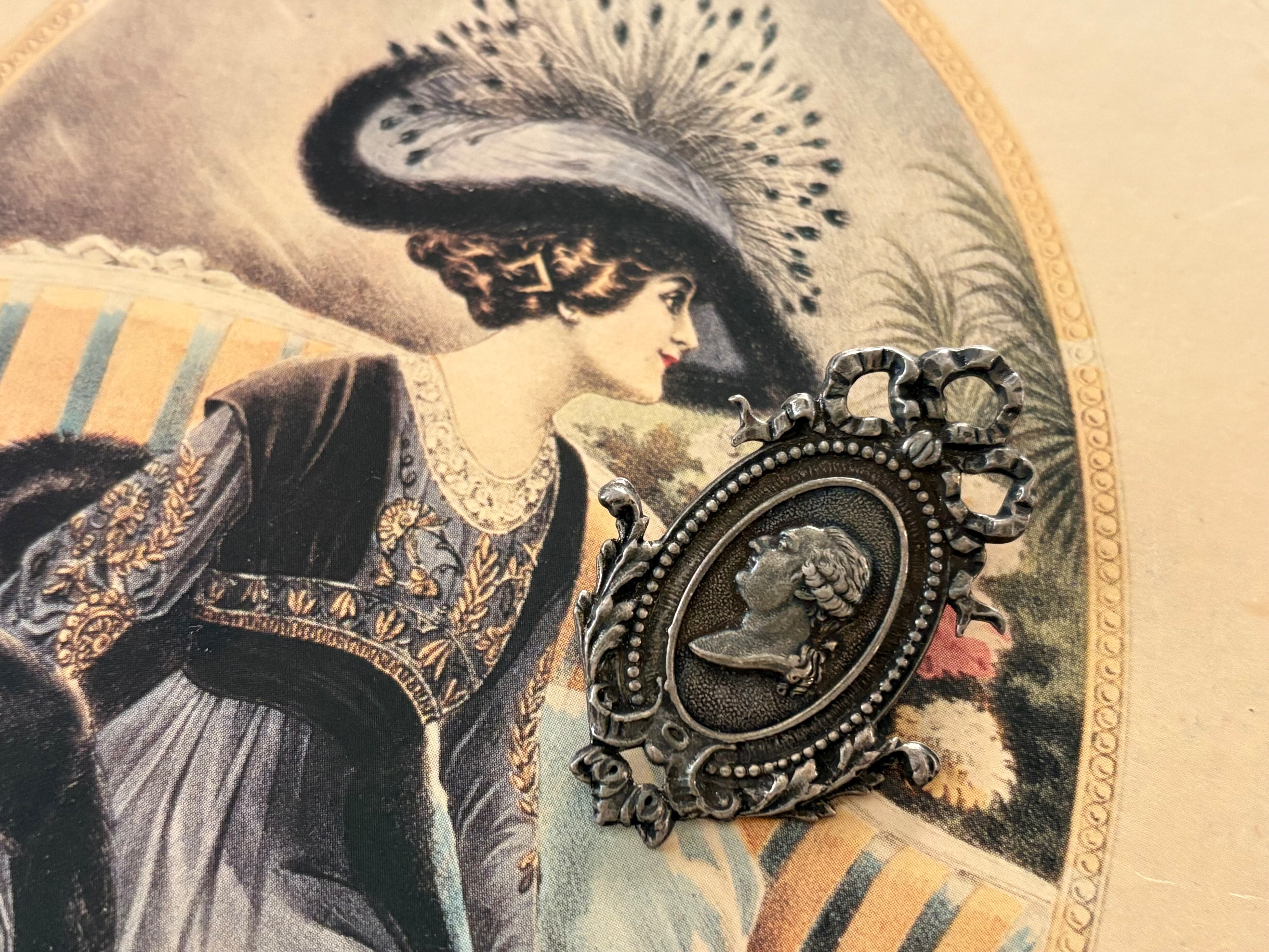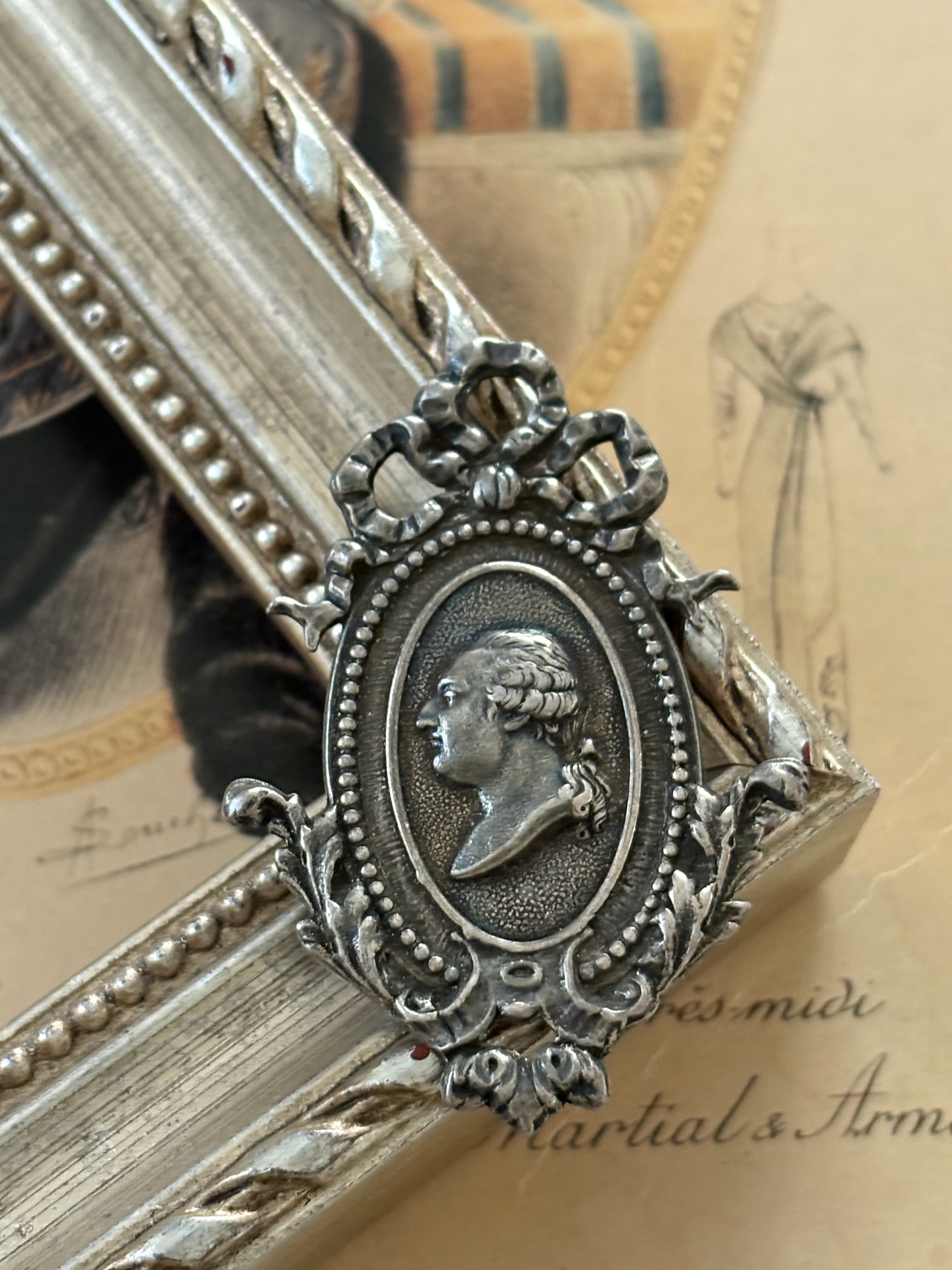 フランスアンティーク Ruban フレーム 貴人の横顔のピンバッジ 貴族 45mm 銀古美 撮影小物 インテリア小物 カルトナージュ