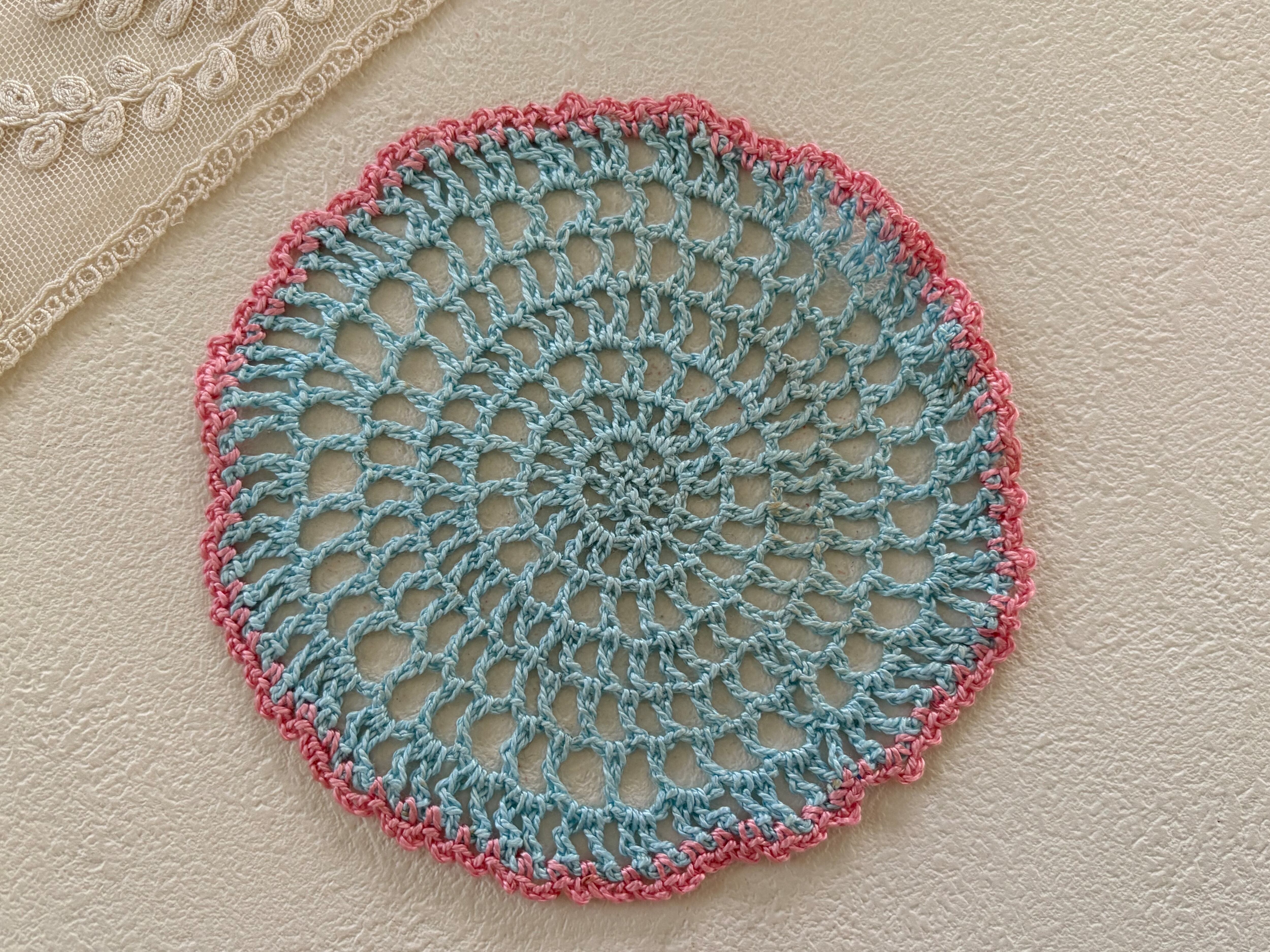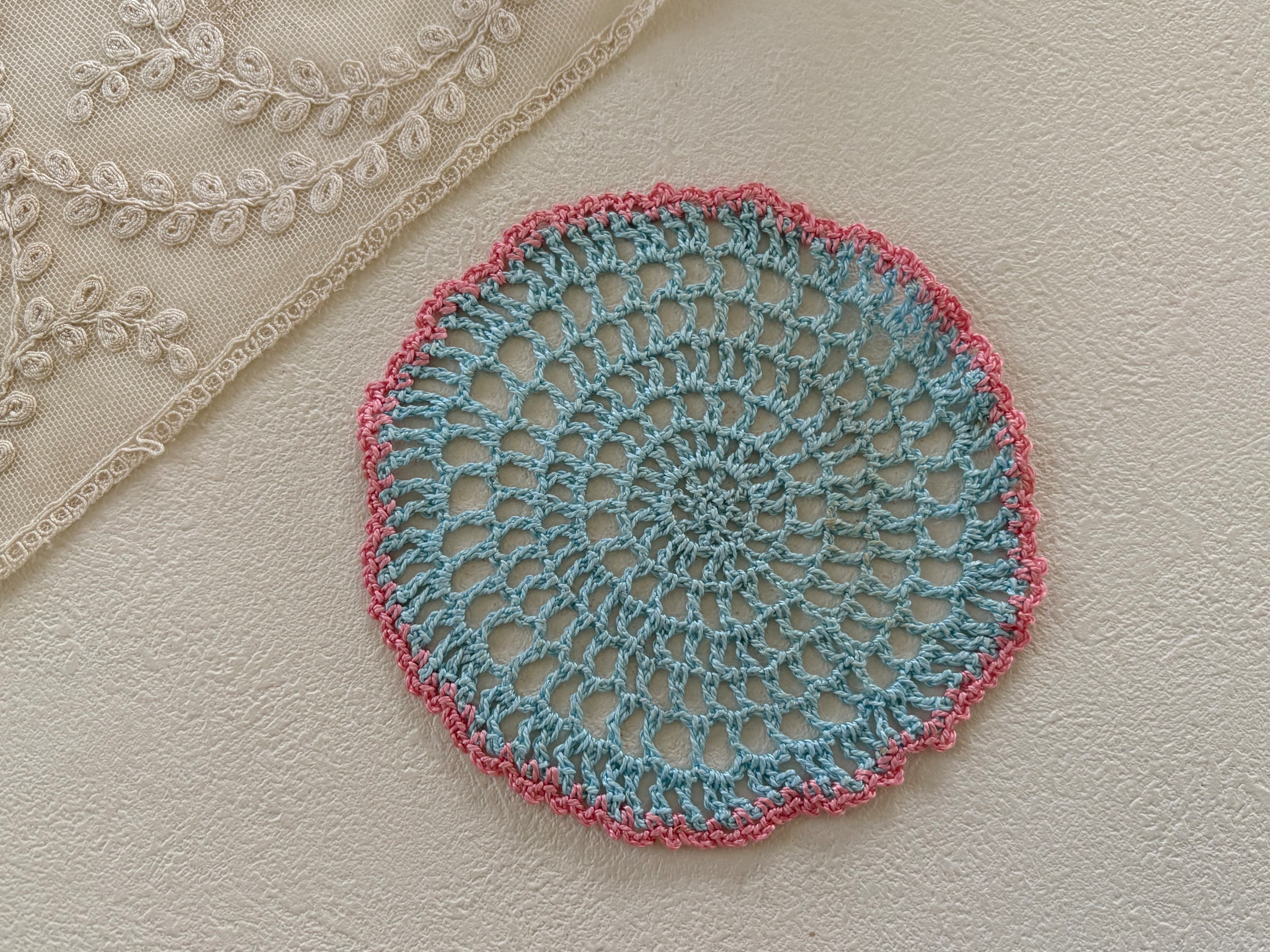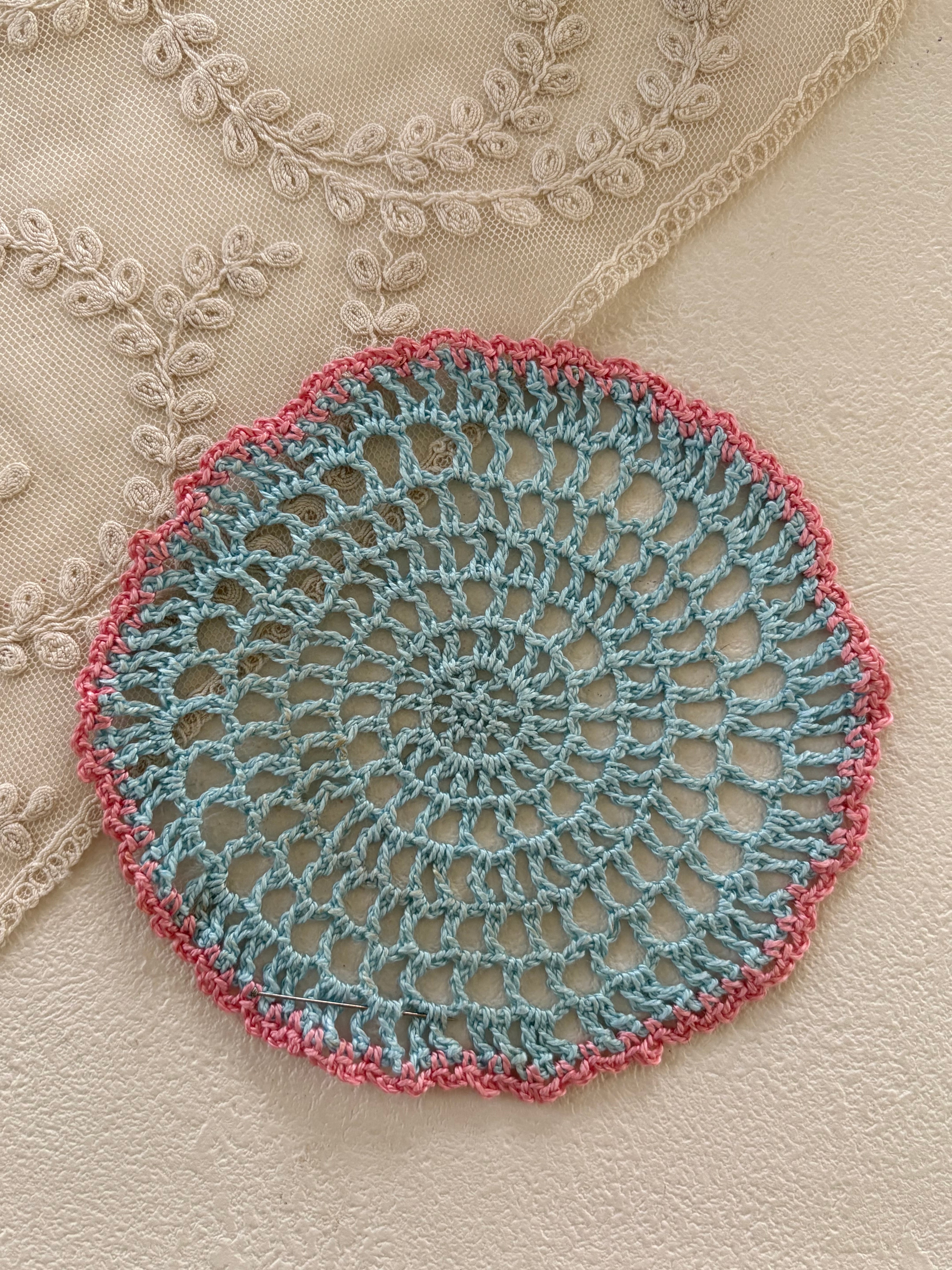 フランスVintage 手仕事のレース編ドイリー ライトブルー×ピンク 敷物 インテリア ハンドメイド素材 レースモチーフ