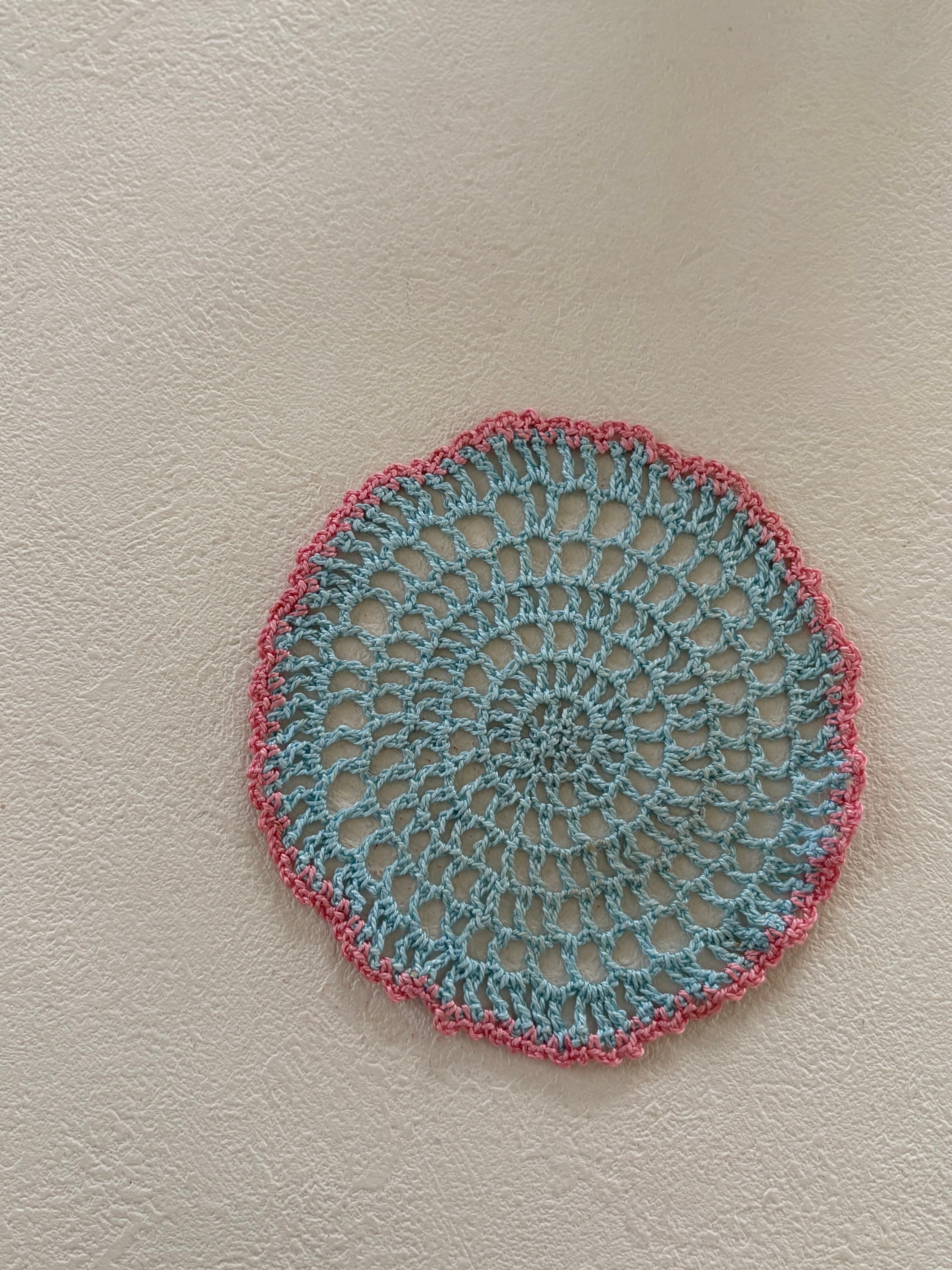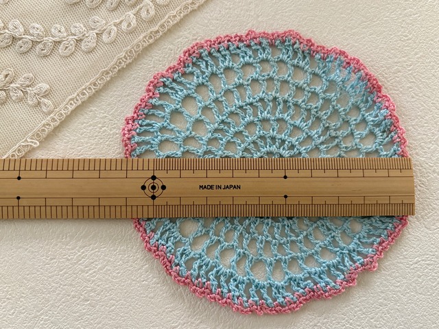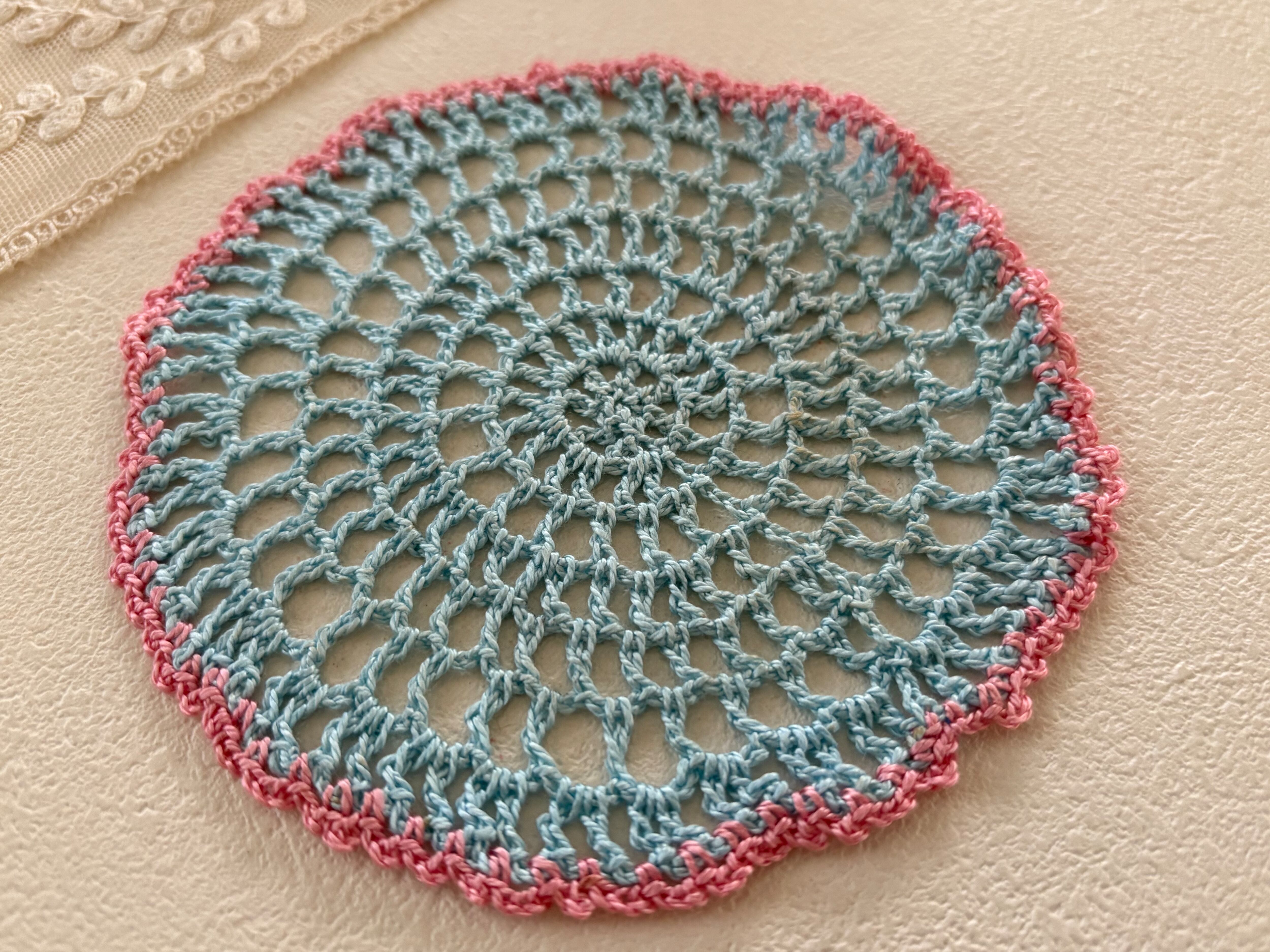 フランスVintage 手仕事のレース編ドイリー ライトブルー×ピンク 敷物 インテリア ハンドメイド素材 レースモチーフ