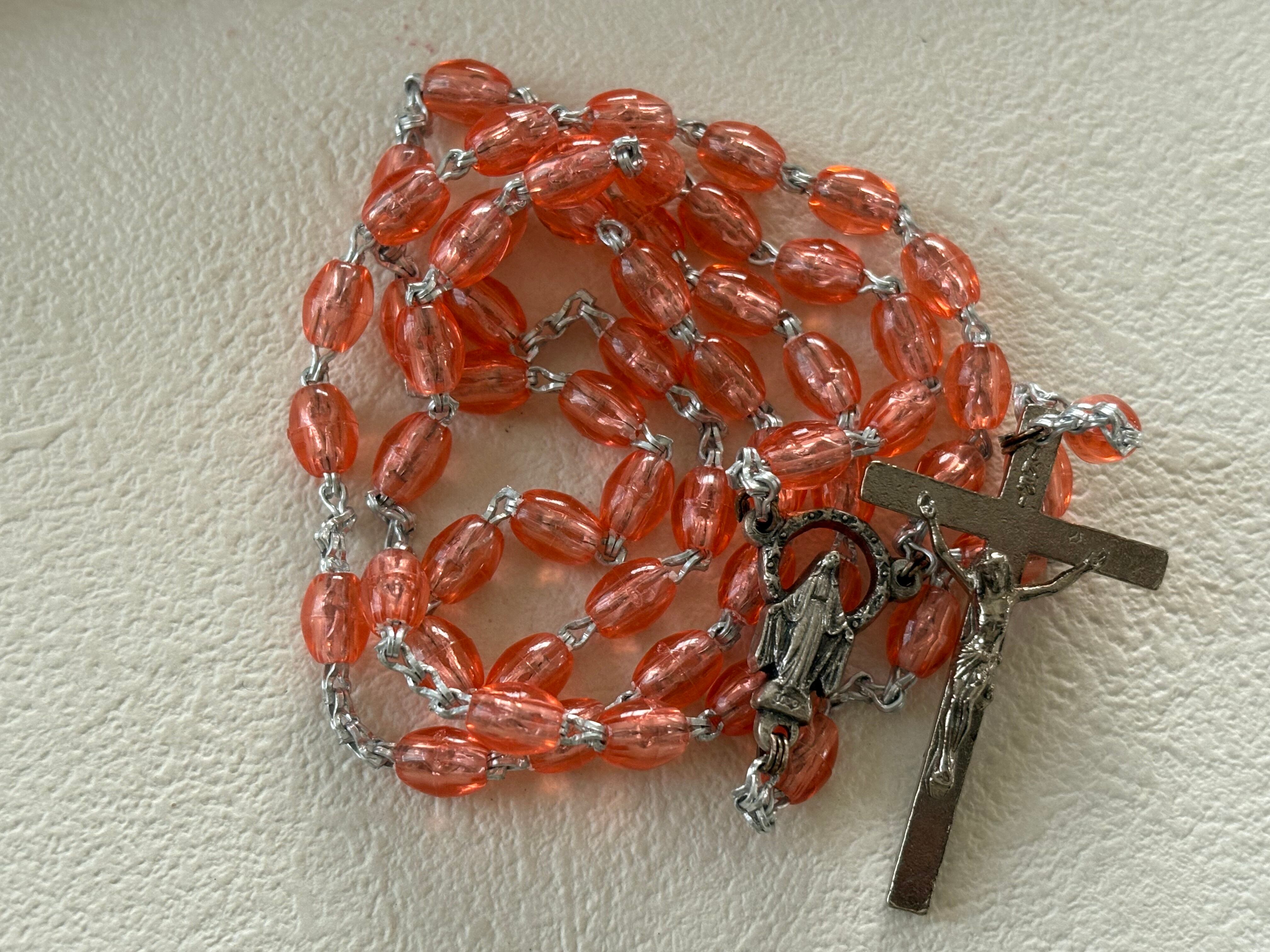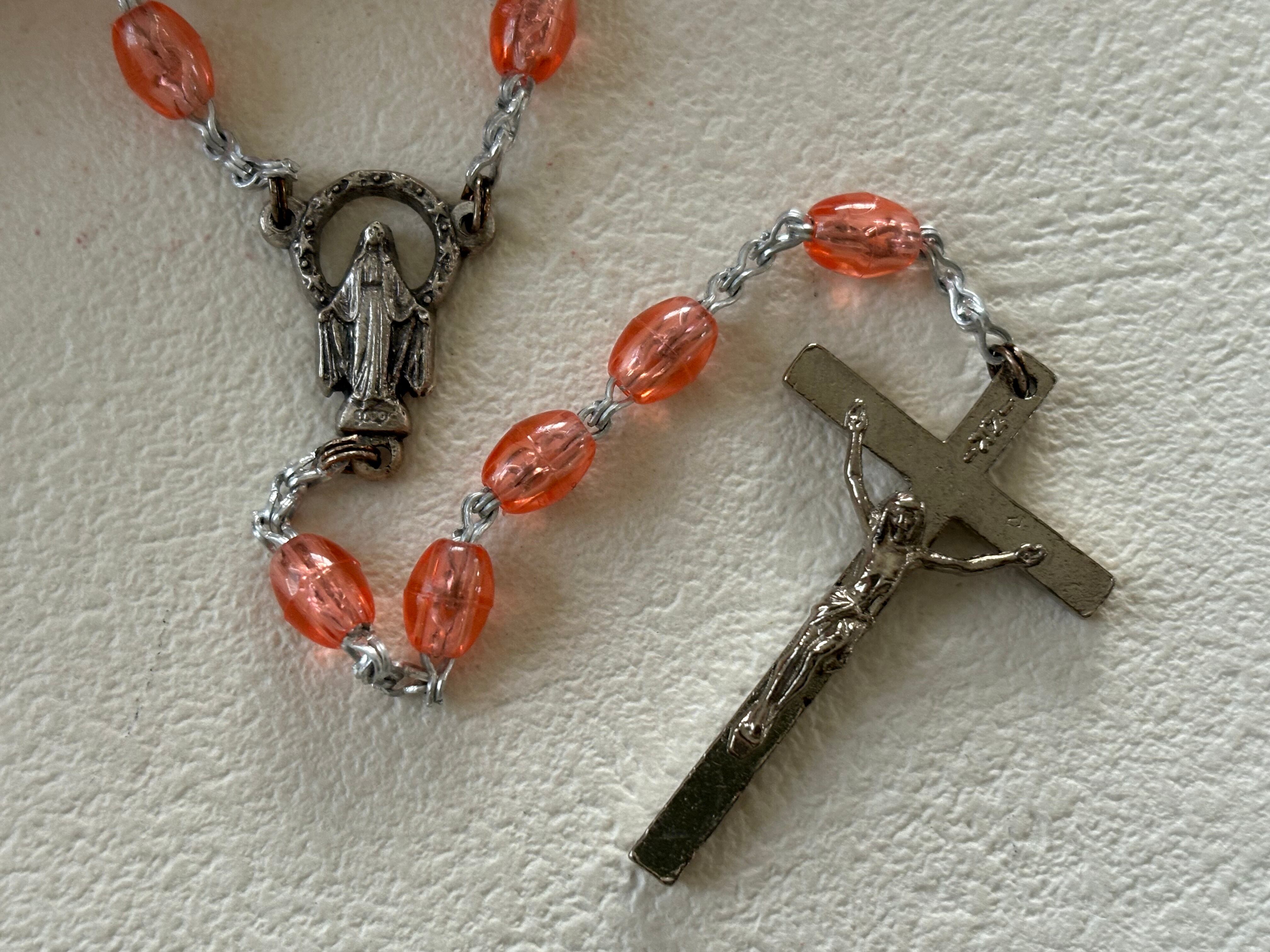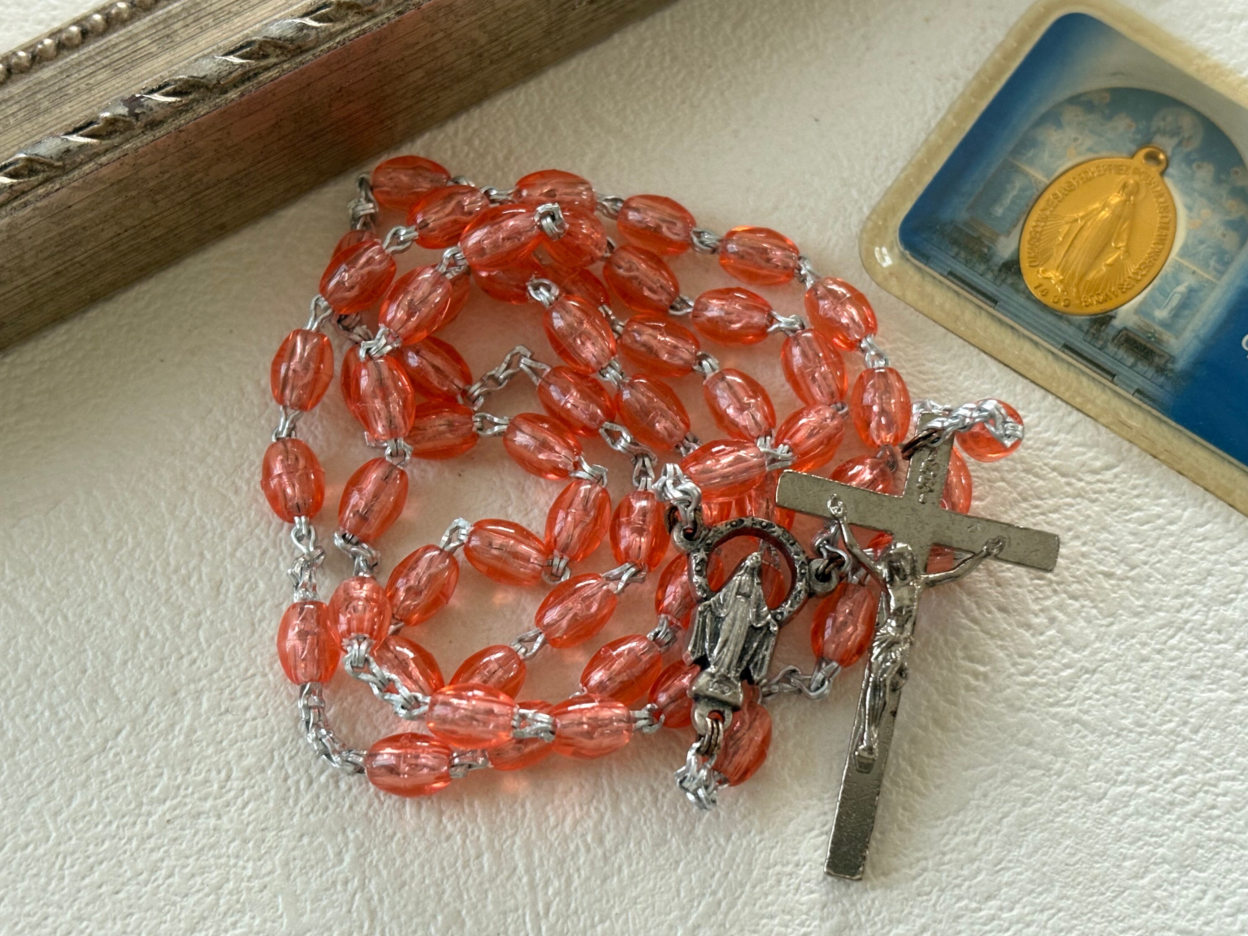 クリアピンクのプラスチックビーズ、センターピースに奇跡のメダイユ、トップにクロスがついています。