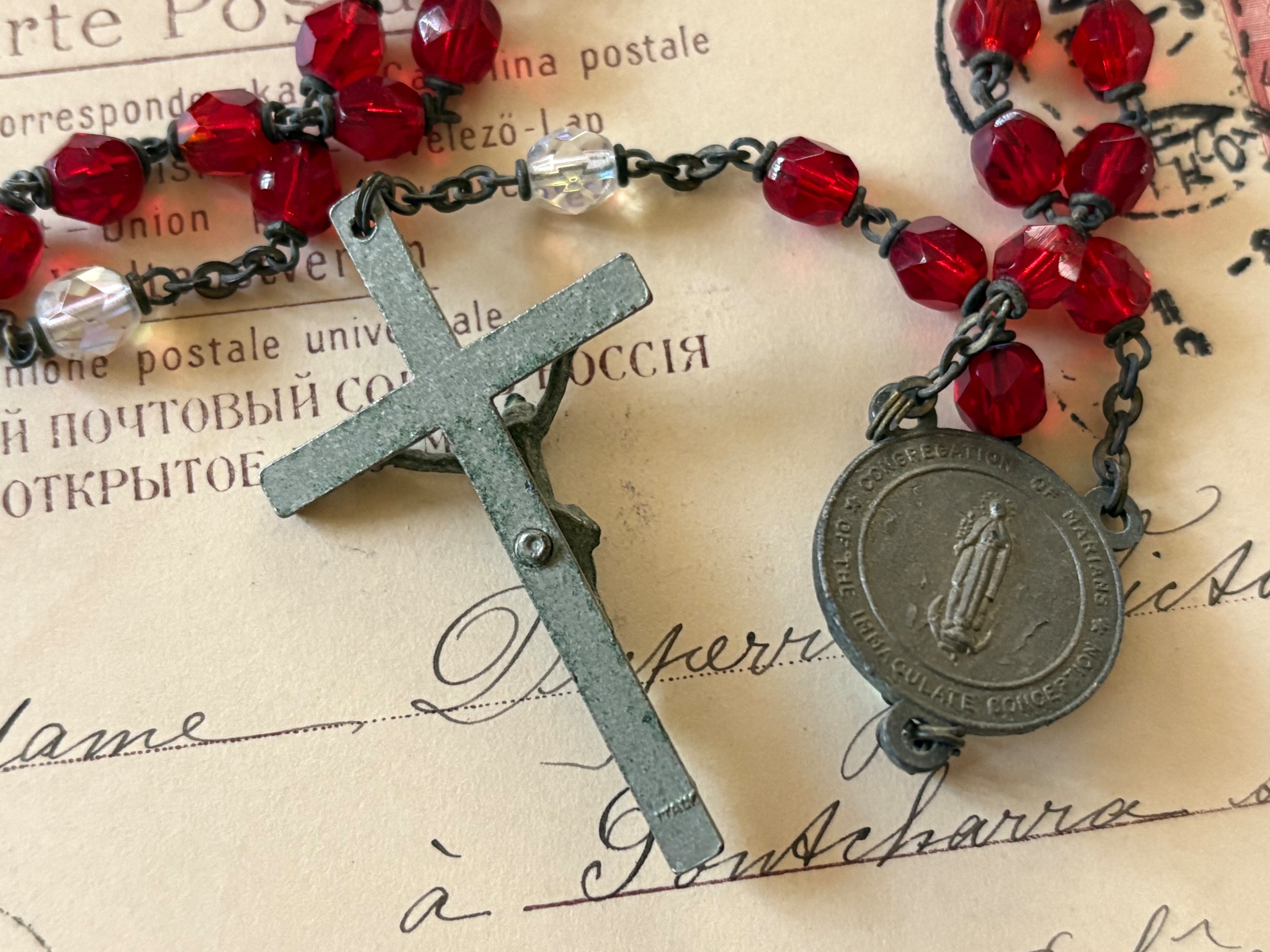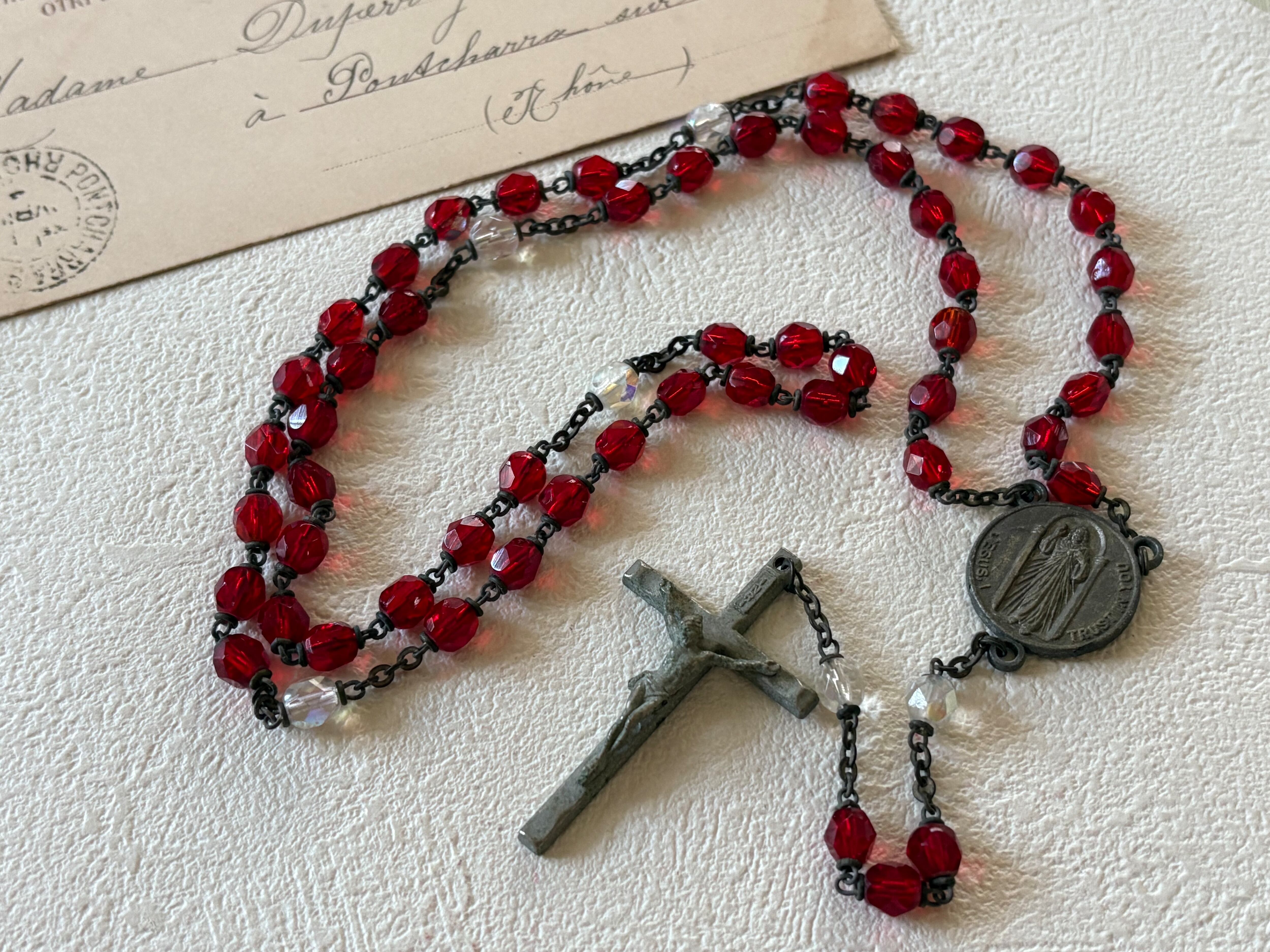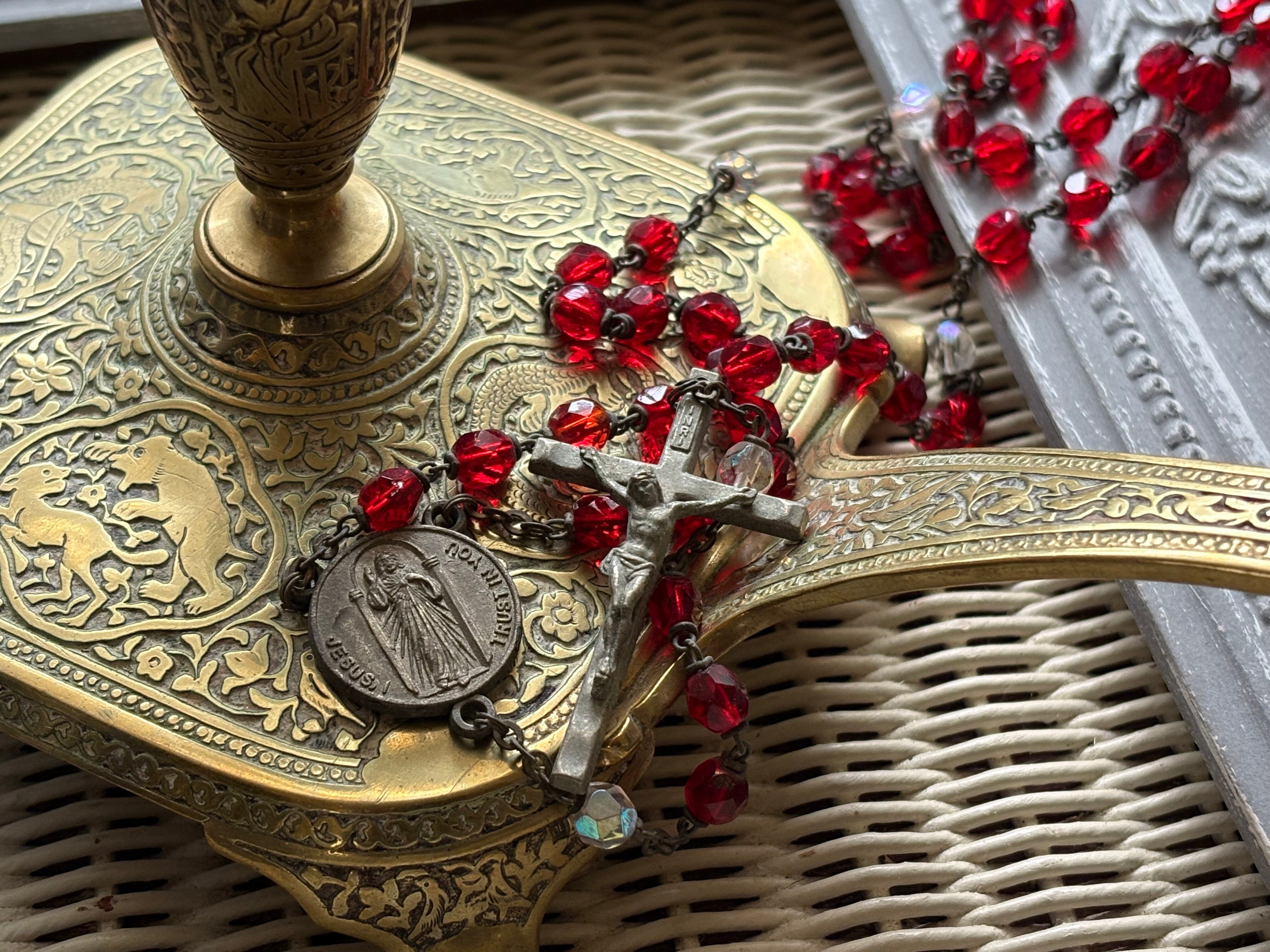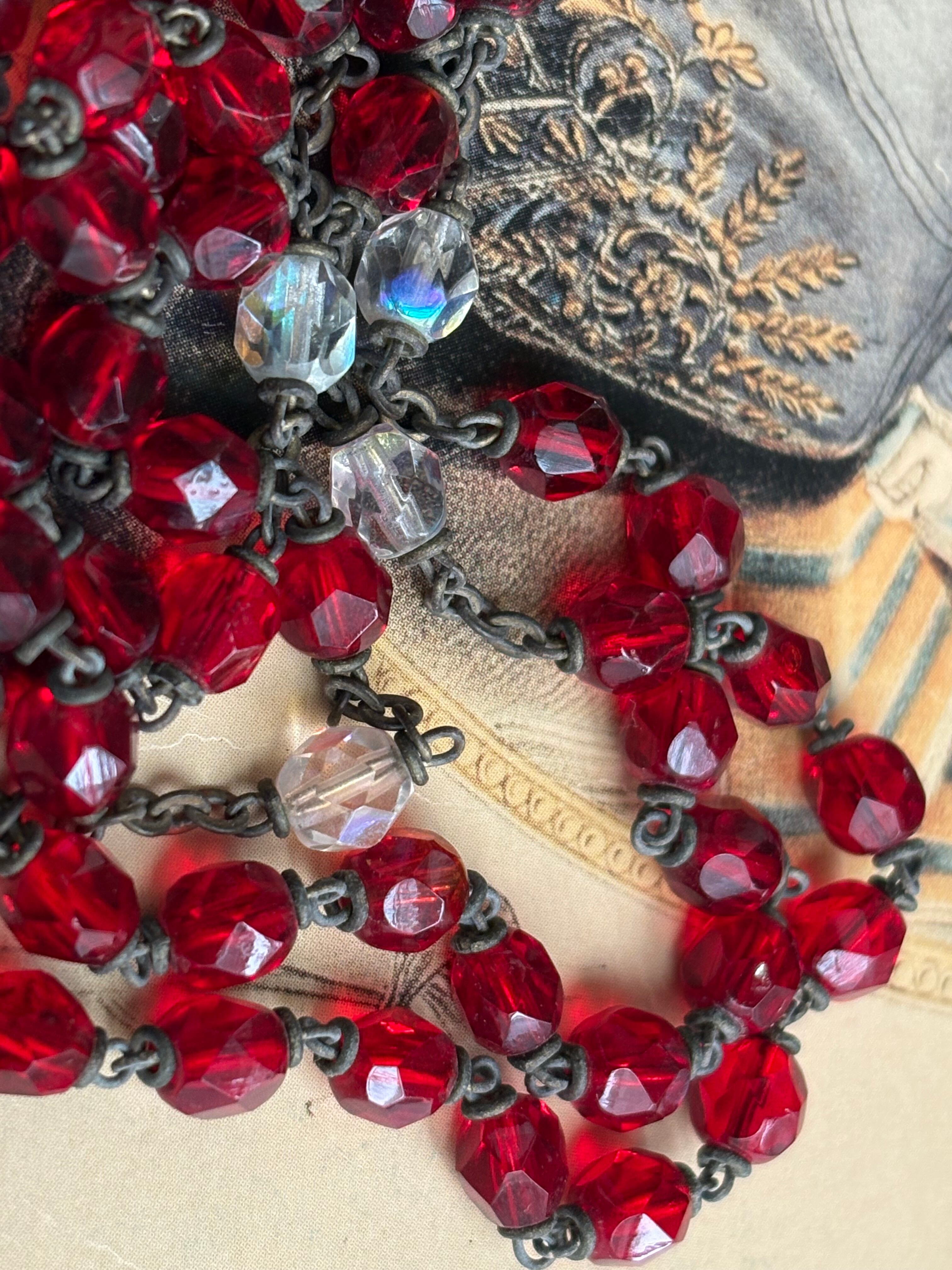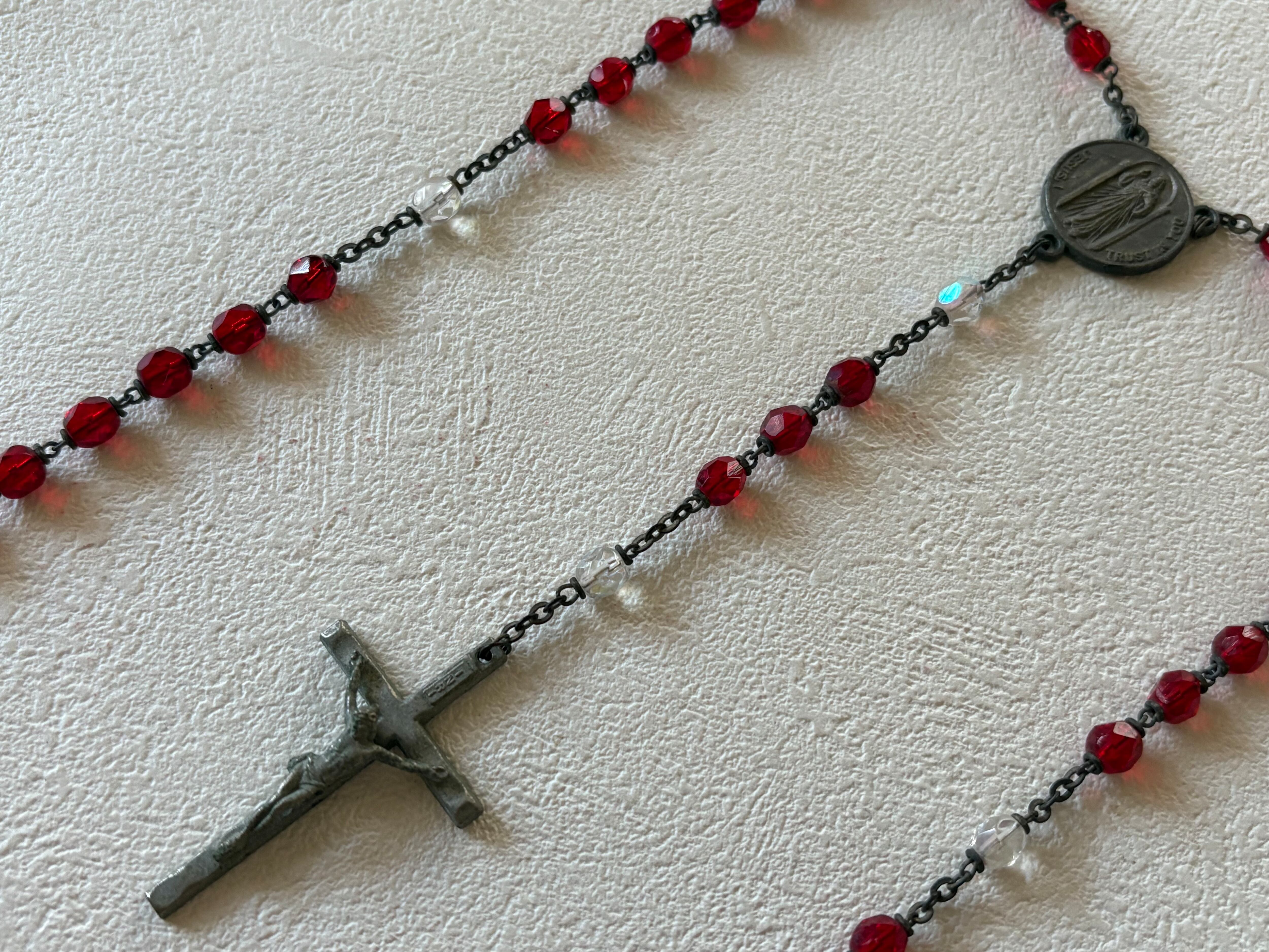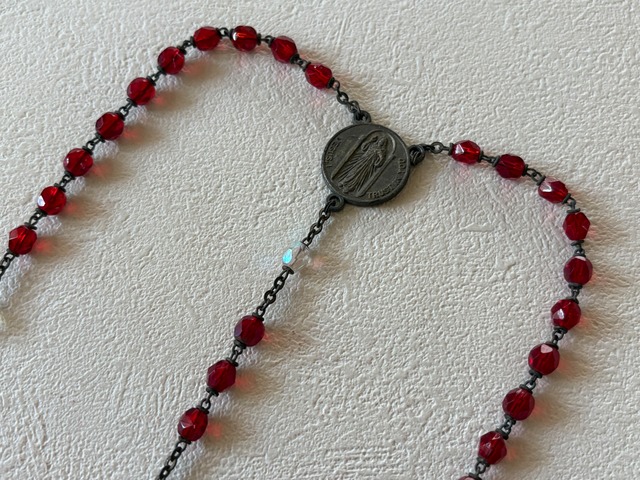 英国アンティーク レッド プラスチック珠 ロザリオ 聖品 キリスト アクセサリー パーツ 店舗什器 クリスマス インテリア
