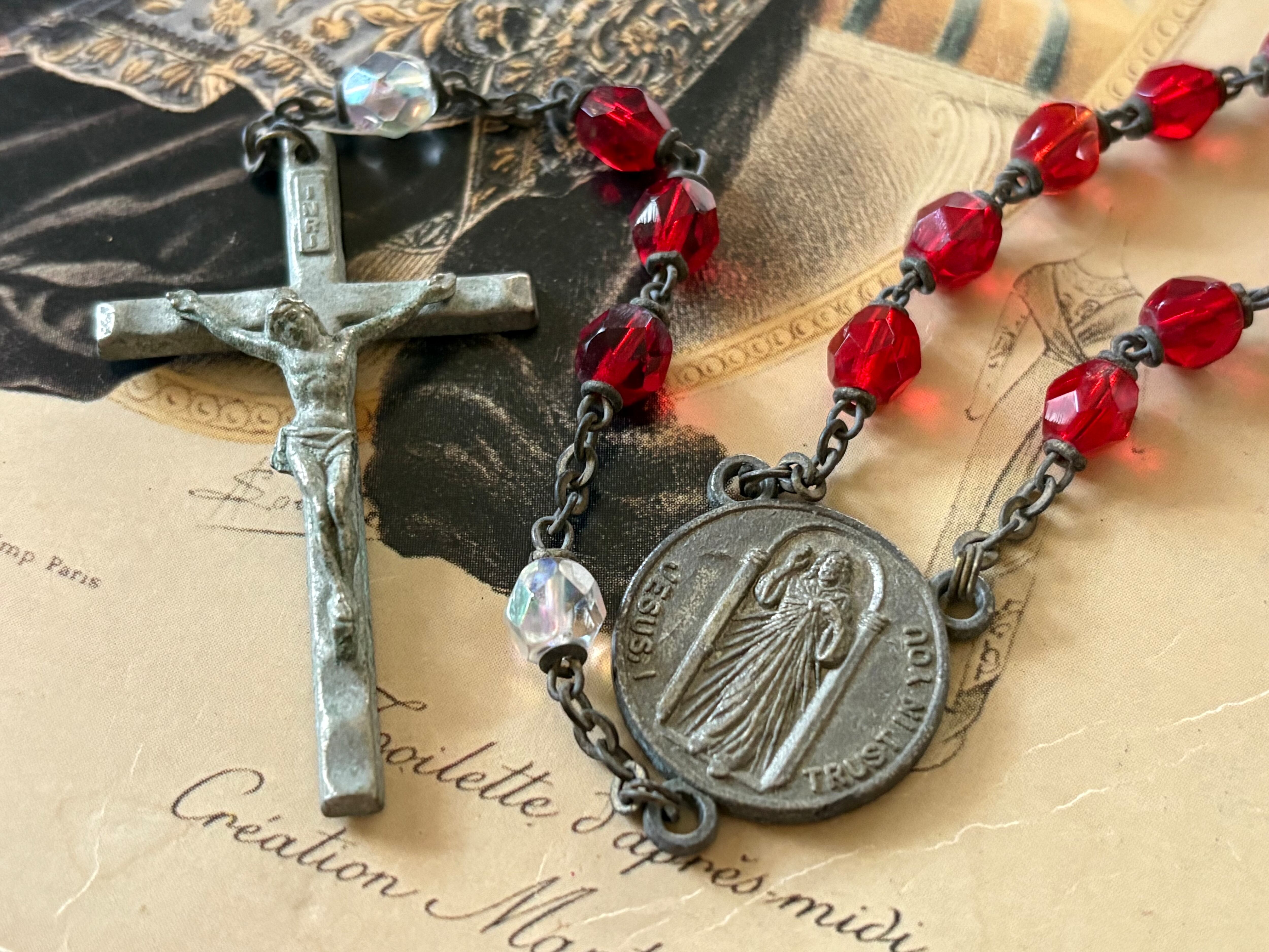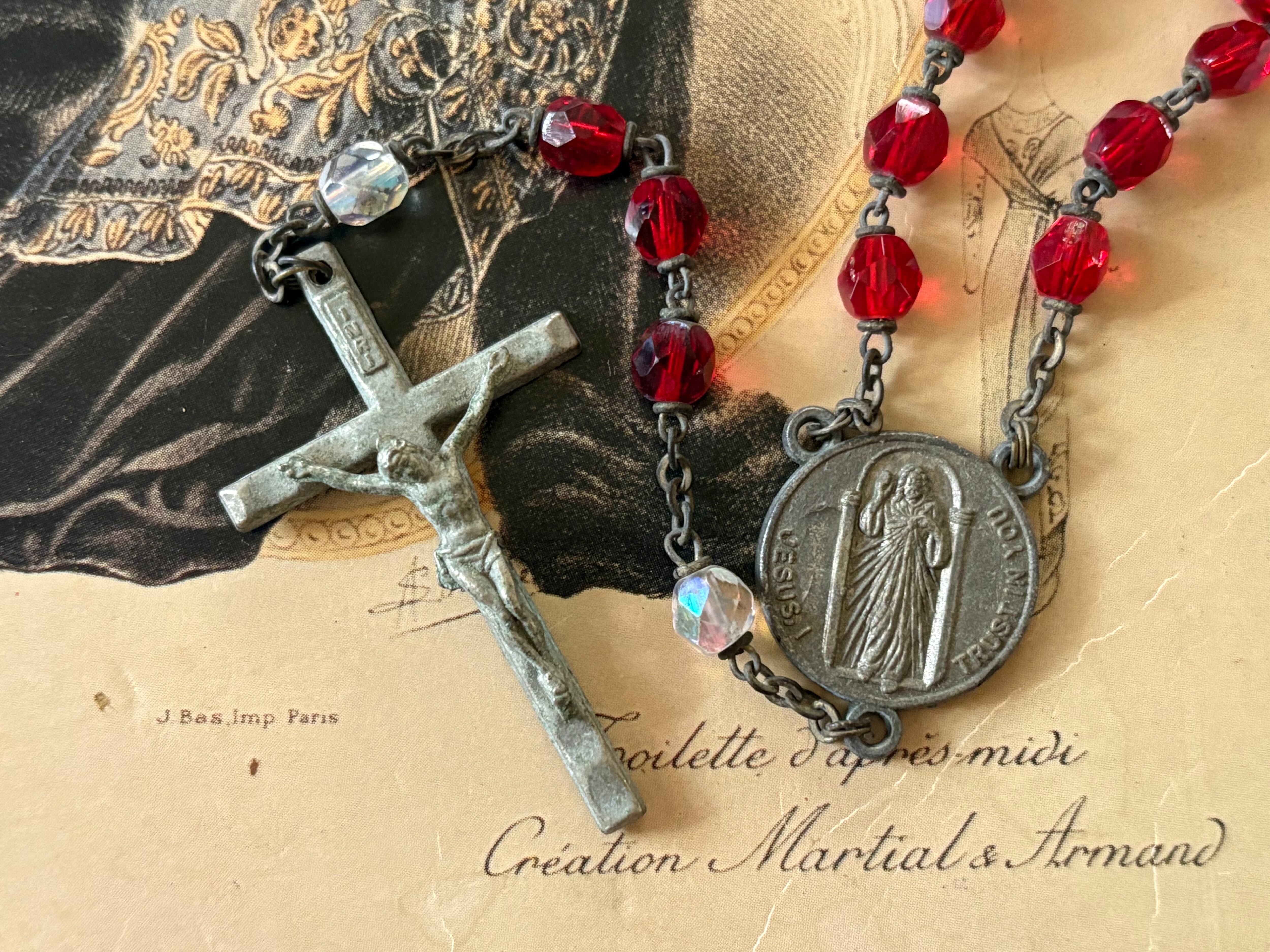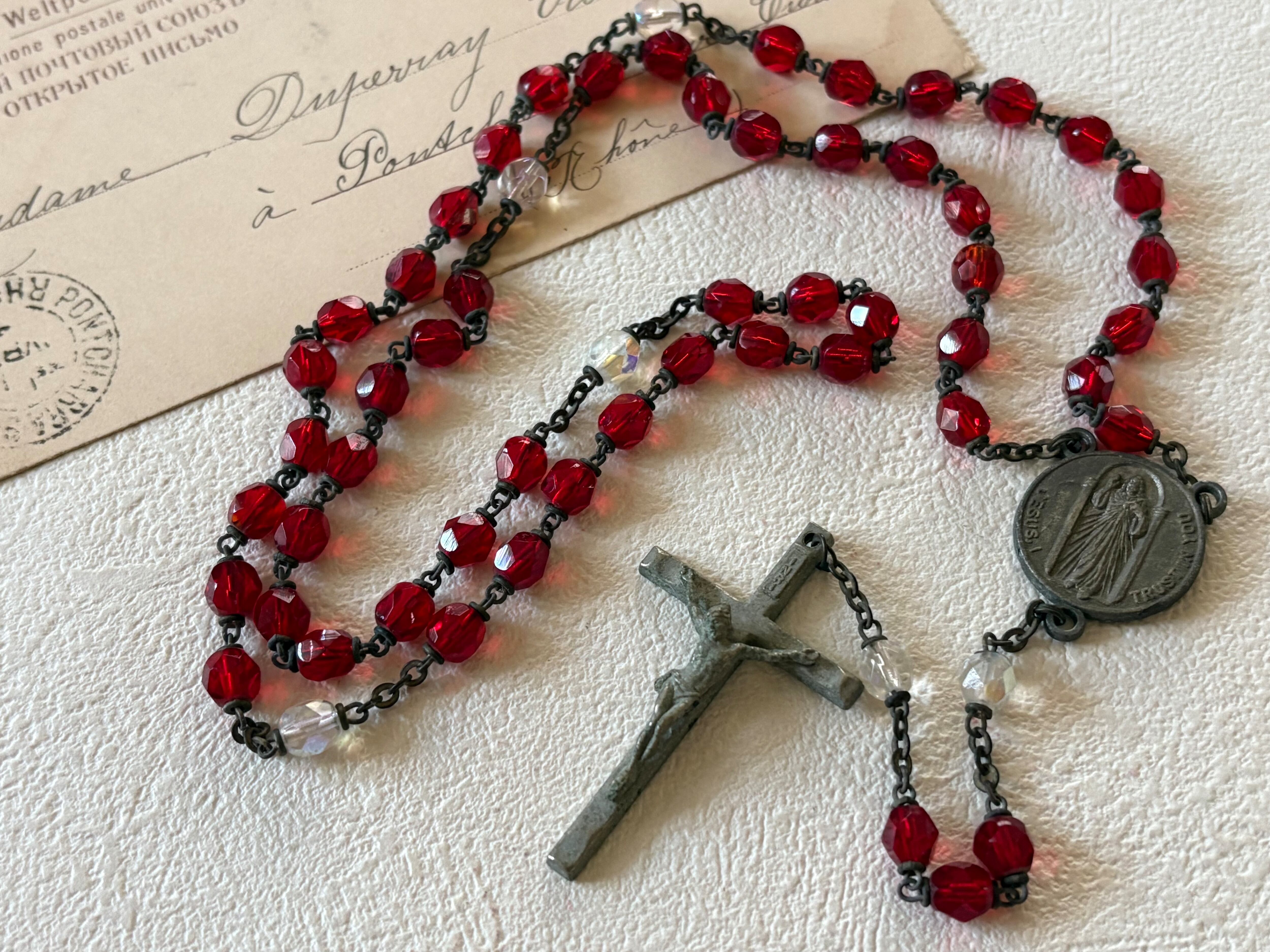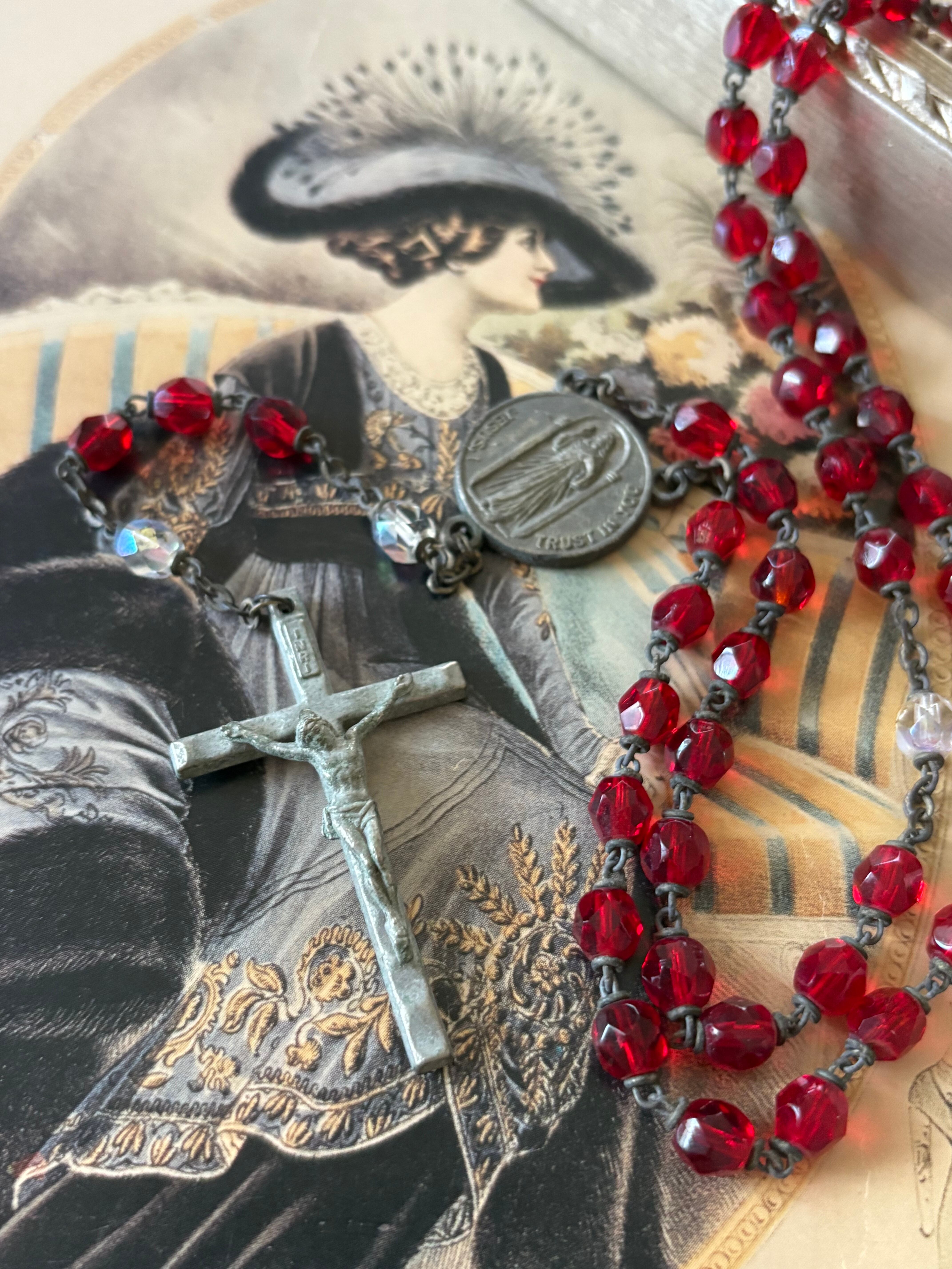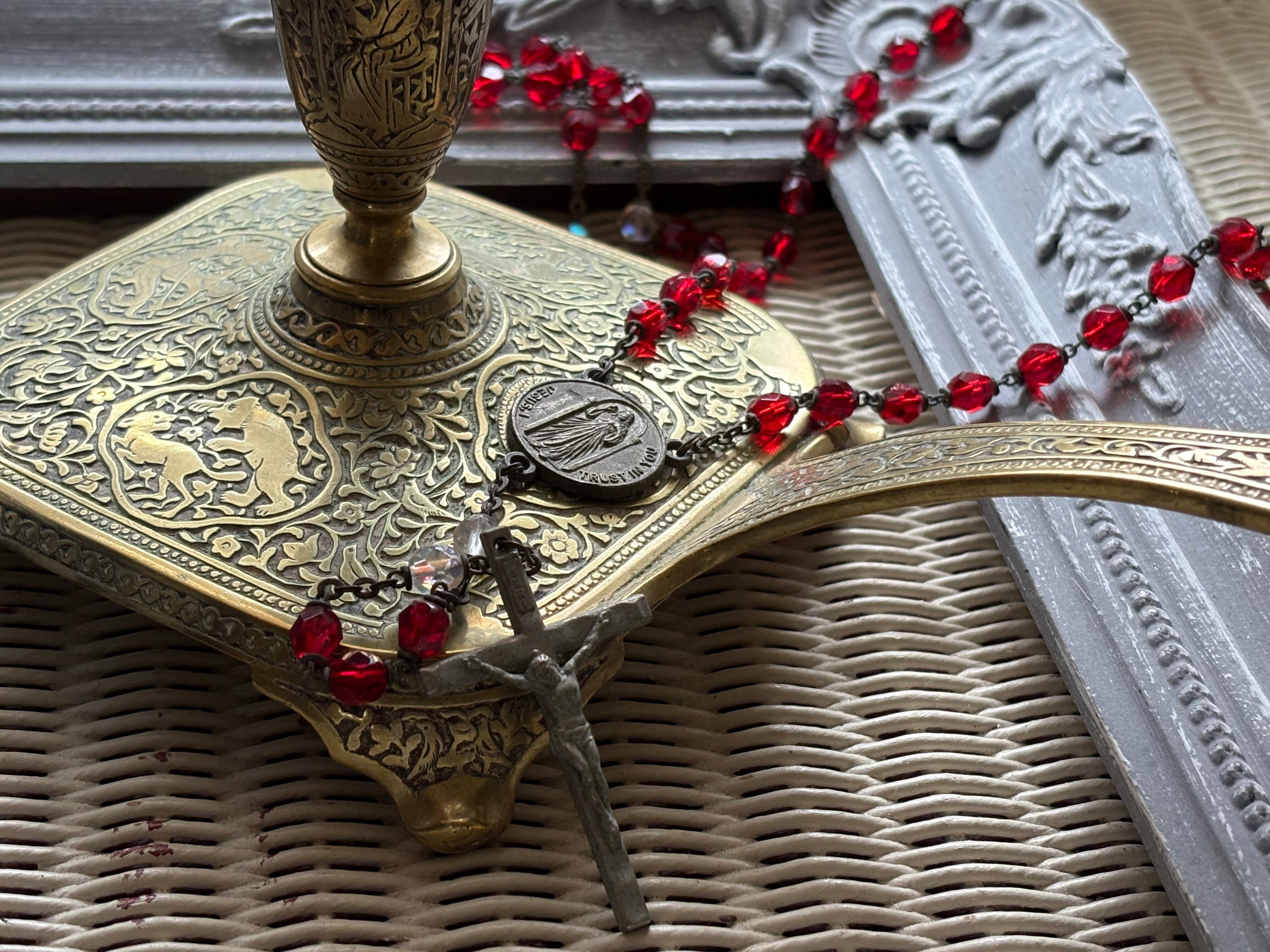 英国アンティーク レッド プラスチック珠 ロザリオ 聖品 キリスト アクセサリー パーツ 店舗什器 クリスマス インテリア