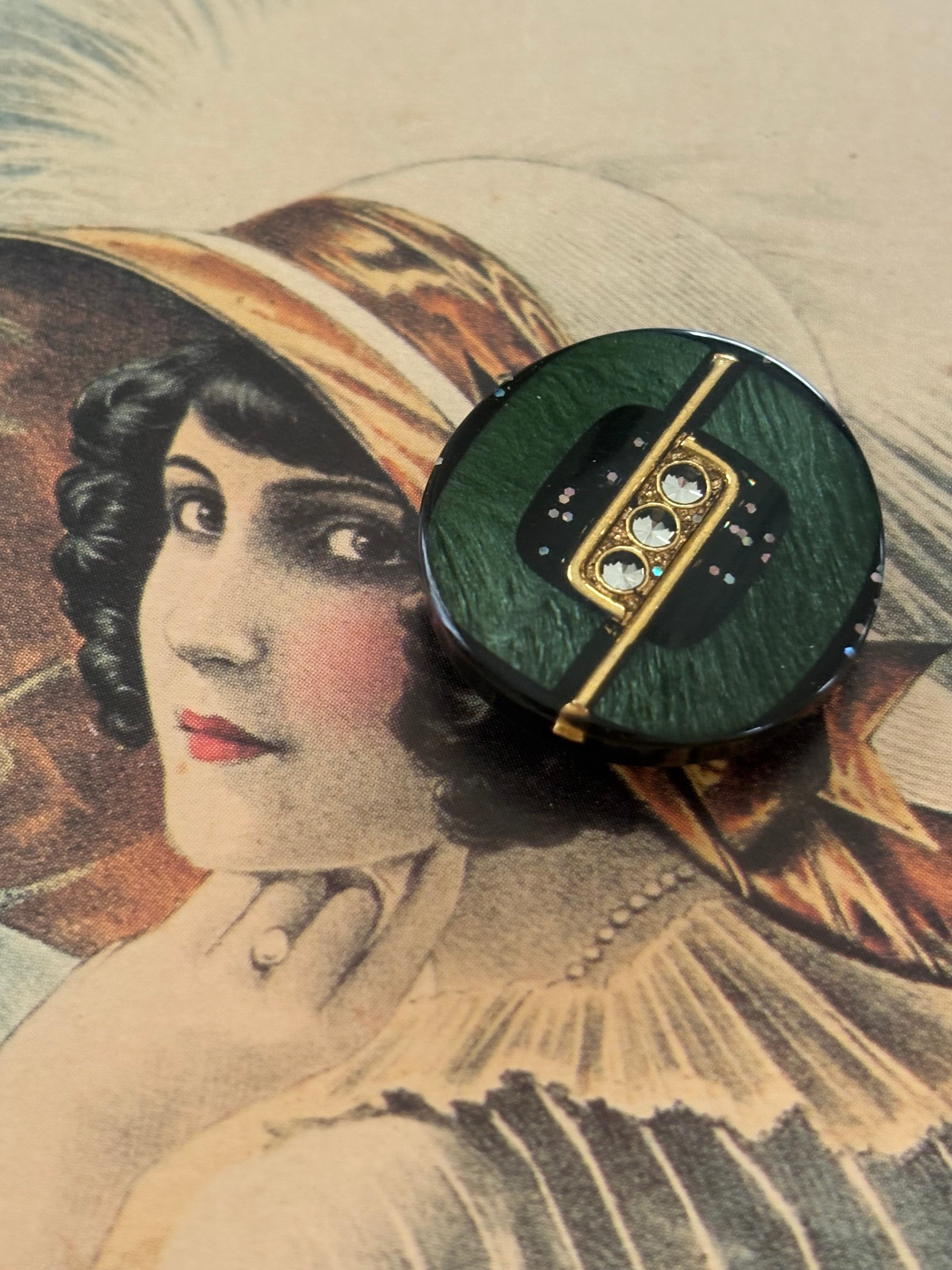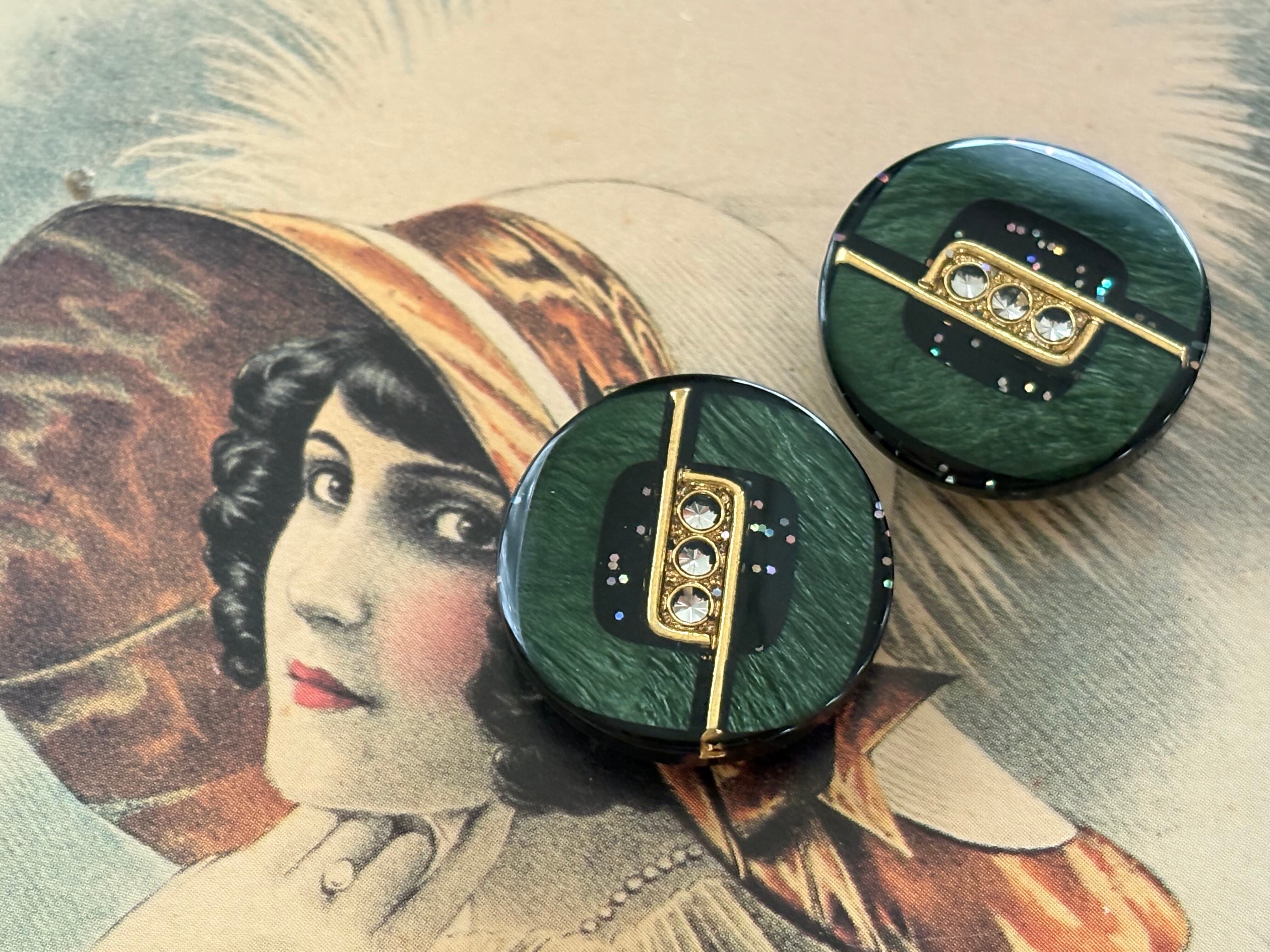 Japanese Vintage ボタン 22mm グリーン×ゴールド ストーン グリッター 昭和レトロ アクセサリーパーツ 装飾材 カルトナージュ