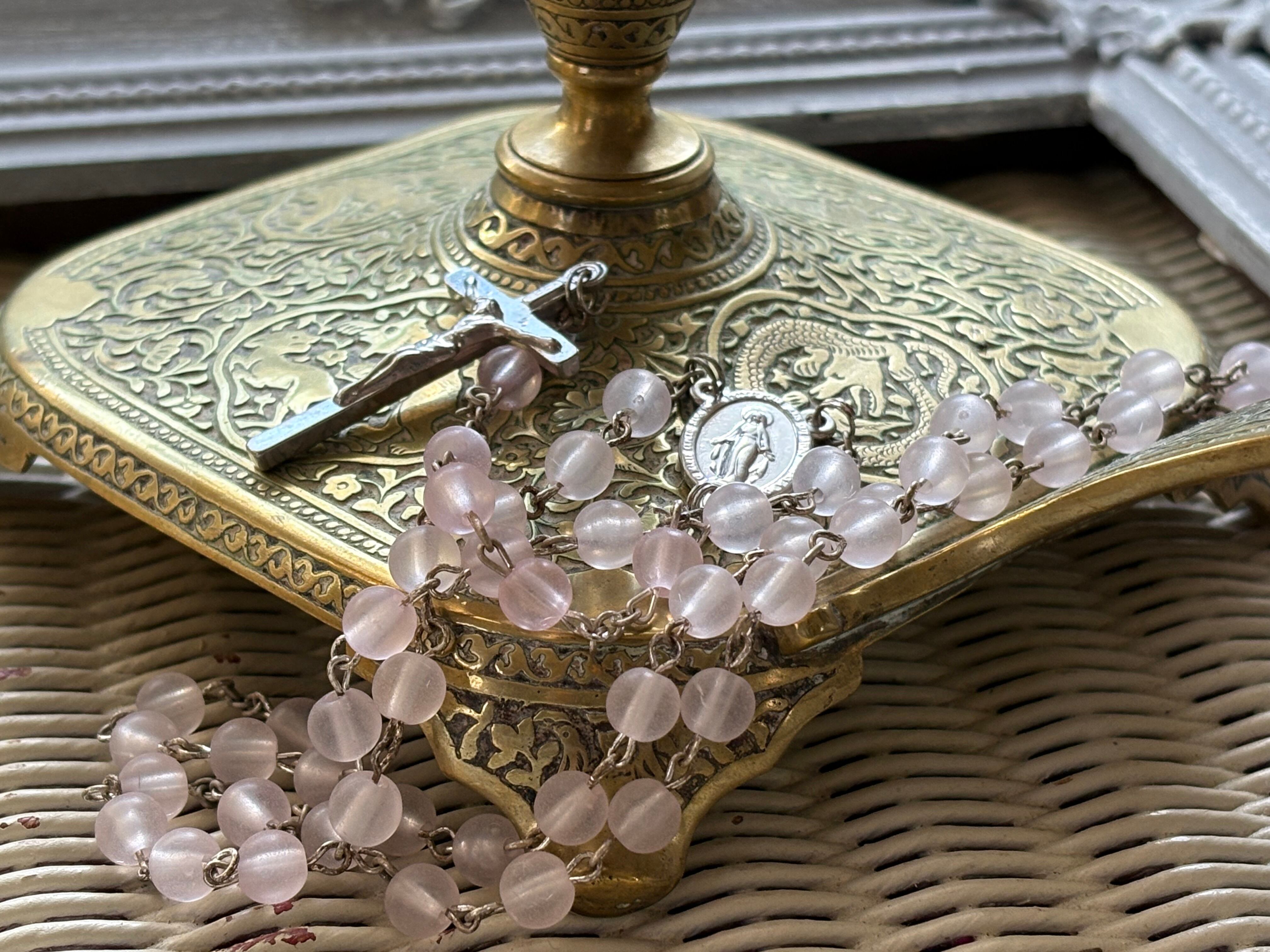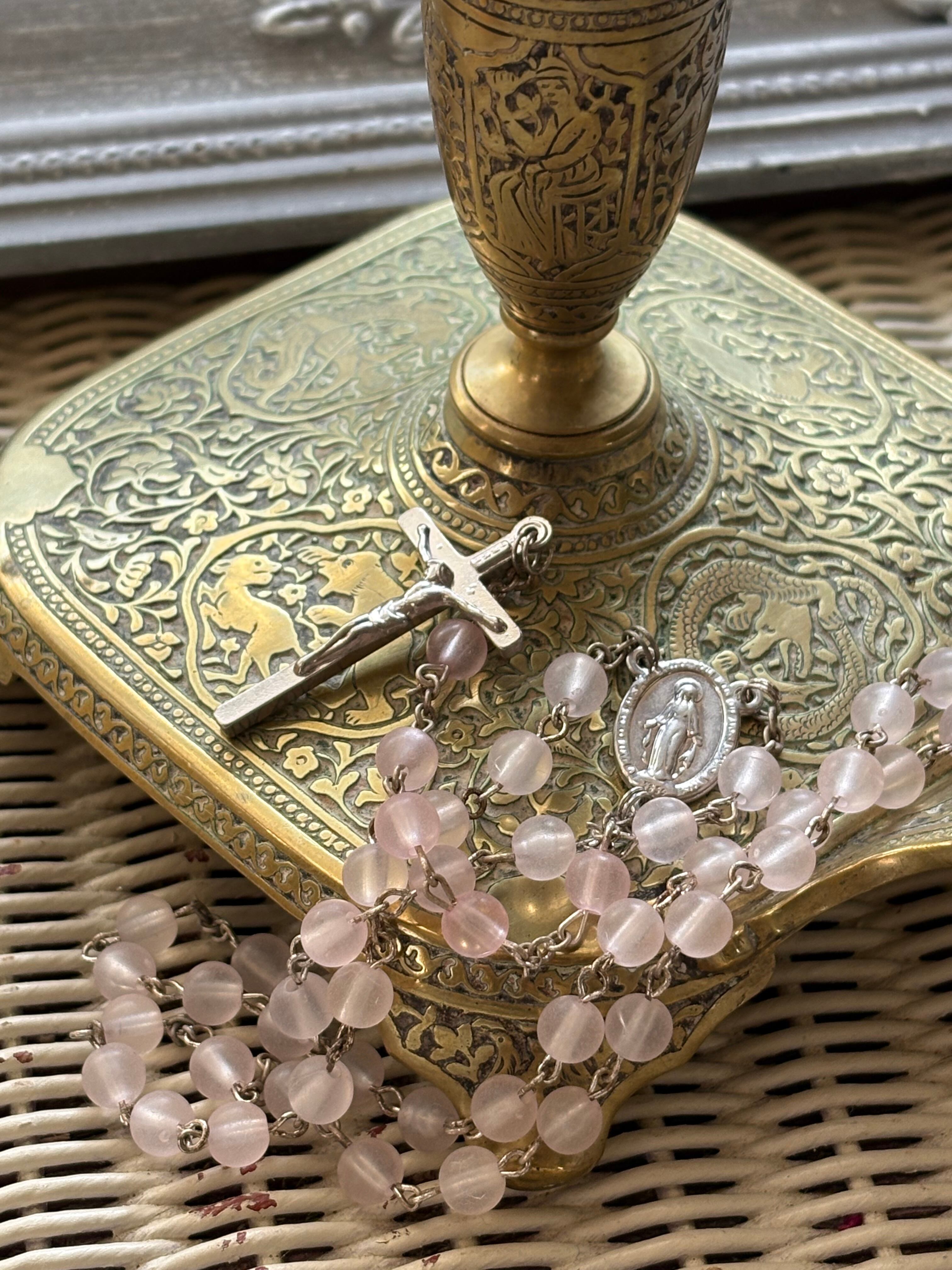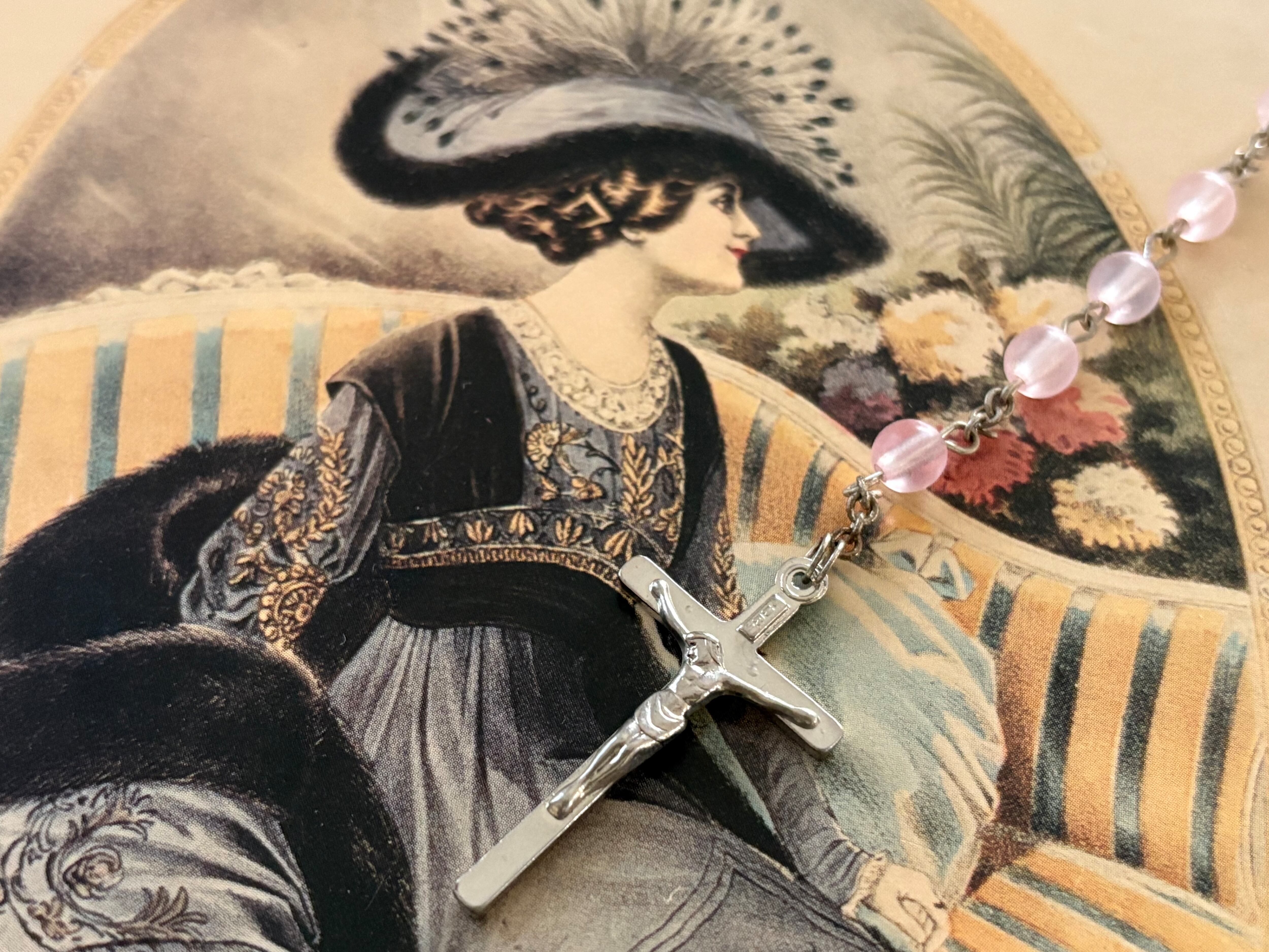 フロストピンクのプラスチックビーズ、センターピースにメダイユ、トップにクロスがついています。