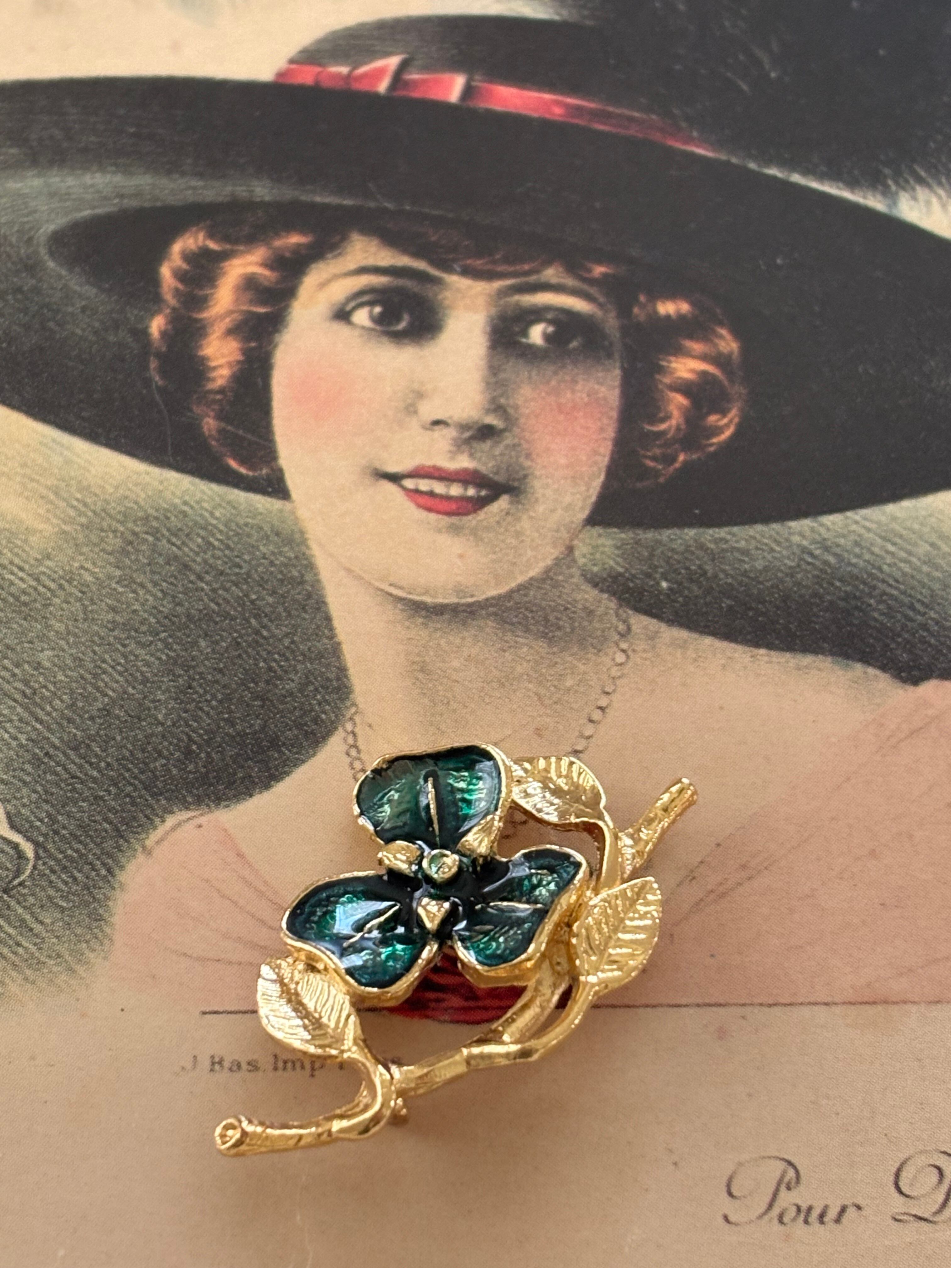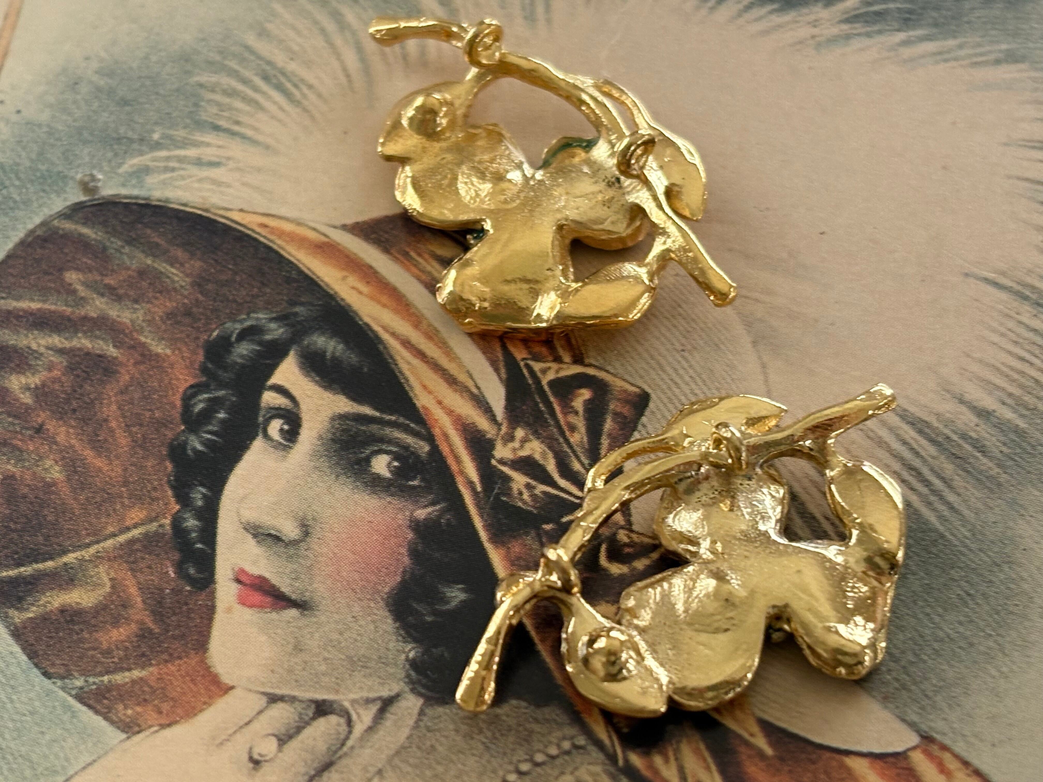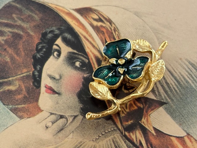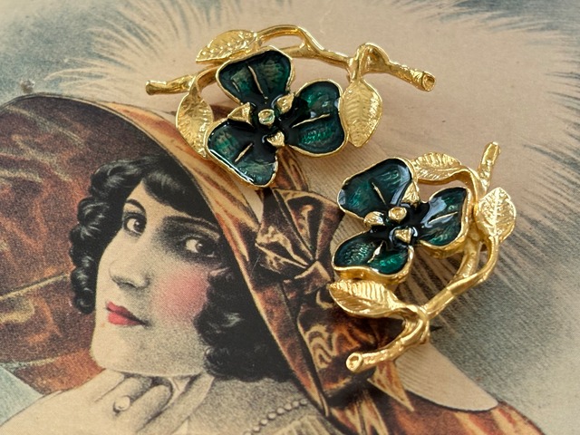 ゴールドの枝とリーフにグリーンのエナメル加工が施されたフラワー。