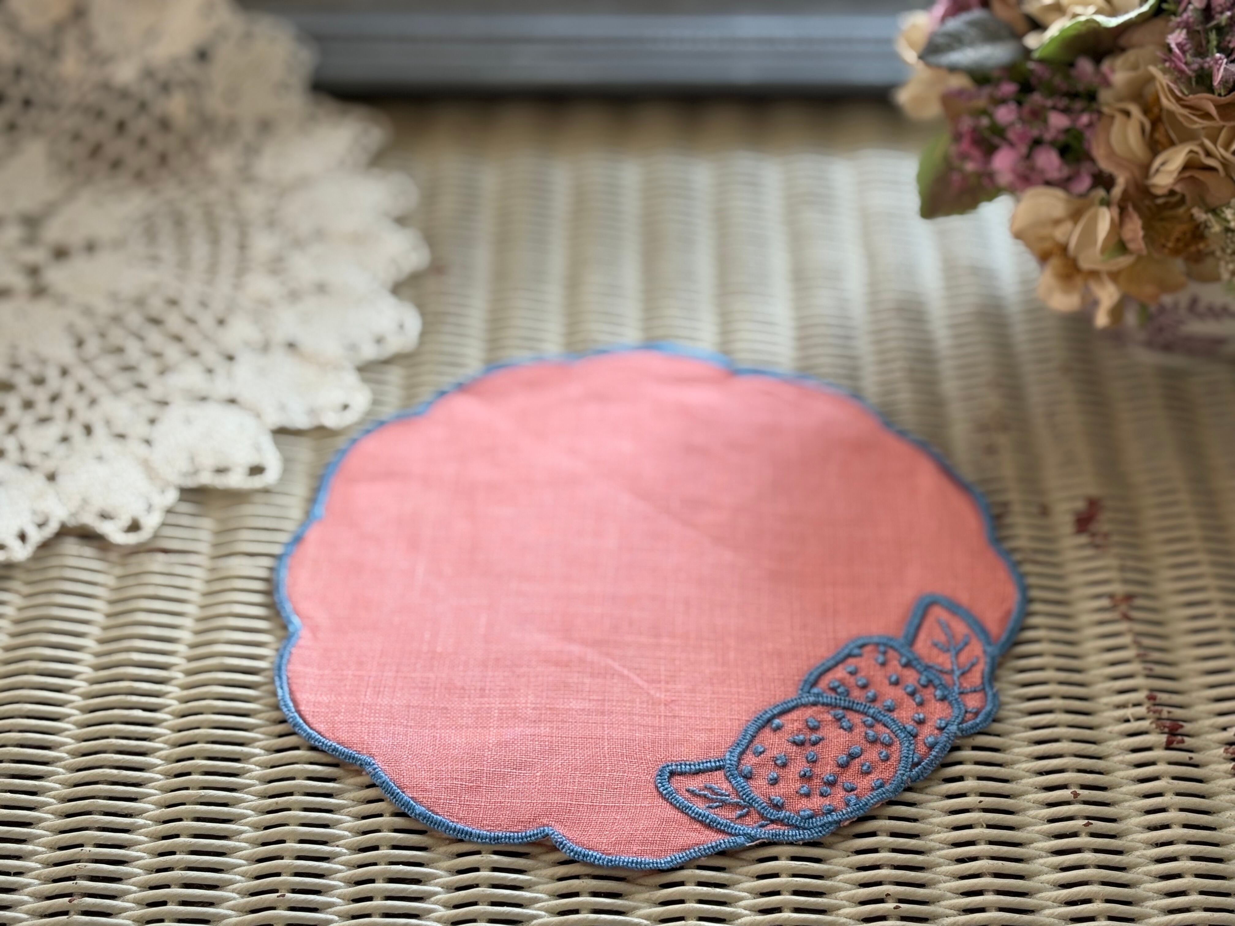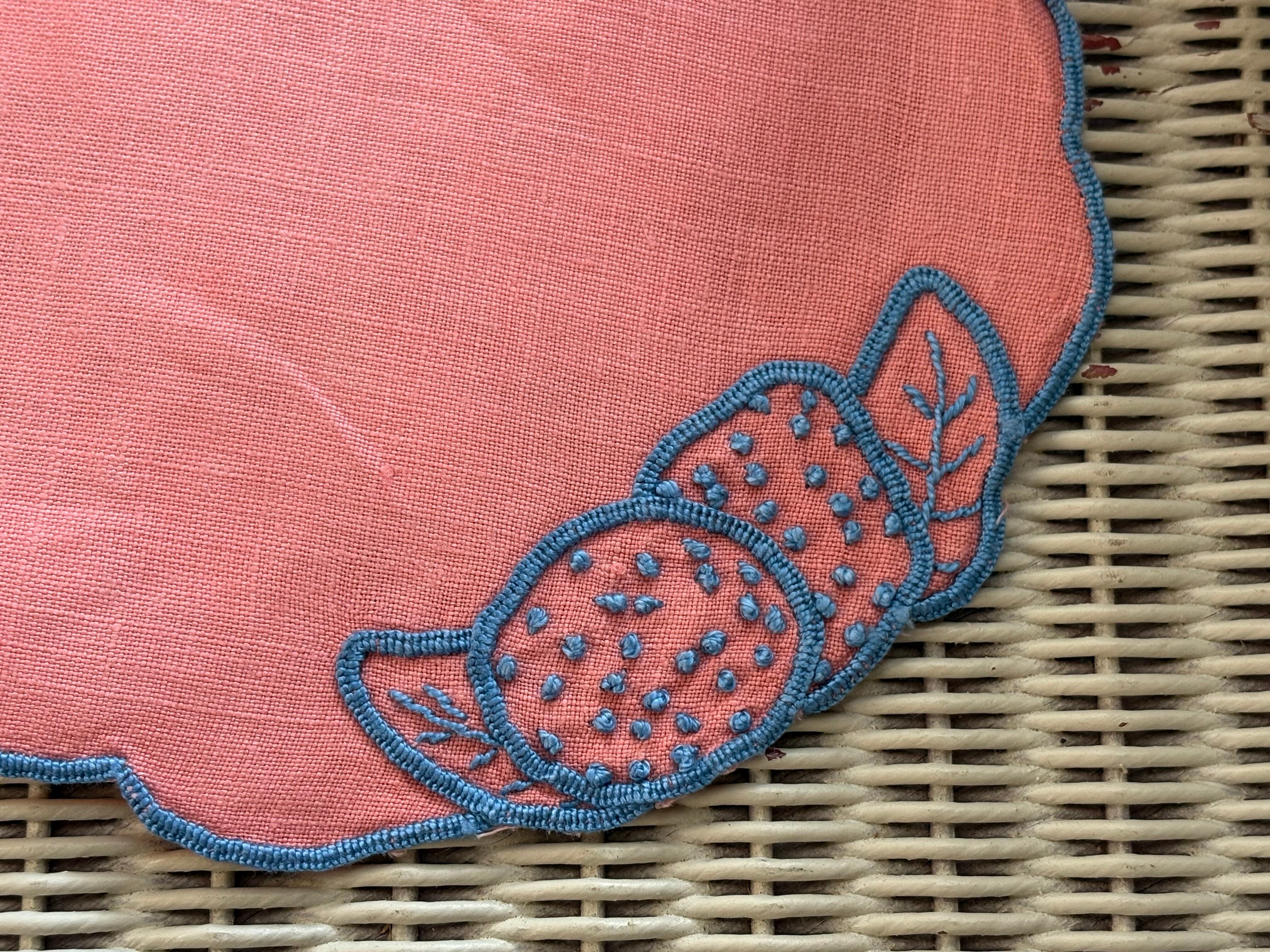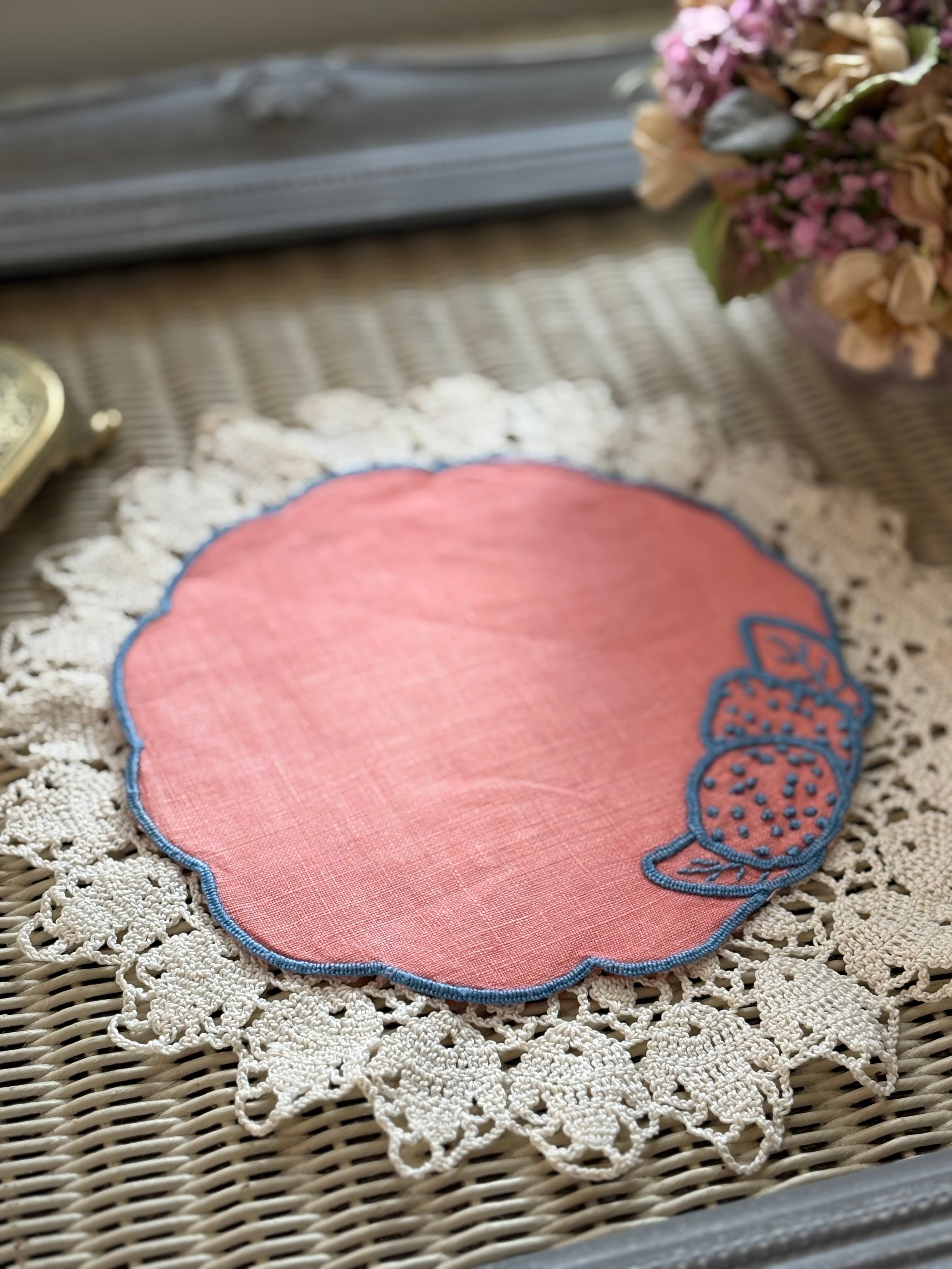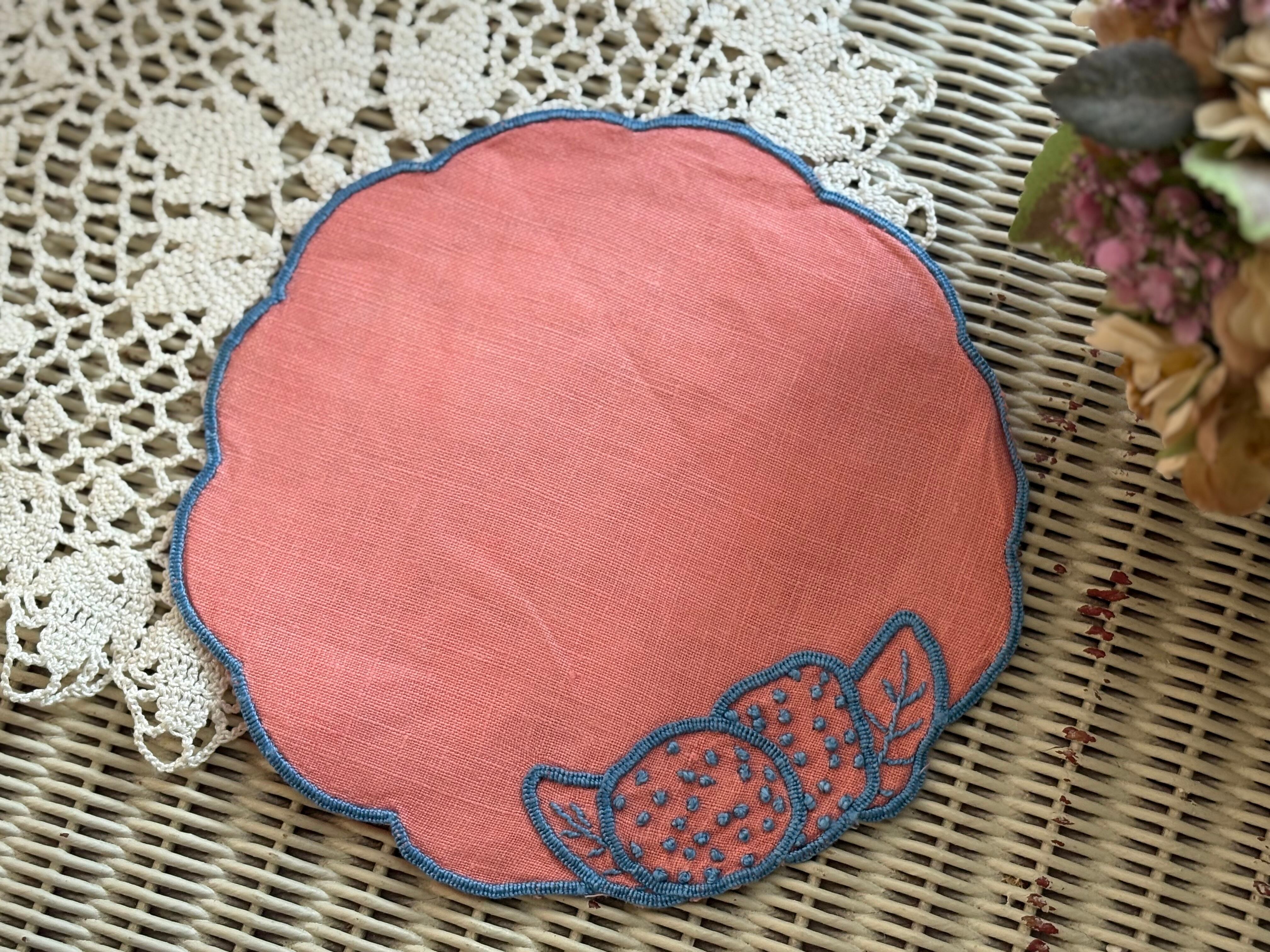 フランス Vintage ドイリー 手刺繍 15.5cm ピンク×ブルー フルーツとリーフ 敷物 インテリア小物 撮影小物 ハンドメイド素材