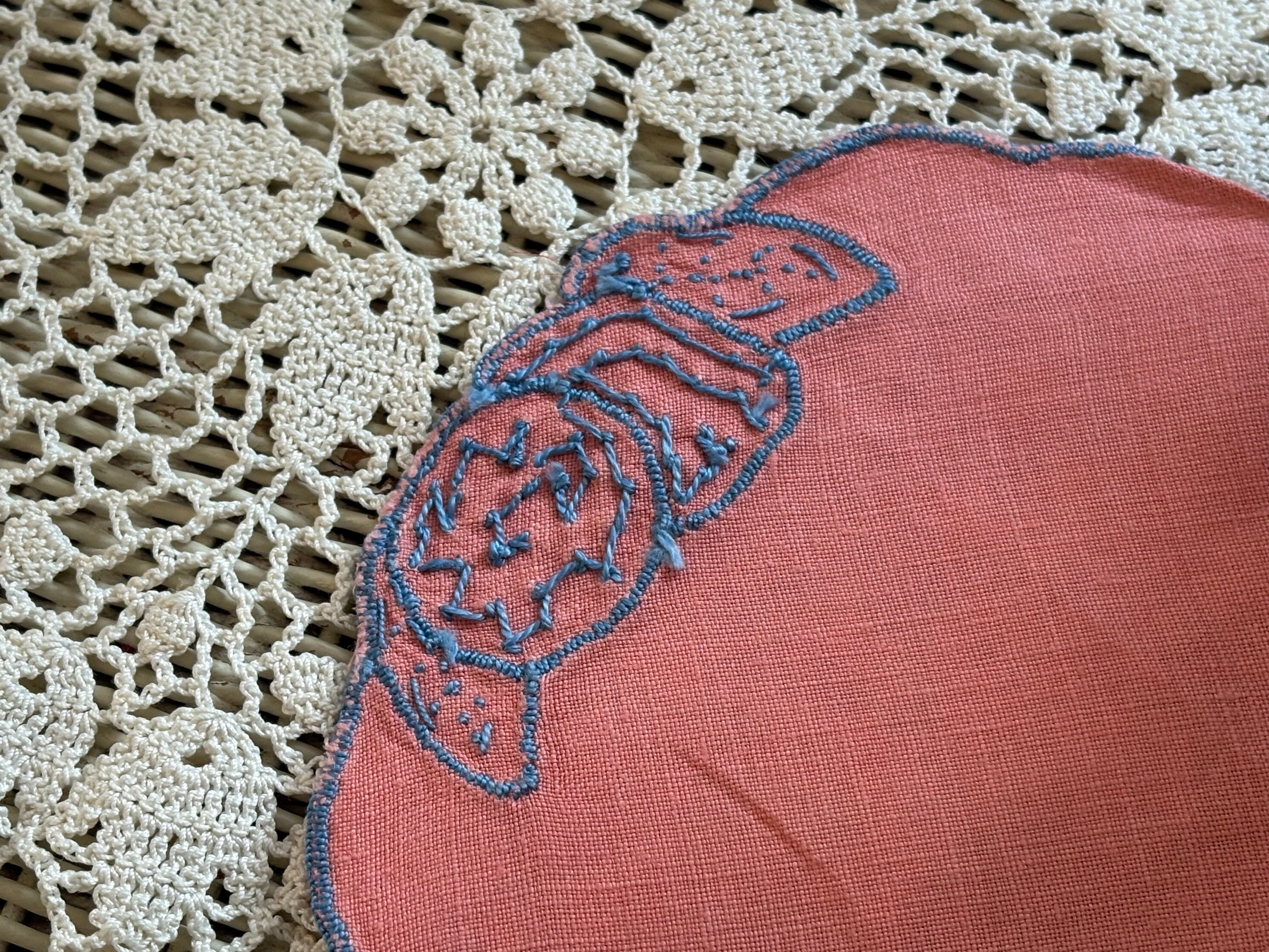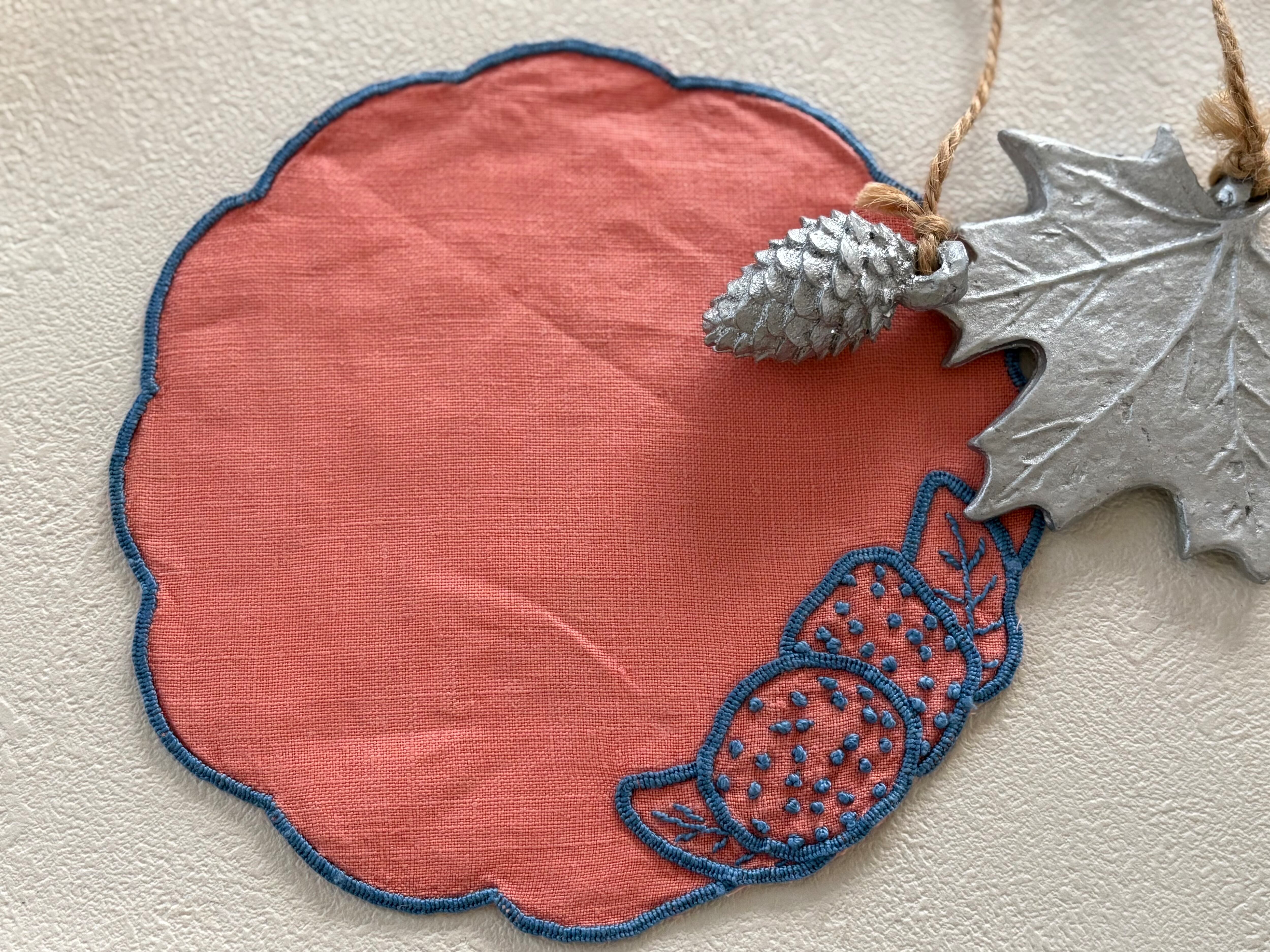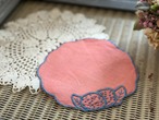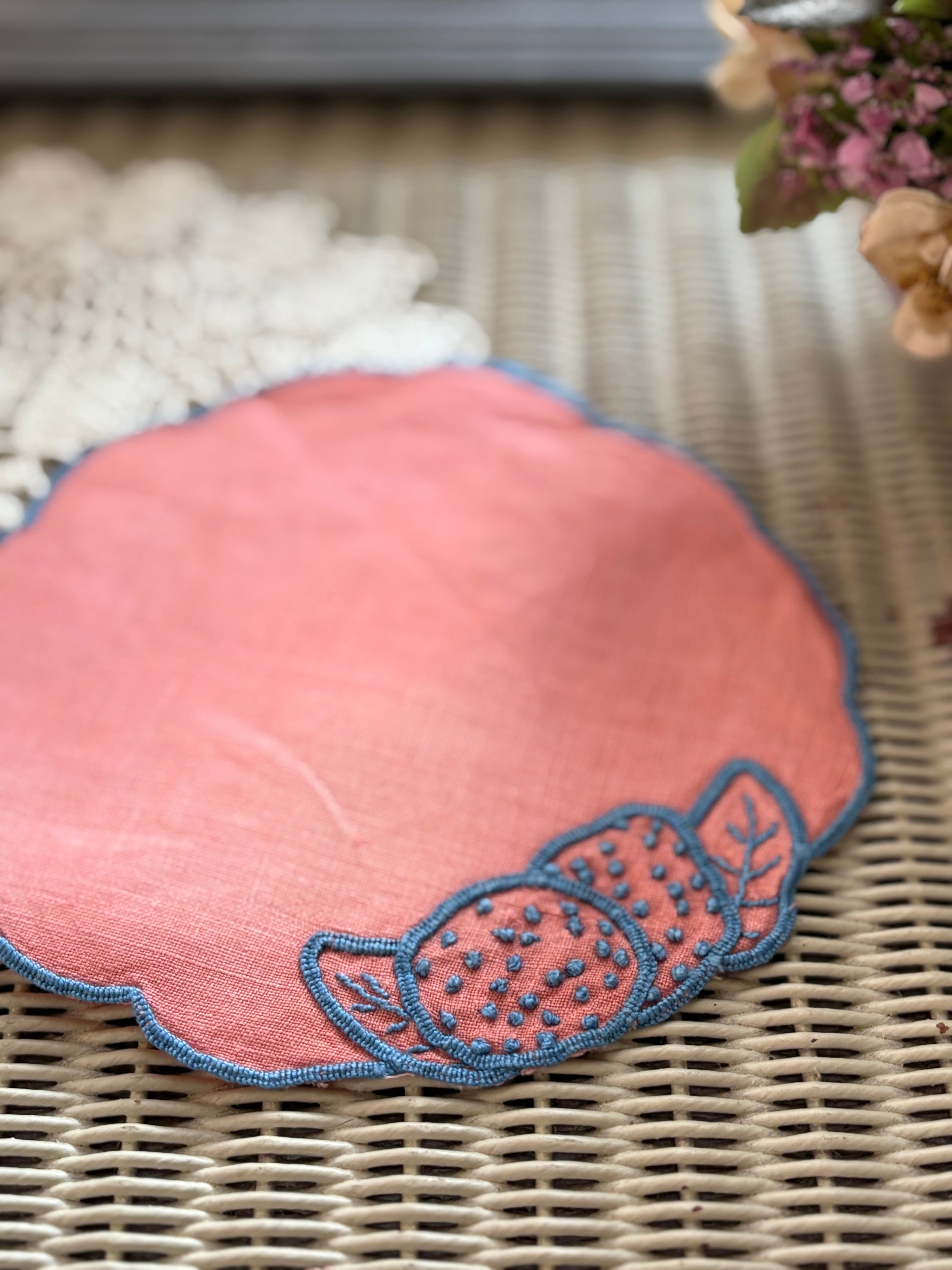 フランス Vintage ドイリー 手刺繍 15.5cm ピンク×ブルー フルーツとリーフ 敷物 インテリア小物 撮影小物 ハンドメイド素材