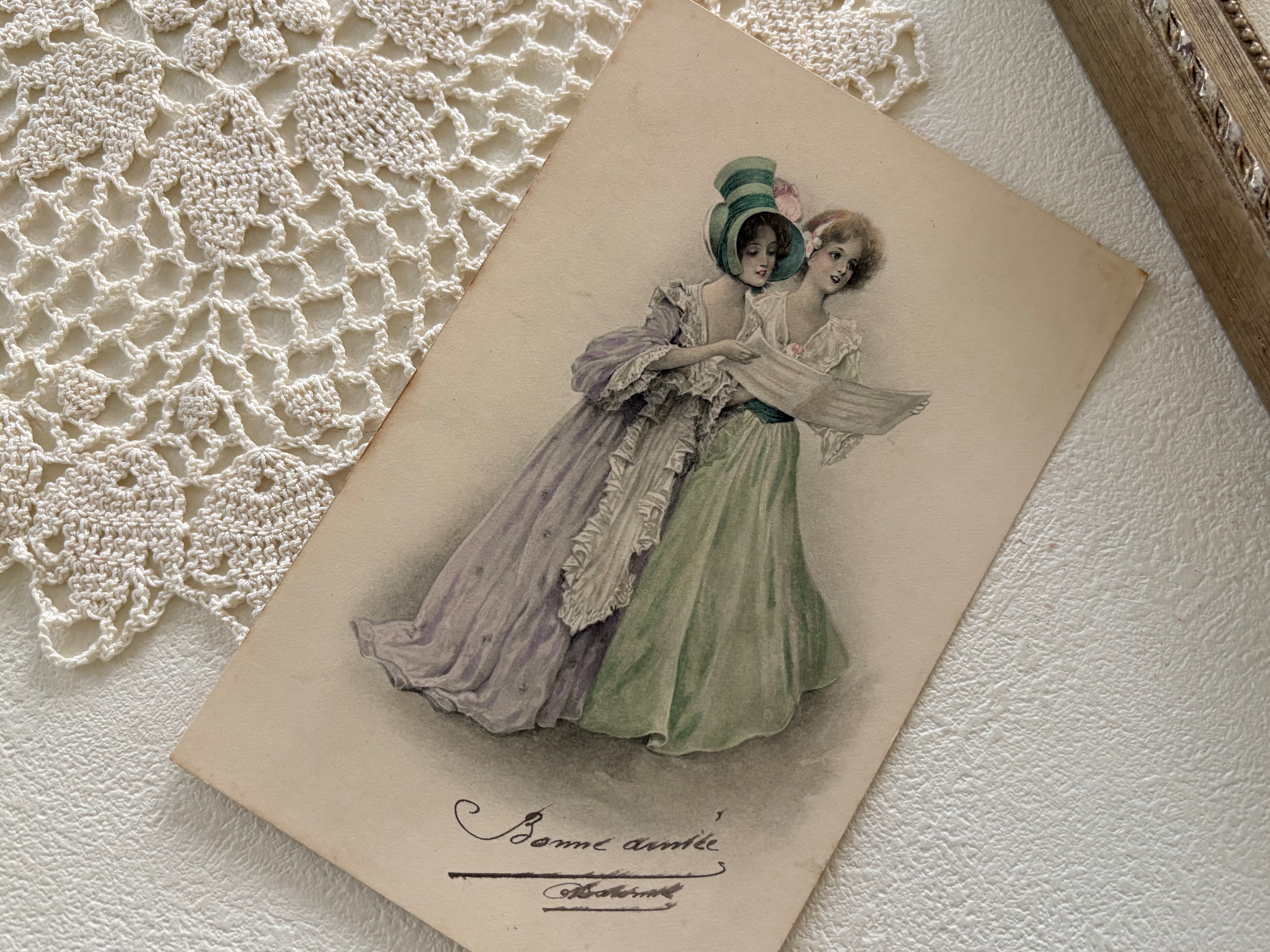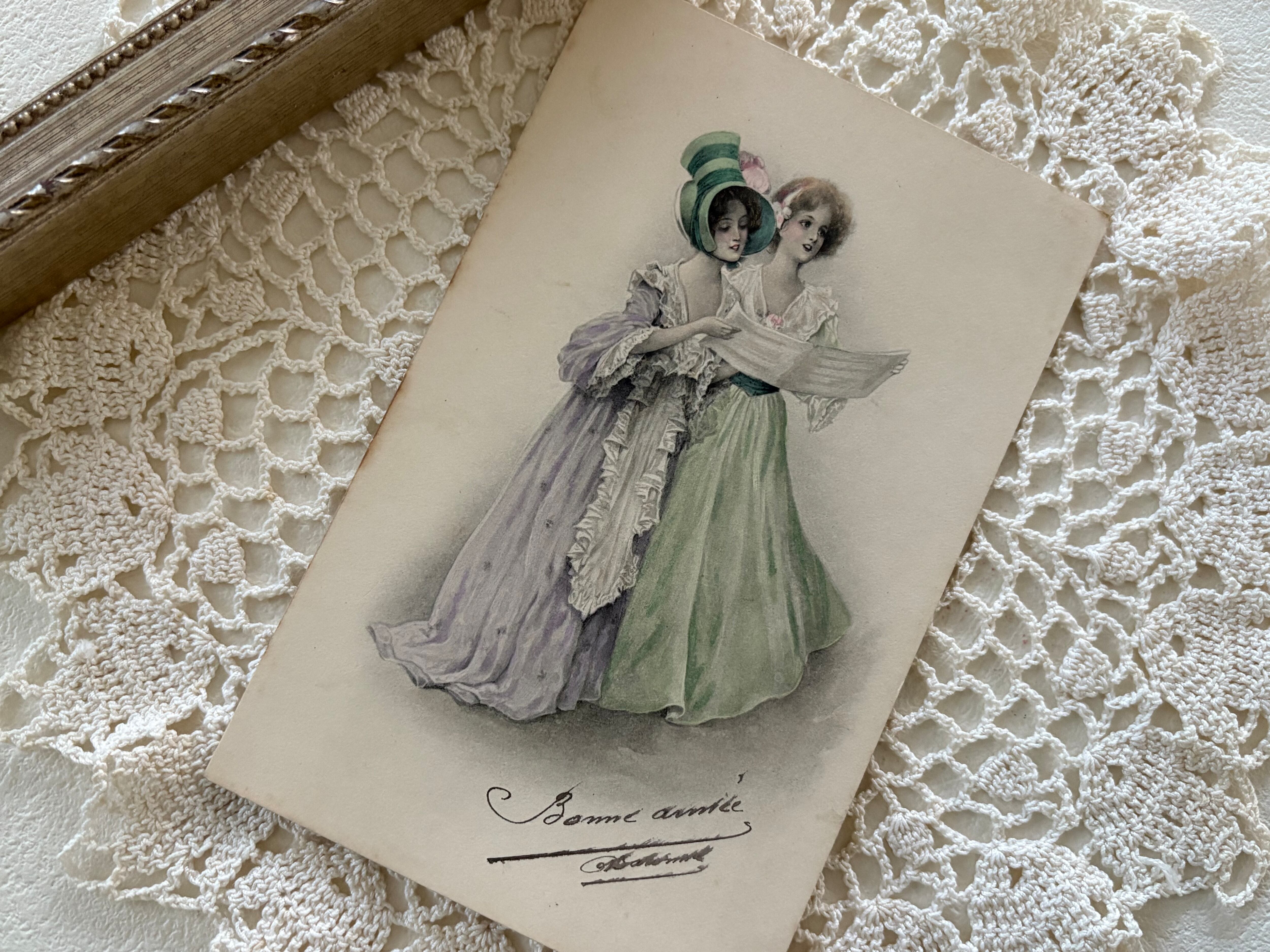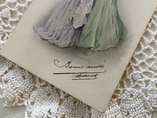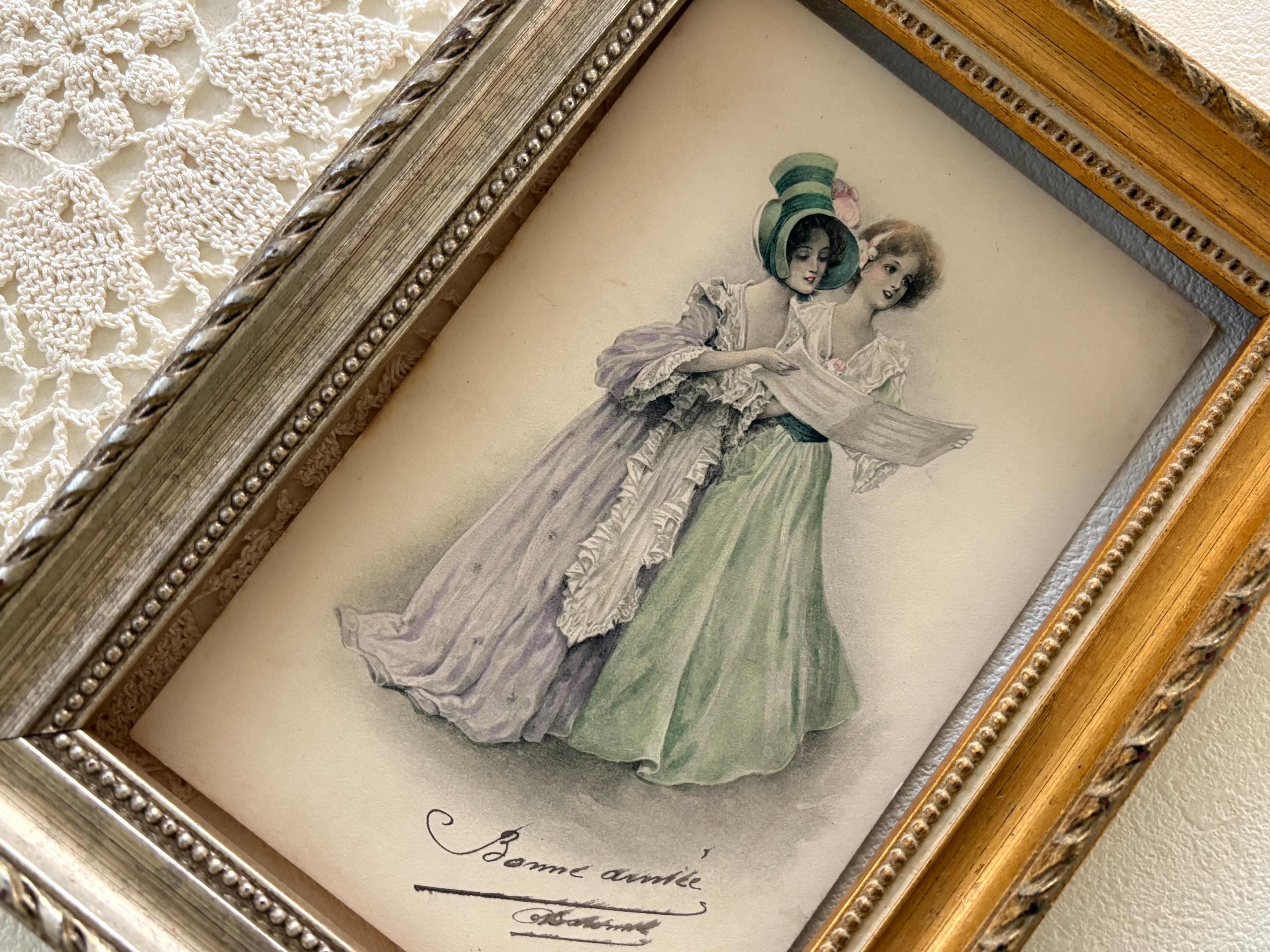 フランスアンティークカード 2人のマダム Bonne année 人物 コラージュ 額装 インテリア 貴婦人コレクション