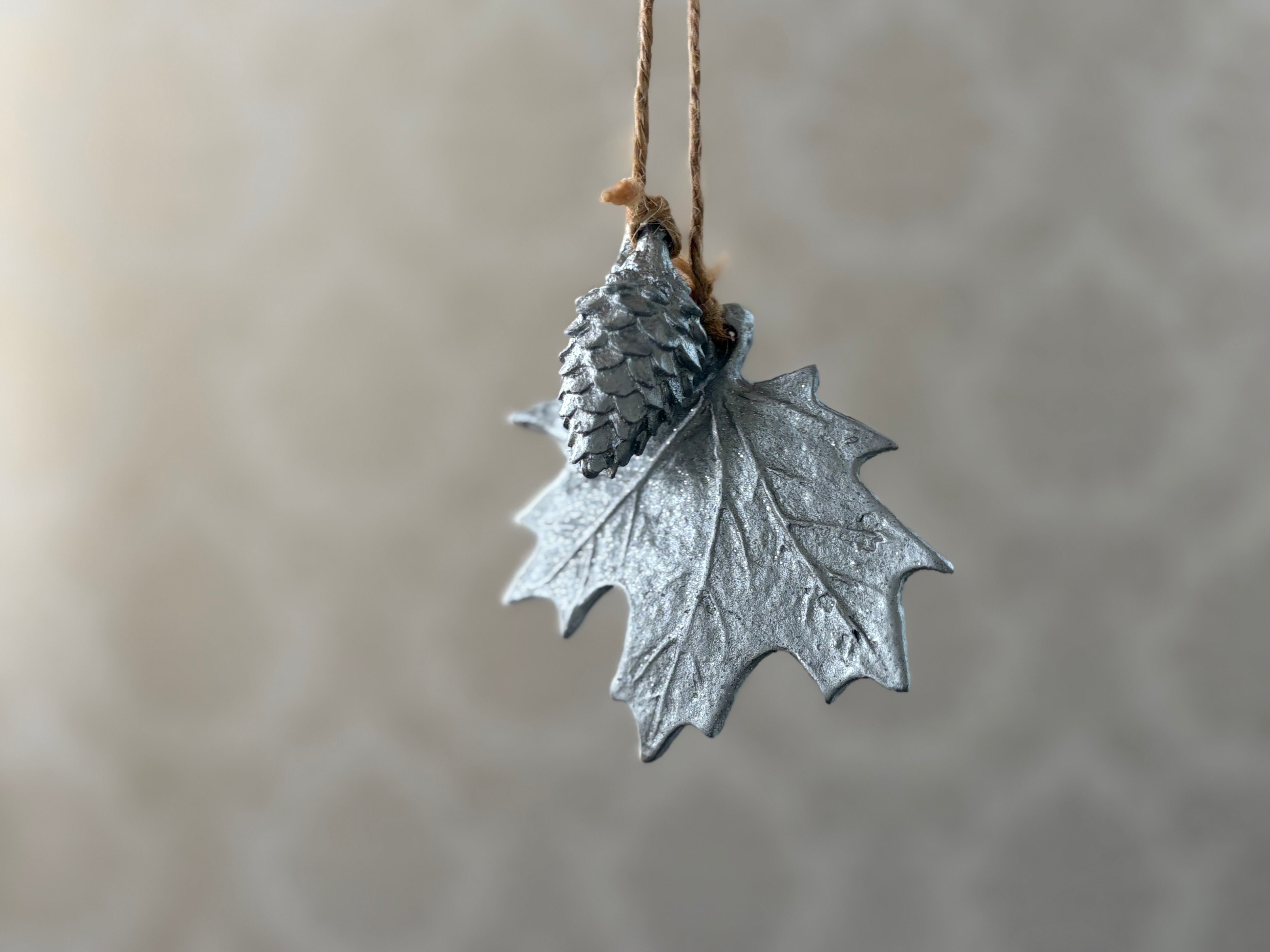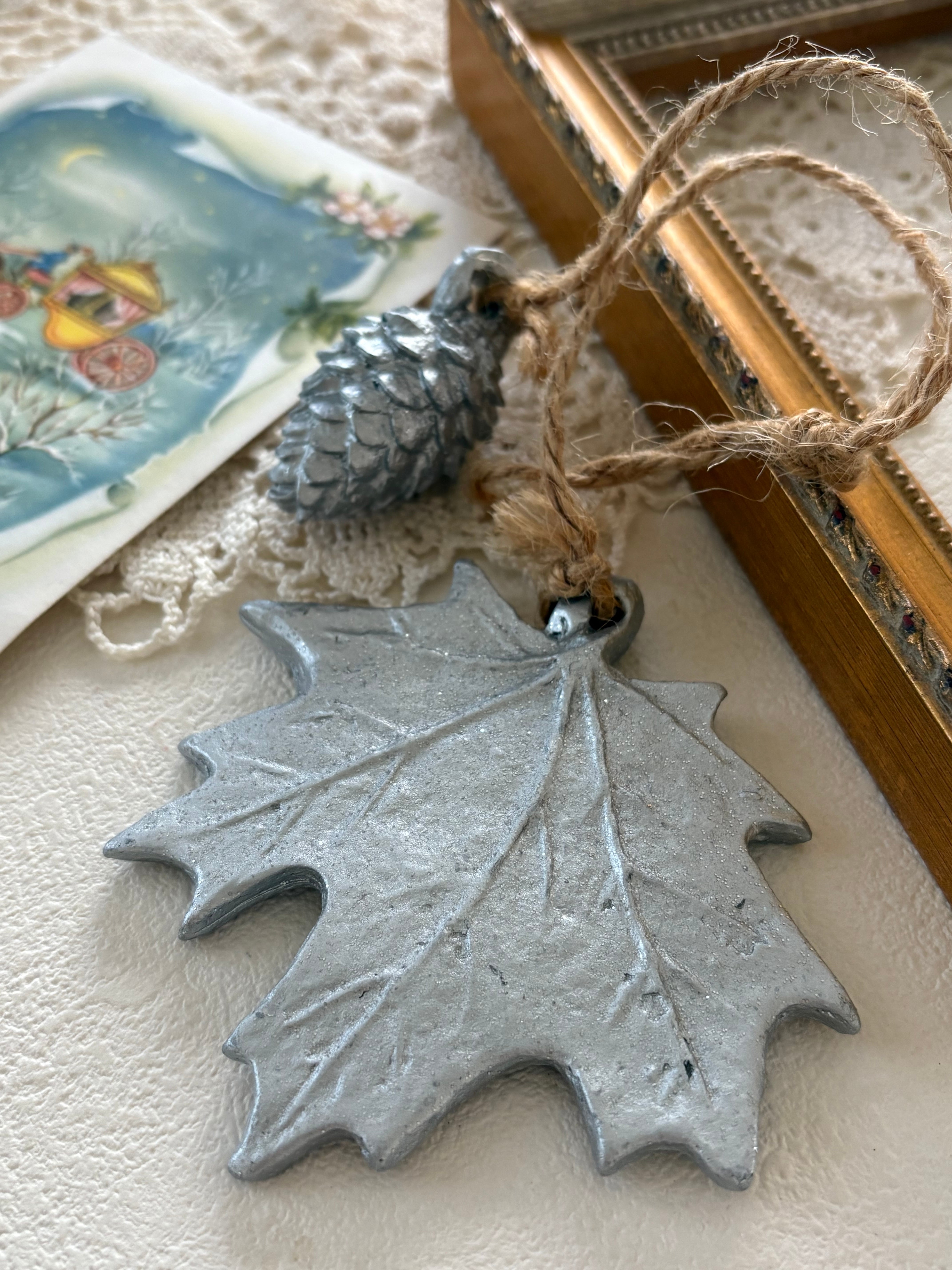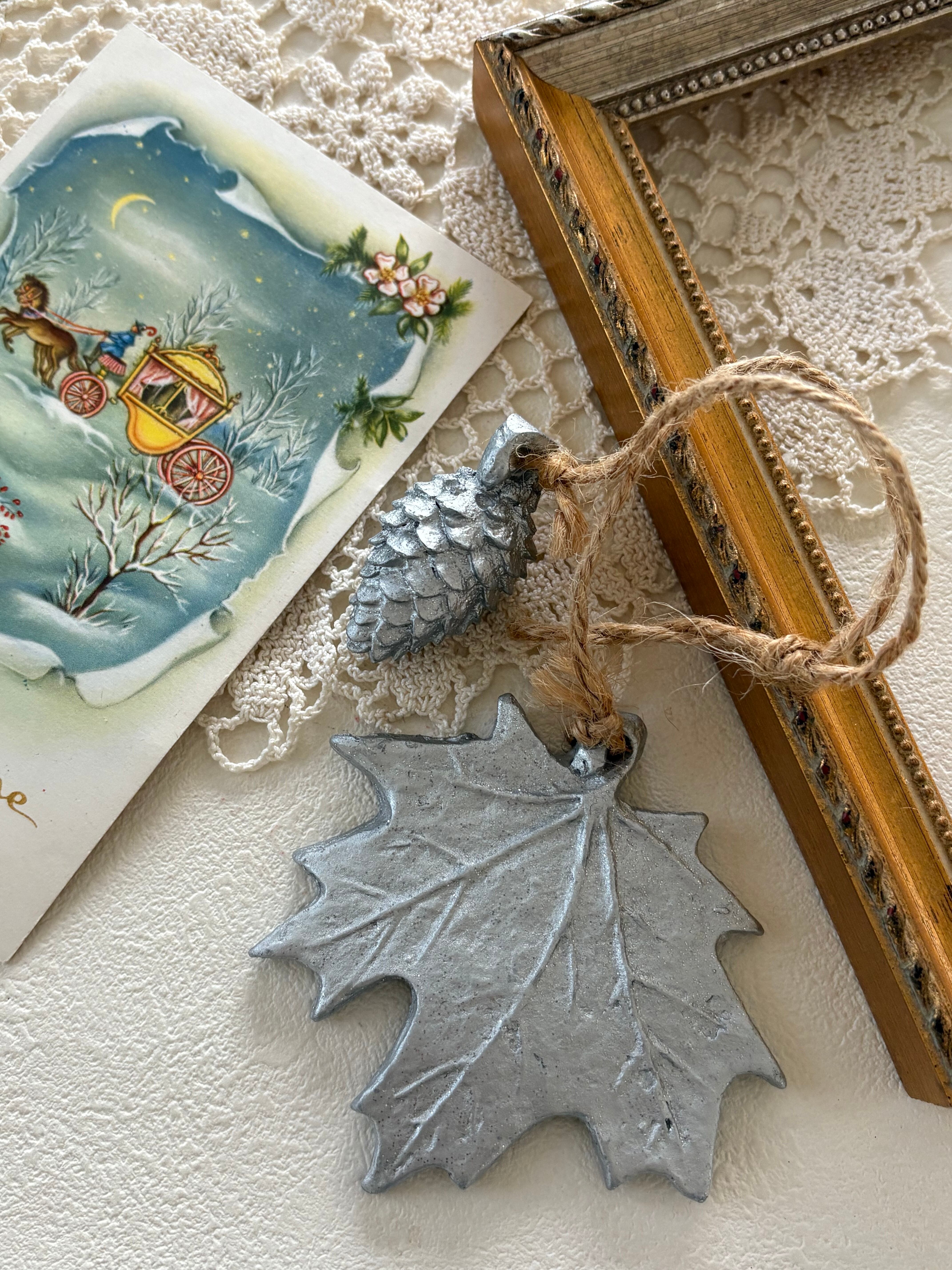 シルバーカラーのリーフと松ぼっくりのクリスマスオーナメントになります。